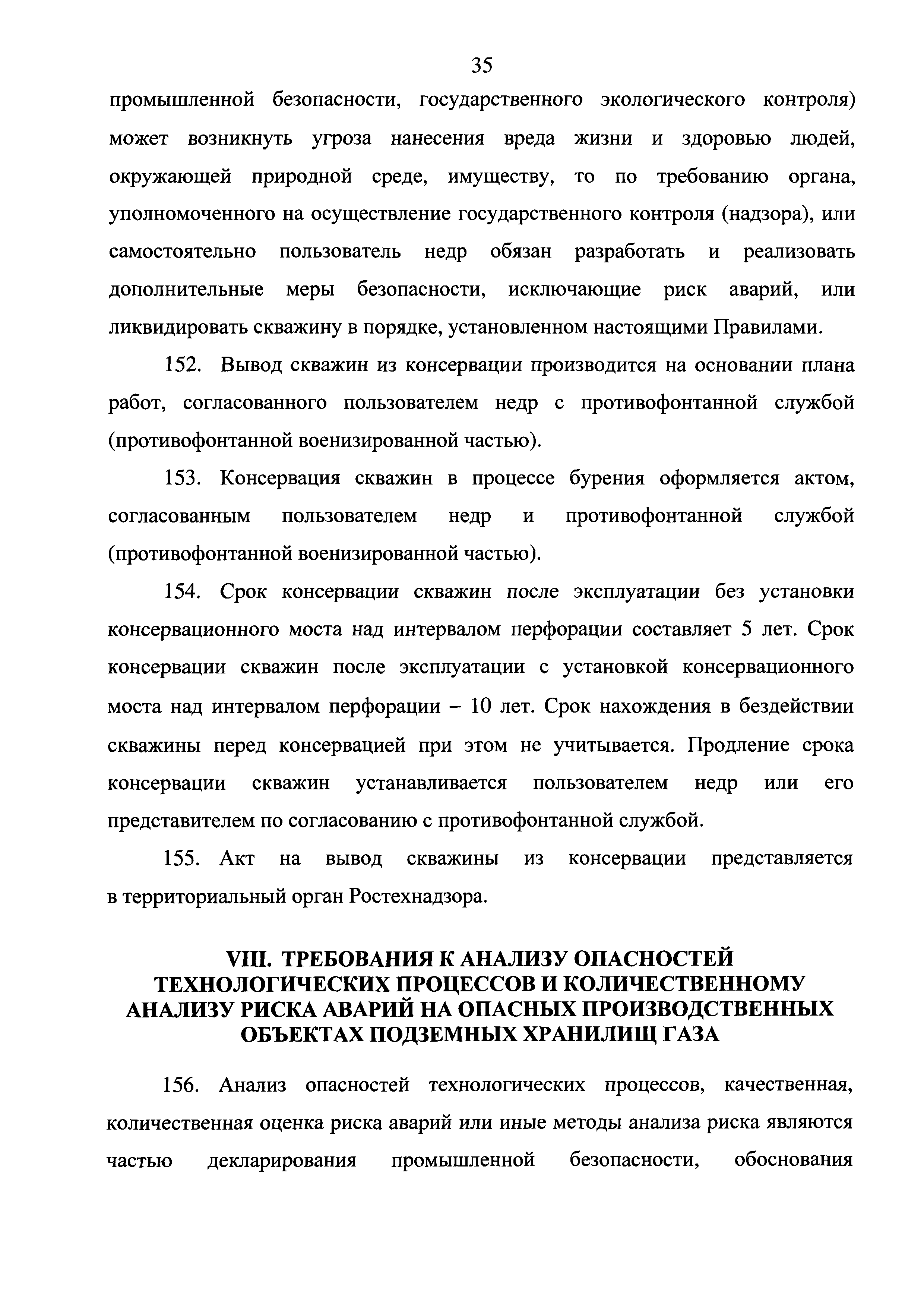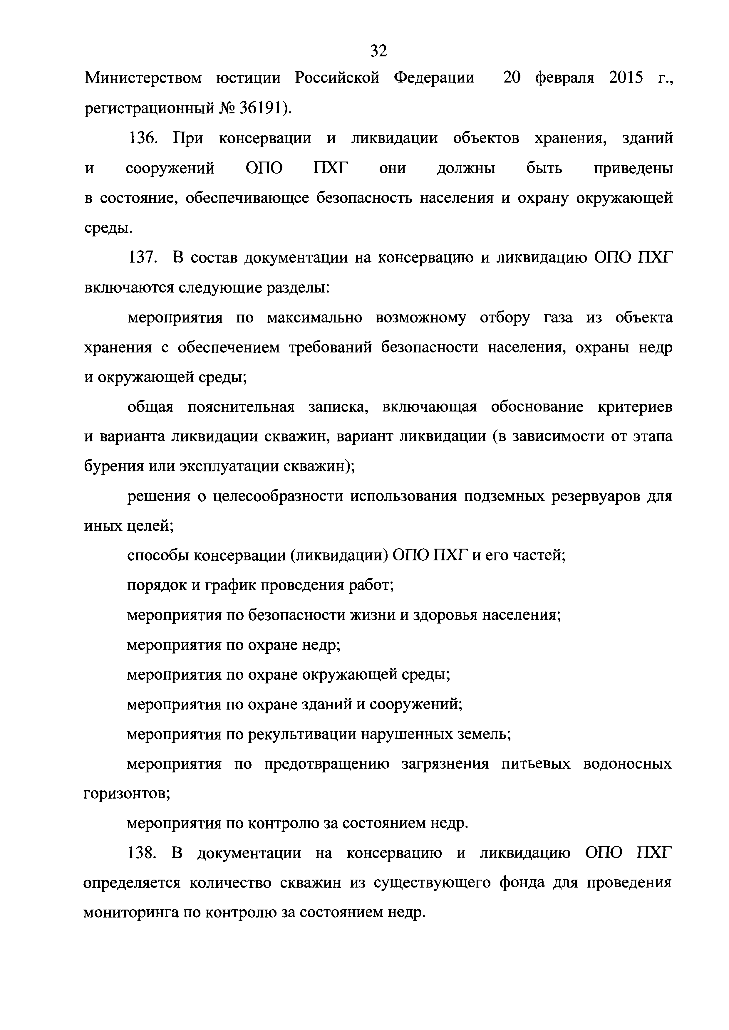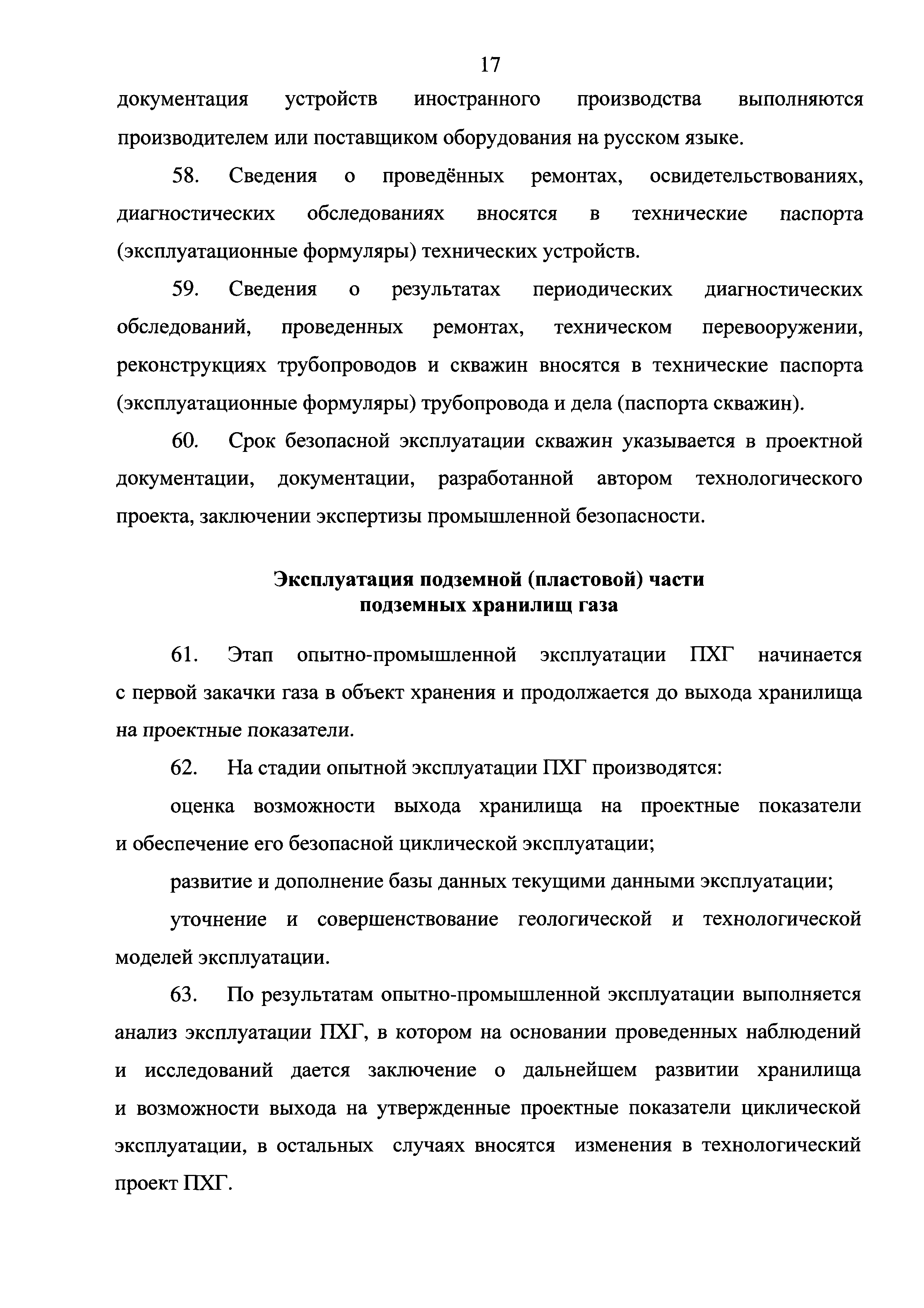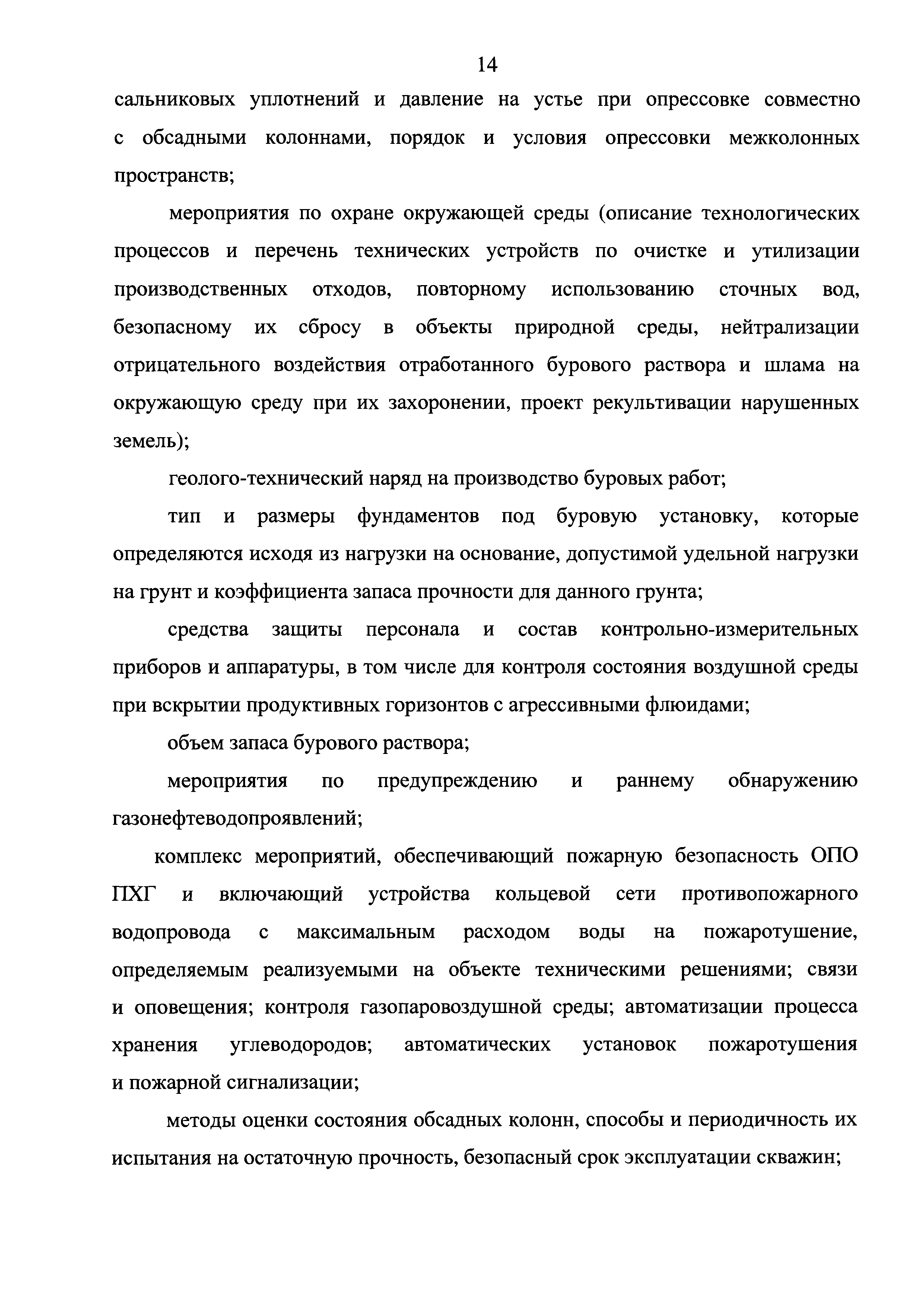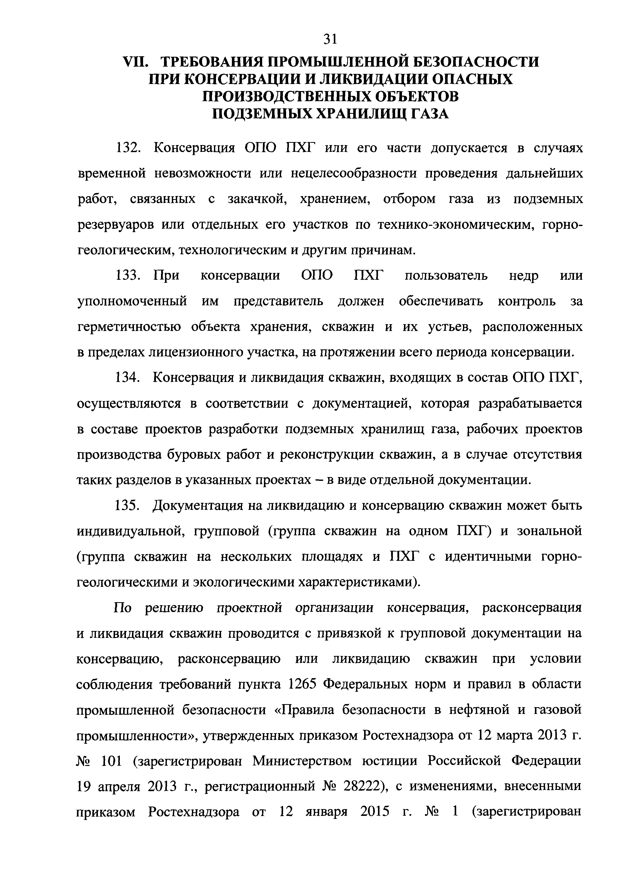 | Оглавление: | I Общие положения II Требования промышленной безопасности к проектированию опасных производственных объектов подземных хранилищ газа III Требования промышленной безопасности к конструкции скважин опасных производственных объектов подземных хранилищ газа Требования безопасности к проектированию, строительству опасных производственных объектов подземных хранилищ газа в каменной соли IV Требования промышленной безопасности к бурению, капитальному ремонту скважин подземных хранилищ газа и установке подземного оборудования Требования безопасности при бурении скважин Требования безопасности при проведении перфорационных работ на скважинах V Требования промышленной безопасности при эксплуатации опасных производственных объектов подземных хранилищ газа Эксплуатация подземной (пластовой) части подземных хранилищ газа Эксплуатация трубопроводов и трубопроводной арматуры Эксплуатация площадочных производственных объектов Требования к технологическим регламентам опасных производственных объектов подземных хранилищ газа VI Контроль технологических параметров. Объектный мониторинг подземных хранилищ газа VII Требования промышленной безопасности при консервации и ликвидации опасных производственных объектов подземных хранилищ газа VIII Требования к анализу опасностей технологических процессов и количественному анализу риска аварий на опасных производственных объектах подземных хранилищ газа Приложение 1. Термины и определения Приложение 2. Наименьшее расстояние между зданиями и сооружениями объектов обустройства ОПО ПХГ, м Приложение 3 (рекомендуемый образец). Акт о ликвидации (консервации) |