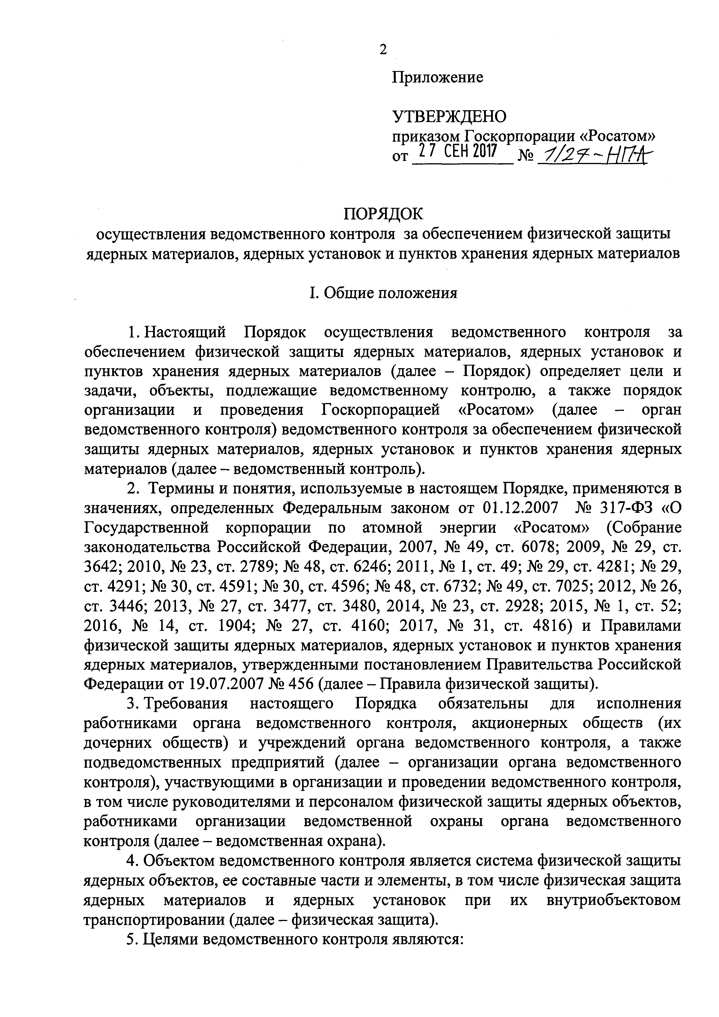 Порядок осуществления ведомственного контроля за обеспечением физической защиты ядерных материалов, ядерных установок и пунктов хранения ядерных материалов| Статус: | действует | | Название рус.: | Порядок осуществления ведомственного контроля за обеспечением физической защиты ядерных материалов, ядерных установок и пунктов хранения ядерных материалов | | Дата добавления в базу: | 01.01.2019 | | Дата актуализации: | 01.01.2021 | | Дата введения: | 30.12.2017 | | Оглавление: | I. Общие положения II. Система ведомственного контроля III. Виды ведомственных проверок IV. Планирование ведомственных проверок V. Организация ведомственных проверок VI. Проведение ведомственных проверок VII. Оформление результатов, анализ ведомственных проверок | | Утверждён: | 27.09.2017 Госкорпорация Росатом (1/27-НПА)