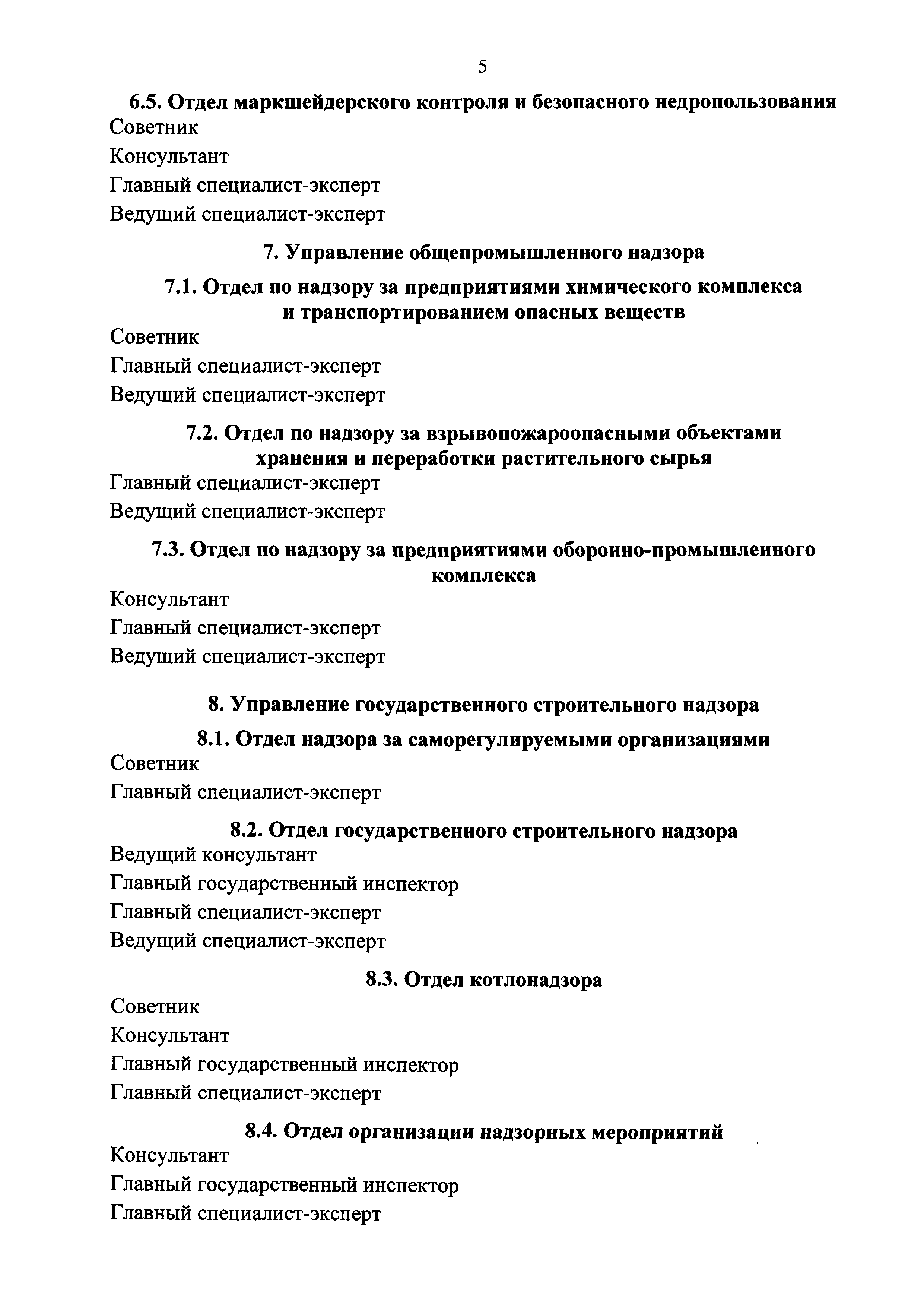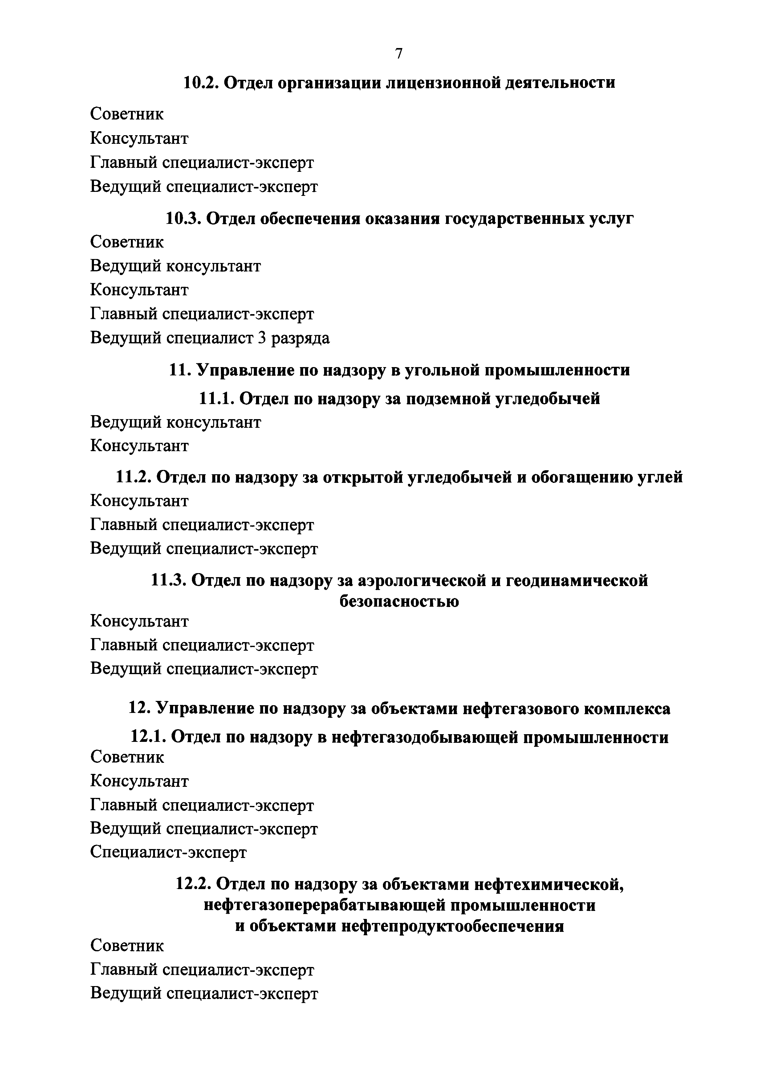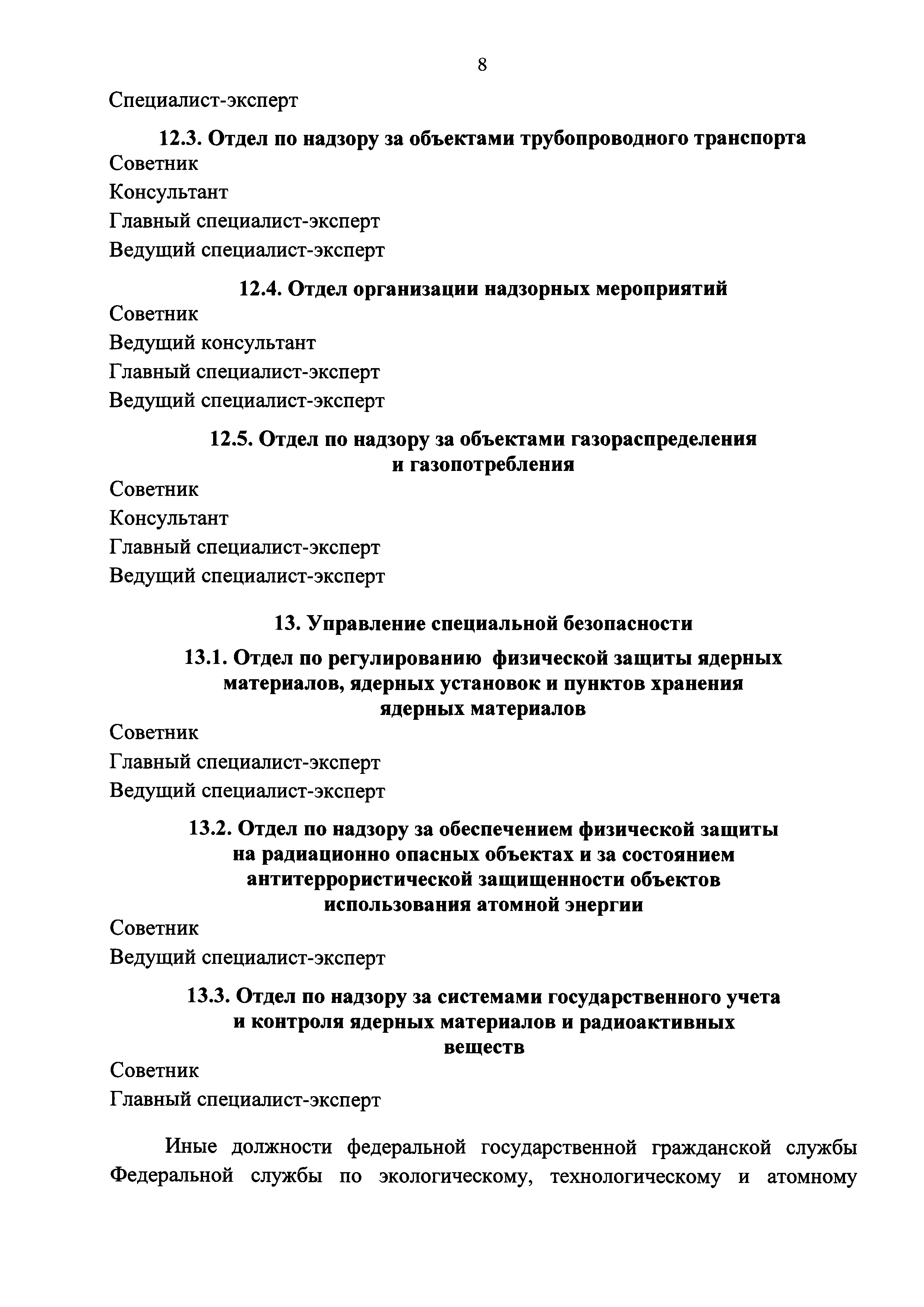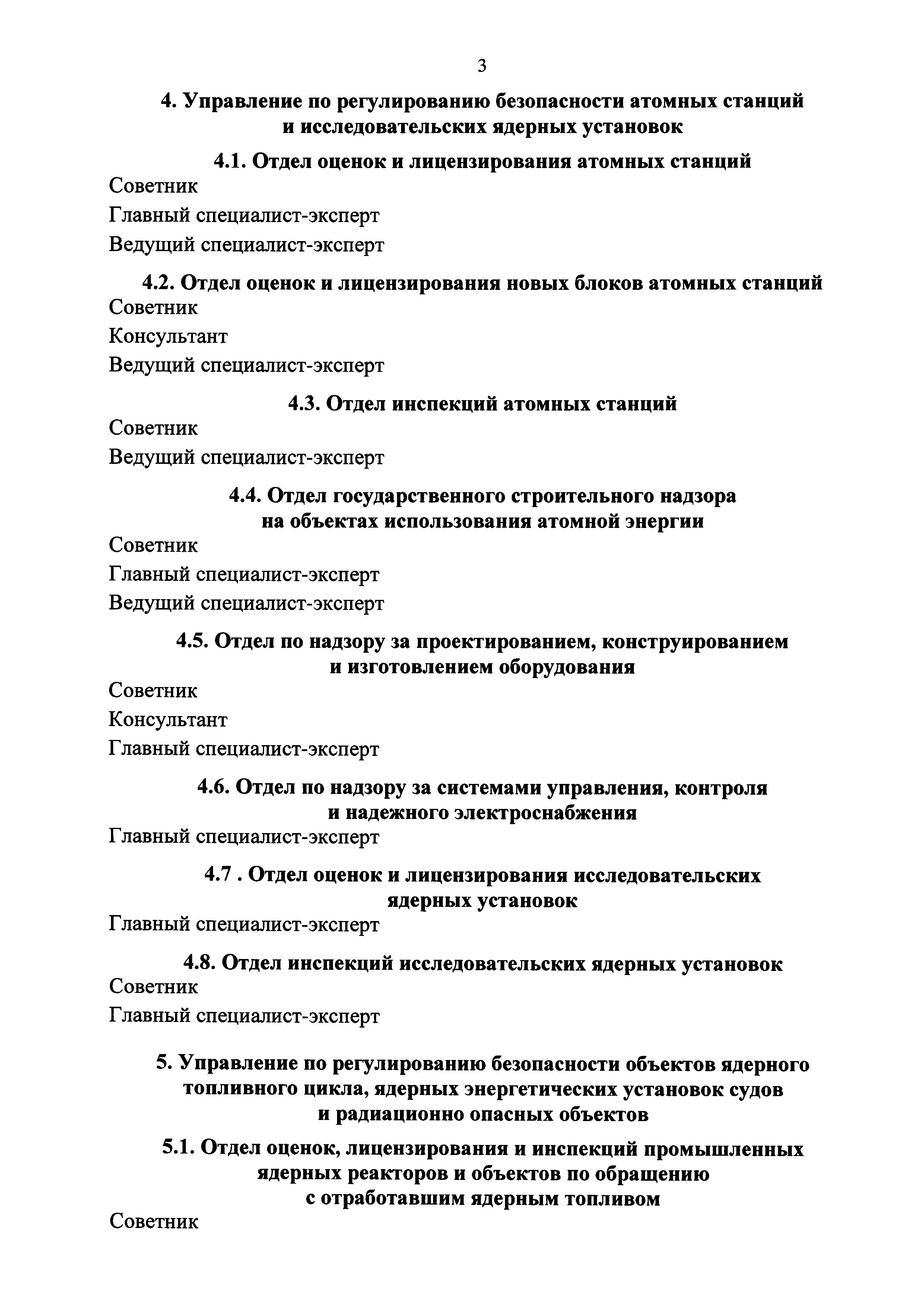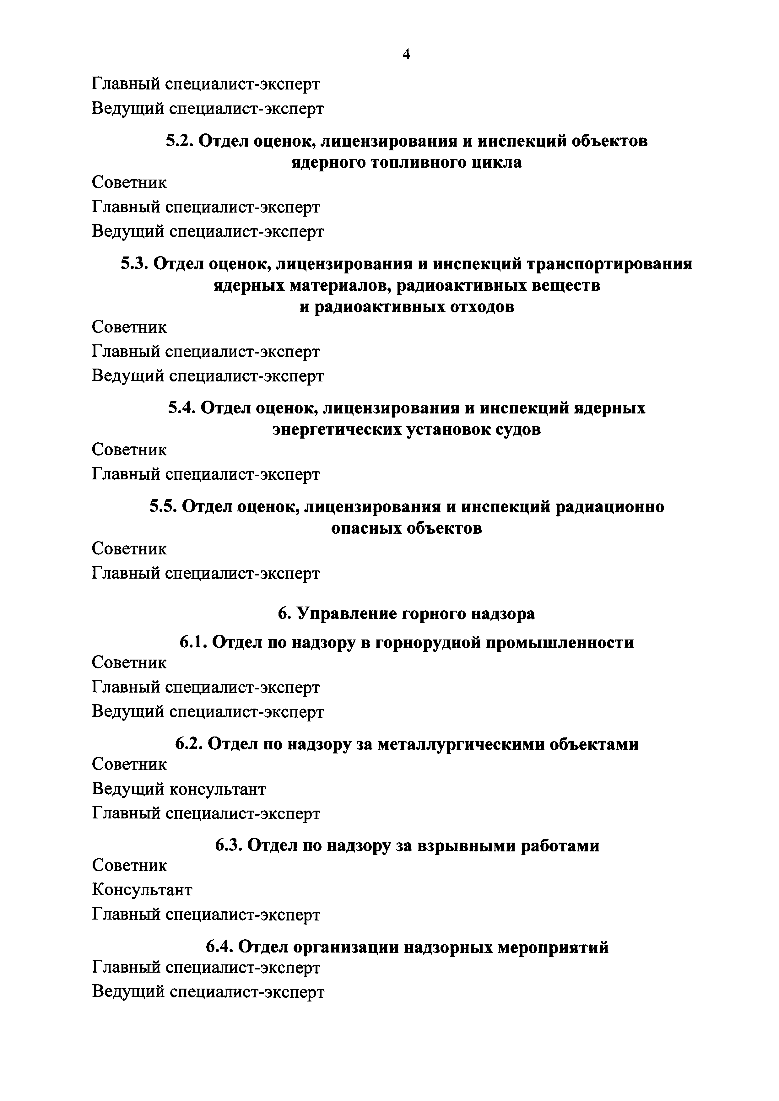 | Оглавление: | I. В центральном аппарате Федеральной службы по экологическому, технологическому и атомному надзору 1. Организационно-аналитическое управление 2. Управление экономики, финансов и государственных программ 3. Управление государственной службы и кадров 4. Управление по регулированию безопасности атомных станций и исследовательских ядерных установок 5. Управление по регулированию безопасности объектов ядерного топливного цикла, ядерных энергетических установок судов и радиационно опасных объектов 6. Управление горного надзора 7. Управление общепромышленного надзора 8. Управление государственного строительного надзора 9. Управление государственного энергетического надзора 10. Правовое управление 11. Управление по надзору в угольной промышленности 12. Управление по надзору за объектами нефтегазового комплекса 13. Управление специальной безопасности II. В территориальных органах Федеральной службы по экологическому, технологическому и атомному надзору |