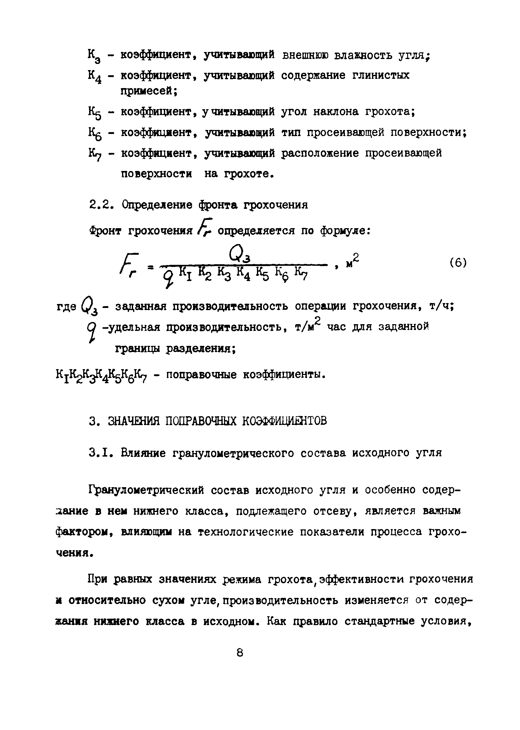 | Оглавление: | Введение 1 Общие положения 2 Основные положения методики 2.1 Производительность грохота 2.2 Определение фронта грохочения 3 Значения поправочных коэффициентов 3.1 Влияние гранулометрического состава исходного угля 3.2 Влияние требуемой эффективности грохочения 3.3 Влияние влажности угля 3.4 Влияние глинистых примесей 3.5 Влияние угла наклона грохота 3.6 Влияние типа просеивающей поверхности 3.7 Влияние расположения просеивающей поверхности на грохоте 4 Расчет производительности инерционных грохотов 4.1 Предварительное грохочение углей 4.2 Подготовительное грохочение углей 4.3 Окончательное грохочение углей Приложение 1. Максимальная производительность по питанию Qпс инерционных грохотов при сухом грохочении углей Приложение 2. Содержание гигроскопической влаги в углях по основным угольным бассейнам Приложение 3. Методические указания по определению глинистых примесей в углях |