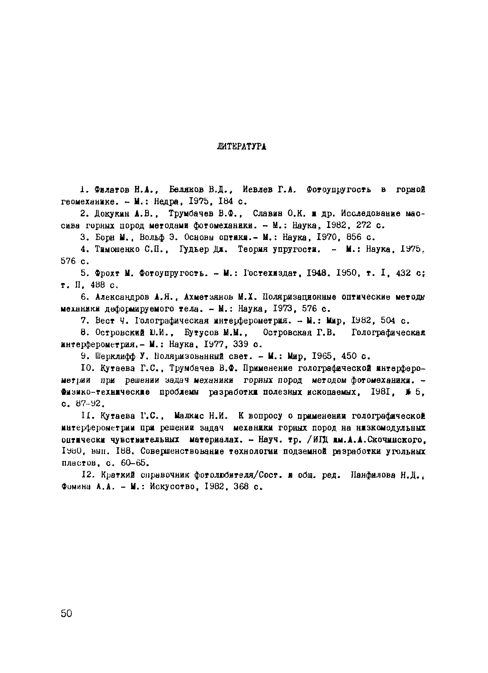 | Оглавление: | Введение 1 Некоторые особенности моделирования массива горных пород 2 Способы измерения экспериментальных величин 3 Способы расшифровки голографических интерференционных картин полос 3.1 Основы голографической интерферометрии 3.2 Расчет интенсивности интерференционных картин полос 3.3 Способы получения суммы и разности главных напряжений 3.4 Способы получения абсолютной разности хода 4 Техника получения поляризационно-голографических интерферограмм 4.1 Источники света для голографии 4.2 Расширение лазерного пучка света 4.3 Разделение лазерного пучка 4.4 Виброизоляция голографической установки 4.5 Регистрирующие среды для голографии 4.6 Голография сфокусированных изображений 4.7 Техника фотографирования восстановленных голографических изображений 5 Пример решения конкретных задач 5.1 Поляризационно-голографическая установка 5.2 Восстановление голографического изображения 5.3 Определение абсолютных оптических коэффициентов напряжения материала исследуемой модели 5.4 Определение главных напряжений в исследуемой модели Заключение Литература |