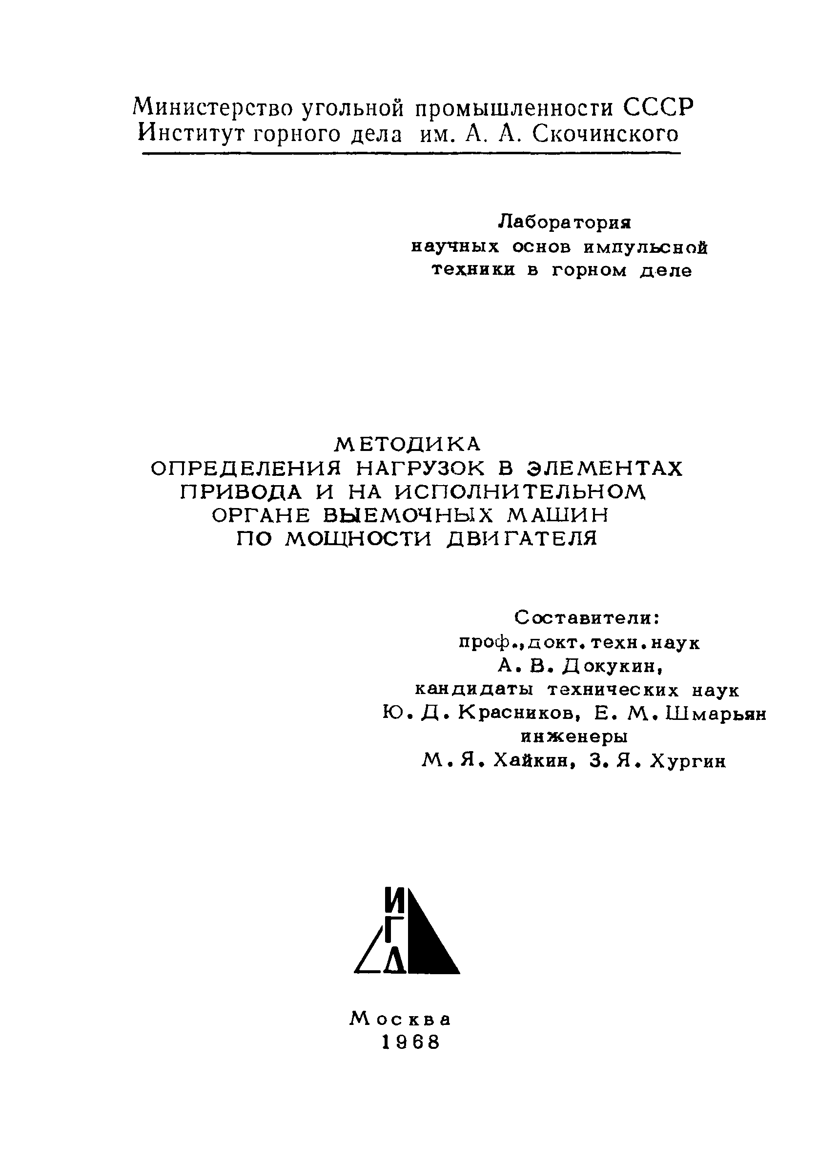 | Название рус.: | Методика определения нагрузок в элементах привода и на исполнительном органе выемочных машин по мощности двигателя |