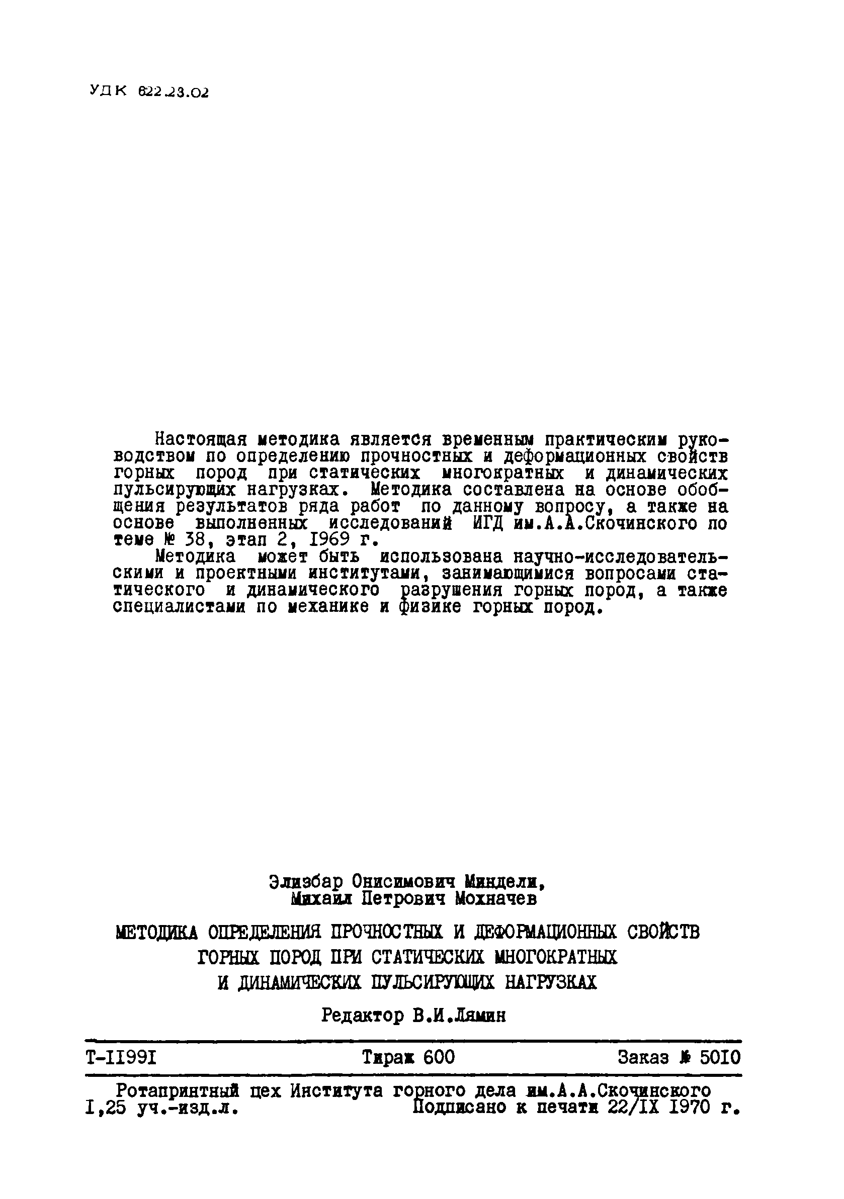 | Название рус.: | Методика определения прочностных и деформационных свойств горных пород при статистических многократных и динамических пульсирующих нагрузках |