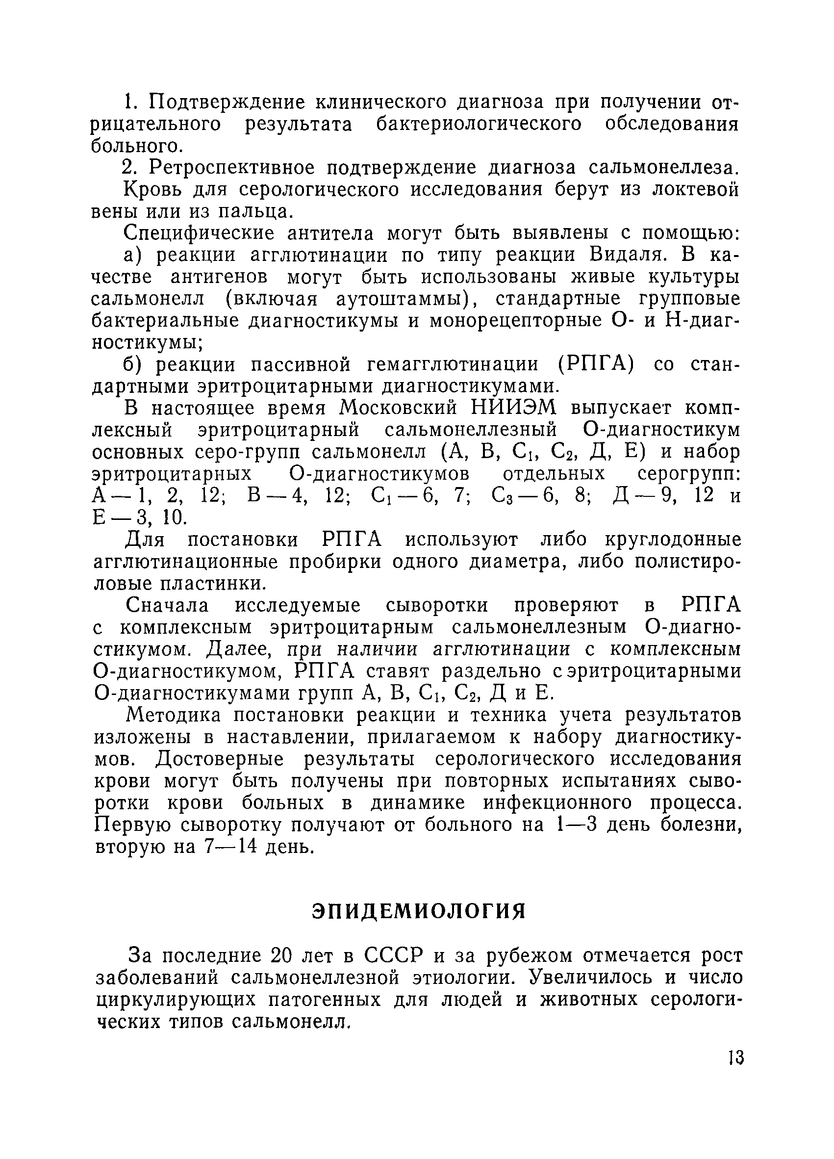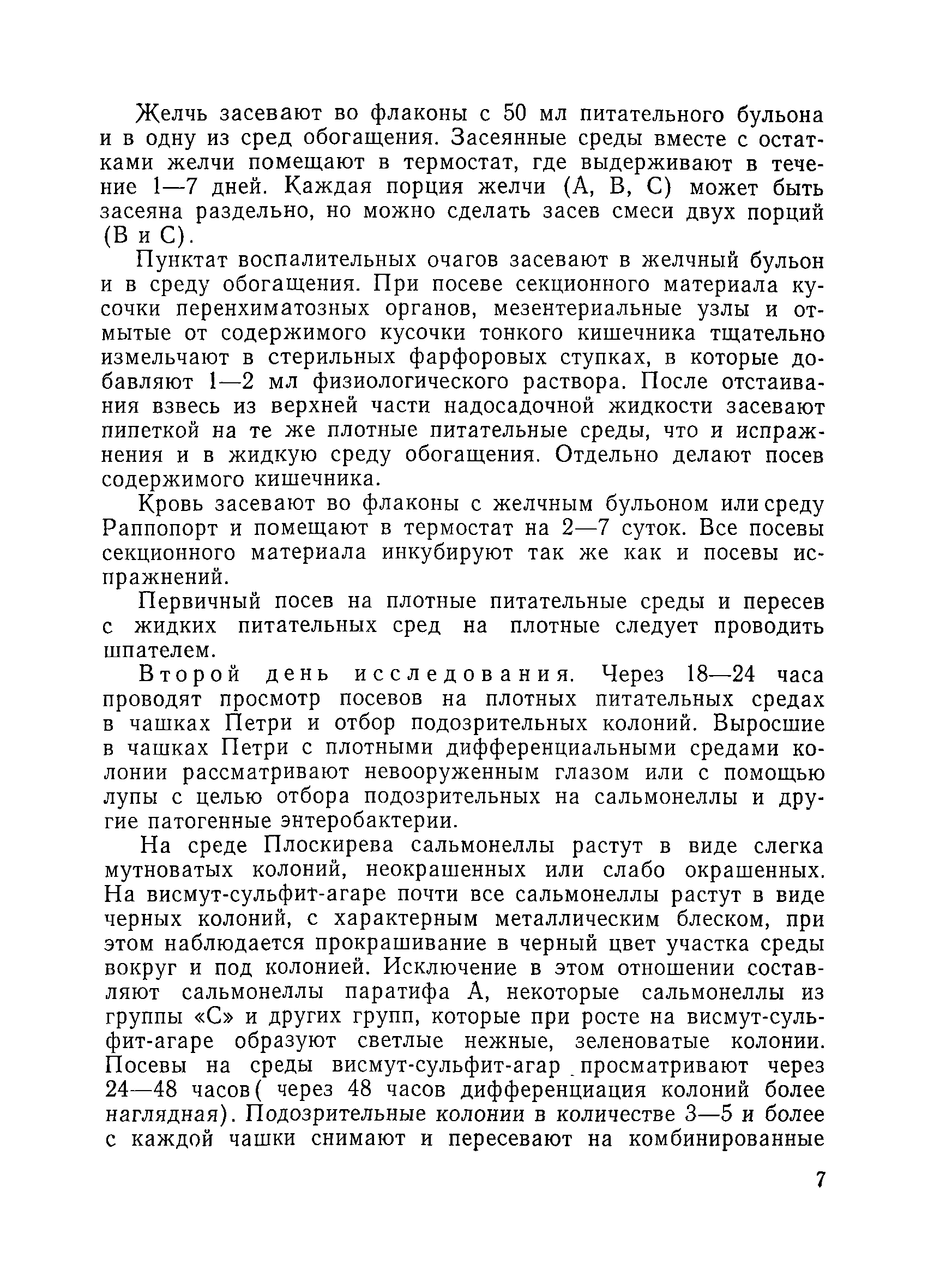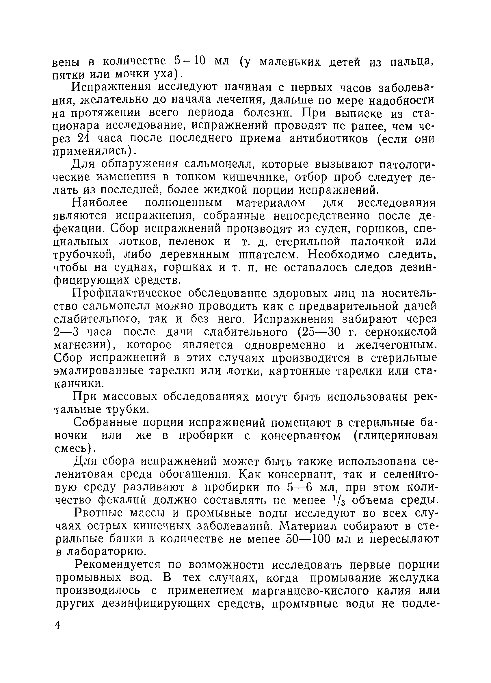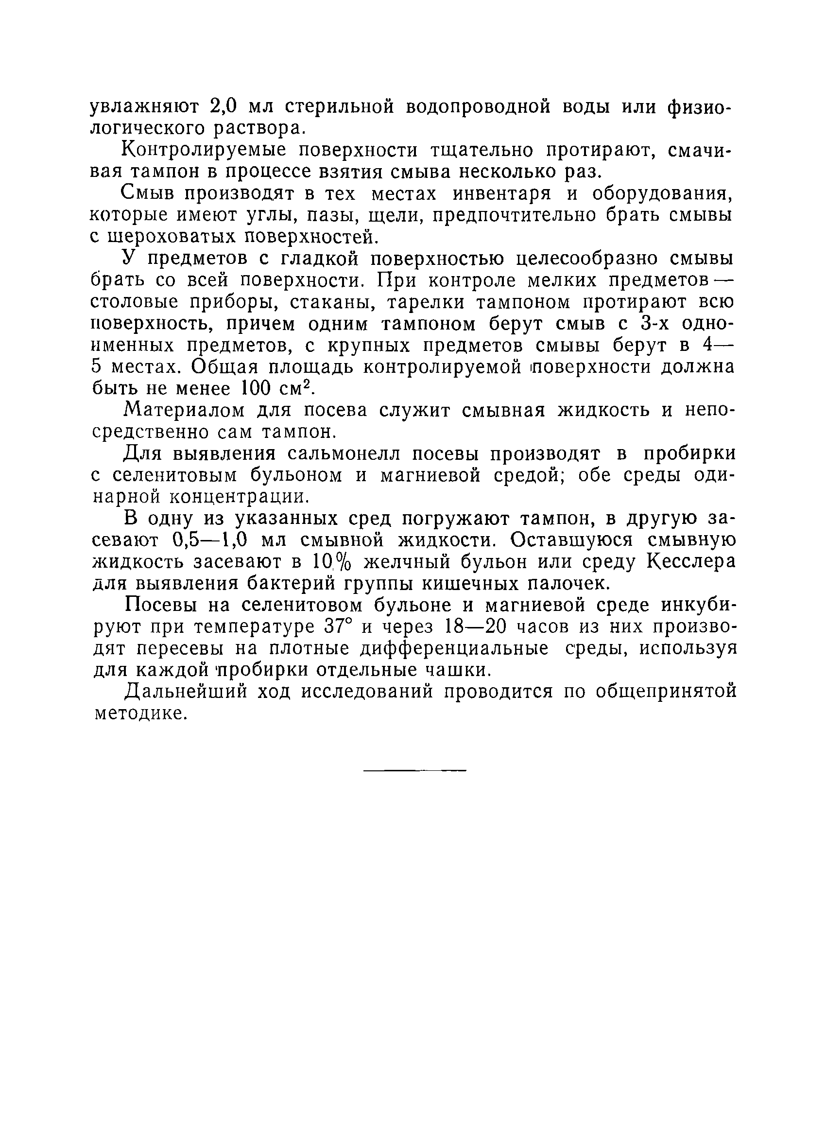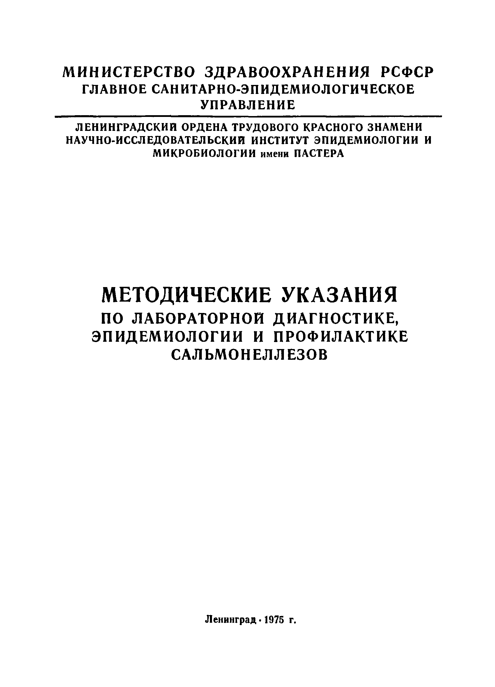 Методические указания по лабораторной диагностике, эпидемиологии и профилактике сальмонеллезов| Статус: | справочные материалы, мп, тпр | | Название рус.: | Методические указания по лабораторной диагностике, эпидемиологии и профилактике сальмонеллезов | | Дата добавления в базу: | 01.01.2019 | | Дата актуализации: | 01.01.2021 | | Область применения: | Документ предназначен сделать более целенаправленной и эффективной работу органов здравоохранения, санитарной и ветеринарной служб в области борьбы с сальмонеллезами, а также координировать и по возможности унифицировать и улучшить методы и лабораторного выявления, учета и регистрации, эпидемиологического анализа и профилактики этих заболеваний | | Оглавление: | Лабораторная диагностика Бактериологические исследования Материал, подлежащий исследованию, сроки и способы его сбора Ход исследования Серологические исследования Эпидемиология Мероприятия по эпидемиологическому выявлению, регистрации, учету, эпидемиологическому обследованию больных и бактерионосителей 1. Выявление больных 2. Регистрация и учет 3. Выявление бактерионосителей 4. Эпидемиологическое обследование 5. Мероприятия в очаге инфекции 6. Предупреждение распространения инфекции в детских больницах (отделениях), в палатах для новорожденных, домах ребенка и яслях Санитарно-гигиенические мероприятия, осуществляемые органами государственного санитарного надзора совместно с ведомственными санитарными службами А. Санитарно-гигиенические мероприятия Лабораторный контроль Б. Санитарно-ветеринарные мероприятия В. Санитарно-бактериологические исследования 1. Методика исследования пищевых продуктов 2. Методика исследования питьевой воды, воды открытых водоемов и сточной жидкости 3. Методика исследования питьевой воды с использованием мембранных фильтров 4. Методика исследования воды питьевой, открытых водоемов и сточной жидкости при использовании сред обогащения 5. Методика исследования воздушной среды 6. Методика исследования смывов Приложение 1. Контроль сред обогащения количественным микробиологическим методом Приложение 2. Методики приготовления сред Приложение 3. Схема Кауфмана-Уайта Приложение 4. Инструкция по применению сальмоноллезного О-бактериофага | | Разработан: | НИИ эпидемиологии и микробиологии им. Пастера