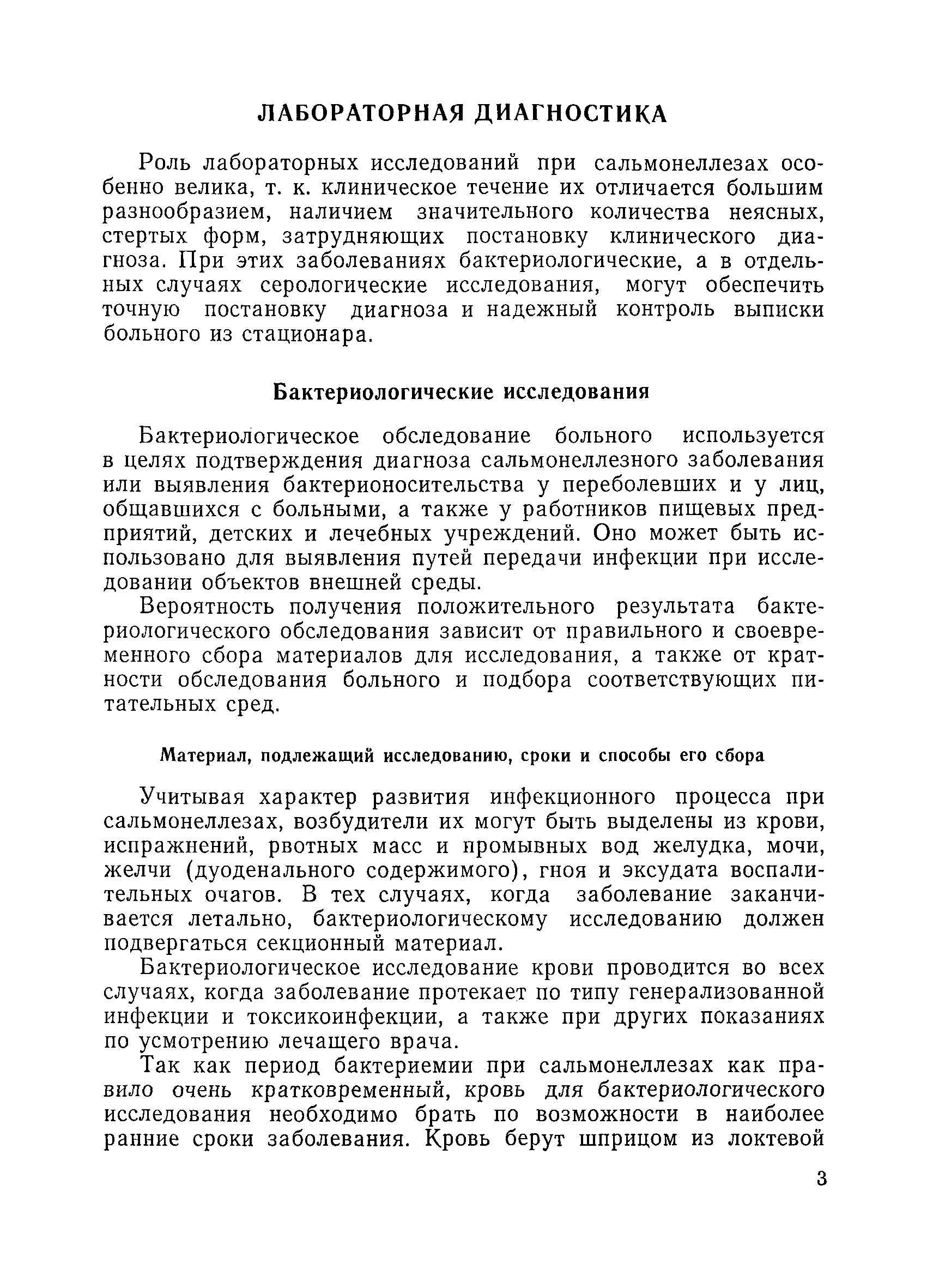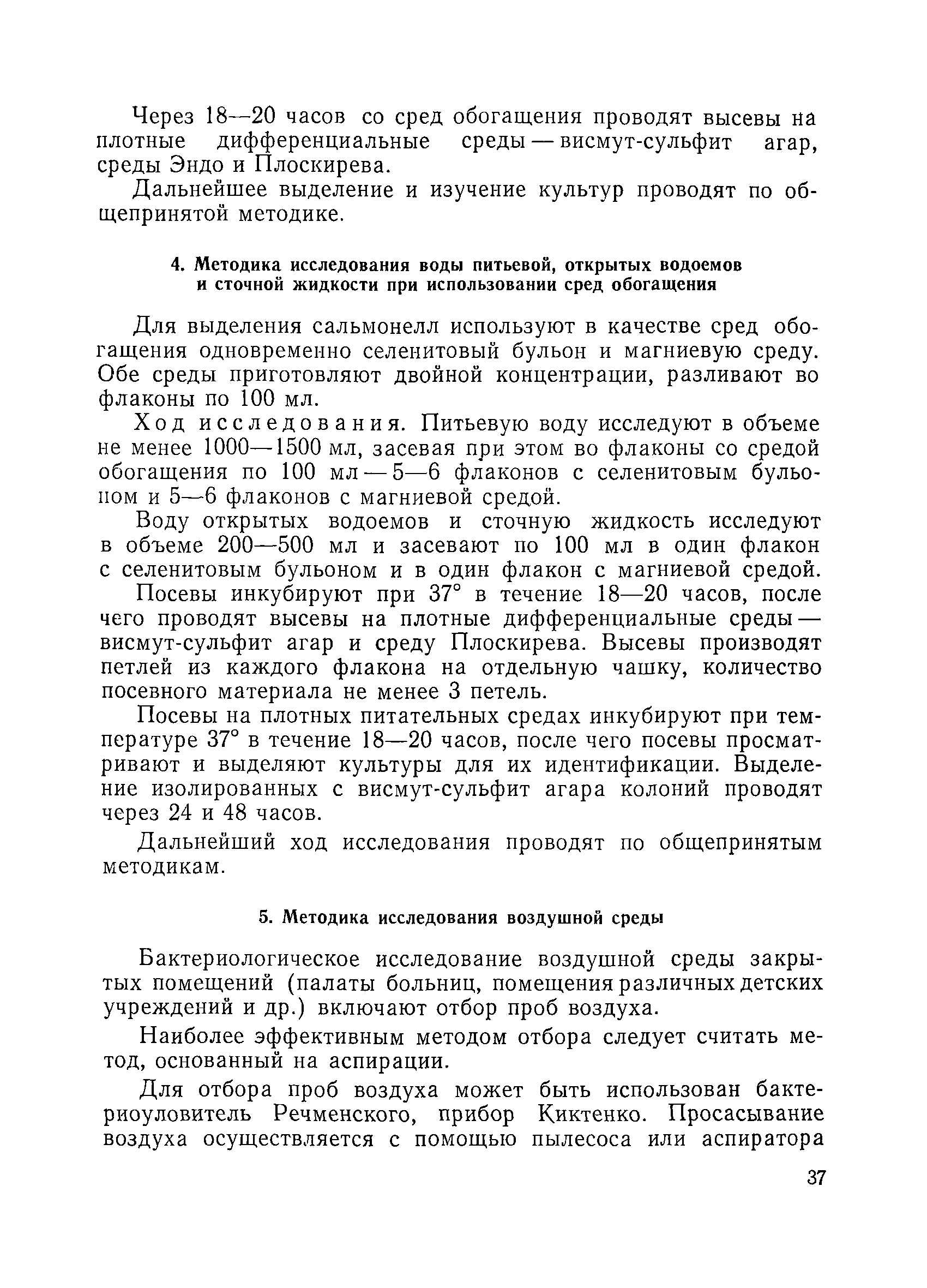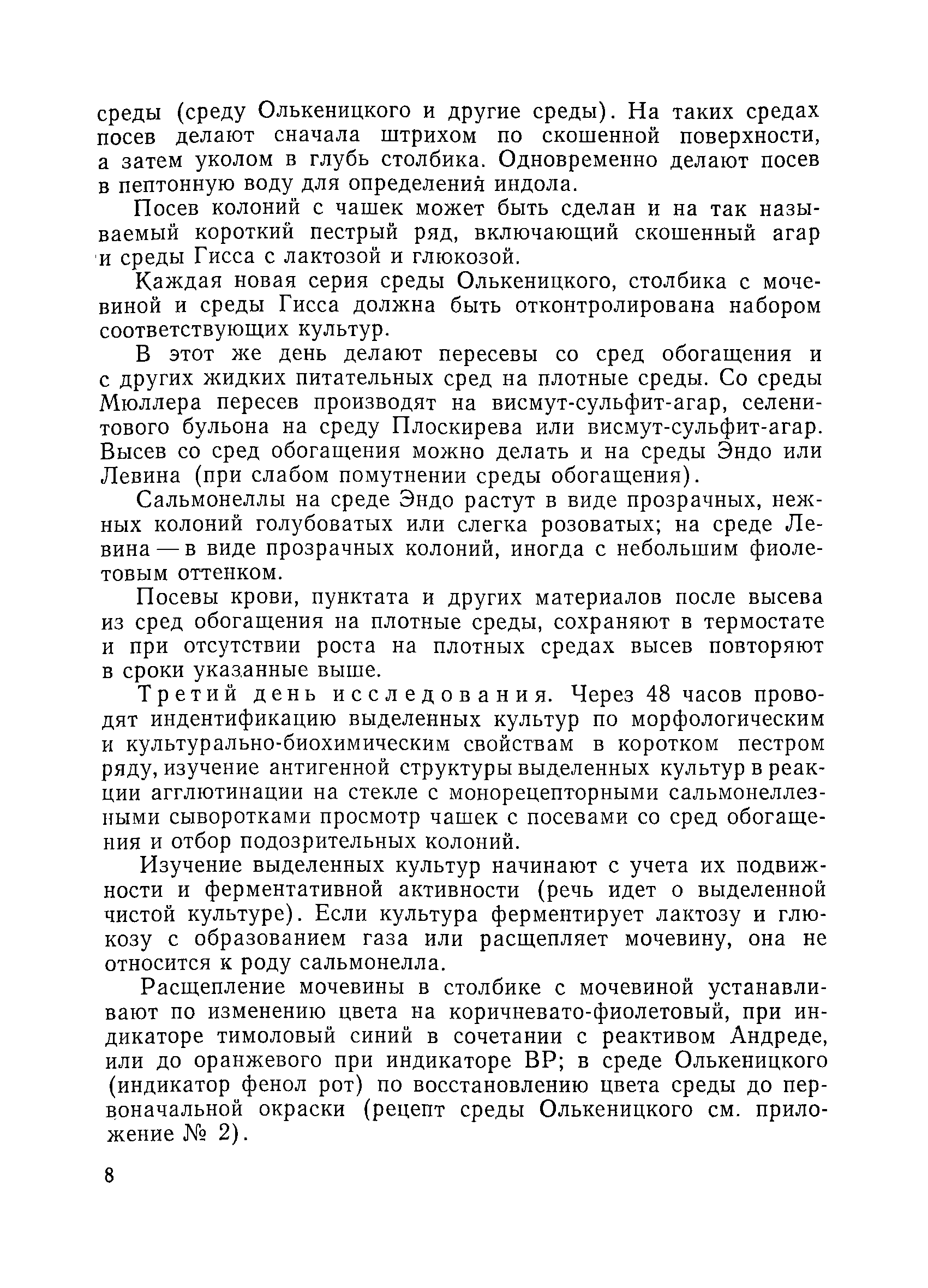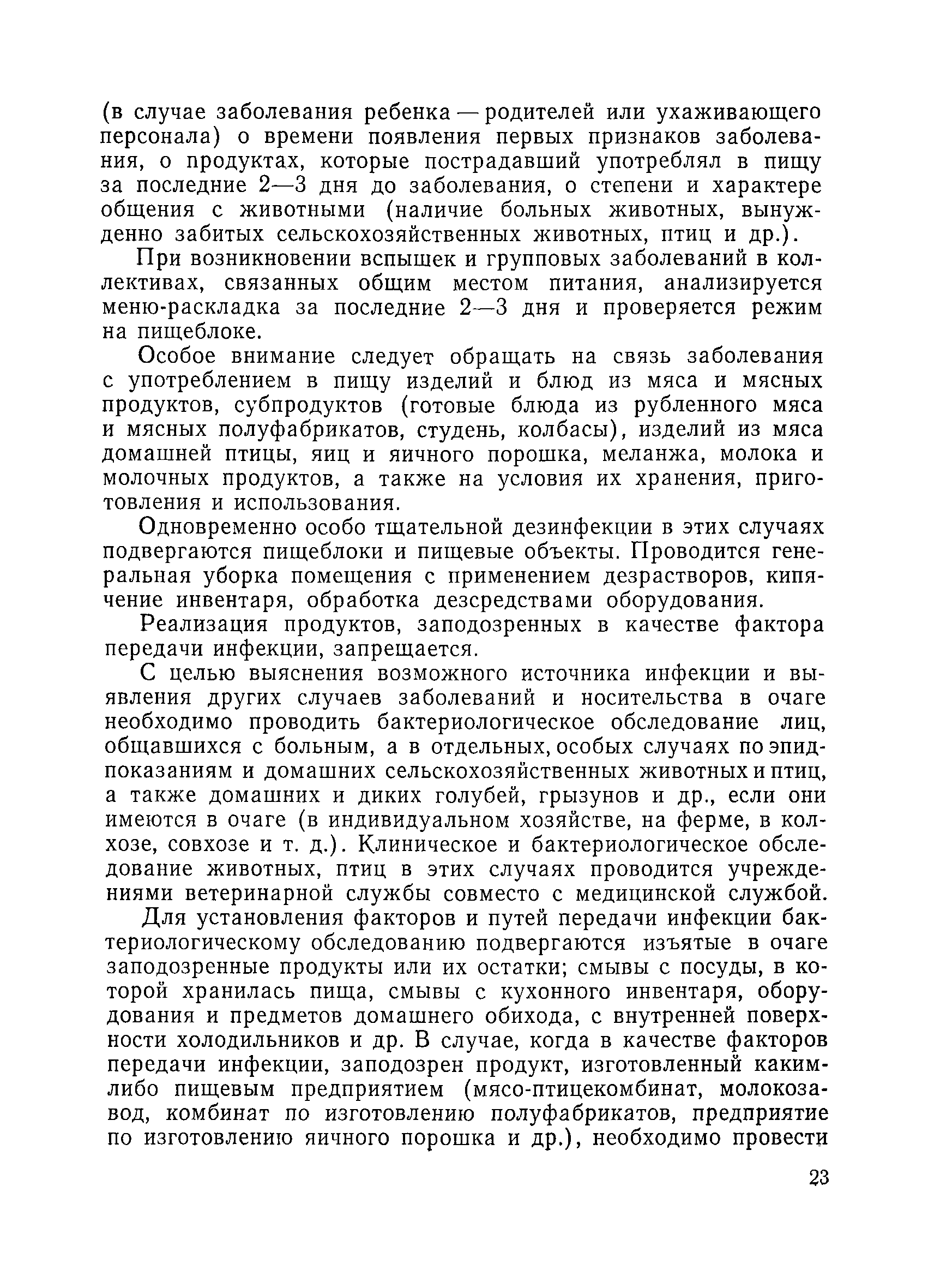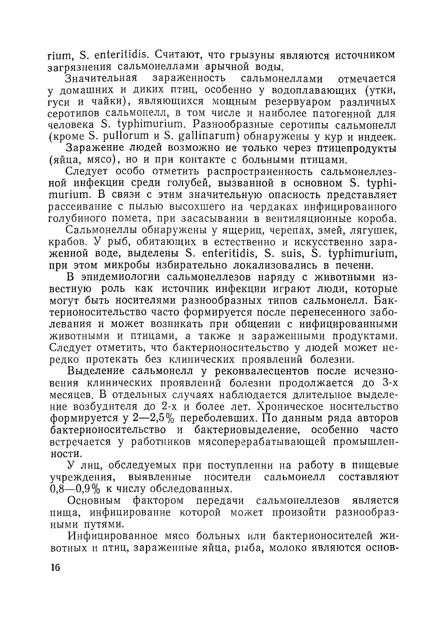 Методические указания по лабораторной диагностике, эпидемиологии и профилактике сальмонеллезов| Статус: | справочные материалы, мп, тпр | | Название рус.: | Методические указания по лабораторной диагностике, эпидемиологии и профилактике сальмонеллезов | | Дата добавления в базу: | 01.01.2019 | | Дата актуализации: | 01.01.2021 | | Область применения: | Документ предназначен сделать более целенаправленной и эффективной работу органов здравоохранения, санитарной и ветеринарной служб в области борьбы с сальмонеллезами, а также координировать и по возможности унифицировать и улучшить методы и лабораторного выявления, учета и регистрации, эпидемиологического анализа и профилактики этих заболеваний | | Оглавление: | Лабораторная диагностика Бактериологические исследования Материал, подлежащий исследованию, сроки и способы его сбора Ход исследования Серологические исследования Эпидемиология Мероприятия по эпидемиологическому выявлению, регистрации, учету, эпидемиологическому обследованию больных и бактерионосителей 1. Выявление больных 2. Регистрация и учет 3. Выявление бактерионосителей 4. Эпидемиологическое обследование 5. Мероприятия в очаге инфекции 6. Предупреждение распространения инфекции в детских больницах (отделениях), в палатах для новорожденных, домах ребенка и яслях Санитарно-гигиенические мероприятия, осуществляемые органами государственного санитарного надзора совместно с ведомственными санитарными службами А. Санитарно-гигиенические мероприятия Лабораторный контроль Б. Санитарно-ветеринарные мероприятия В. Санитарно-бактериологические исследования 1. Методика исследования пищевых продуктов 2. Методика исследования питьевой воды, воды открытых водоемов и сточной жидкости 3. Методика исследования питьевой воды с использованием мембранных фильтров 4. Методика исследования воды питьевой, открытых водоемов и сточной жидкости при использовании сред обогащения 5. Методика исследования воздушной среды 6. Методика исследования смывов Приложение 1. Контроль сред обогащения количественным микробиологическим методом Приложение 2. Методики приготовления сред Приложение 3. Схема Кауфмана-Уайта Приложение 4. Инструкция по применению сальмоноллезного О-бактериофага | | Разработан: | НИИ эпидемиологии и микробиологии им. Пастера