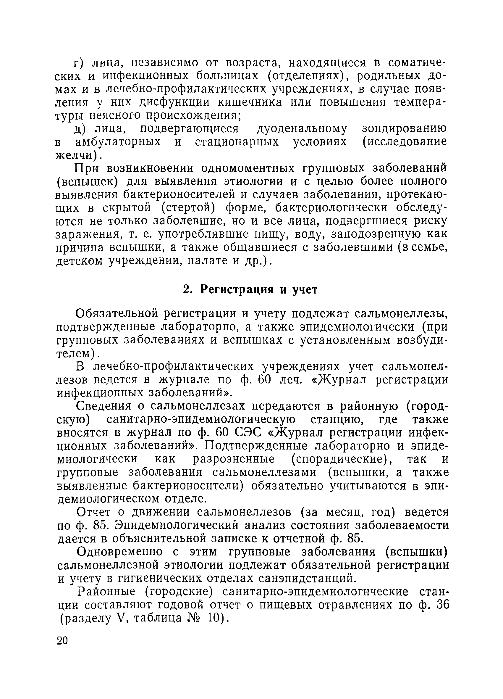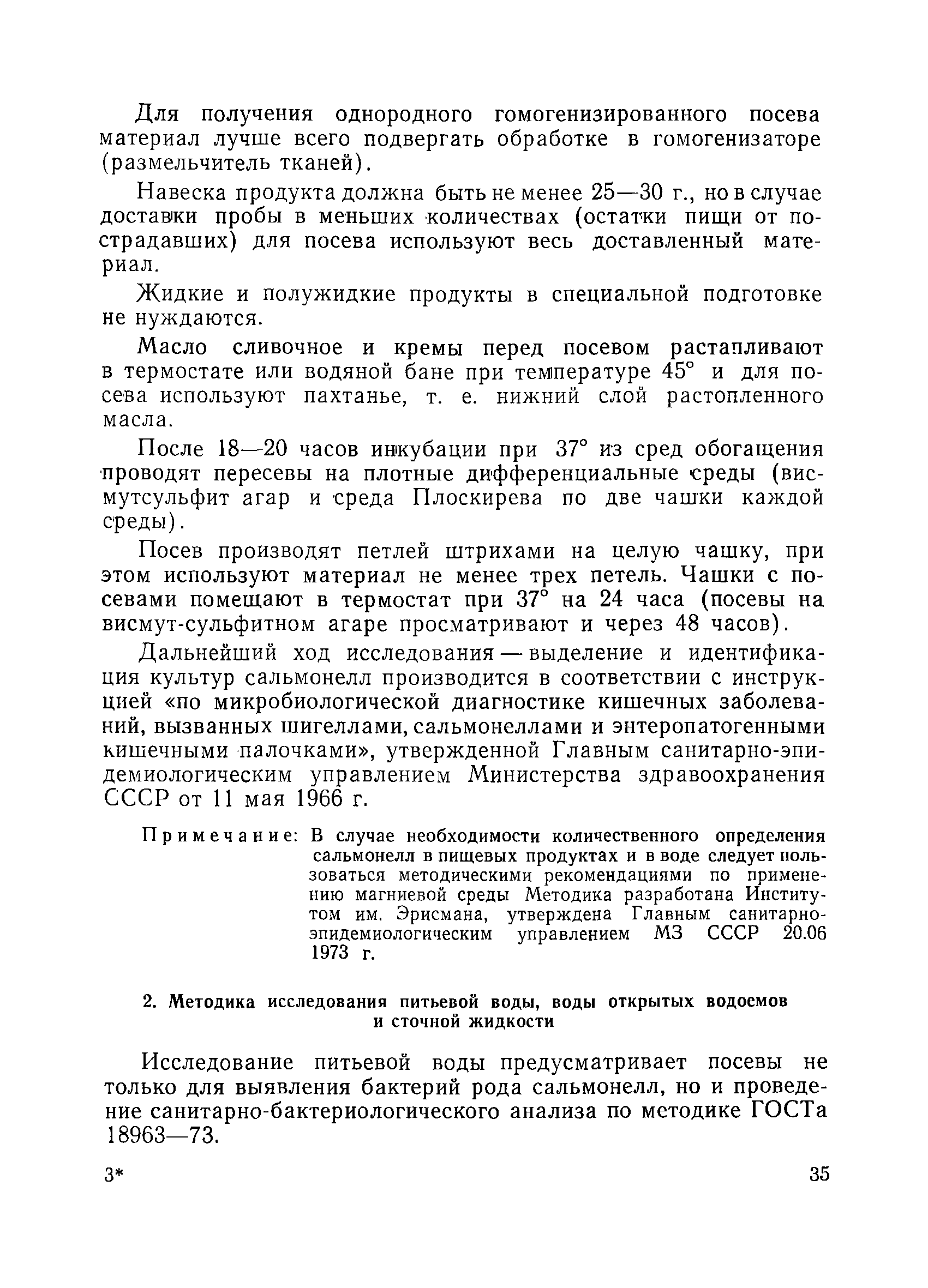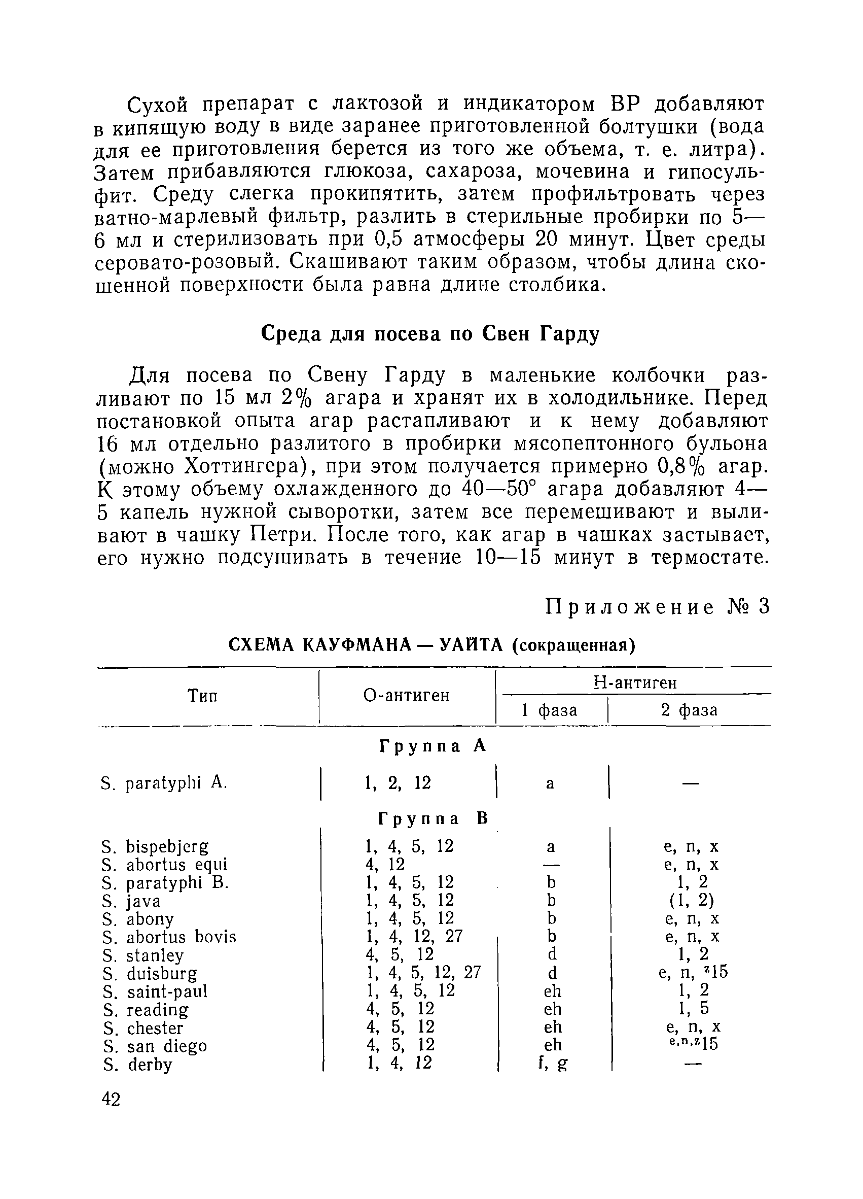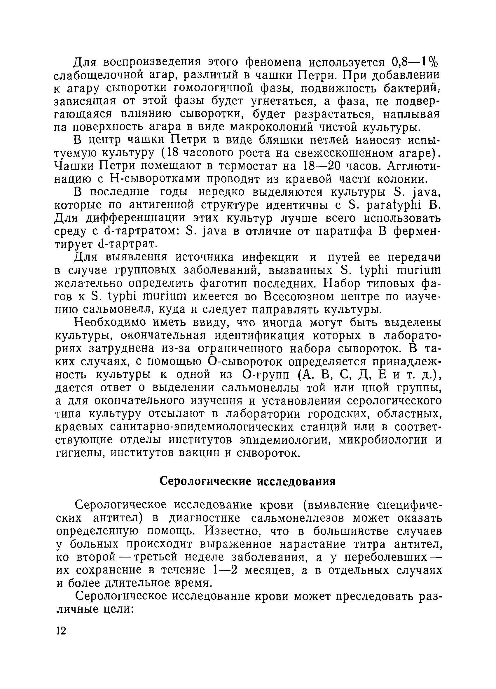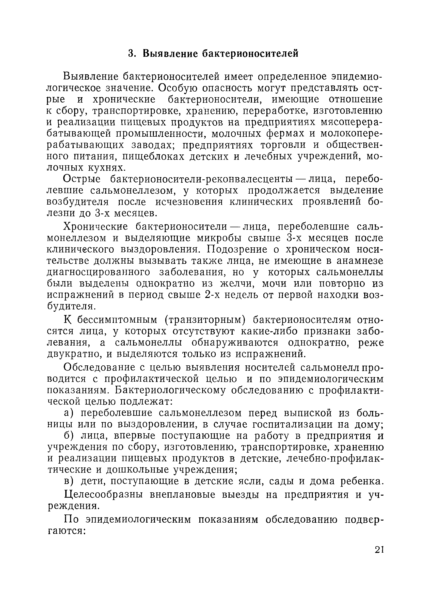 Методические указания по лабораторной диагностике, эпидемиологии и профилактике сальмонеллезов| Статус: | справочные материалы, мп, тпр | | Название рус.: | Методические указания по лабораторной диагностике, эпидемиологии и профилактике сальмонеллезов | | Дата добавления в базу: | 01.01.2019 | | Дата актуализации: | 01.01.2021 | | Область применения: | Документ предназначен сделать более целенаправленной и эффективной работу органов здравоохранения, санитарной и ветеринарной служб в области борьбы с сальмонеллезами, а также координировать и по возможности унифицировать и улучшить методы и лабораторного выявления, учета и регистрации, эпидемиологического анализа и профилактики этих заболеваний | | Оглавление: | Лабораторная диагностика Бактериологические исследования Материал, подлежащий исследованию, сроки и способы его сбора Ход исследования Серологические исследования Эпидемиология Мероприятия по эпидемиологическому выявлению, регистрации, учету, эпидемиологическому обследованию больных и бактерионосителей 1. Выявление больных 2. Регистрация и учет 3. Выявление бактерионосителей 4. Эпидемиологическое обследование 5. Мероприятия в очаге инфекции 6. Предупреждение распространения инфекции в детских больницах (отделениях), в палатах для новорожденных, домах ребенка и яслях Санитарно-гигиенические мероприятия, осуществляемые органами государственного санитарного надзора совместно с ведомственными санитарными службами А. Санитарно-гигиенические мероприятия Лабораторный контроль Б. Санитарно-ветеринарные мероприятия В. Санитарно-бактериологические исследования 1. Методика исследования пищевых продуктов 2. Методика исследования питьевой воды, воды открытых водоемов и сточной жидкости 3. Методика исследования питьевой воды с использованием мембранных фильтров 4. Методика исследования воды питьевой, открытых водоемов и сточной жидкости при использовании сред обогащения 5. Методика исследования воздушной среды 6. Методика исследования смывов Приложение 1. Контроль сред обогащения количественным микробиологическим методом Приложение 2. Методики приготовления сред Приложение 3. Схема Кауфмана-Уайта Приложение 4. Инструкция по применению сальмоноллезного О-бактериофага | | Разработан: | НИИ эпидемиологии и микробиологии им. Пастера