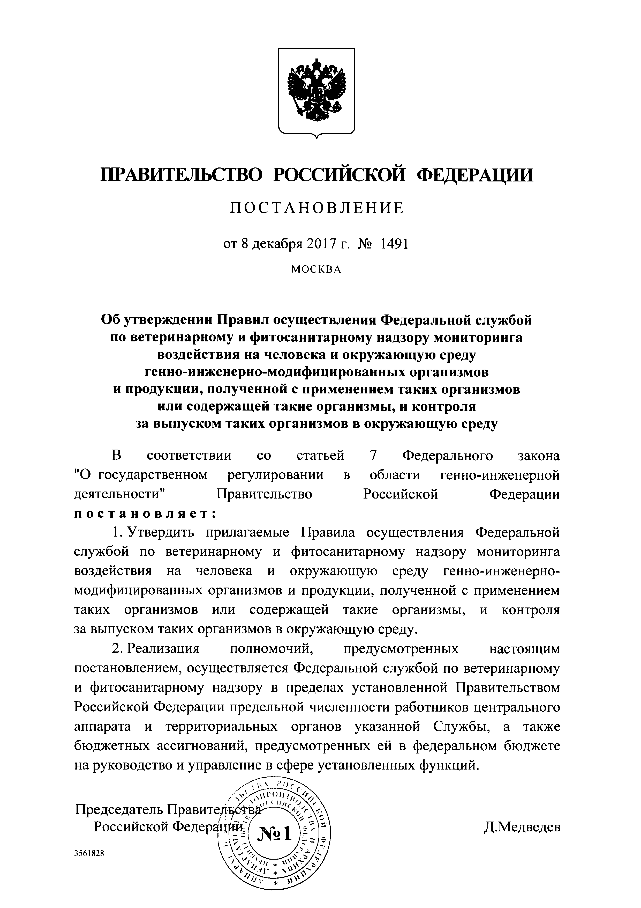 Правила осуществления Федеральной службой по ветеринарному и фитосанитарному надзору мониторинга воздействия на человека и окружающую среду генно-инженерно-модифицированных организмов и продукции, полученной с применением таких организмов или содержащей такие организмы, и контроля за выпуском таких организмов в окружающую среду| Статус: | действует | | Название рус.: | Правила осуществления Федеральной службой по ветеринарному и фитосанитарному надзору мониторинга воздействия на человека и окружающую среду генно-инженерно-модифицированных организмов и продукции, полученной с применением таких организмов или содержащей такие организмы, и контроля за выпуском таких организмов в окружающую среду | | Дата добавления в базу: | 01.01.2019 | | Дата актуализации: | 01.01.2021 | | Дата введения: | 22.12.2017 | | Область применения: | Правила устанавливают порядок осуществления Федеральной службой по ветеринарному и фитосанитарному надзору в отношении генно-инженерно-модифицированных растений и животных, предназначенных для разведения и выращивания на территории Российской Федерации, генно-инженерно-модифицированных микроорганизмов сельскохозяйственного назначения, генно-инженерно-модифицированных организмов, используемых для производства кормов и кормовых добавок для животных, генно-инженерно-модифицированных организмов, используемых для производства лекарственных средств для ветеринарного применения | | Утверждён: | 08.12.2017 Правительство Российской Федерации (1491)