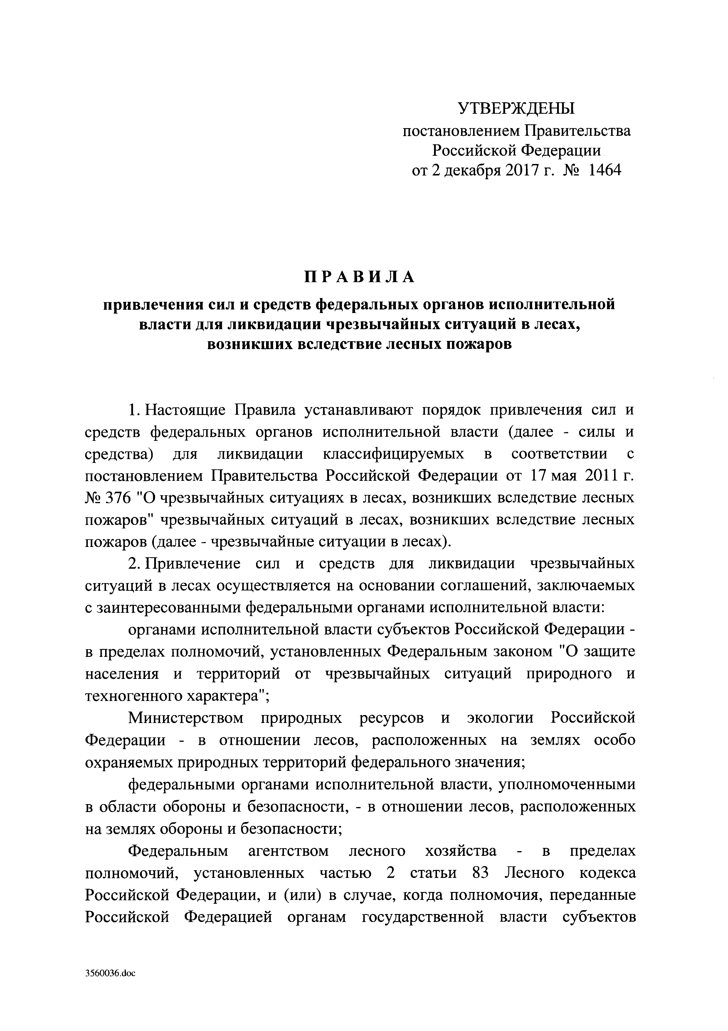 Правила привлечения сил и средств федеральных органов исполнительной власти для ликвидации чрезвычайных ситуаций в лесах, возникших вследствие лесных пожаров| Статус: | действует | | Название рус.: | Правила привлечения сил и средств федеральных органов исполнительной власти для ликвидации чрезвычайных ситуаций в лесах, возникших вследствие лесных пожаров | | Дата добавления в базу: | 01.01.2019 | | Дата актуализации: | 01.01.2021 | | Дата введения: | 13.12.2017 | | Утверждён: | 02.12.2017 Правительство Российской Федерации (1464)
