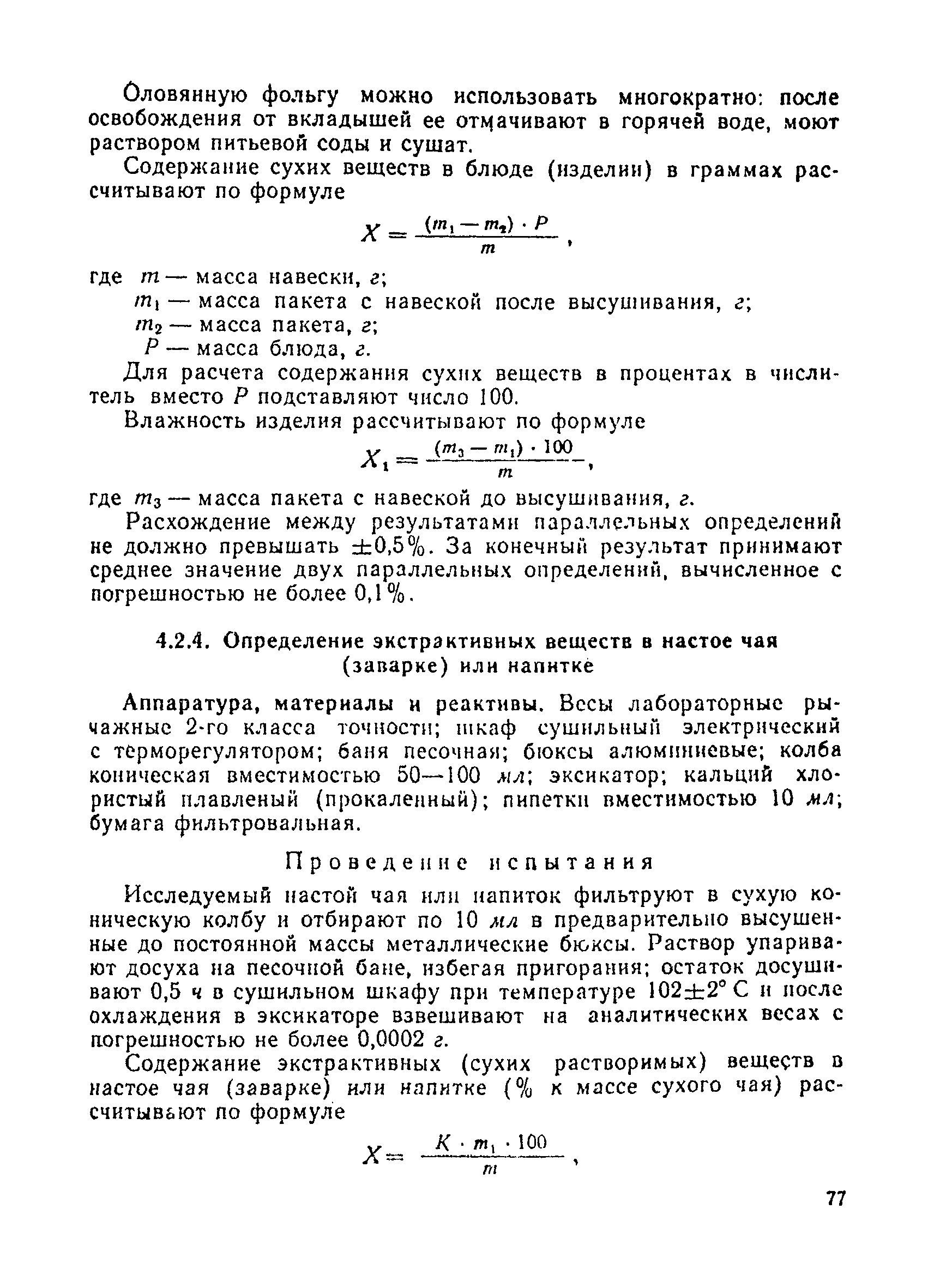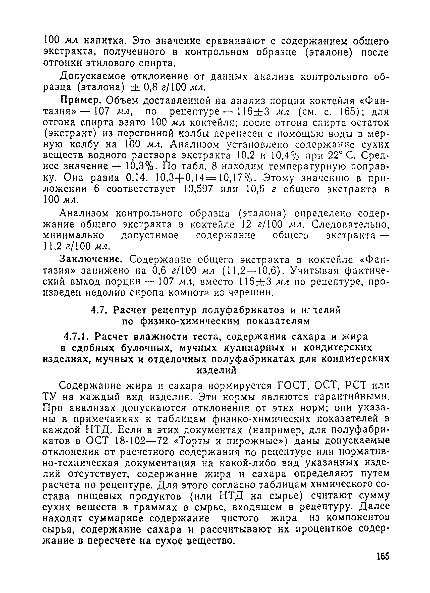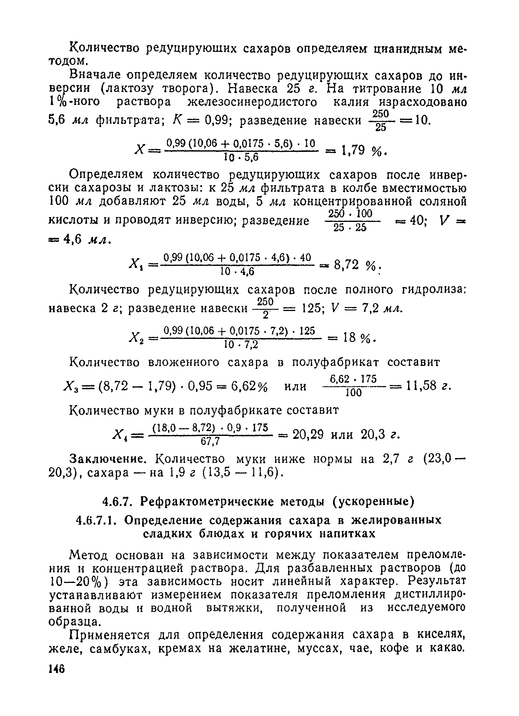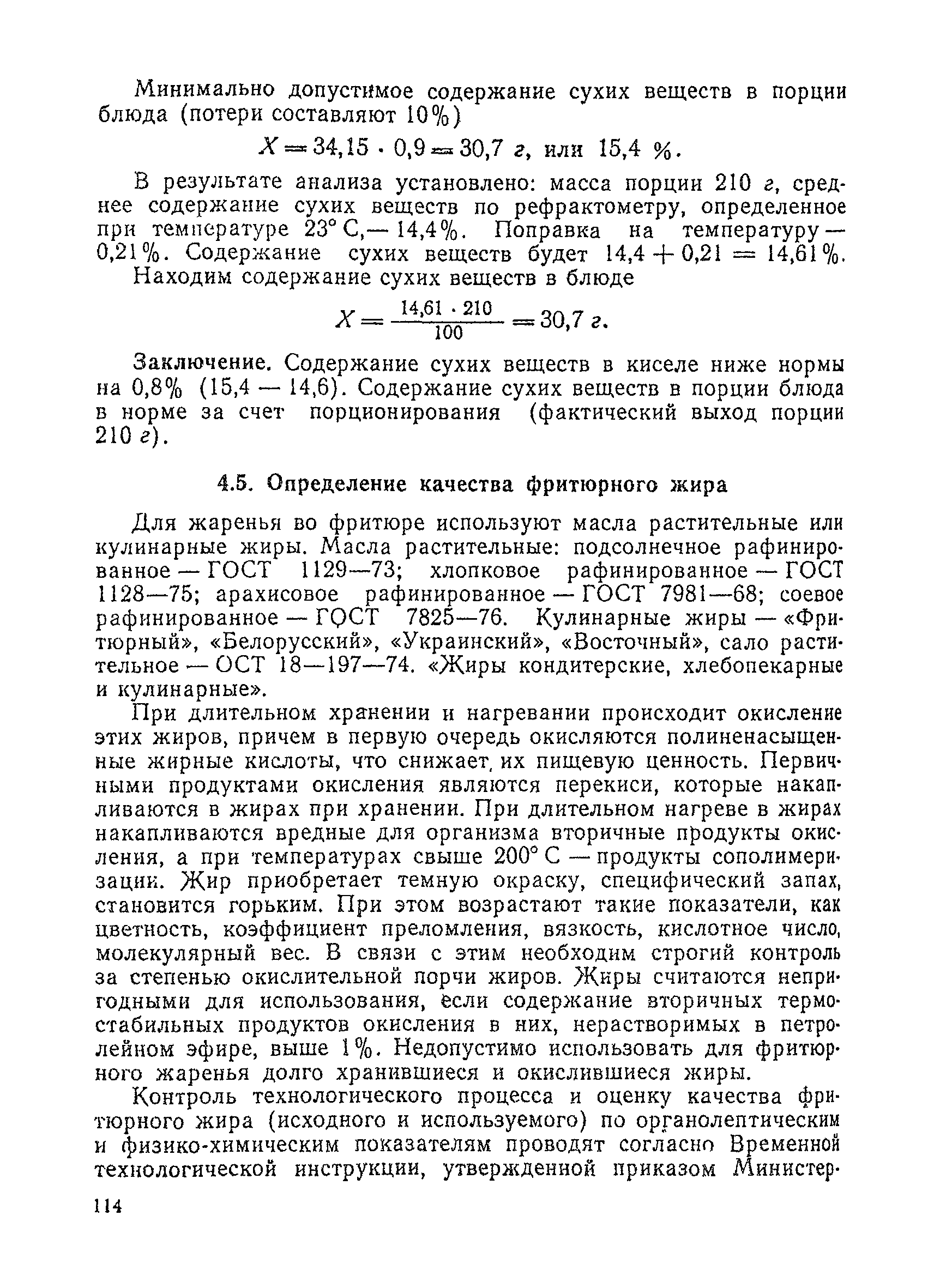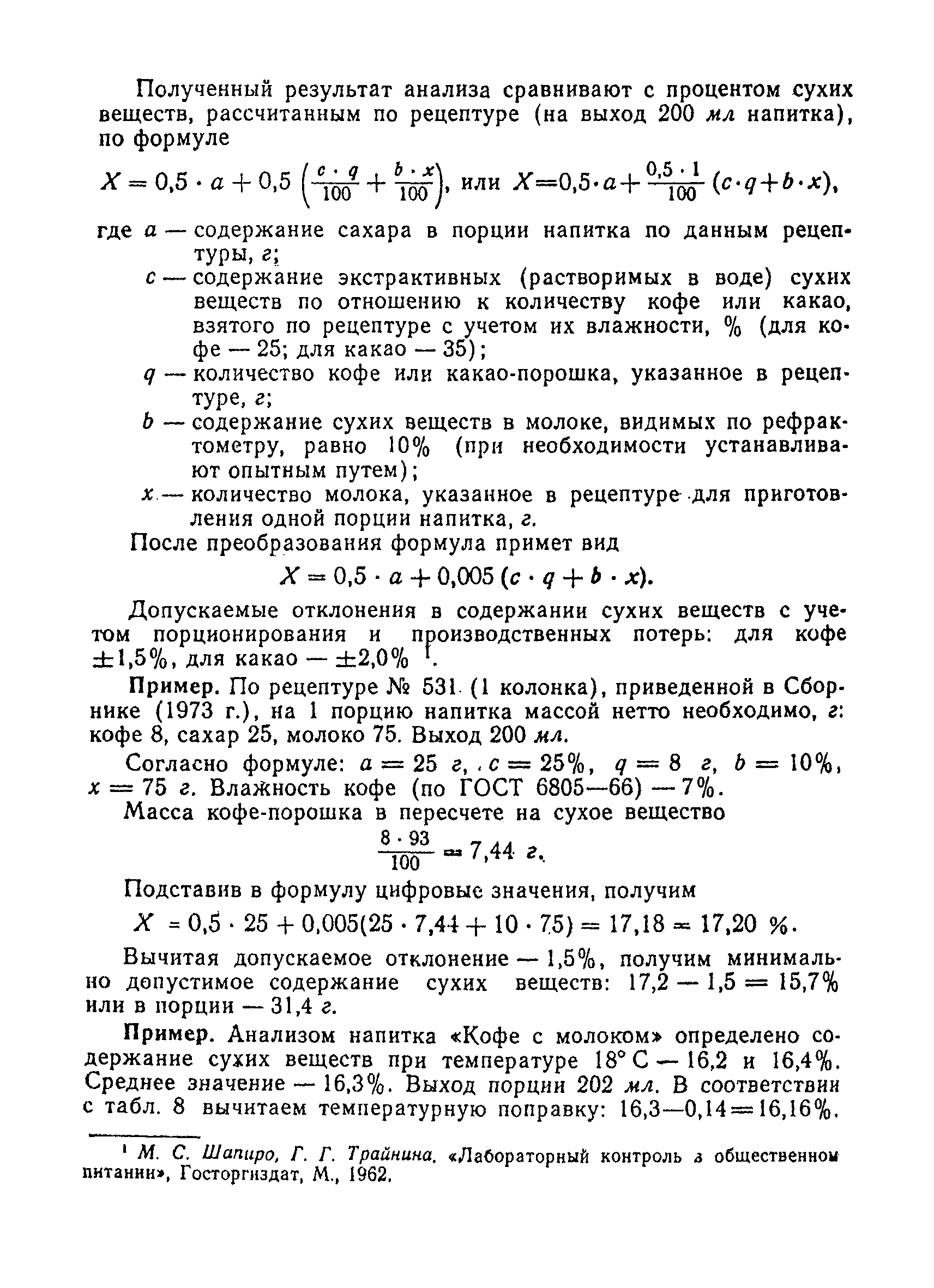 | Оглавление: | 1 Отбор проб 1.1 Основные положения по отбору проб стандартизованной продукции 1.2 Порядок отбора образцов для лабораторного анализа при обследовании предприятия 2 Подготовка проб для анализа 2.1 Взвешивание проб 2.2 Гомогенизация проб 2.3 Подготовка проб полуфабрикатов 2.4 Подготовка проб блюд и изделий 3 Основные физико-химические показатели качества сырья и кулинарной продукции 4 Методы испытаний полуфабрикатов, блюд и изделий 4.1 Общие указания 4.2 Определение содержания сухих веществ или влажности 4.2.1. Высушивание в сушильном шкафу до постоянной массы (арбитражный метод) 4.2.2. Высушивание в сушильном шкафу при температуре 130° С (ускоренный метод) 4.2.3. Высушивание в приборе К. Н. Чижовой (ускоренный метод) 4.2.4. Определение экстрактивных веществ в настое чая (заварке) или напитке 4.2.5. Рефрактометрический метод определения содержания сухих веществ 4.2.6. Определение полноты вложения сырья в горячие и холодные напитки (кофе и чай) 4.3 Определение содержания жира 4.3.1. Экстракционно-весовой метод по обезжиренному остатку (арбитражный) 4.3.2. Рефрактометрический метод (ускоренный) 4.3.3. Метод Гербера (кислоты с применением жиромеров) 4.3.4. Экстракционно-весовой метод определения жира (ускоренный) 4.4 Расчет содержания сухих веществ и жира по рецептурам блюд м изделий (с примерами расчетов) 4.5 Определение качества фритюрного жира 4.5.1. Оперативный производственный контроль качества фритюра 4.5.2. Лабораторный контроль качества фритюра 4.6 Определение содержания сахаров 4.6.1. Приготовление растворов редуцирующих сахаров 4.6.2. Перманганатный (арбитражный) метод 4.6.3. Йодометрический метод 4.6.4. Цианидный метод 4.6.5. Ускоренный цианидный метод определения содержания лактозы 4.6.6. Расчет содержания молока или наполнителей (по результатам анализа) 4.6.7. Рефрактометрические методы (ускоренные) 4.7. Расчет рецептур полуфабрикатов и изделий по физико-химическим показателям 4.7.1. Расчет влажности теста, содержания сахара и жира в сдобных булочных, мучных кулинарных н кондитерских изделиях, мучных и отделочных полуфабрикатах для кондитерских изделий 4.7.2. Расчет содержания хлеба в полуфабрикатах и кулинарных изделиях из рубленого мяса по рецептуре (с учетом сухарной или пшеничной панировочной муки) 4.7.3. Расчет содержания муки и сахара в полуфабрикатах и изделиях из творога 4.7.4. Методика составления и расчета рецептур алкогольных коктейлей 4.7.5. Расчет содержания этилового спирта в сиропе для промочки кондитерских полуфабрикатов 4.8. Определение содержания белков 4.8.1. Метод Кьельдаля (арбитражный) 4.8.2. Метод Джермилло в модификации В. А. Бабина и Н.Н. Мусерского (ускоренный) |