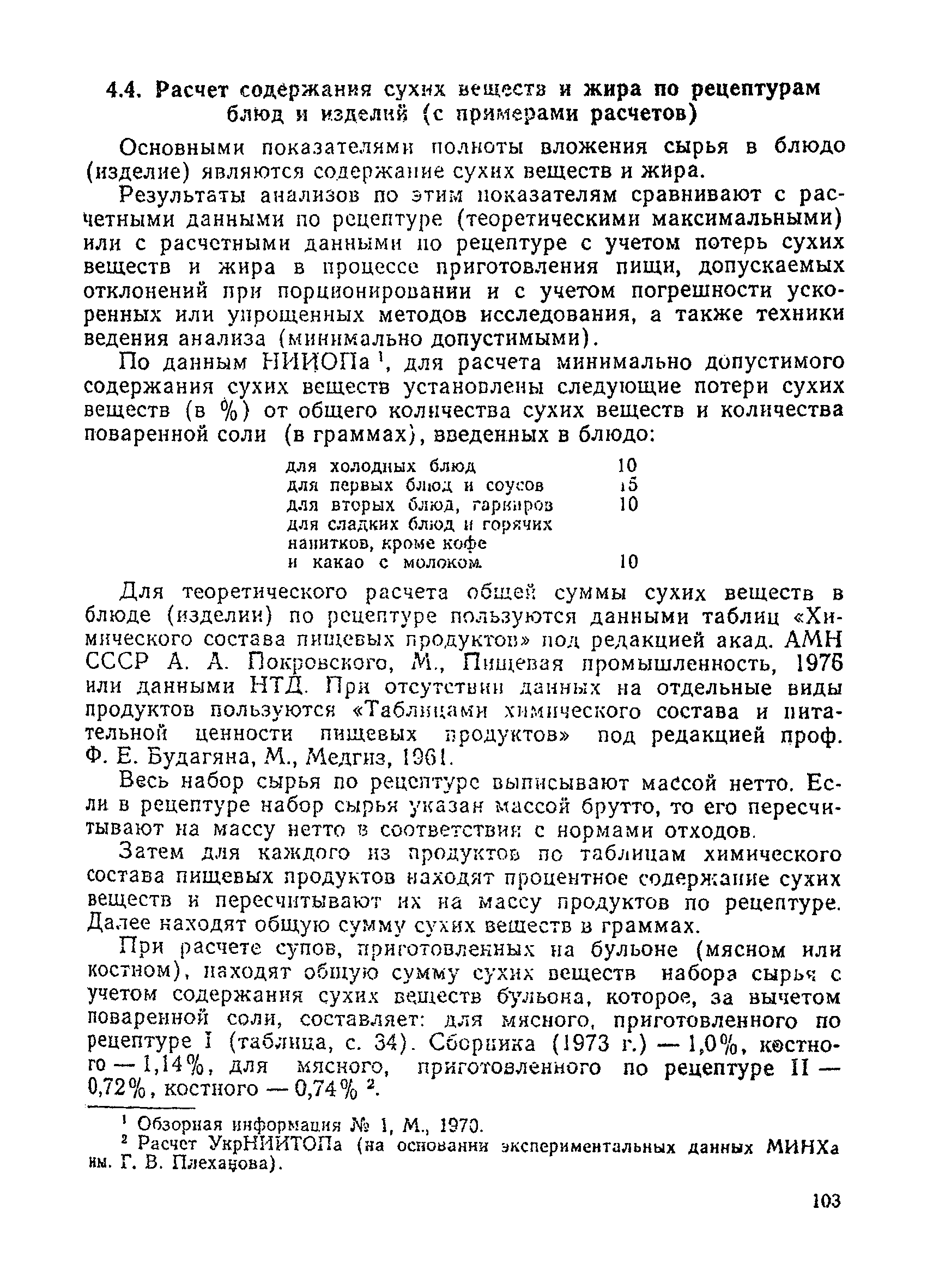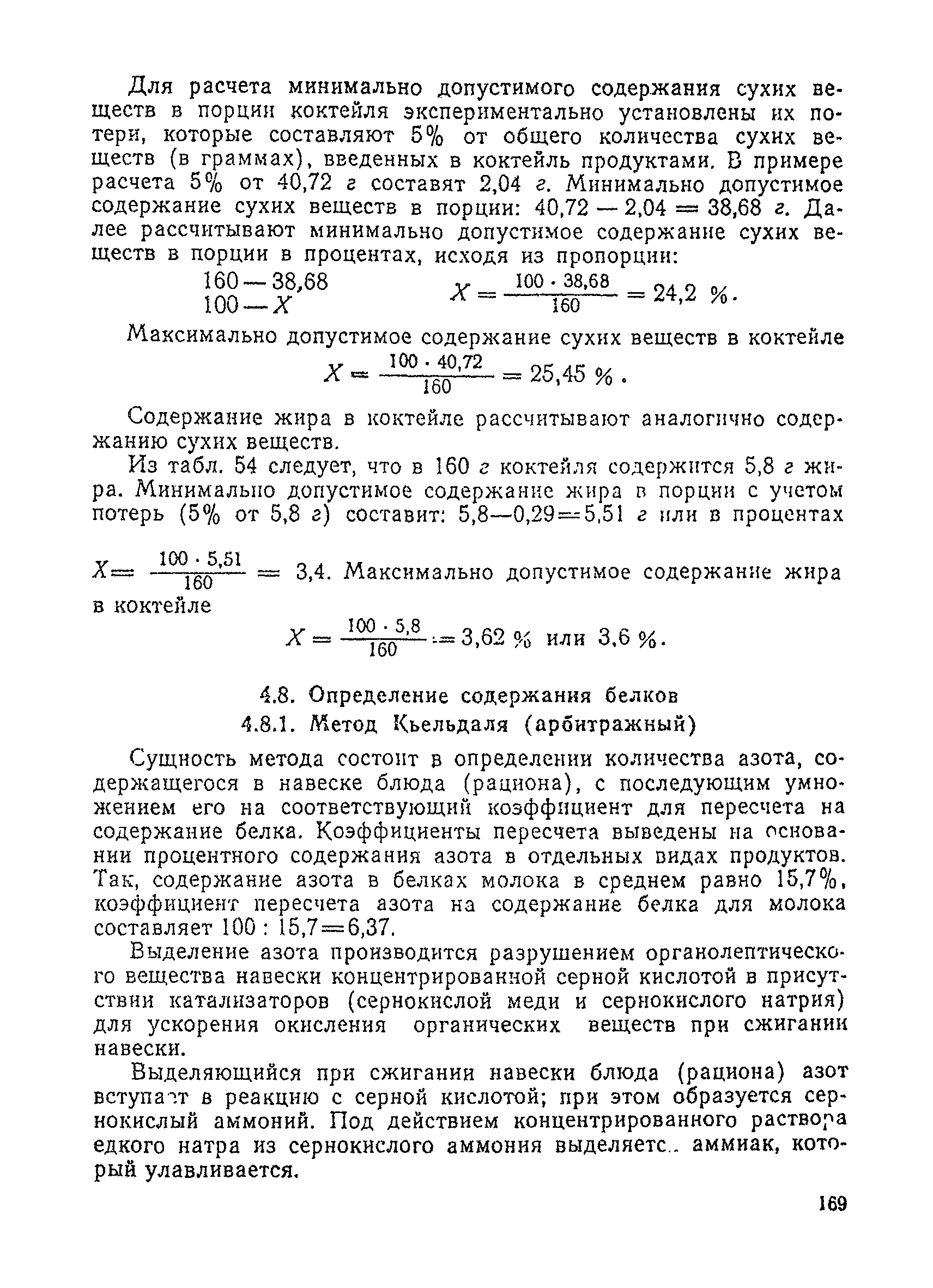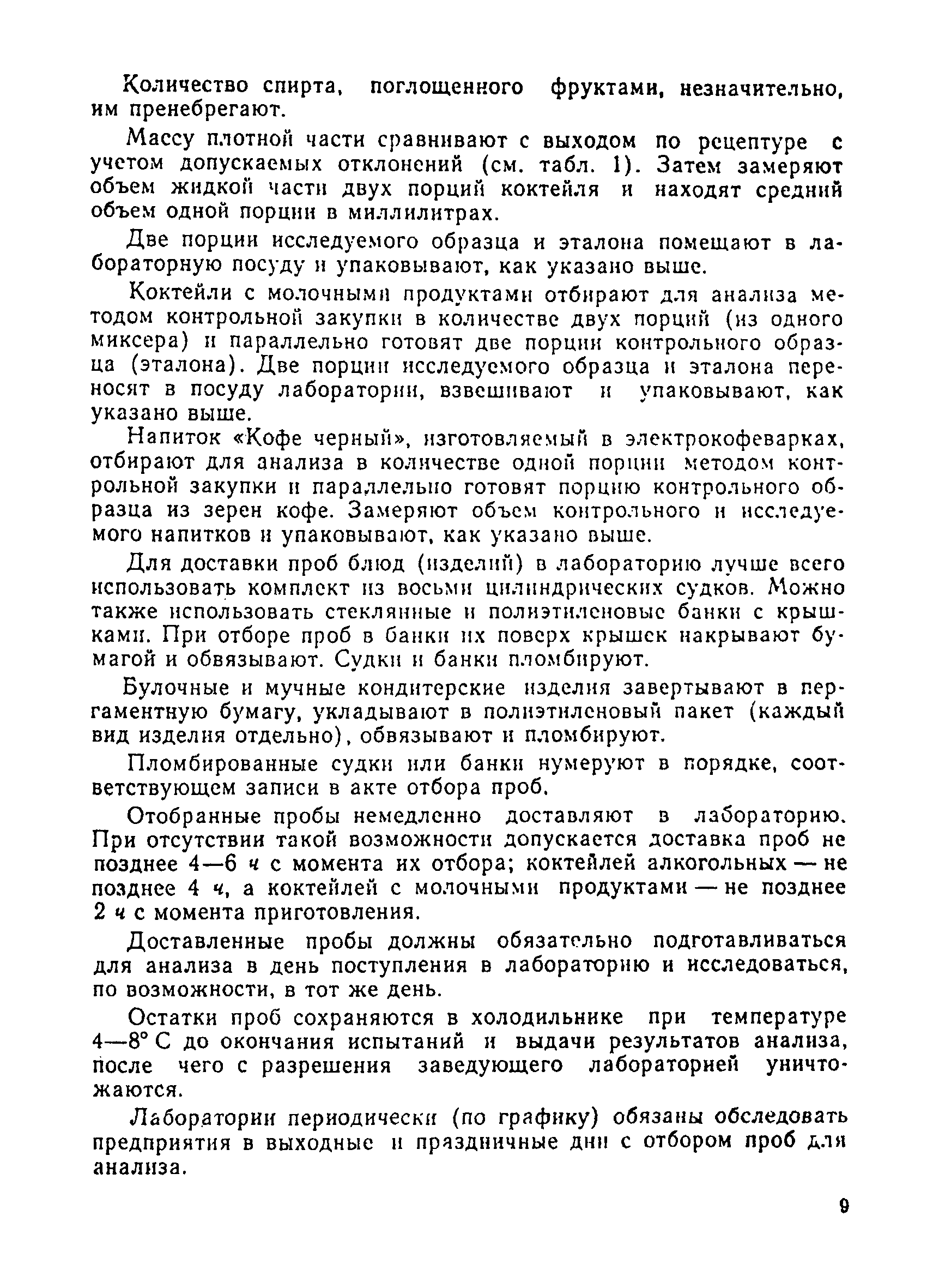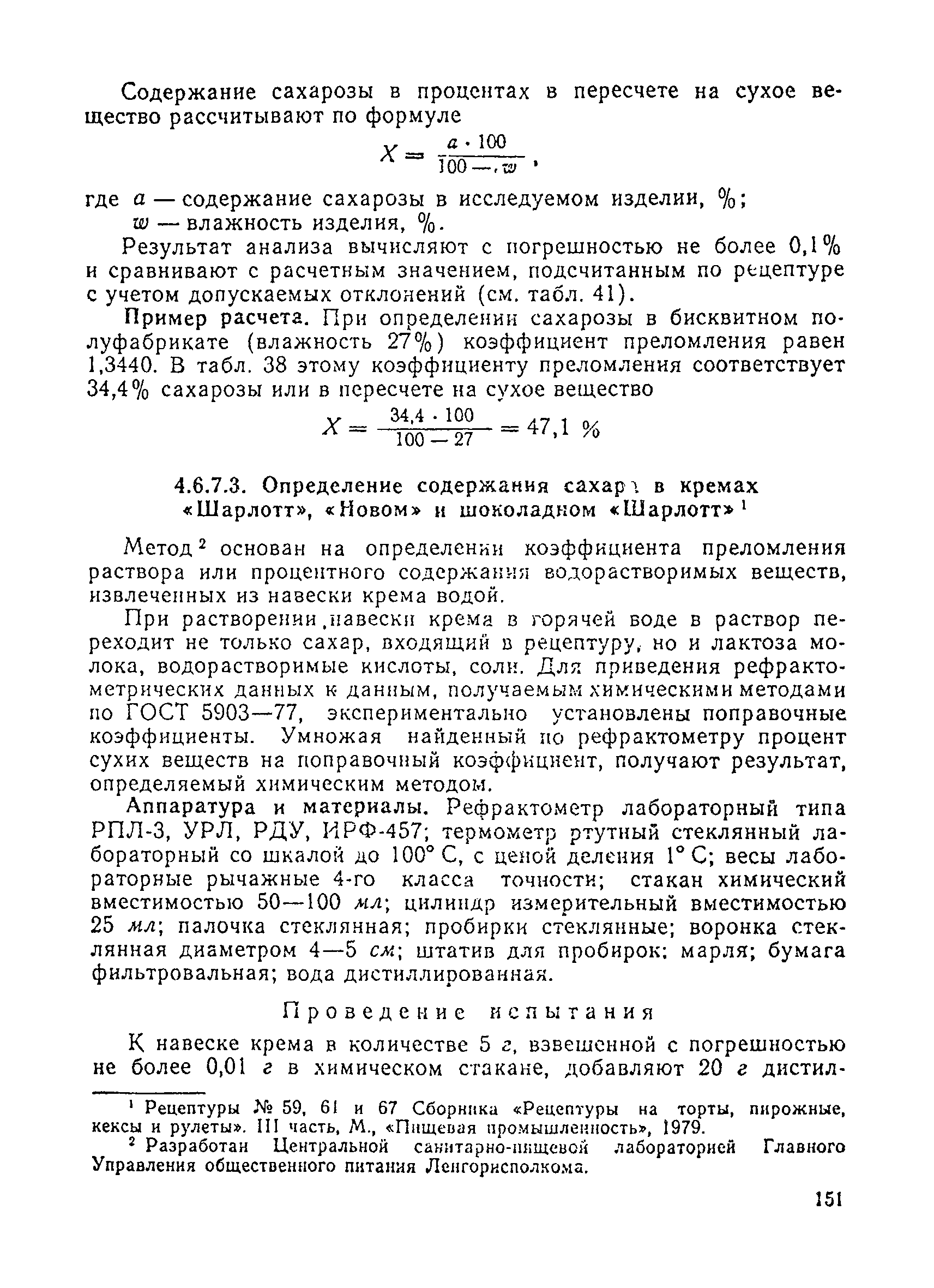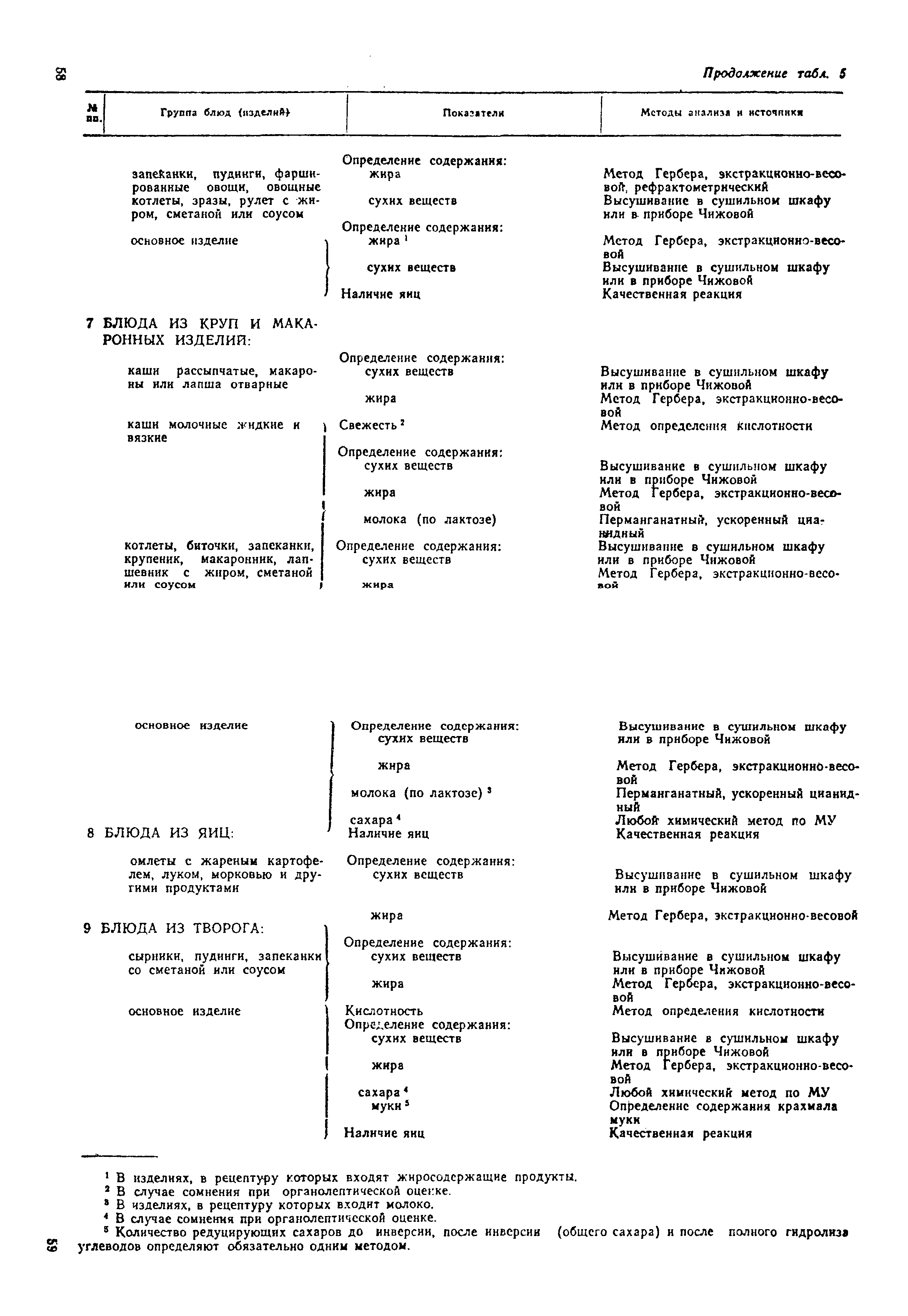 | Оглавление: | 1 Отбор проб 1.1 Основные положения по отбору проб стандартизованной продукции 1.2 Порядок отбора образцов для лабораторного анализа при обследовании предприятия 2 Подготовка проб для анализа 2.1 Взвешивание проб 2.2 Гомогенизация проб 2.3 Подготовка проб полуфабрикатов 2.4 Подготовка проб блюд и изделий 3 Основные физико-химические показатели качества сырья и кулинарной продукции 4 Методы испытаний полуфабрикатов, блюд и изделий 4.1 Общие указания 4.2 Определение содержания сухих веществ или влажности 4.2.1. Высушивание в сушильном шкафу до постоянной массы (арбитражный метод) 4.2.2. Высушивание в сушильном шкафу при температуре 130° С (ускоренный метод) 4.2.3. Высушивание в приборе К. Н. Чижовой (ускоренный метод) 4.2.4. Определение экстрактивных веществ в настое чая (заварке) или напитке 4.2.5. Рефрактометрический метод определения содержания сухих веществ 4.2.6. Определение полноты вложения сырья в горячие и холодные напитки (кофе и чай) 4.3 Определение содержания жира 4.3.1. Экстракционно-весовой метод по обезжиренному остатку (арбитражный) 4.3.2. Рефрактометрический метод (ускоренный) 4.3.3. Метод Гербера (кислоты с применением жиромеров) 4.3.4. Экстракционно-весовой метод определения жира (ускоренный) 4.4 Расчет содержания сухих веществ и жира по рецептурам блюд м изделий (с примерами расчетов) 4.5 Определение качества фритюрного жира 4.5.1. Оперативный производственный контроль качества фритюра 4.5.2. Лабораторный контроль качества фритюра 4.6 Определение содержания сахаров 4.6.1. Приготовление растворов редуцирующих сахаров 4.6.2. Перманганатный (арбитражный) метод 4.6.3. Йодометрический метод 4.6.4. Цианидный метод 4.6.5. Ускоренный цианидный метод определения содержания лактозы 4.6.6. Расчет содержания молока или наполнителей (по результатам анализа) 4.6.7. Рефрактометрические методы (ускоренные) 4.7. Расчет рецептур полуфабрикатов и изделий по физико-химическим показателям 4.7.1. Расчет влажности теста, содержания сахара и жира в сдобных булочных, мучных кулинарных н кондитерских изделиях, мучных и отделочных полуфабрикатах для кондитерских изделий 4.7.2. Расчет содержания хлеба в полуфабрикатах и кулинарных изделиях из рубленого мяса по рецептуре (с учетом сухарной или пшеничной панировочной муки) 4.7.3. Расчет содержания муки и сахара в полуфабрикатах и изделиях из творога 4.7.4. Методика составления и расчета рецептур алкогольных коктейлей 4.7.5. Расчет содержания этилового спирта в сиропе для промочки кондитерских полуфабрикатов 4.8. Определение содержания белков 4.8.1. Метод Кьельдаля (арбитражный) 4.8.2. Метод Джермилло в модификации В. А. Бабина и Н.Н. Мусерского (ускоренный) |