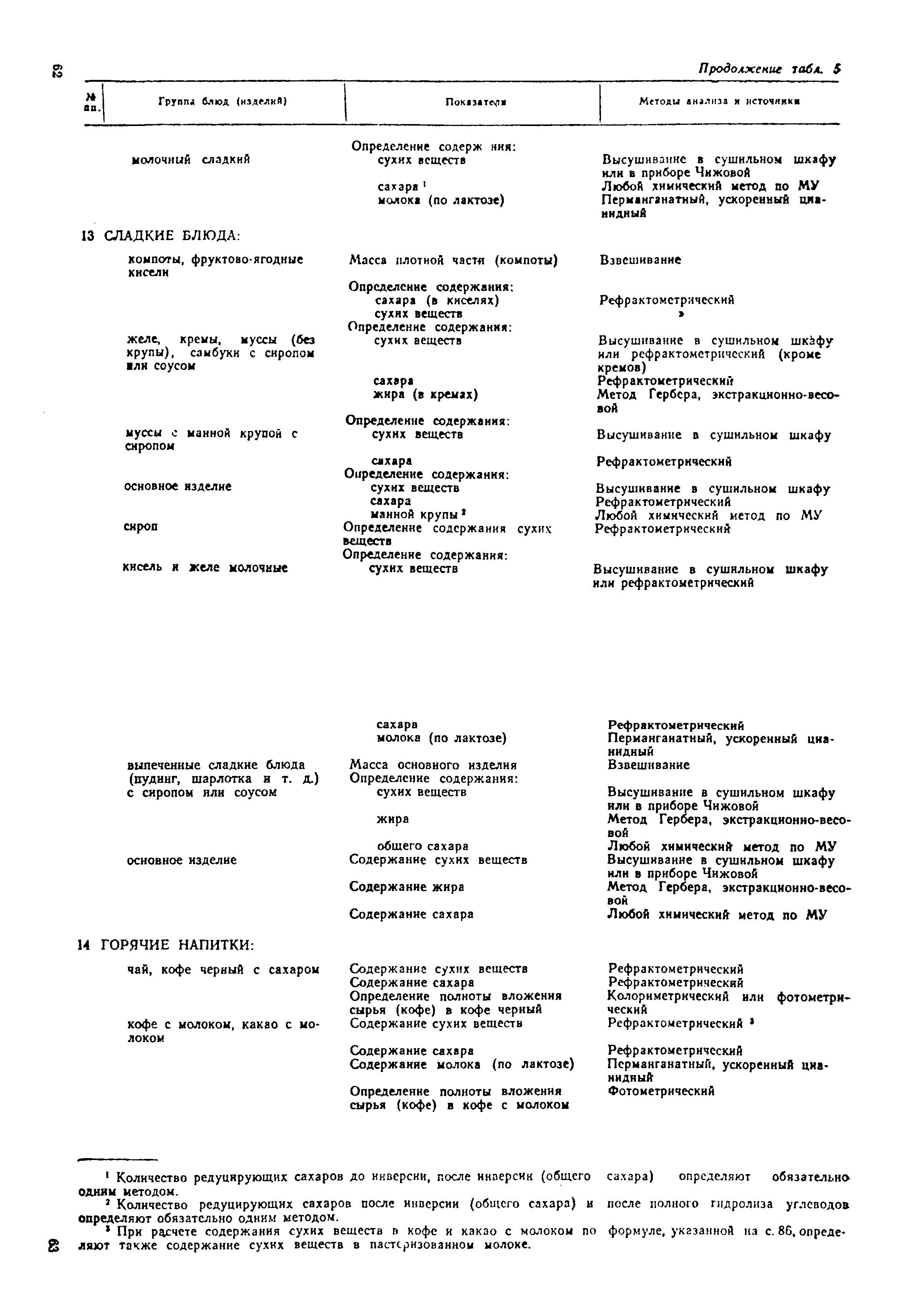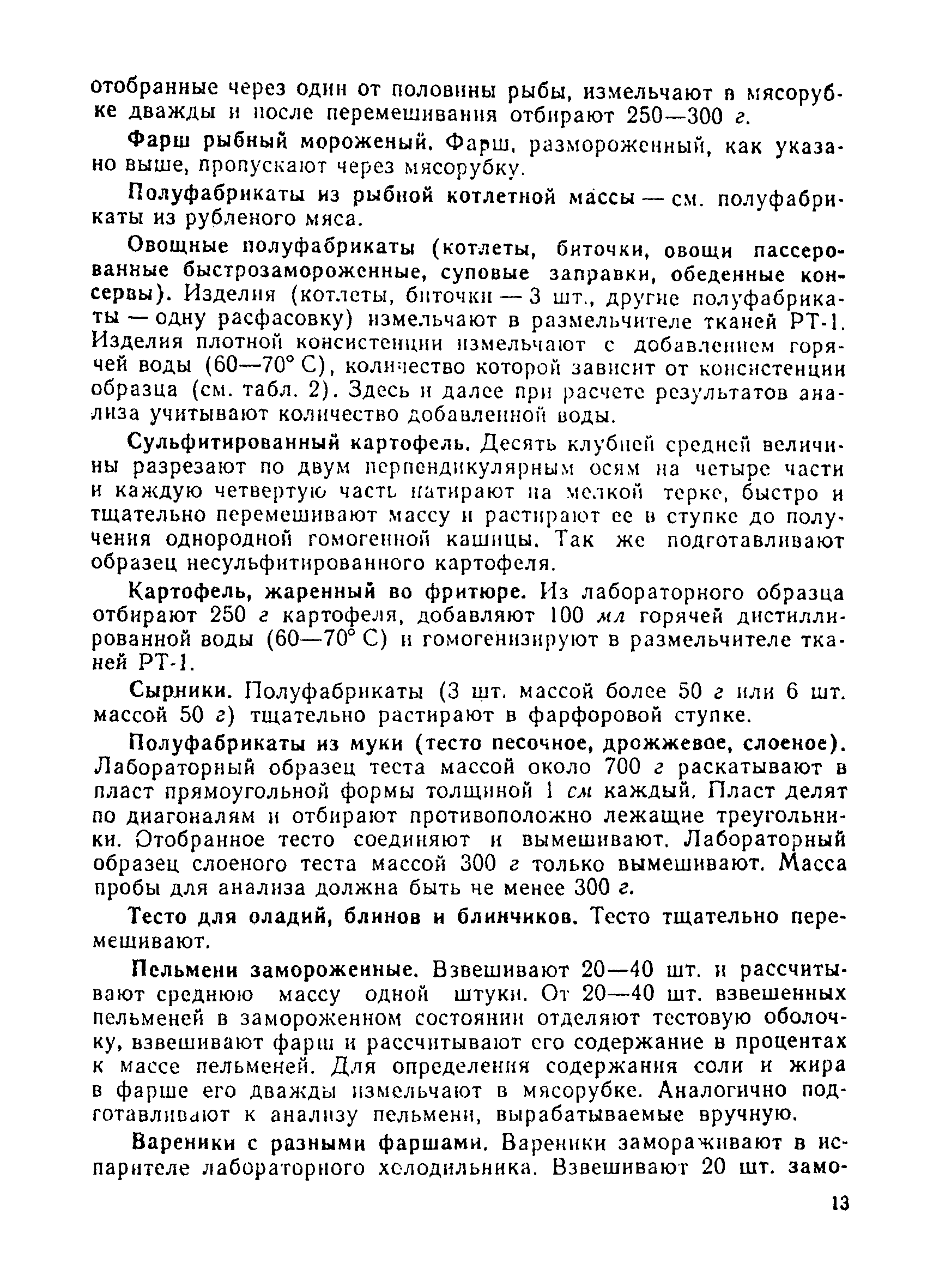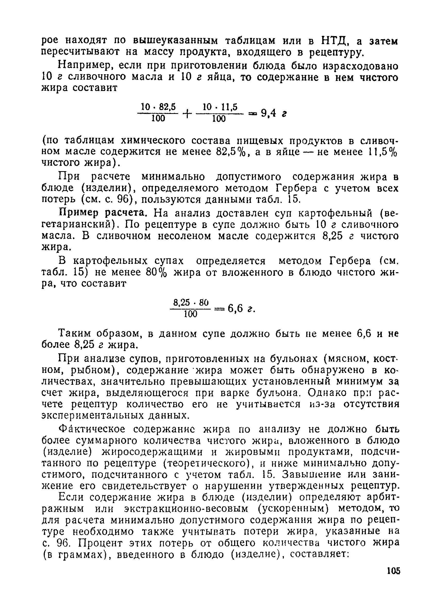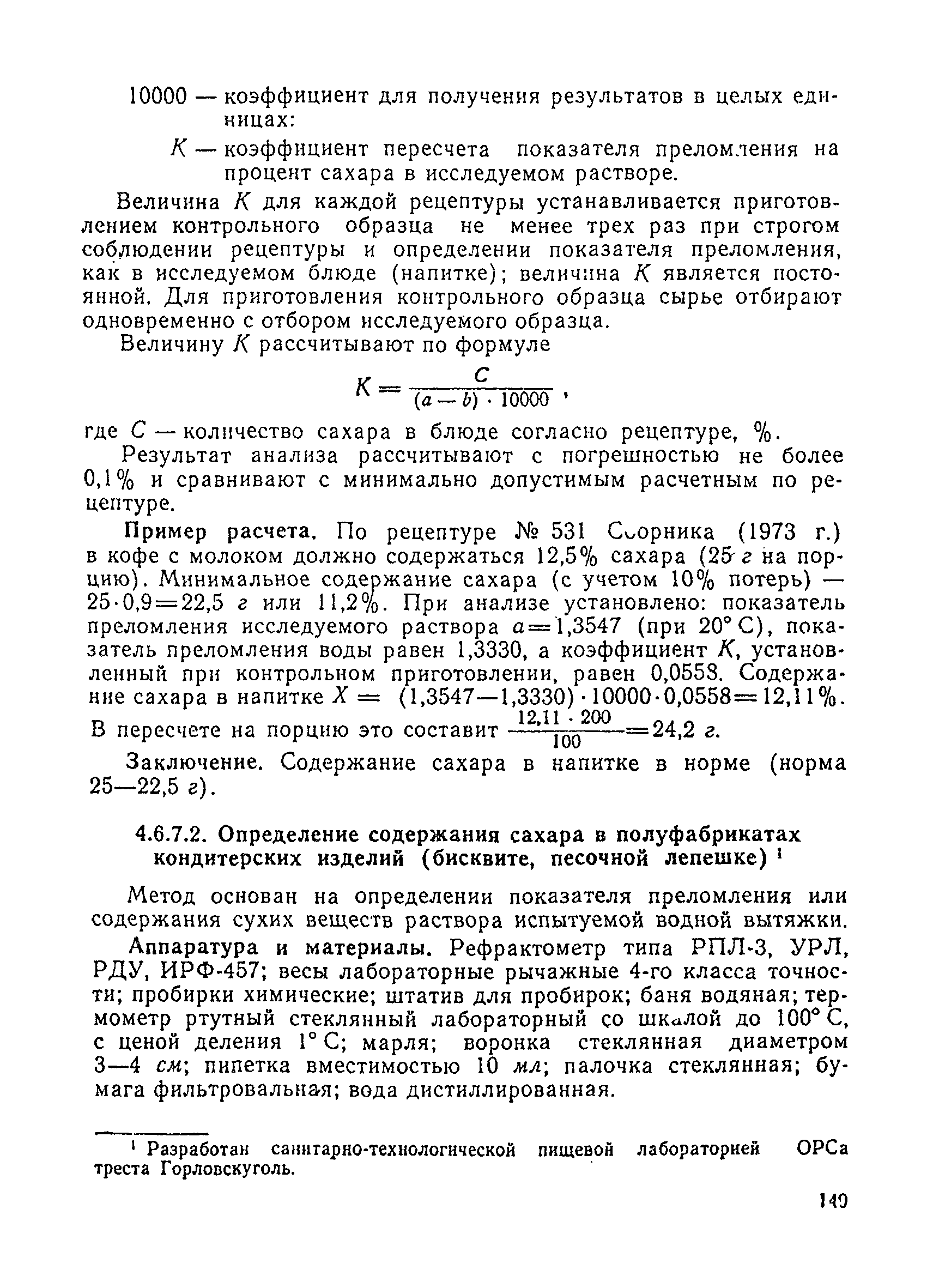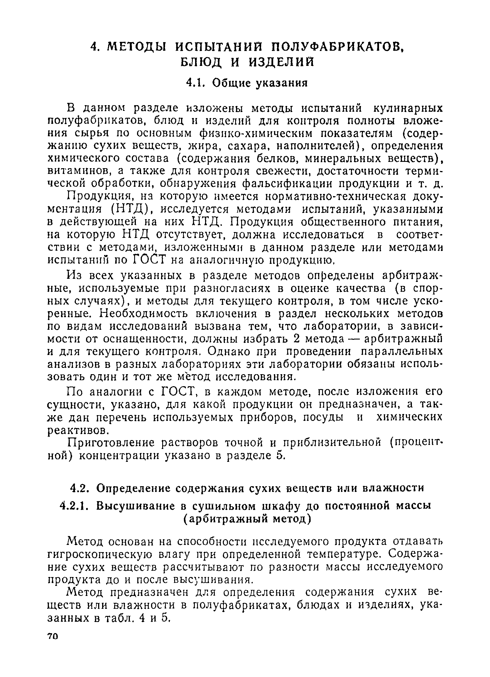 | Оглавление: | 1 Отбор проб 1.1 Основные положения по отбору проб стандартизованной продукции 1.2 Порядок отбора образцов для лабораторного анализа при обследовании предприятия 2 Подготовка проб для анализа 2.1 Взвешивание проб 2.2 Гомогенизация проб 2.3 Подготовка проб полуфабрикатов 2.4 Подготовка проб блюд и изделий 3 Основные физико-химические показатели качества сырья и кулинарной продукции 4 Методы испытаний полуфабрикатов, блюд и изделий 4.1 Общие указания 4.2 Определение содержания сухих веществ или влажности 4.2.1. Высушивание в сушильном шкафу до постоянной массы (арбитражный метод) 4.2.2. Высушивание в сушильном шкафу при температуре 130° С (ускоренный метод) 4.2.3. Высушивание в приборе К. Н. Чижовой (ускоренный метод) 4.2.4. Определение экстрактивных веществ в настое чая (заварке) или напитке 4.2.5. Рефрактометрический метод определения содержания сухих веществ 4.2.6. Определение полноты вложения сырья в горячие и холодные напитки (кофе и чай) 4.3 Определение содержания жира 4.3.1. Экстракционно-весовой метод по обезжиренному остатку (арбитражный) 4.3.2. Рефрактометрический метод (ускоренный) 4.3.3. Метод Гербера (кислоты с применением жиромеров) 4.3.4. Экстракционно-весовой метод определения жира (ускоренный) 4.4 Расчет содержания сухих веществ и жира по рецептурам блюд м изделий (с примерами расчетов) 4.5 Определение качества фритюрного жира 4.5.1. Оперативный производственный контроль качества фритюра 4.5.2. Лабораторный контроль качества фритюра 4.6 Определение содержания сахаров 4.6.1. Приготовление растворов редуцирующих сахаров 4.6.2. Перманганатный (арбитражный) метод 4.6.3. Йодометрический метод 4.6.4. Цианидный метод 4.6.5. Ускоренный цианидный метод определения содержания лактозы 4.6.6. Расчет содержания молока или наполнителей (по результатам анализа) 4.6.7. Рефрактометрические методы (ускоренные) 4.7. Расчет рецептур полуфабрикатов и изделий по физико-химическим показателям 4.7.1. Расчет влажности теста, содержания сахара и жира в сдобных булочных, мучных кулинарных н кондитерских изделиях, мучных и отделочных полуфабрикатах для кондитерских изделий 4.7.2. Расчет содержания хлеба в полуфабрикатах и кулинарных изделиях из рубленого мяса по рецептуре (с учетом сухарной или пшеничной панировочной муки) 4.7.3. Расчет содержания муки и сахара в полуфабрикатах и изделиях из творога 4.7.4. Методика составления и расчета рецептур алкогольных коктейлей 4.7.5. Расчет содержания этилового спирта в сиропе для промочки кондитерских полуфабрикатов 4.8. Определение содержания белков 4.8.1. Метод Кьельдаля (арбитражный) 4.8.2. Метод Джермилло в модификации В. А. Бабина и Н.Н. Мусерского (ускоренный) |