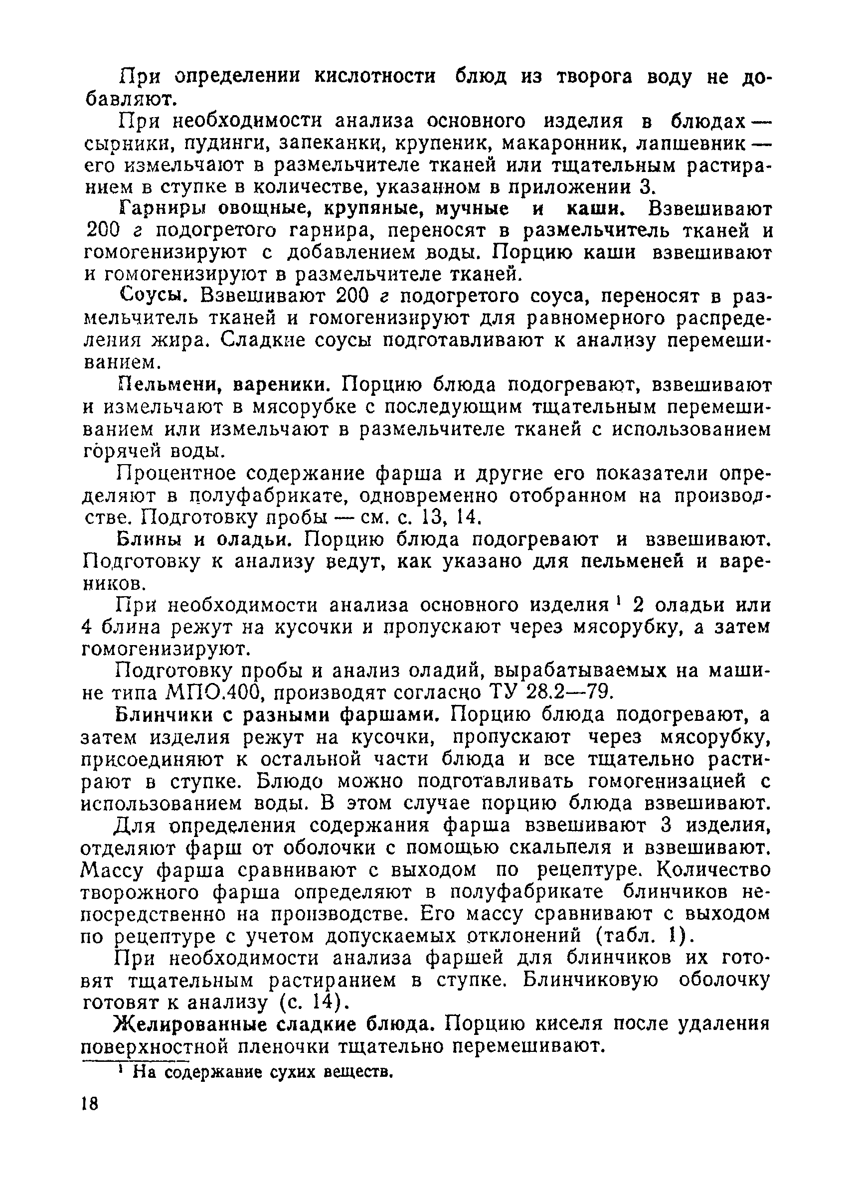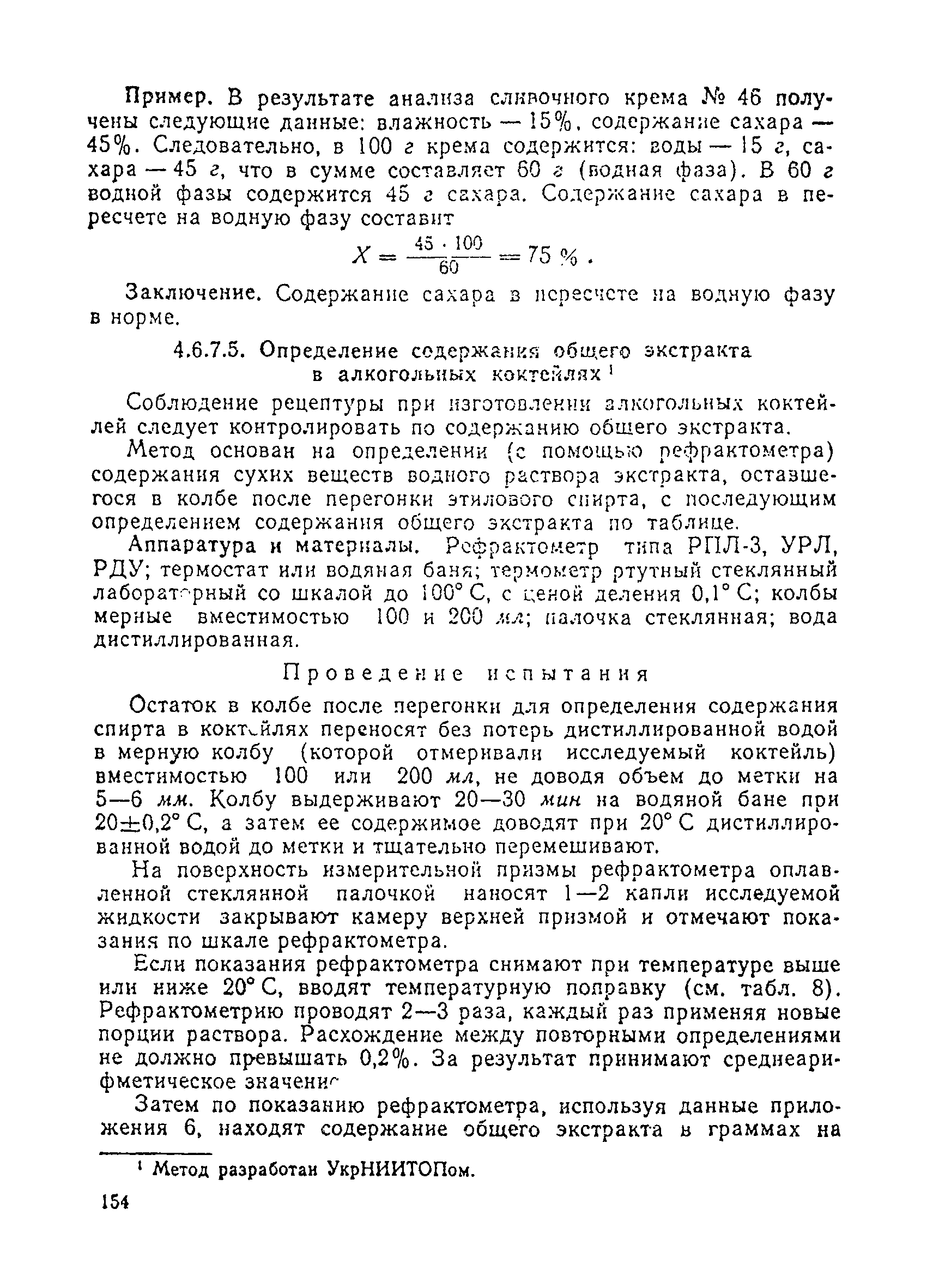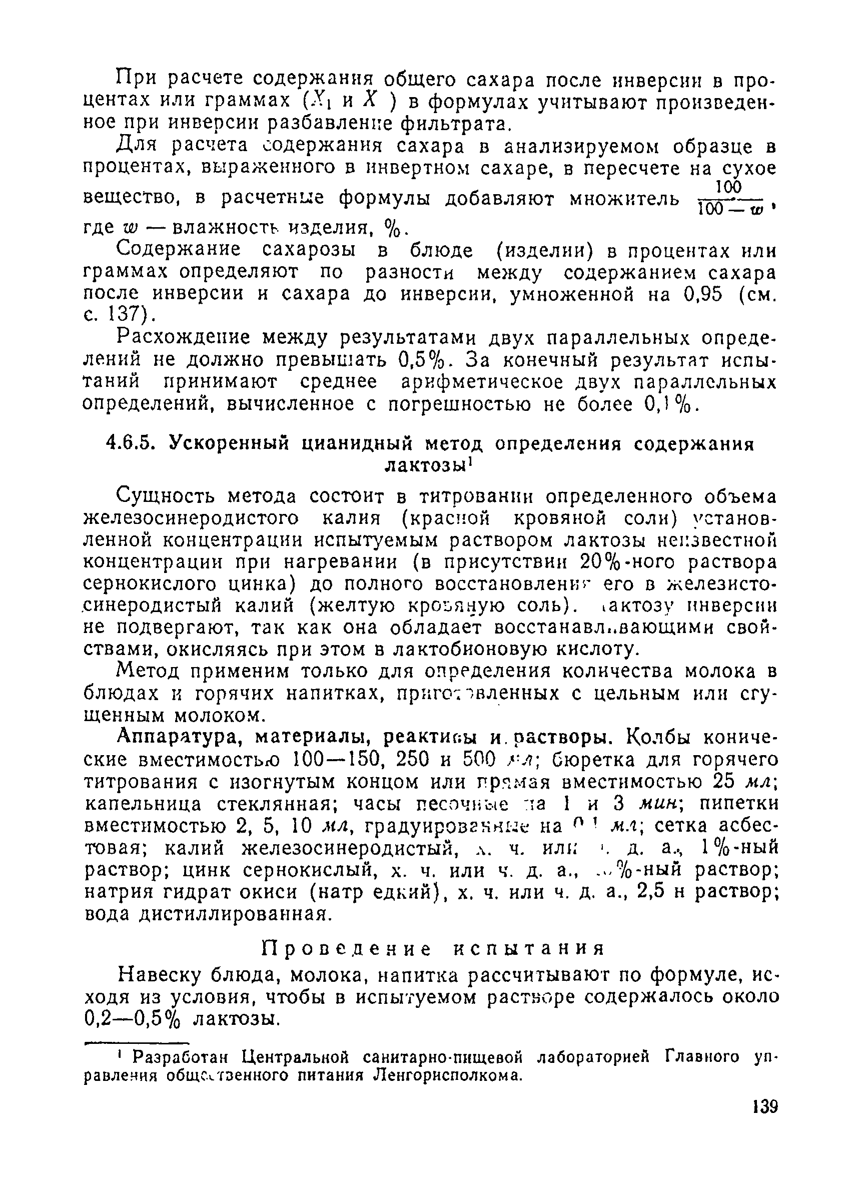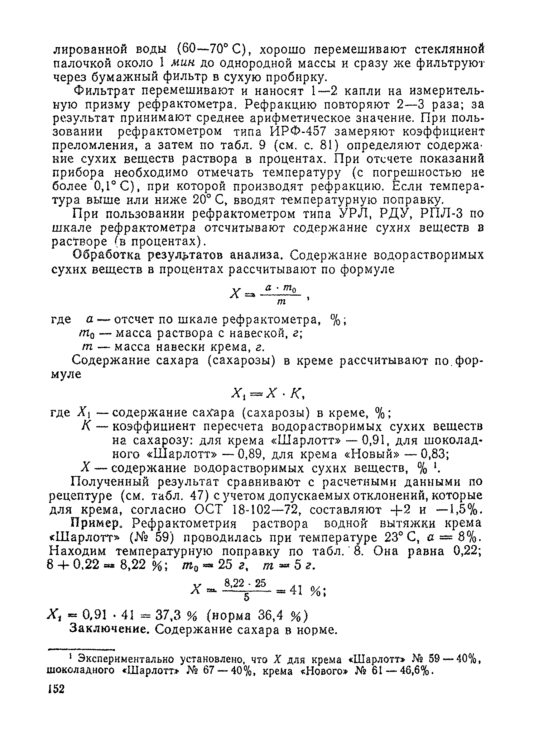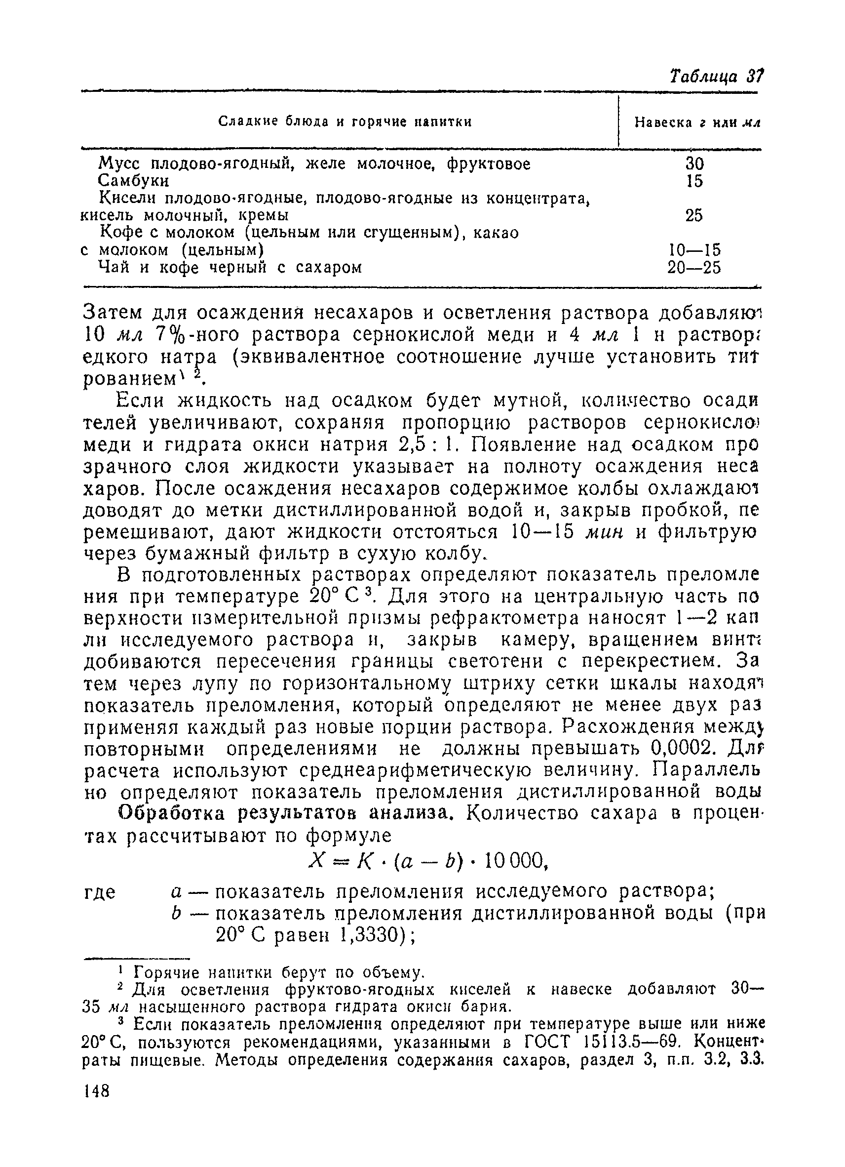 | Оглавление: | 1 Отбор проб 1.1 Основные положения по отбору проб стандартизованной продукции 1.2 Порядок отбора образцов для лабораторного анализа при обследовании предприятия 2 Подготовка проб для анализа 2.1 Взвешивание проб 2.2 Гомогенизация проб 2.3 Подготовка проб полуфабрикатов 2.4 Подготовка проб блюд и изделий 3 Основные физико-химические показатели качества сырья и кулинарной продукции 4 Методы испытаний полуфабрикатов, блюд и изделий 4.1 Общие указания 4.2 Определение содержания сухих веществ или влажности 4.2.1. Высушивание в сушильном шкафу до постоянной массы (арбитражный метод) 4.2.2. Высушивание в сушильном шкафу при температуре 130° С (ускоренный метод) 4.2.3. Высушивание в приборе К. Н. Чижовой (ускоренный метод) 4.2.4. Определение экстрактивных веществ в настое чая (заварке) или напитке 4.2.5. Рефрактометрический метод определения содержания сухих веществ 4.2.6. Определение полноты вложения сырья в горячие и холодные напитки (кофе и чай) 4.3 Определение содержания жира 4.3.1. Экстракционно-весовой метод по обезжиренному остатку (арбитражный) 4.3.2. Рефрактометрический метод (ускоренный) 4.3.3. Метод Гербера (кислоты с применением жиромеров) 4.3.4. Экстракционно-весовой метод определения жира (ускоренный) 4.4 Расчет содержания сухих веществ и жира по рецептурам блюд м изделий (с примерами расчетов) 4.5 Определение качества фритюрного жира 4.5.1. Оперативный производственный контроль качества фритюра 4.5.2. Лабораторный контроль качества фритюра 4.6 Определение содержания сахаров 4.6.1. Приготовление растворов редуцирующих сахаров 4.6.2. Перманганатный (арбитражный) метод 4.6.3. Йодометрический метод 4.6.4. Цианидный метод 4.6.5. Ускоренный цианидный метод определения содержания лактозы 4.6.6. Расчет содержания молока или наполнителей (по результатам анализа) 4.6.7. Рефрактометрические методы (ускоренные) 4.7. Расчет рецептур полуфабрикатов и изделий по физико-химическим показателям 4.7.1. Расчет влажности теста, содержания сахара и жира в сдобных булочных, мучных кулинарных н кондитерских изделиях, мучных и отделочных полуфабрикатах для кондитерских изделий 4.7.2. Расчет содержания хлеба в полуфабрикатах и кулинарных изделиях из рубленого мяса по рецептуре (с учетом сухарной или пшеничной панировочной муки) 4.7.3. Расчет содержания муки и сахара в полуфабрикатах и изделиях из творога 4.7.4. Методика составления и расчета рецептур алкогольных коктейлей 4.7.5. Расчет содержания этилового спирта в сиропе для промочки кондитерских полуфабрикатов 4.8. Определение содержания белков 4.8.1. Метод Кьельдаля (арбитражный) 4.8.2. Метод Джермилло в модификации В. А. Бабина и Н.Н. Мусерского (ускоренный) |