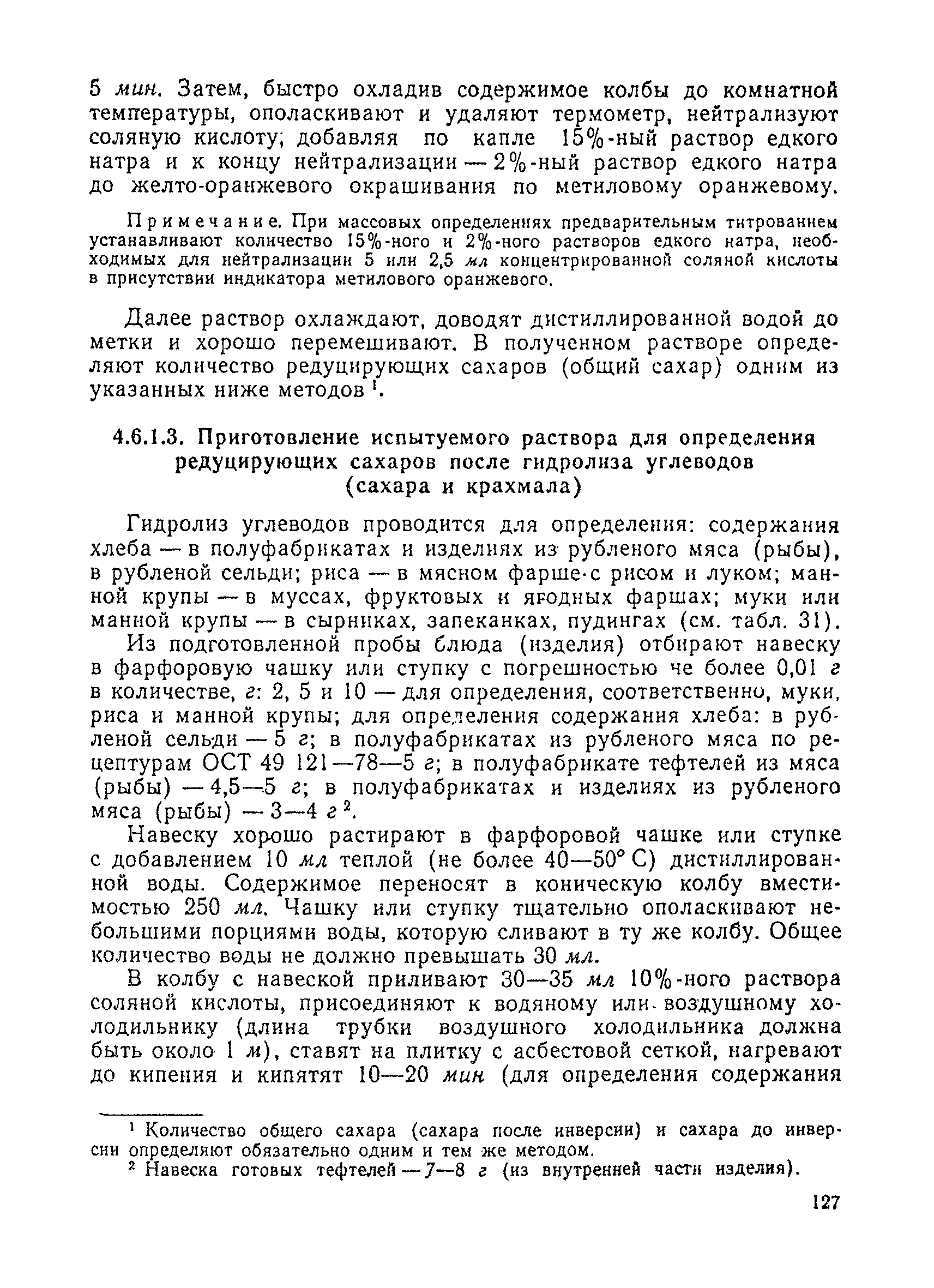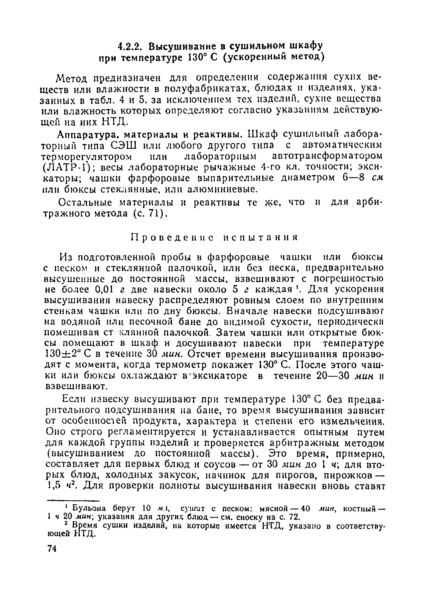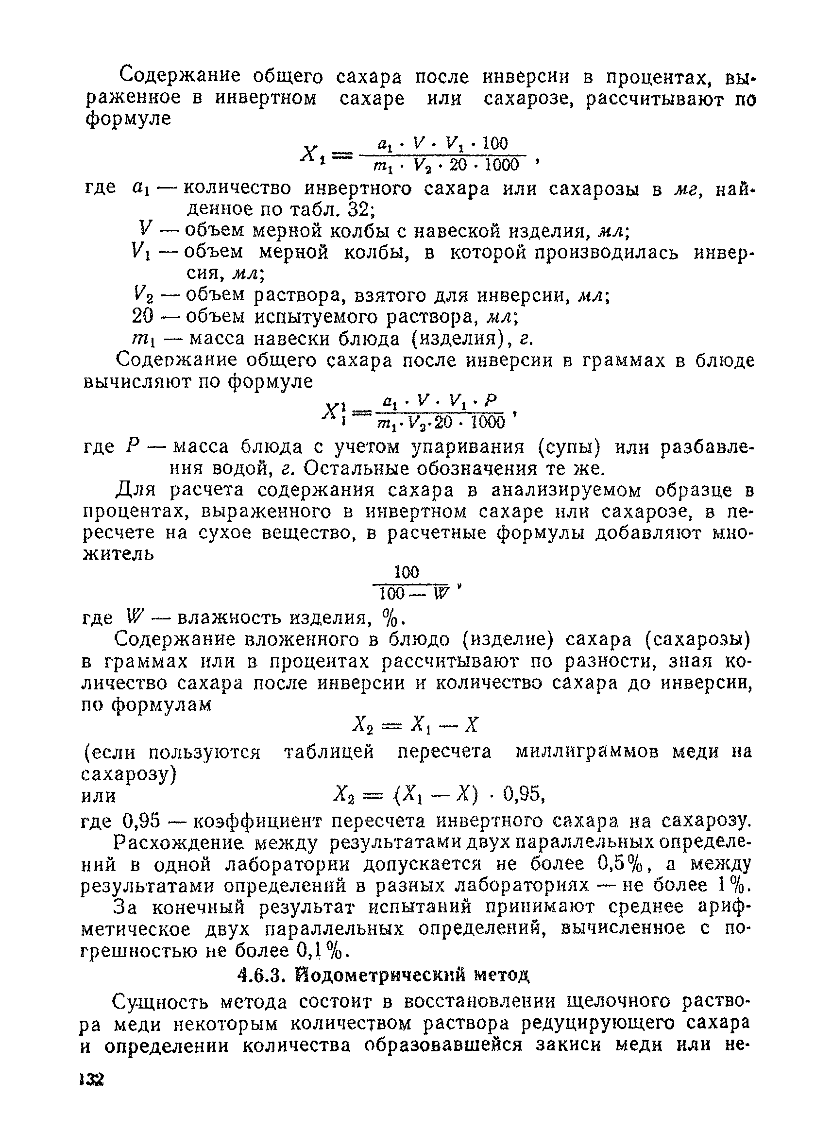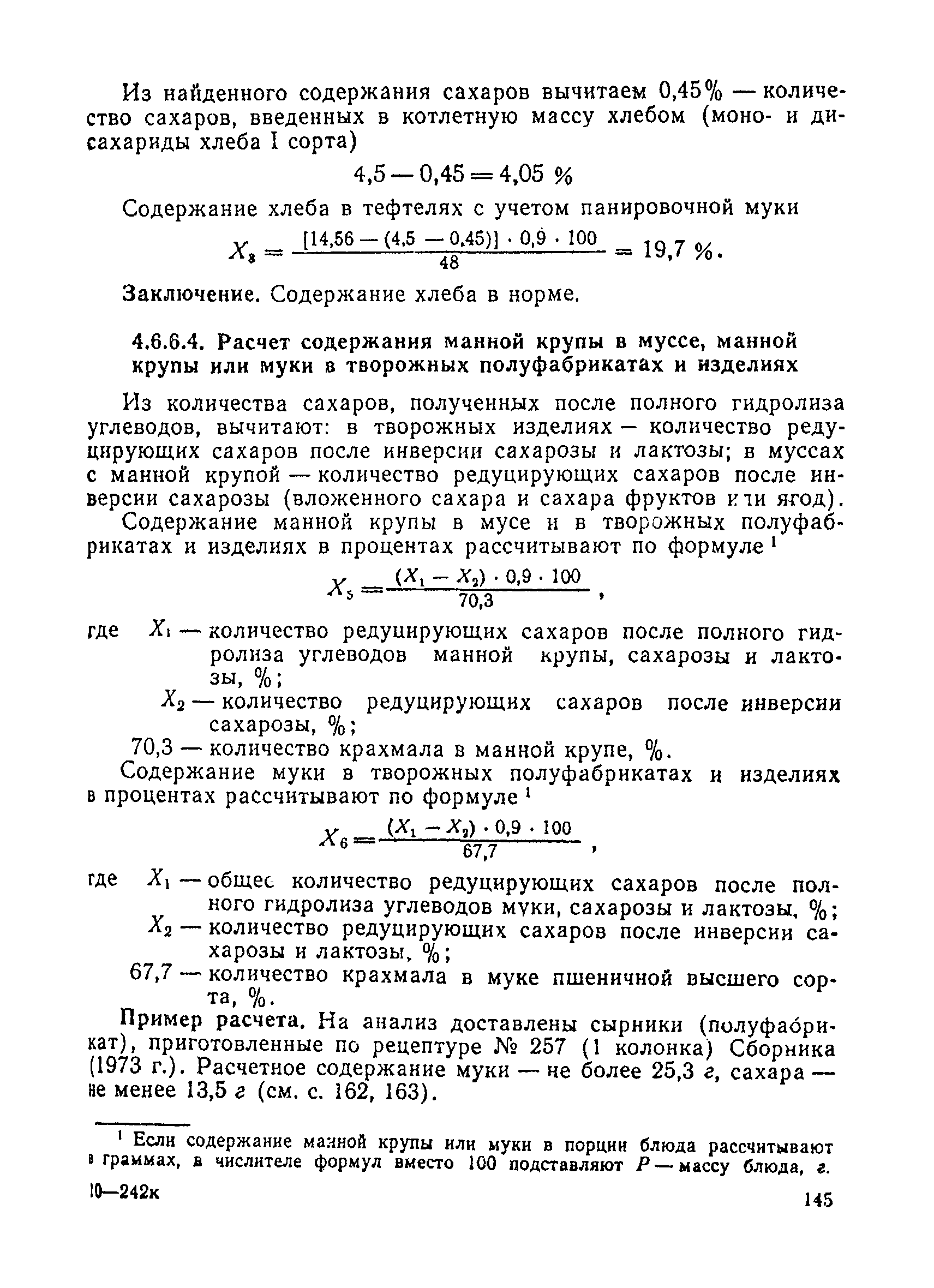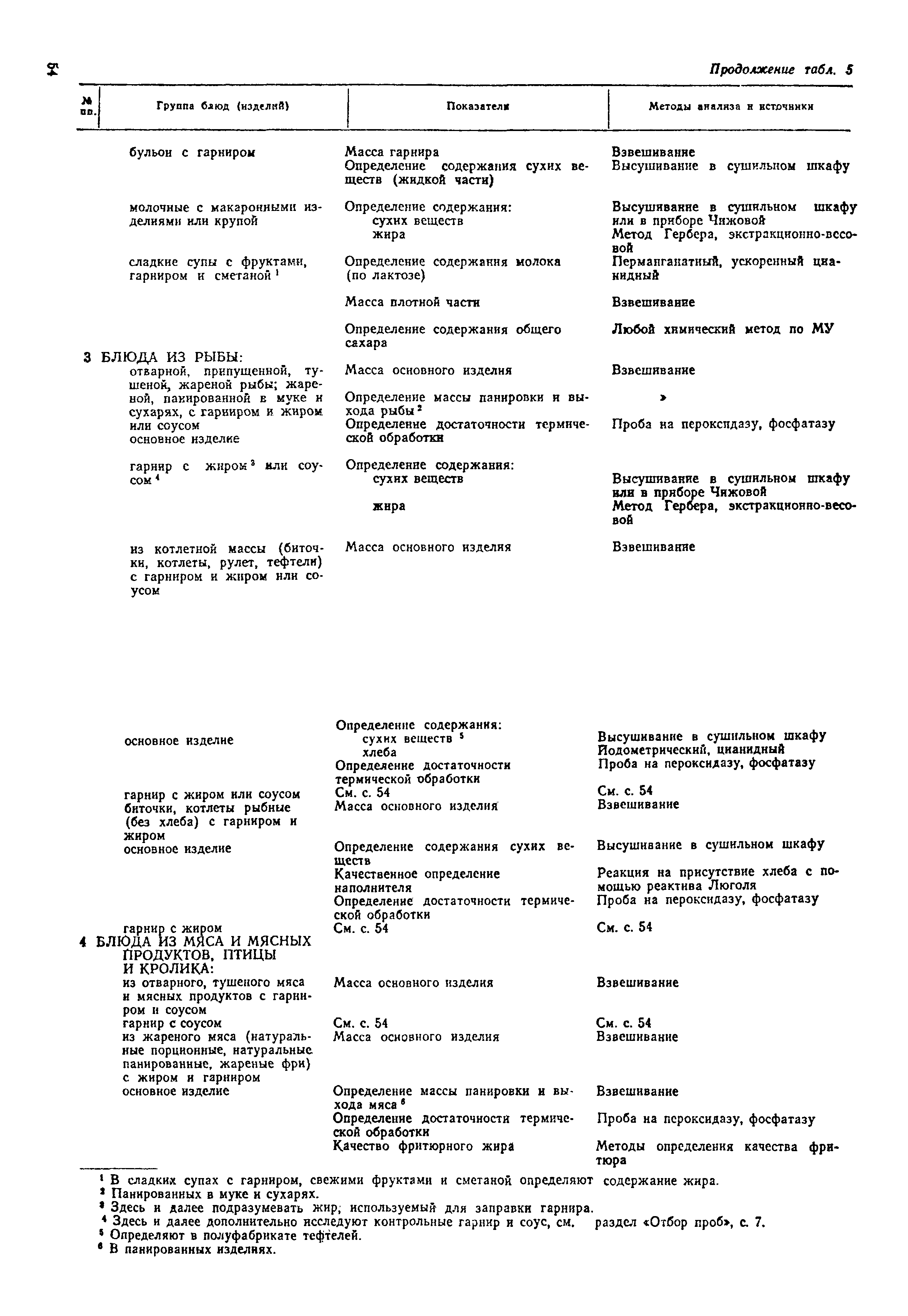 | Оглавление: | 1 Отбор проб 1.1 Основные положения по отбору проб стандартизованной продукции 1.2 Порядок отбора образцов для лабораторного анализа при обследовании предприятия 2 Подготовка проб для анализа 2.1 Взвешивание проб 2.2 Гомогенизация проб 2.3 Подготовка проб полуфабрикатов 2.4 Подготовка проб блюд и изделий 3 Основные физико-химические показатели качества сырья и кулинарной продукции 4 Методы испытаний полуфабрикатов, блюд и изделий 4.1 Общие указания 4.2 Определение содержания сухих веществ или влажности 4.2.1. Высушивание в сушильном шкафу до постоянной массы (арбитражный метод) 4.2.2. Высушивание в сушильном шкафу при температуре 130° С (ускоренный метод) 4.2.3. Высушивание в приборе К. Н. Чижовой (ускоренный метод) 4.2.4. Определение экстрактивных веществ в настое чая (заварке) или напитке 4.2.5. Рефрактометрический метод определения содержания сухих веществ 4.2.6. Определение полноты вложения сырья в горячие и холодные напитки (кофе и чай) 4.3 Определение содержания жира 4.3.1. Экстракционно-весовой метод по обезжиренному остатку (арбитражный) 4.3.2. Рефрактометрический метод (ускоренный) 4.3.3. Метод Гербера (кислоты с применением жиромеров) 4.3.4. Экстракционно-весовой метод определения жира (ускоренный) 4.4 Расчет содержания сухих веществ и жира по рецептурам блюд м изделий (с примерами расчетов) 4.5 Определение качества фритюрного жира 4.5.1. Оперативный производственный контроль качества фритюра 4.5.2. Лабораторный контроль качества фритюра 4.6 Определение содержания сахаров 4.6.1. Приготовление растворов редуцирующих сахаров 4.6.2. Перманганатный (арбитражный) метод 4.6.3. Йодометрический метод 4.6.4. Цианидный метод 4.6.5. Ускоренный цианидный метод определения содержания лактозы 4.6.6. Расчет содержания молока или наполнителей (по результатам анализа) 4.6.7. Рефрактометрические методы (ускоренные) 4.7. Расчет рецептур полуфабрикатов и изделий по физико-химическим показателям 4.7.1. Расчет влажности теста, содержания сахара и жира в сдобных булочных, мучных кулинарных н кондитерских изделиях, мучных и отделочных полуфабрикатах для кондитерских изделий 4.7.2. Расчет содержания хлеба в полуфабрикатах и кулинарных изделиях из рубленого мяса по рецептуре (с учетом сухарной или пшеничной панировочной муки) 4.7.3. Расчет содержания муки и сахара в полуфабрикатах и изделиях из творога 4.7.4. Методика составления и расчета рецептур алкогольных коктейлей 4.7.5. Расчет содержания этилового спирта в сиропе для промочки кондитерских полуфабрикатов 4.8. Определение содержания белков 4.8.1. Метод Кьельдаля (арбитражный) 4.8.2. Метод Джермилло в модификации В. А. Бабина и Н.Н. Мусерского (ускоренный) |