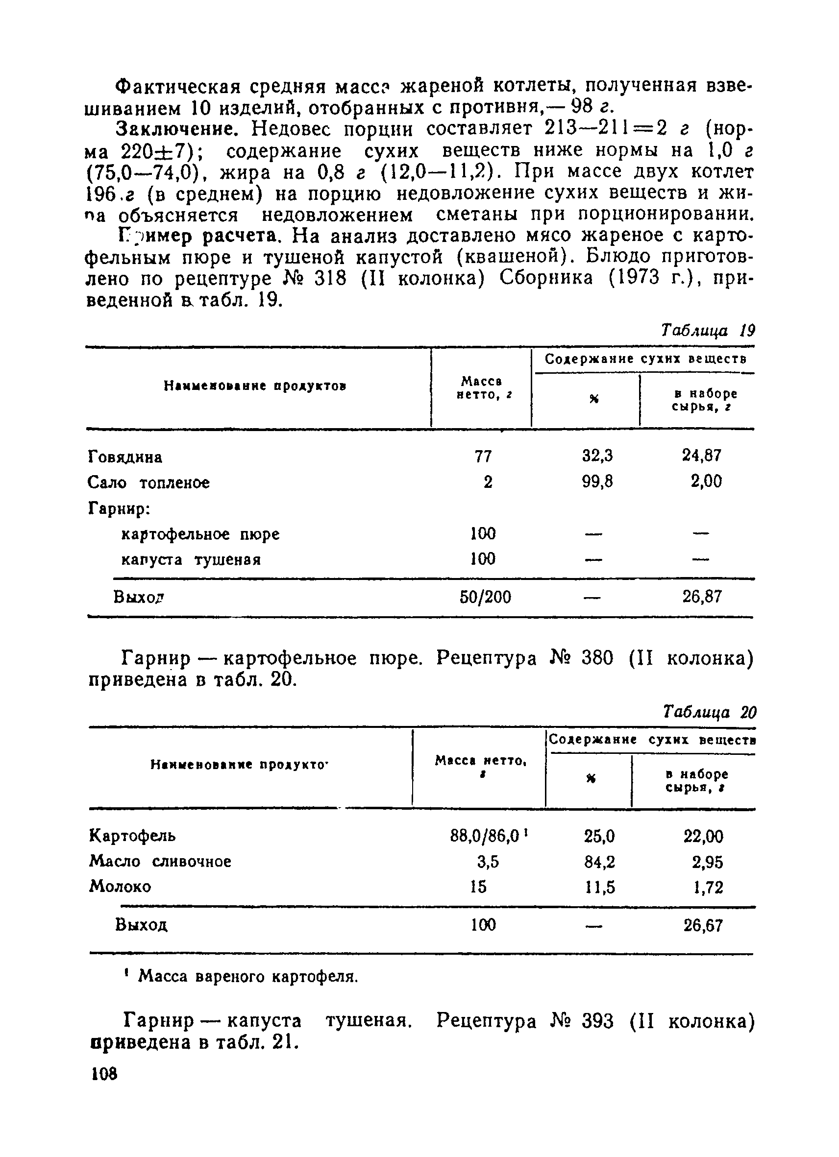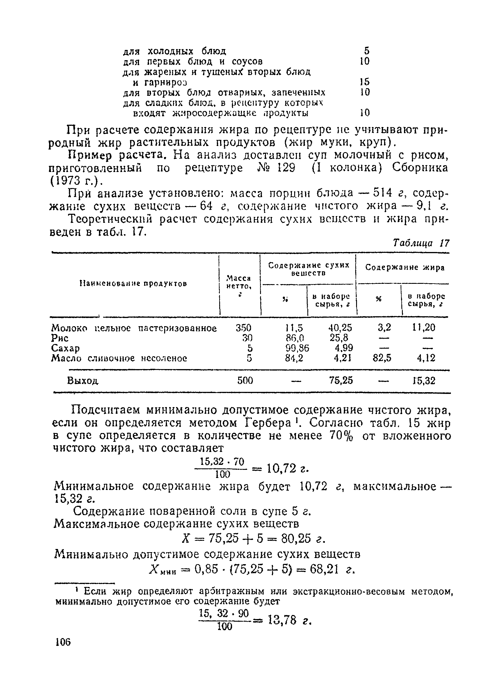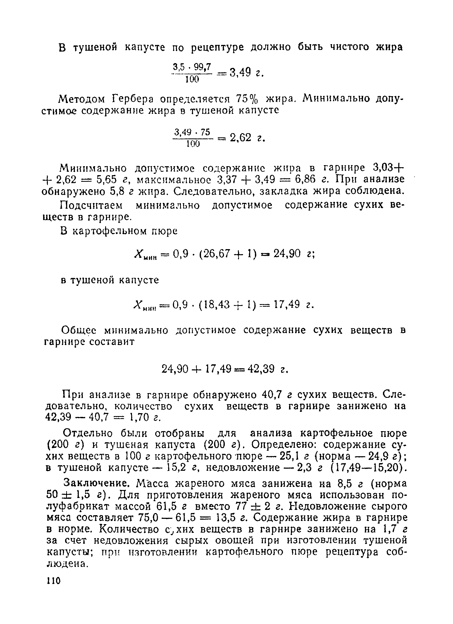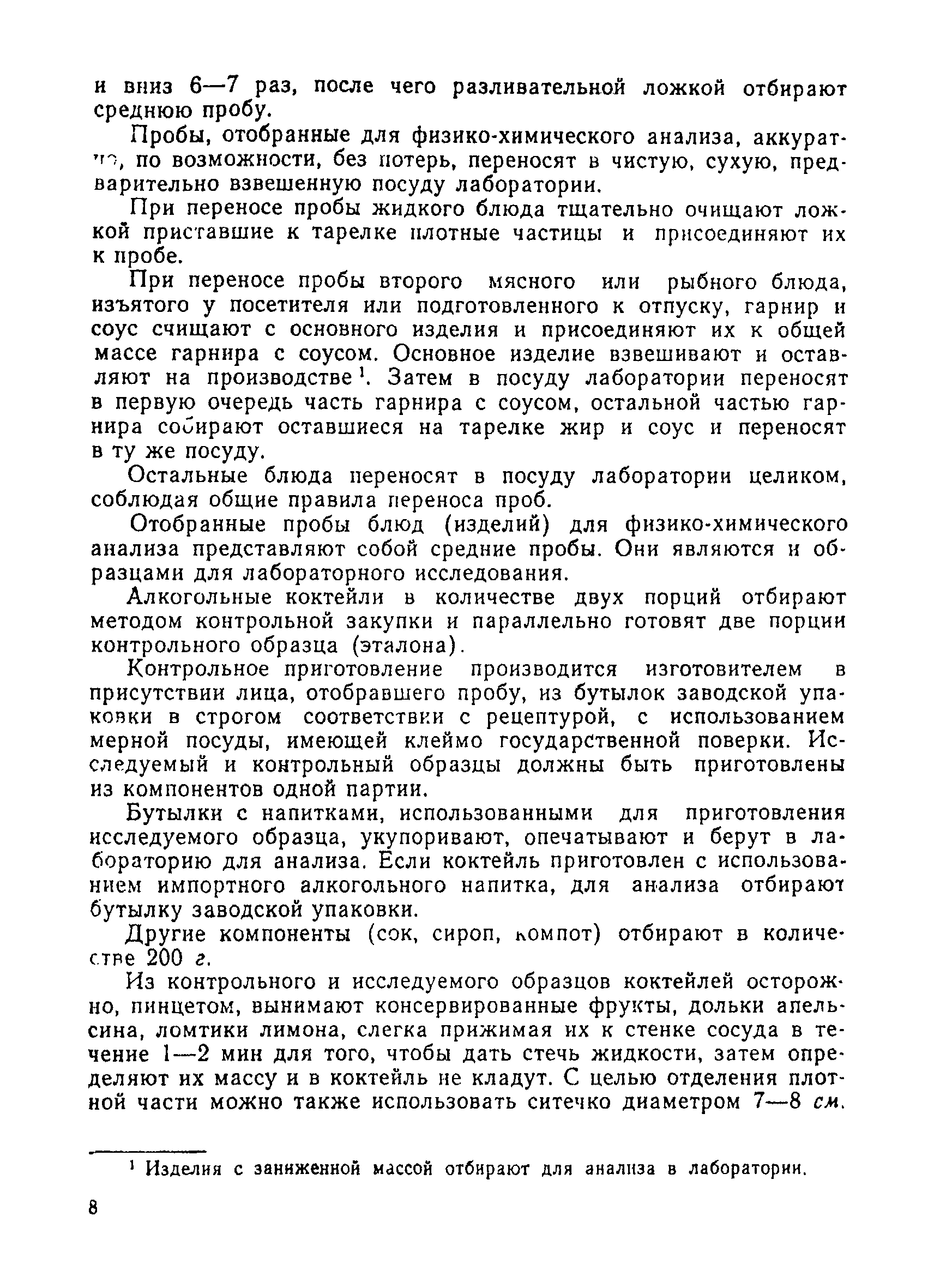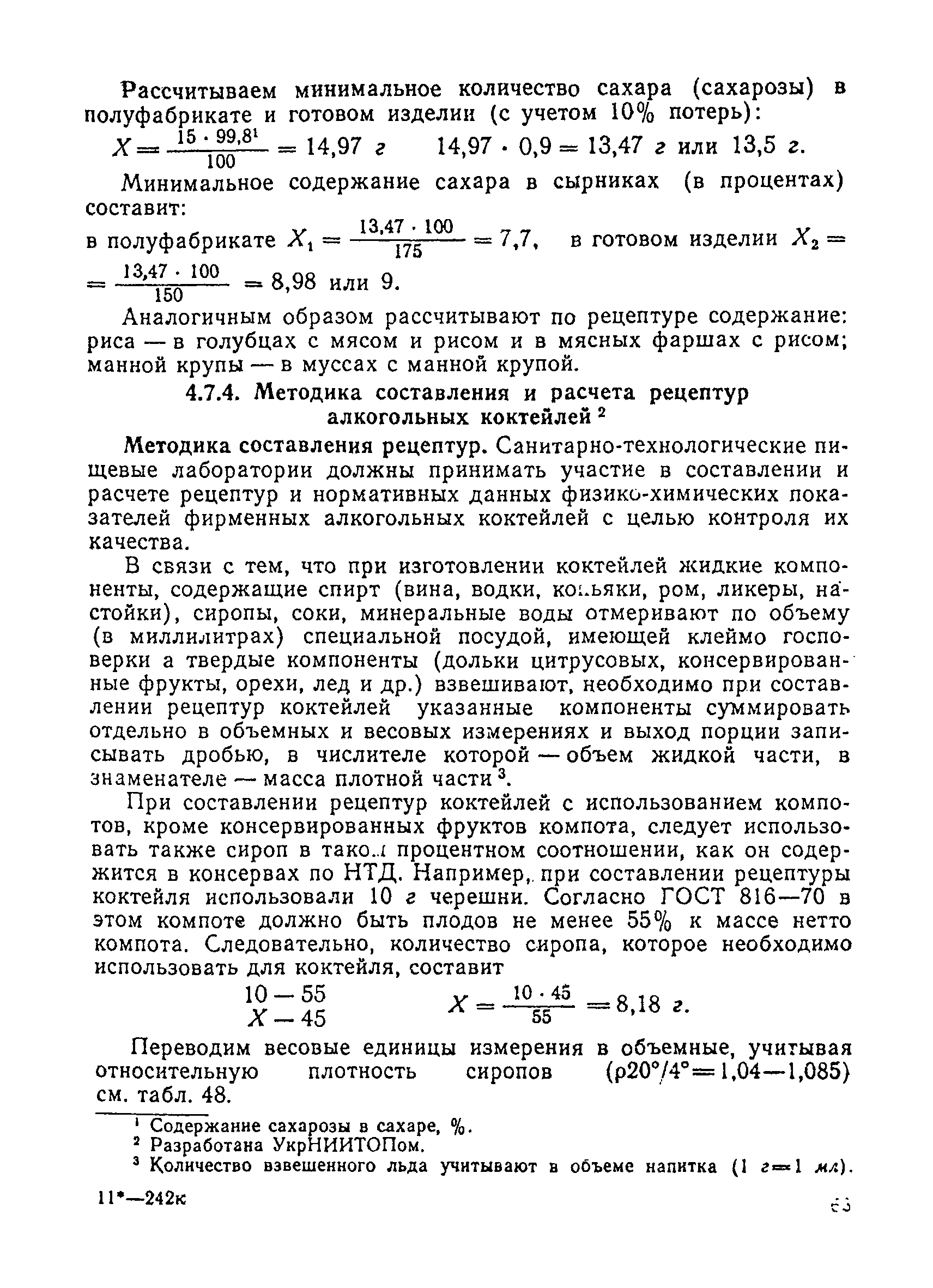 | Оглавление: | 1 Отбор проб 1.1 Основные положения по отбору проб стандартизованной продукции 1.2 Порядок отбора образцов для лабораторного анализа при обследовании предприятия 2 Подготовка проб для анализа 2.1 Взвешивание проб 2.2 Гомогенизация проб 2.3 Подготовка проб полуфабрикатов 2.4 Подготовка проб блюд и изделий 3 Основные физико-химические показатели качества сырья и кулинарной продукции 4 Методы испытаний полуфабрикатов, блюд и изделий 4.1 Общие указания 4.2 Определение содержания сухих веществ или влажности 4.2.1. Высушивание в сушильном шкафу до постоянной массы (арбитражный метод) 4.2.2. Высушивание в сушильном шкафу при температуре 130° С (ускоренный метод) 4.2.3. Высушивание в приборе К. Н. Чижовой (ускоренный метод) 4.2.4. Определение экстрактивных веществ в настое чая (заварке) или напитке 4.2.5. Рефрактометрический метод определения содержания сухих веществ 4.2.6. Определение полноты вложения сырья в горячие и холодные напитки (кофе и чай) 4.3 Определение содержания жира 4.3.1. Экстракционно-весовой метод по обезжиренному остатку (арбитражный) 4.3.2. Рефрактометрический метод (ускоренный) 4.3.3. Метод Гербера (кислоты с применением жиромеров) 4.3.4. Экстракционно-весовой метод определения жира (ускоренный) 4.4 Расчет содержания сухих веществ и жира по рецептурам блюд м изделий (с примерами расчетов) 4.5 Определение качества фритюрного жира 4.5.1. Оперативный производственный контроль качества фритюра 4.5.2. Лабораторный контроль качества фритюра 4.6 Определение содержания сахаров 4.6.1. Приготовление растворов редуцирующих сахаров 4.6.2. Перманганатный (арбитражный) метод 4.6.3. Йодометрический метод 4.6.4. Цианидный метод 4.6.5. Ускоренный цианидный метод определения содержания лактозы 4.6.6. Расчет содержания молока или наполнителей (по результатам анализа) 4.6.7. Рефрактометрические методы (ускоренные) 4.7. Расчет рецептур полуфабрикатов и изделий по физико-химическим показателям 4.7.1. Расчет влажности теста, содержания сахара и жира в сдобных булочных, мучных кулинарных н кондитерских изделиях, мучных и отделочных полуфабрикатах для кондитерских изделий 4.7.2. Расчет содержания хлеба в полуфабрикатах и кулинарных изделиях из рубленого мяса по рецептуре (с учетом сухарной или пшеничной панировочной муки) 4.7.3. Расчет содержания муки и сахара в полуфабрикатах и изделиях из творога 4.7.4. Методика составления и расчета рецептур алкогольных коктейлей 4.7.5. Расчет содержания этилового спирта в сиропе для промочки кондитерских полуфабрикатов 4.8. Определение содержания белков 4.8.1. Метод Кьельдаля (арбитражный) 4.8.2. Метод Джермилло в модификации В. А. Бабина и Н.Н. Мусерского (ускоренный) |