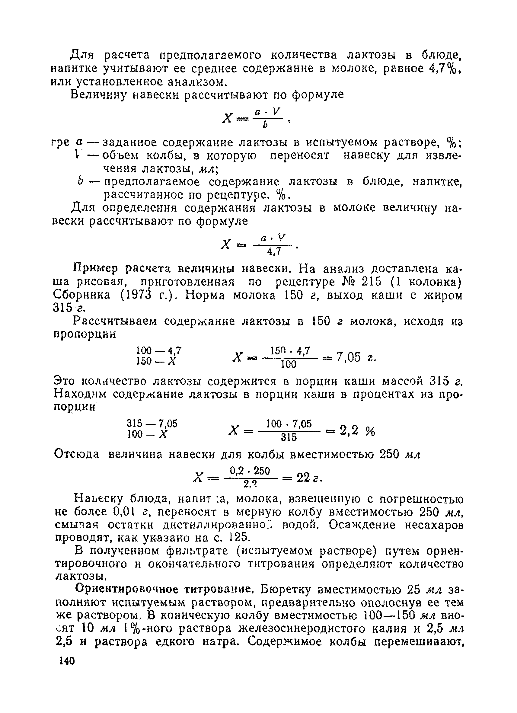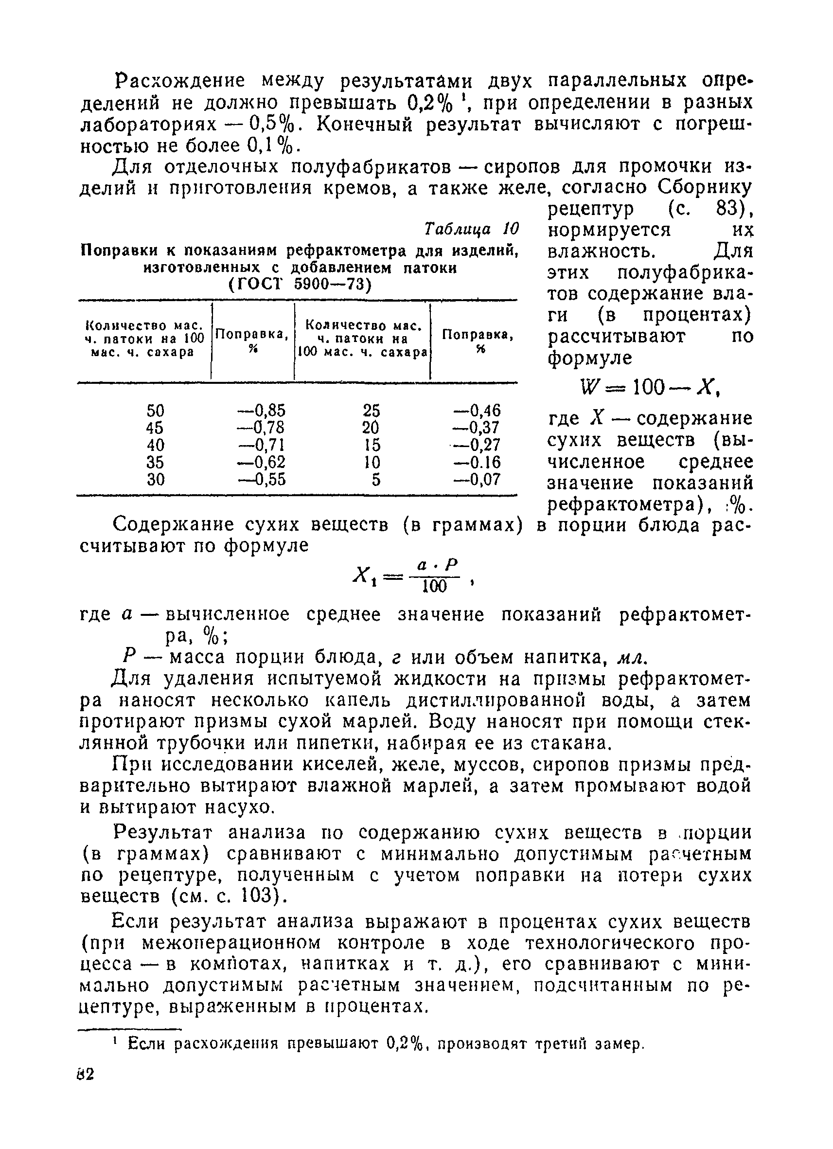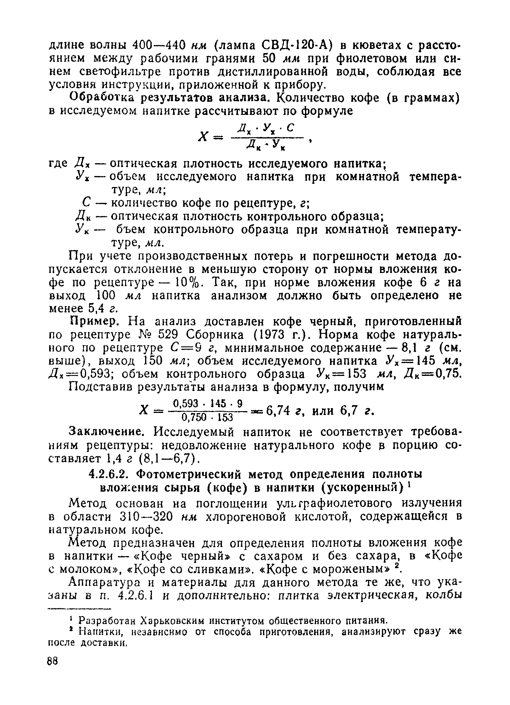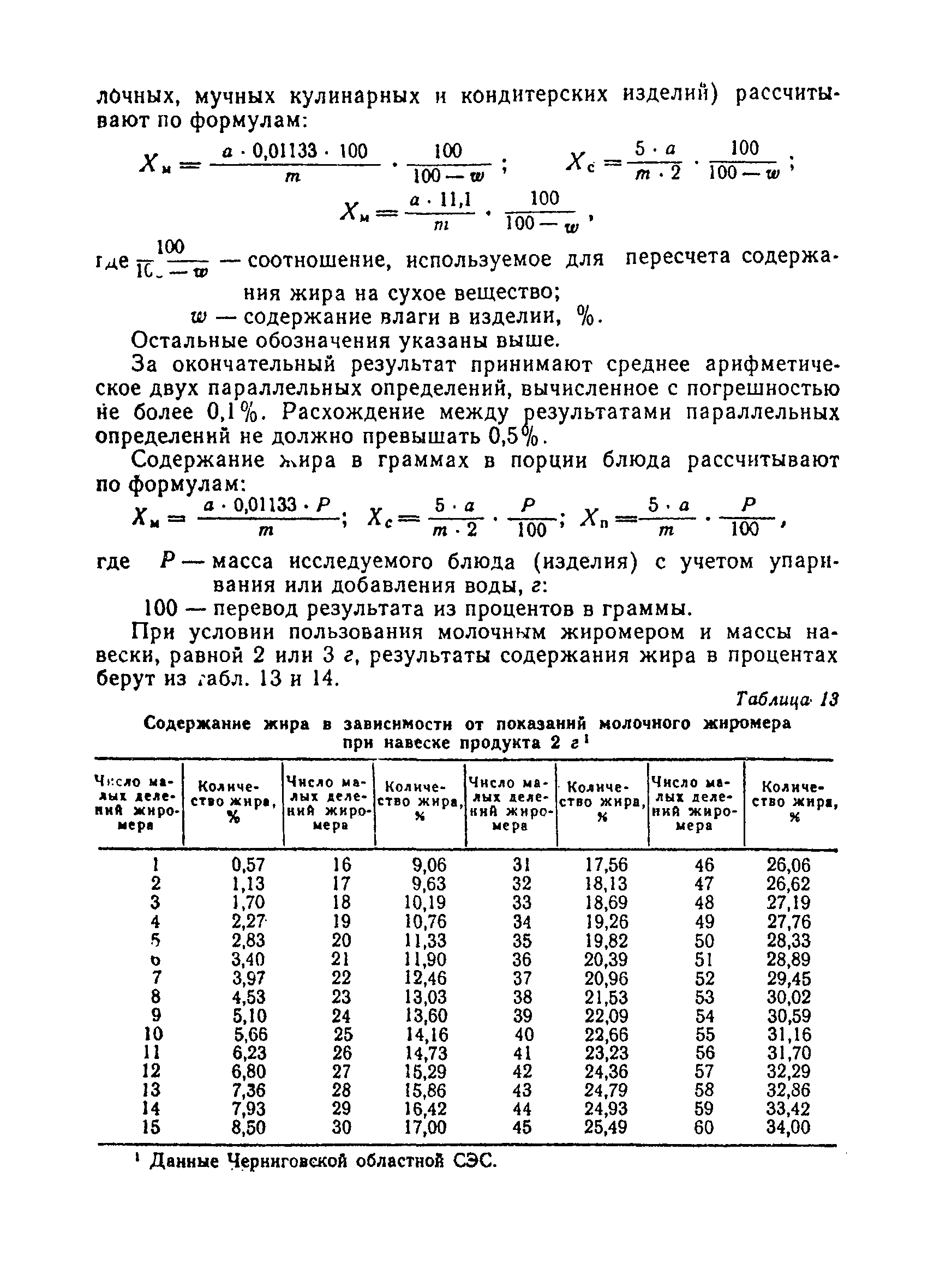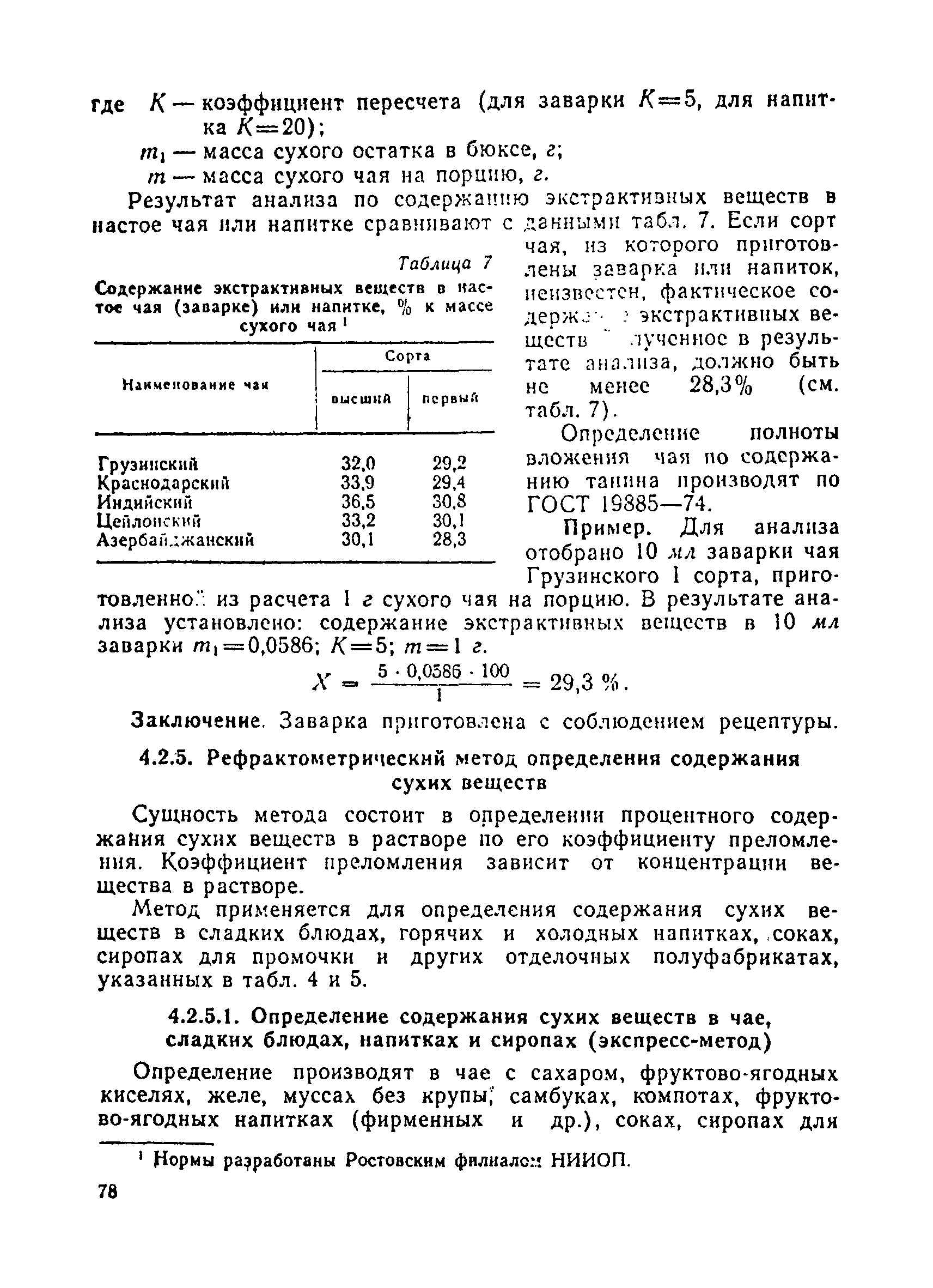 | Оглавление: | 1 Отбор проб 1.1 Основные положения по отбору проб стандартизованной продукции 1.2 Порядок отбора образцов для лабораторного анализа при обследовании предприятия 2 Подготовка проб для анализа 2.1 Взвешивание проб 2.2 Гомогенизация проб 2.3 Подготовка проб полуфабрикатов 2.4 Подготовка проб блюд и изделий 3 Основные физико-химические показатели качества сырья и кулинарной продукции 4 Методы испытаний полуфабрикатов, блюд и изделий 4.1 Общие указания 4.2 Определение содержания сухих веществ или влажности 4.2.1. Высушивание в сушильном шкафу до постоянной массы (арбитражный метод) 4.2.2. Высушивание в сушильном шкафу при температуре 130° С (ускоренный метод) 4.2.3. Высушивание в приборе К. Н. Чижовой (ускоренный метод) 4.2.4. Определение экстрактивных веществ в настое чая (заварке) или напитке 4.2.5. Рефрактометрический метод определения содержания сухих веществ 4.2.6. Определение полноты вложения сырья в горячие и холодные напитки (кофе и чай) 4.3 Определение содержания жира 4.3.1. Экстракционно-весовой метод по обезжиренному остатку (арбитражный) 4.3.2. Рефрактометрический метод (ускоренный) 4.3.3. Метод Гербера (кислоты с применением жиромеров) 4.3.4. Экстракционно-весовой метод определения жира (ускоренный) 4.4 Расчет содержания сухих веществ и жира по рецептурам блюд м изделий (с примерами расчетов) 4.5 Определение качества фритюрного жира 4.5.1. Оперативный производственный контроль качества фритюра 4.5.2. Лабораторный контроль качества фритюра 4.6 Определение содержания сахаров 4.6.1. Приготовление растворов редуцирующих сахаров 4.6.2. Перманганатный (арбитражный) метод 4.6.3. Йодометрический метод 4.6.4. Цианидный метод 4.6.5. Ускоренный цианидный метод определения содержания лактозы 4.6.6. Расчет содержания молока или наполнителей (по результатам анализа) 4.6.7. Рефрактометрические методы (ускоренные) 4.7. Расчет рецептур полуфабрикатов и изделий по физико-химическим показателям 4.7.1. Расчет влажности теста, содержания сахара и жира в сдобных булочных, мучных кулинарных н кондитерских изделиях, мучных и отделочных полуфабрикатах для кондитерских изделий 4.7.2. Расчет содержания хлеба в полуфабрикатах и кулинарных изделиях из рубленого мяса по рецептуре (с учетом сухарной или пшеничной панировочной муки) 4.7.3. Расчет содержания муки и сахара в полуфабрикатах и изделиях из творога 4.7.4. Методика составления и расчета рецептур алкогольных коктейлей 4.7.5. Расчет содержания этилового спирта в сиропе для промочки кондитерских полуфабрикатов 4.8. Определение содержания белков 4.8.1. Метод Кьельдаля (арбитражный) 4.8.2. Метод Джермилло в модификации В. А. Бабина и Н.Н. Мусерского (ускоренный) |