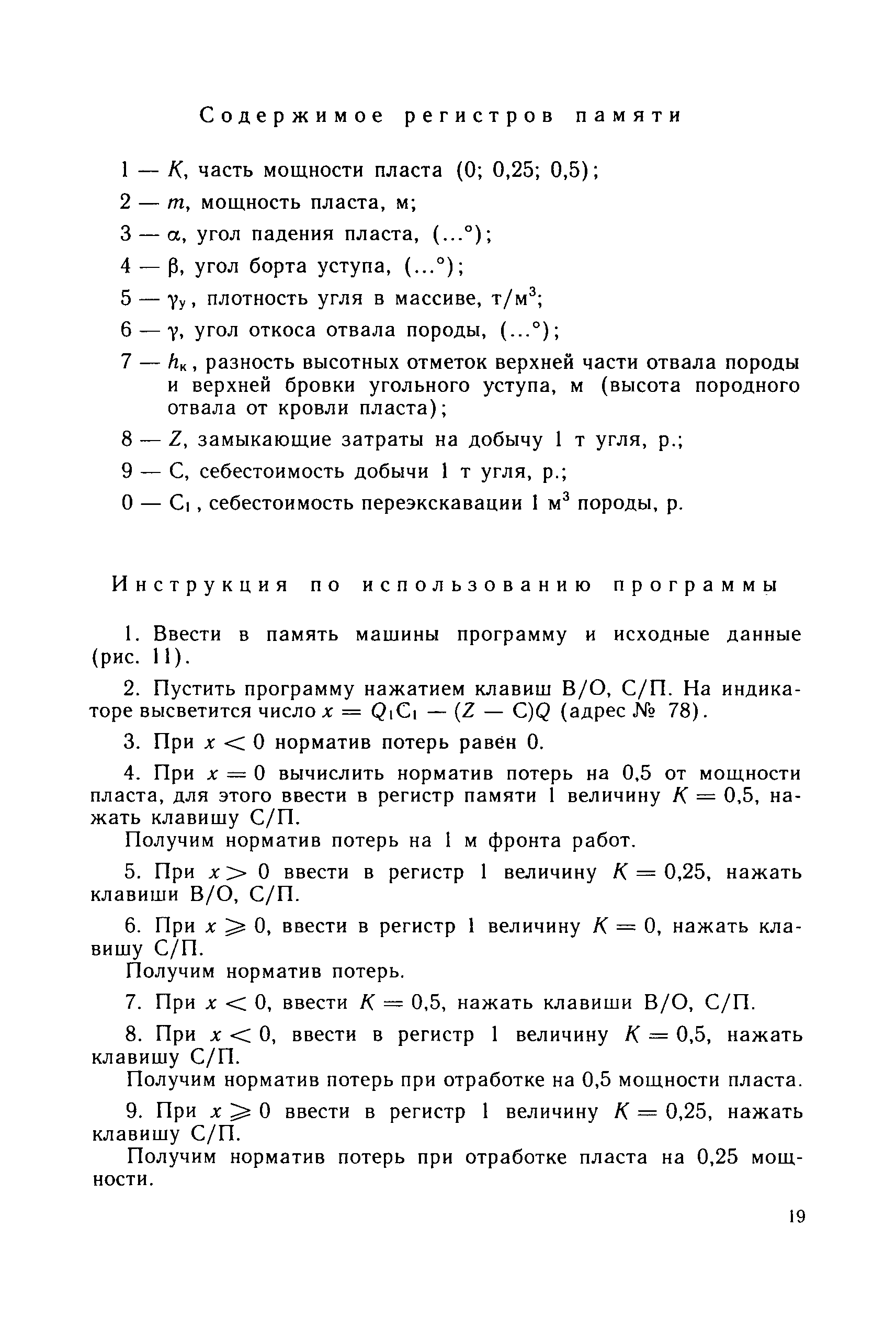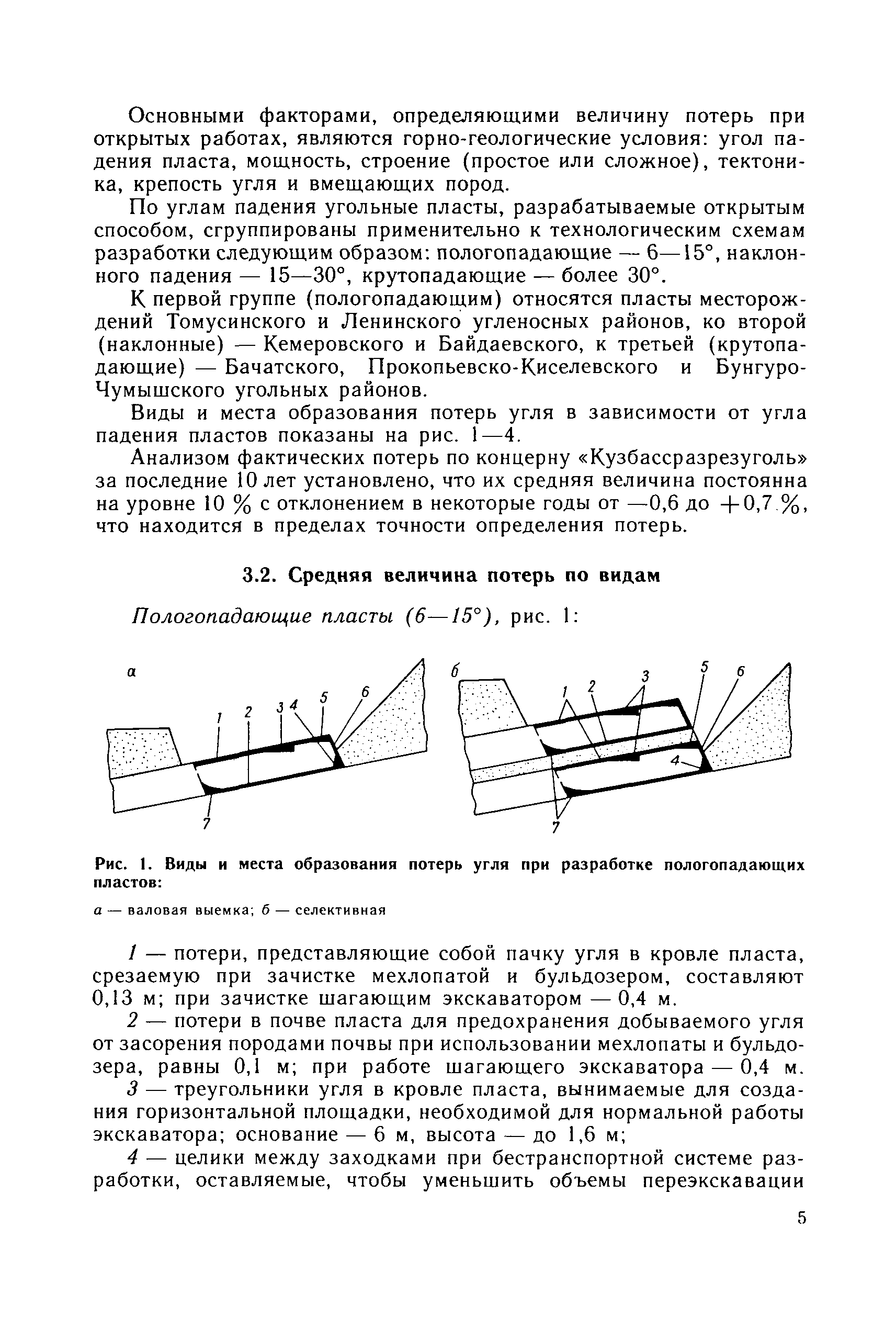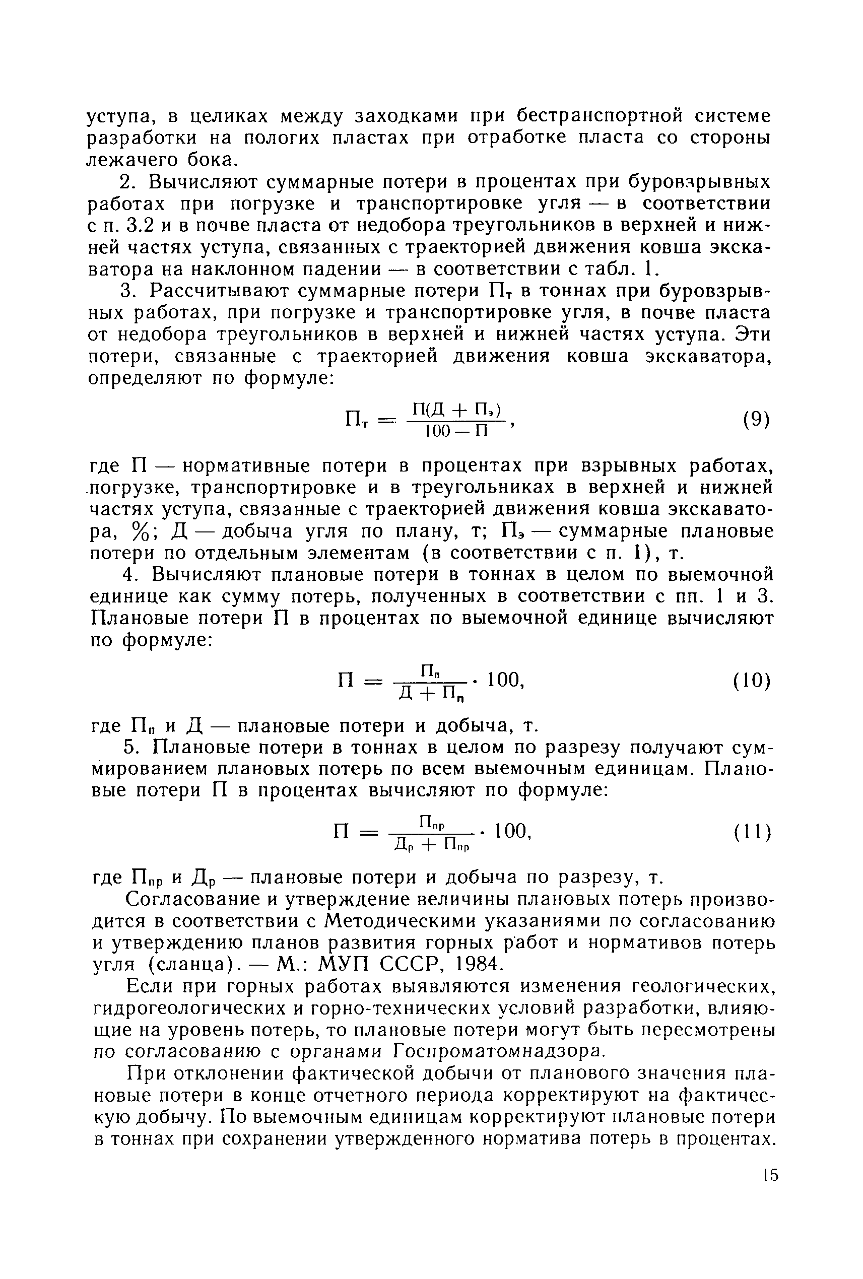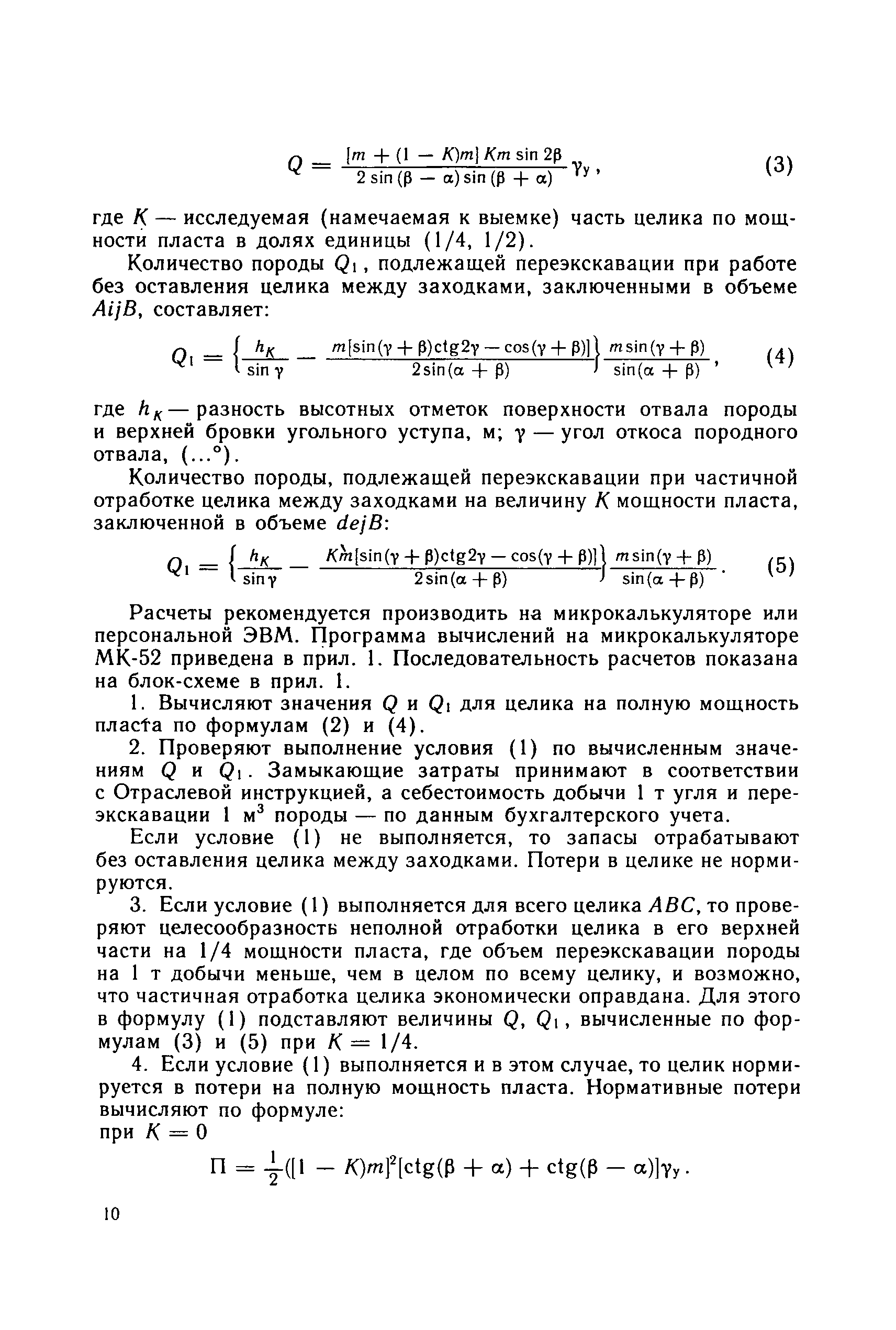 | Оглавление: | Основные понятия 1 Область и условия применения 2 Основные горно-геологические условия разработки запасов угля 3 Нормирование потерь 3.1. Общие положения 3.2. Средняя величина потерь по видам 3.3. Нормирование потерь в целиках между заходками 3.4. Нормирование потерь угля в почве и кровле пласта на наклонном и крутом падении при несовпадении углов падения пласта и откоса уступа 3.5. Нормирование потерь угля при отработке пласта со стороны лежачего бока 4 Планирование потерь 5 Экономическая оценка потерь 6 Приложение. Программы вычислений нормативных потерь угля на микрокалькуляторе МК-52 |