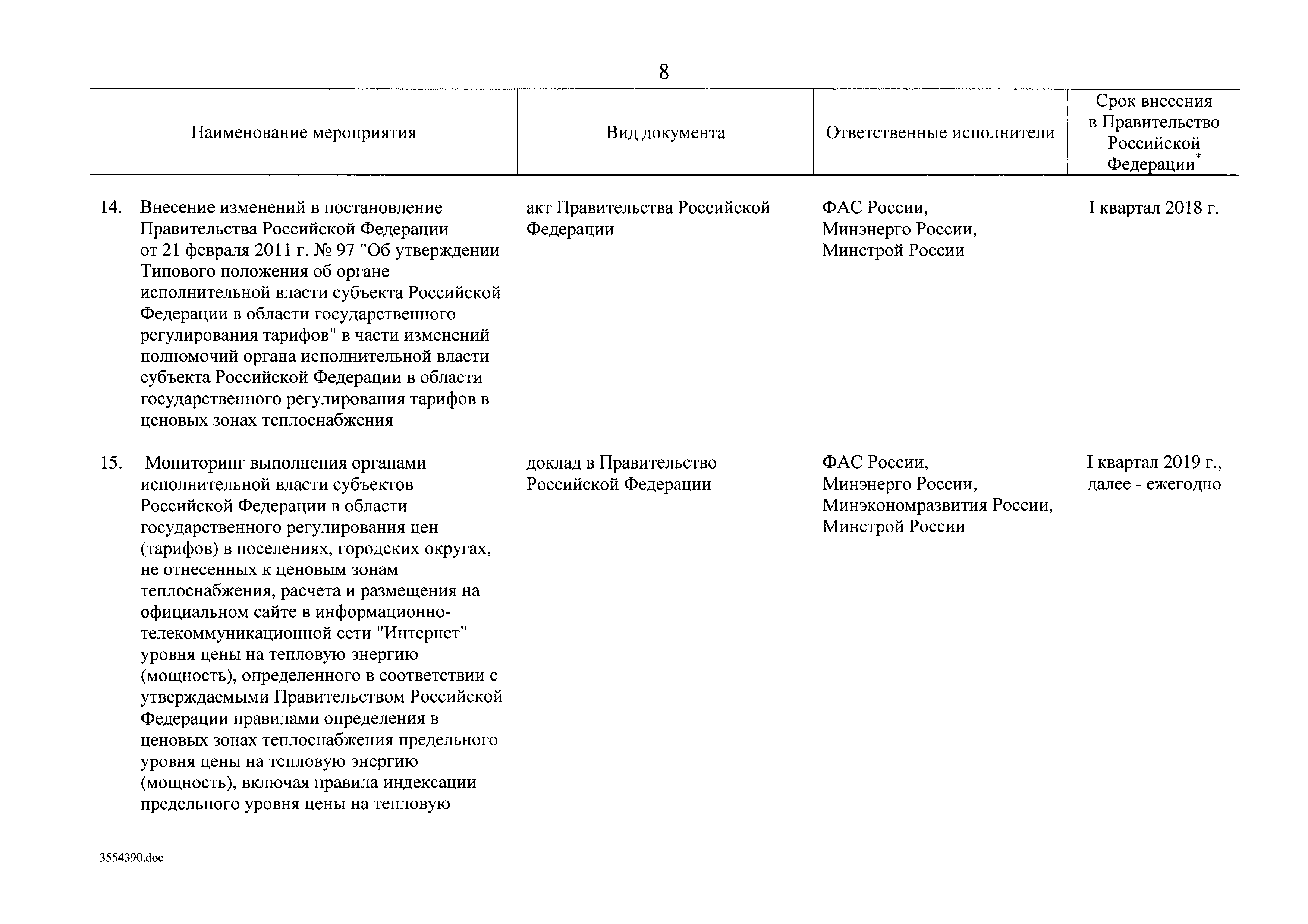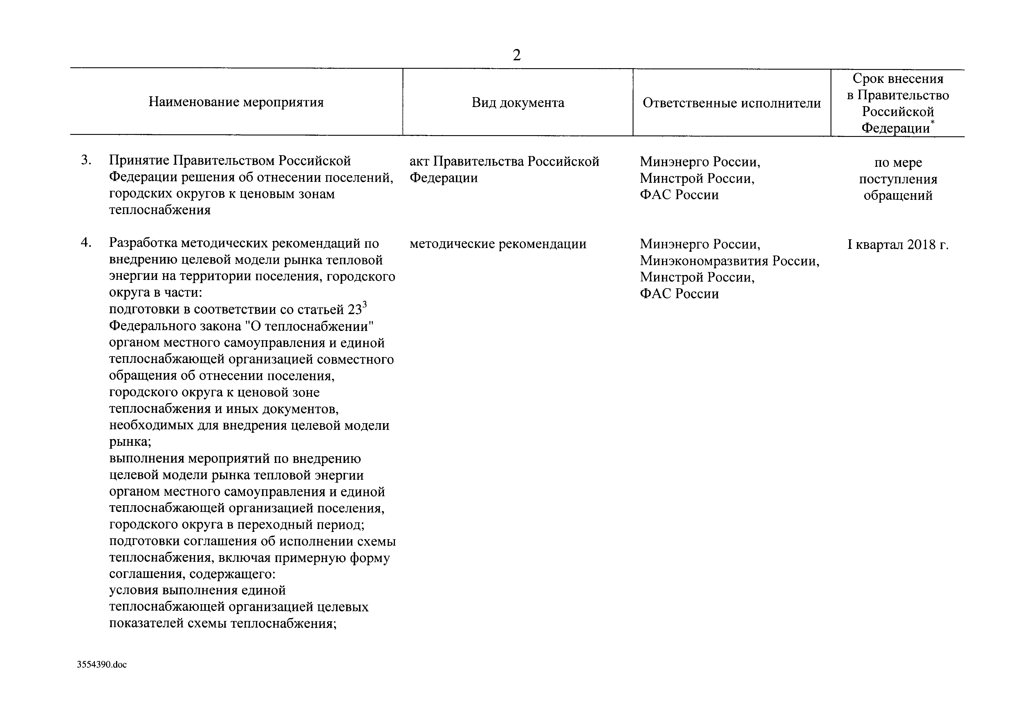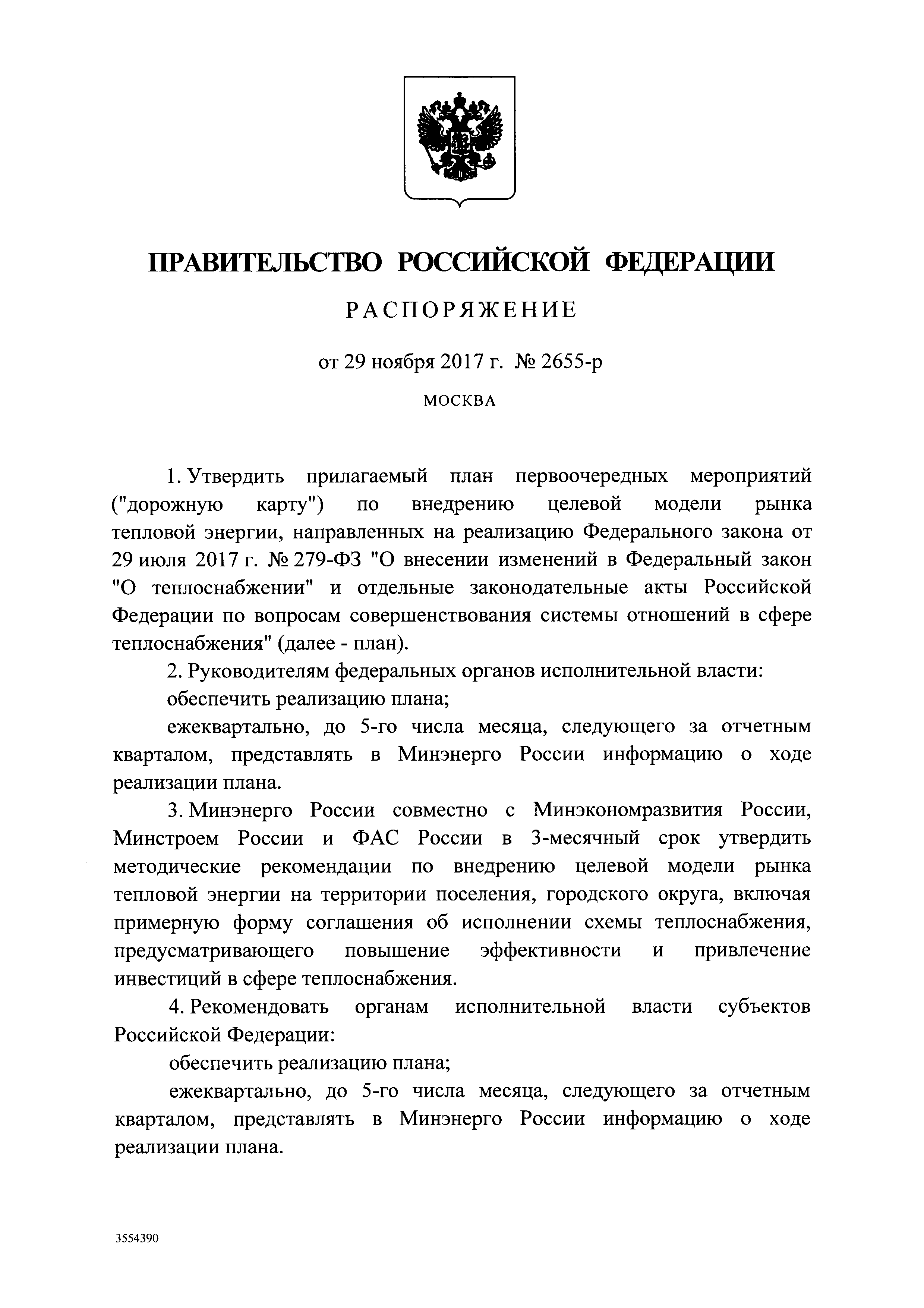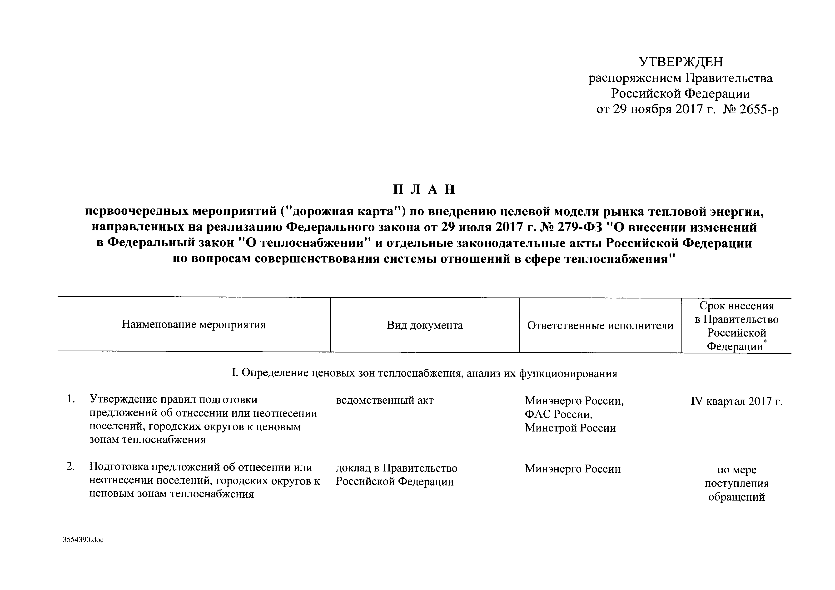 План первоочередных мероприятий ("дорожная карта") по внедрению целевой модели рынка тепловой энергии, направленных на реализацию Федерального закона от 29 июля 2017 г. № 279-ФЗ "О внесении изменений в Федеральный закон "О теплоснабжении" и отдельные законодательные акты Российской Федерации по вопросам совершенствования системы отношений в сфере теплоснабжения"| Статус: | действует | | Название рус.: | План первоочередных мероприятий ("дорожная карта") по внедрению целевой модели рынка тепловой энергии, направленных на реализацию Федерального закона от 29 июля 2017 г. № 279-ФЗ "О внесении изменений в Федеральный закон "О теплоснабжении" и отдельные законодательные акты Российской Федерации по вопросам совершенствования системы отношений в сфере теплоснабжения" | | Дата добавления в базу: | 01.01.2019 | | Дата актуализации: | 01.01.2021 | | Дата введения: | 29.11.2017 | | Утверждён: | 29.11.2017 Правительство Российской Федерации (2655-р)
