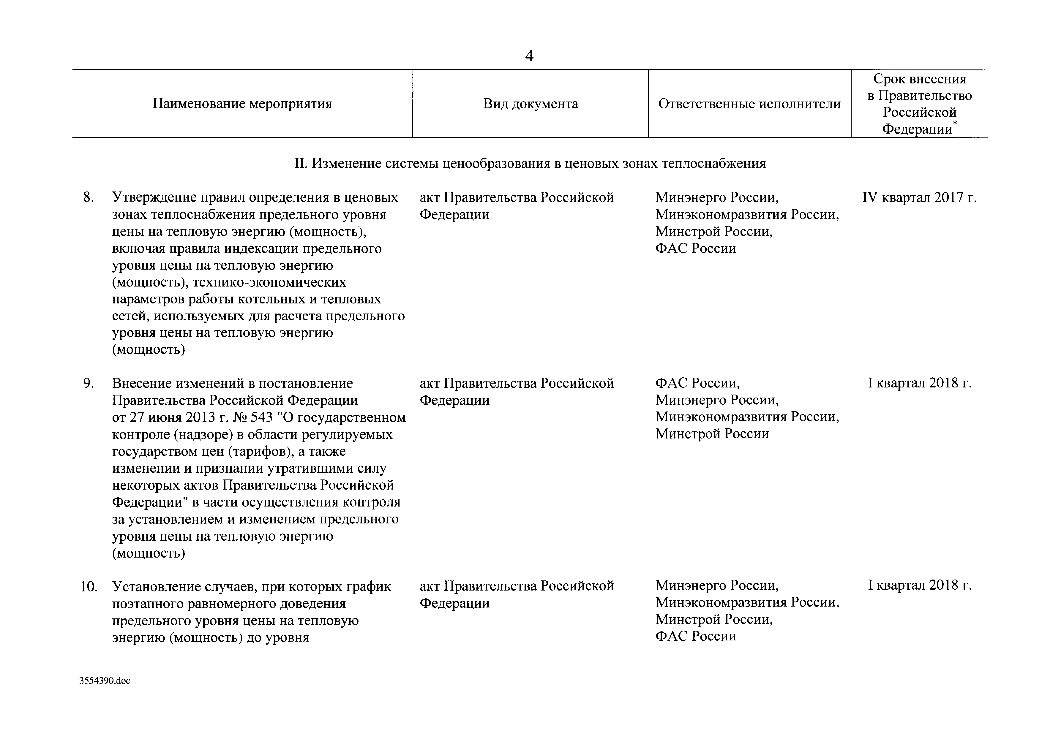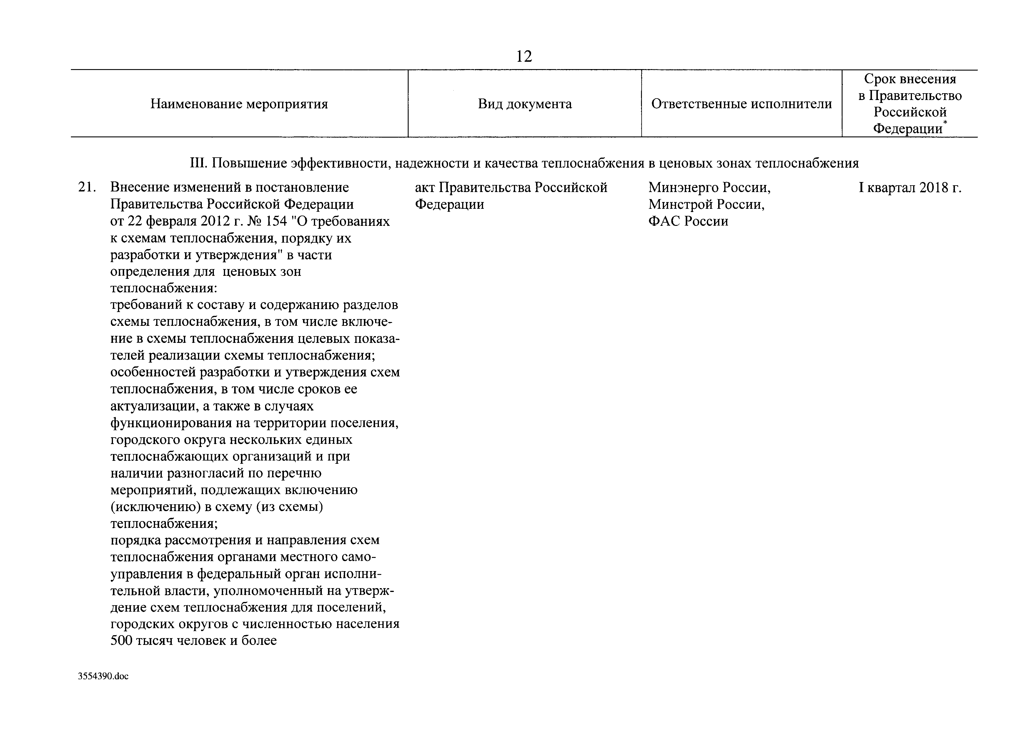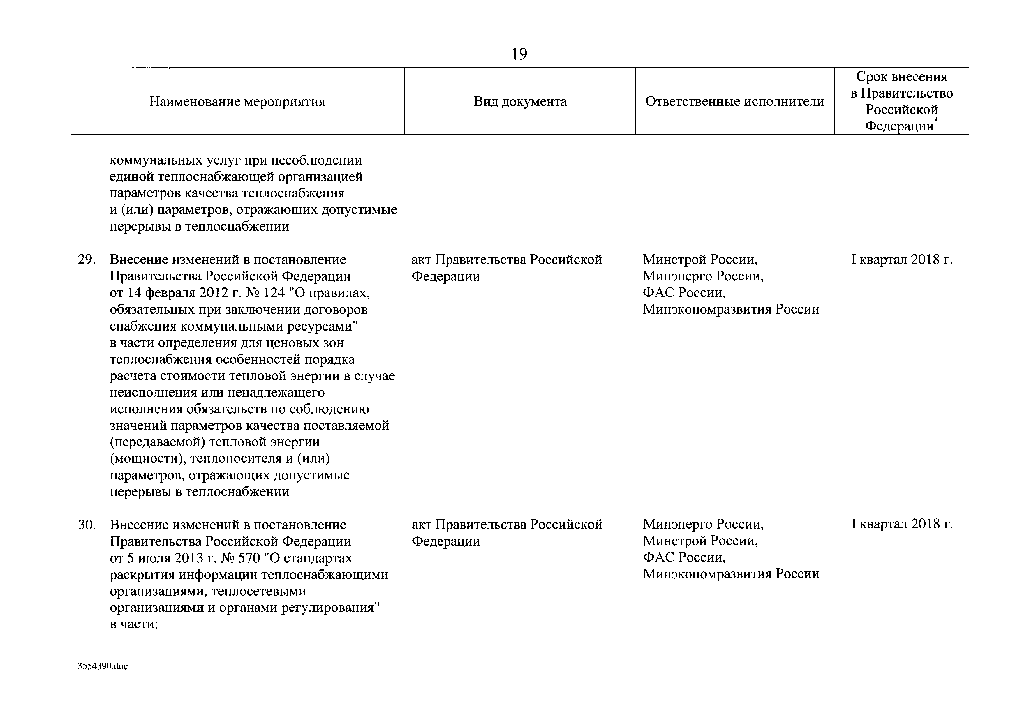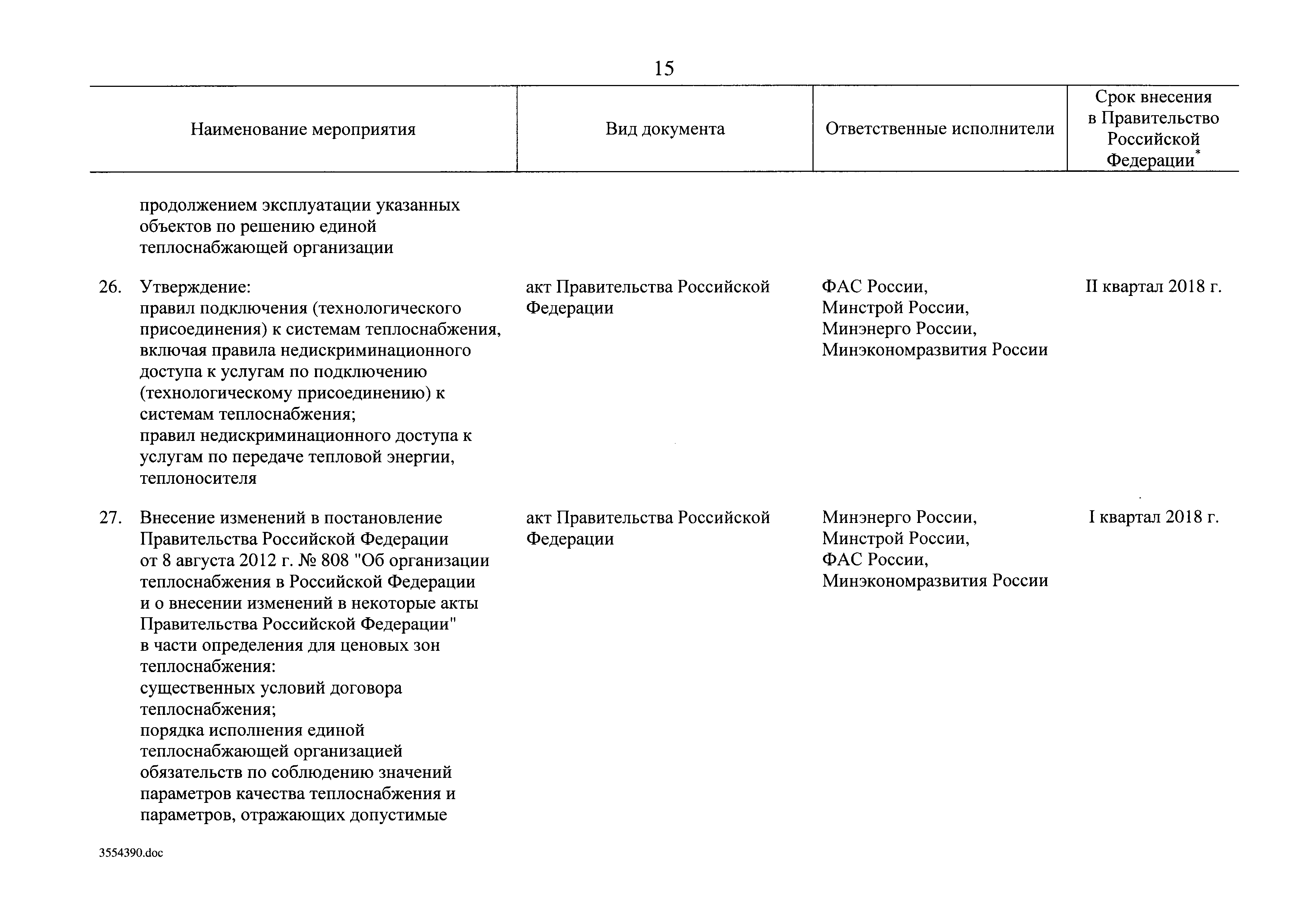 План первоочередных мероприятий ("дорожная карта") по внедрению целевой модели рынка тепловой энергии, направленных на реализацию Федерального закона от 29 июля 2017 г. № 279-ФЗ "О внесении изменений в Федеральный закон "О теплоснабжении" и отдельные законодательные акты Российской Федерации по вопросам совершенствования системы отношений в сфере теплоснабжения"| Статус: | действует | | Название рус.: | План первоочередных мероприятий ("дорожная карта") по внедрению целевой модели рынка тепловой энергии, направленных на реализацию Федерального закона от 29 июля 2017 г. № 279-ФЗ "О внесении изменений в Федеральный закон "О теплоснабжении" и отдельные законодательные акты Российской Федерации по вопросам совершенствования системы отношений в сфере теплоснабжения" | | Дата добавления в базу: | 01.01.2019 | | Дата актуализации: | 01.01.2021 | | Дата введения: | 29.11.2017 | | Утверждён: | 29.11.2017 Правительство Российской Федерации (2655-р)