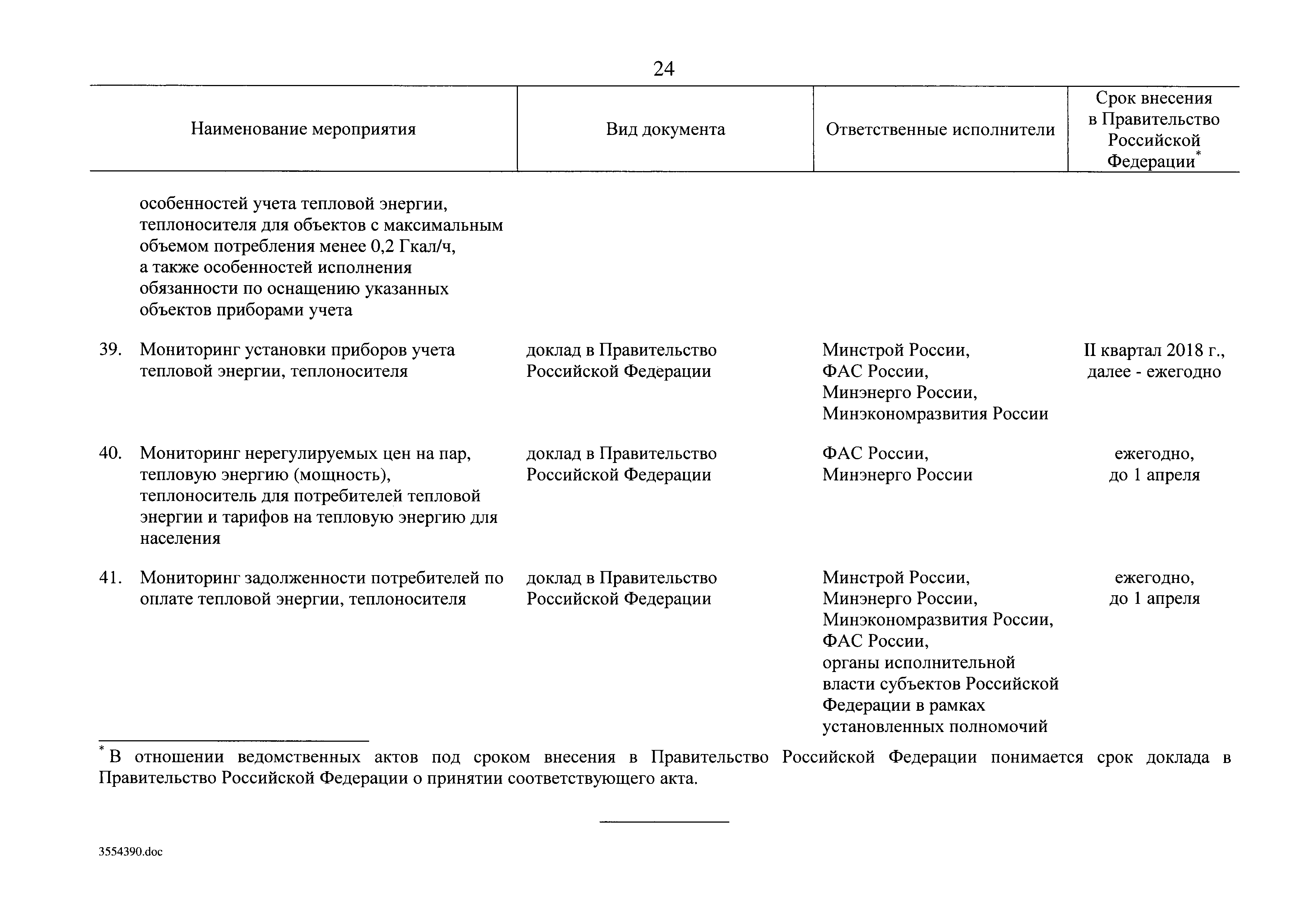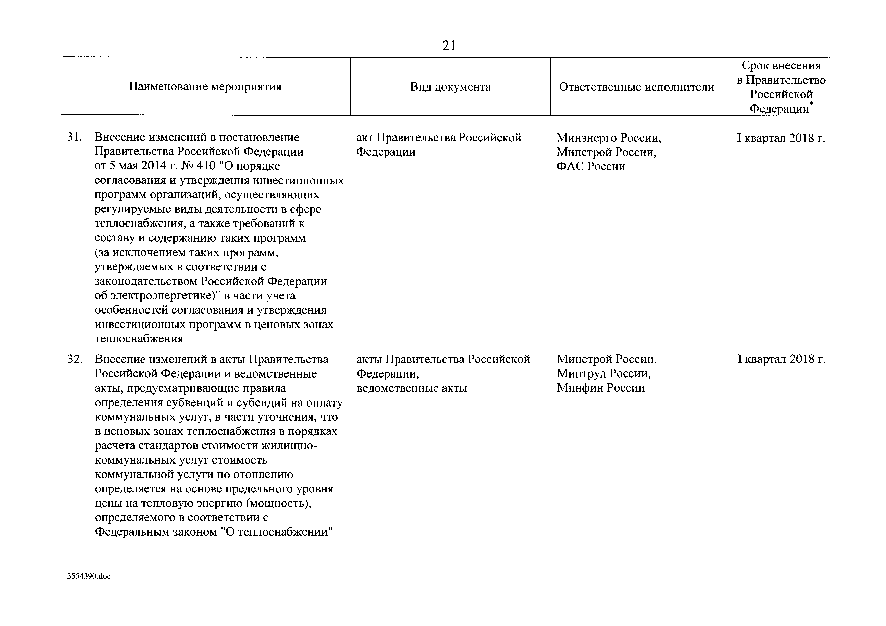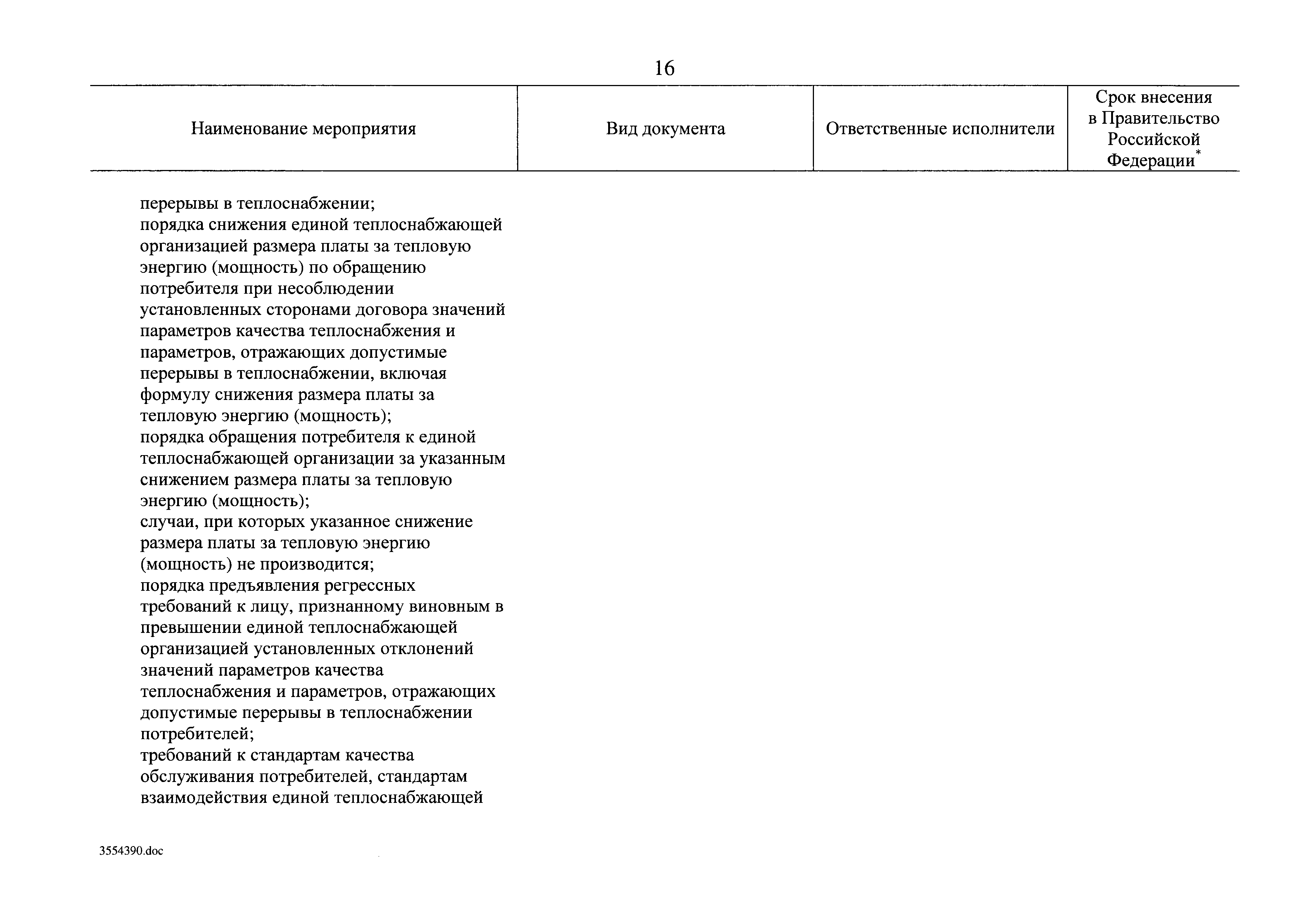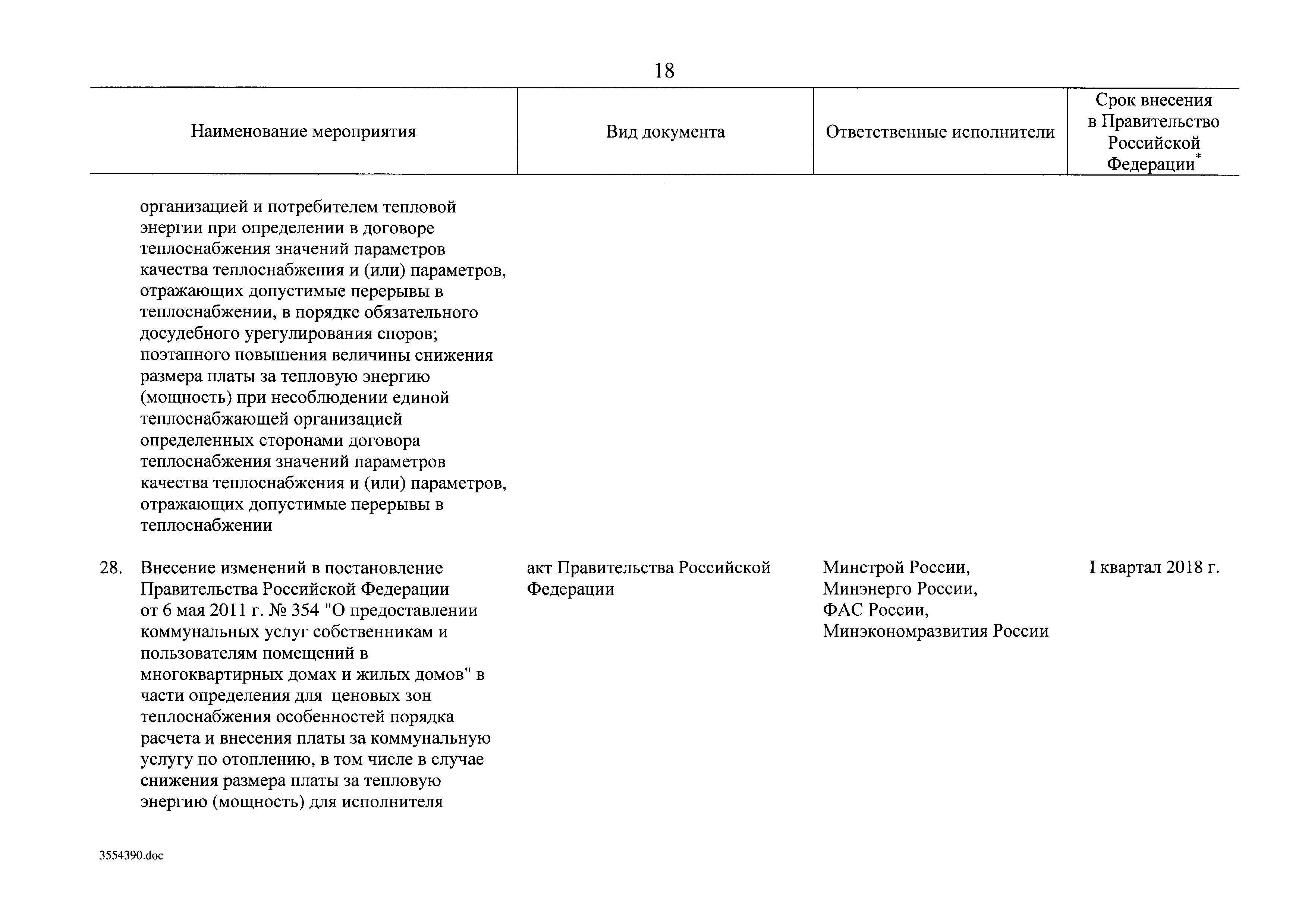 План первоочередных мероприятий ("дорожная карта") по внедрению целевой модели рынка тепловой энергии, направленных на реализацию Федерального закона от 29 июля 2017 г. № 279-ФЗ "О внесении изменений в Федеральный закон "О теплоснабжении" и отдельные законодательные акты Российской Федерации по вопросам совершенствования системы отношений в сфере теплоснабжения"| Статус: | действует | | Название рус.: | План первоочередных мероприятий ("дорожная карта") по внедрению целевой модели рынка тепловой энергии, направленных на реализацию Федерального закона от 29 июля 2017 г. № 279-ФЗ "О внесении изменений в Федеральный закон "О теплоснабжении" и отдельные законодательные акты Российской Федерации по вопросам совершенствования системы отношений в сфере теплоснабжения" | | Дата добавления в базу: | 01.01.2019 | | Дата актуализации: | 01.01.2021 | | Дата введения: | 29.11.2017 | | Утверждён: | 29.11.2017 Правительство Российской Федерации (2655-р)