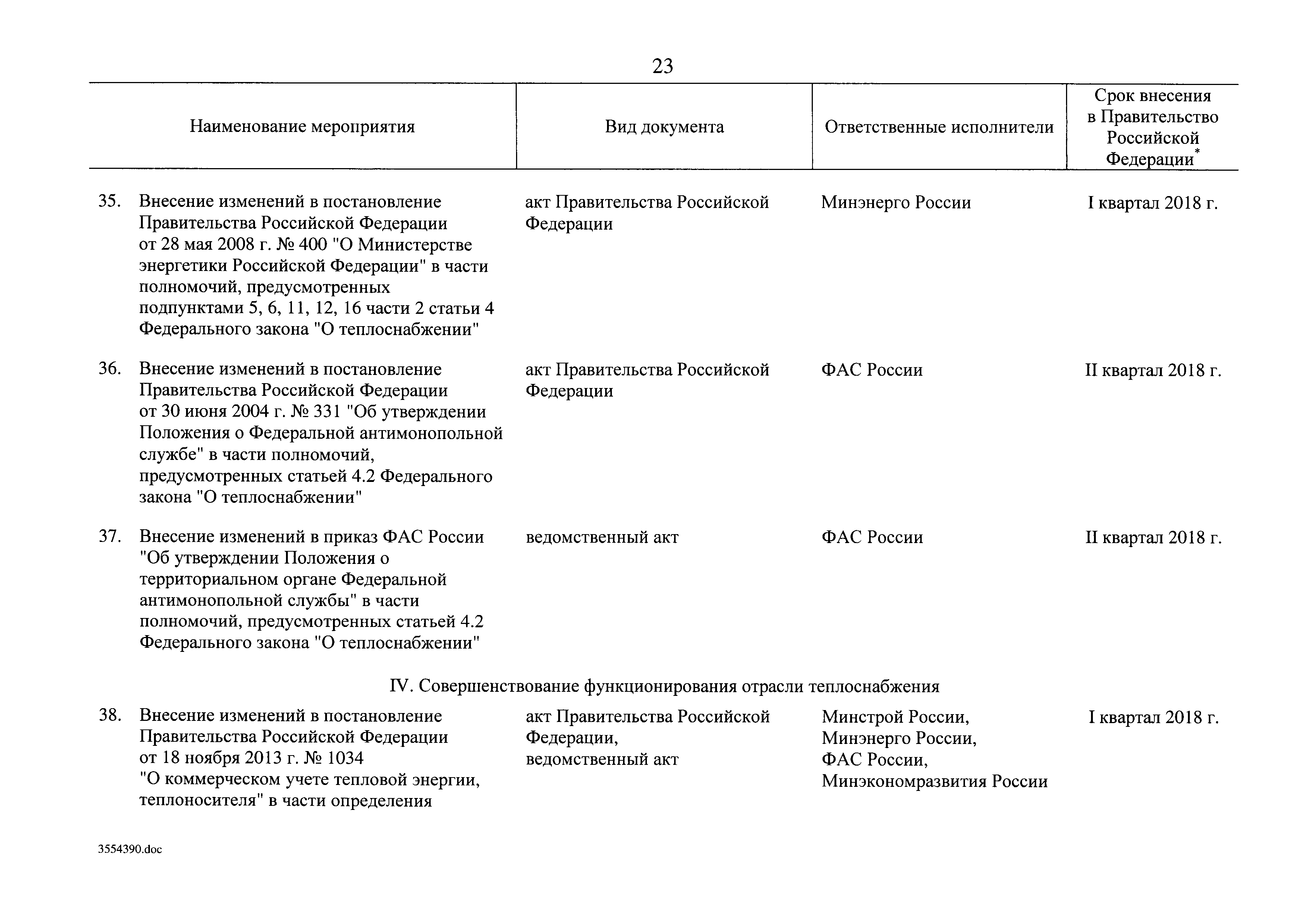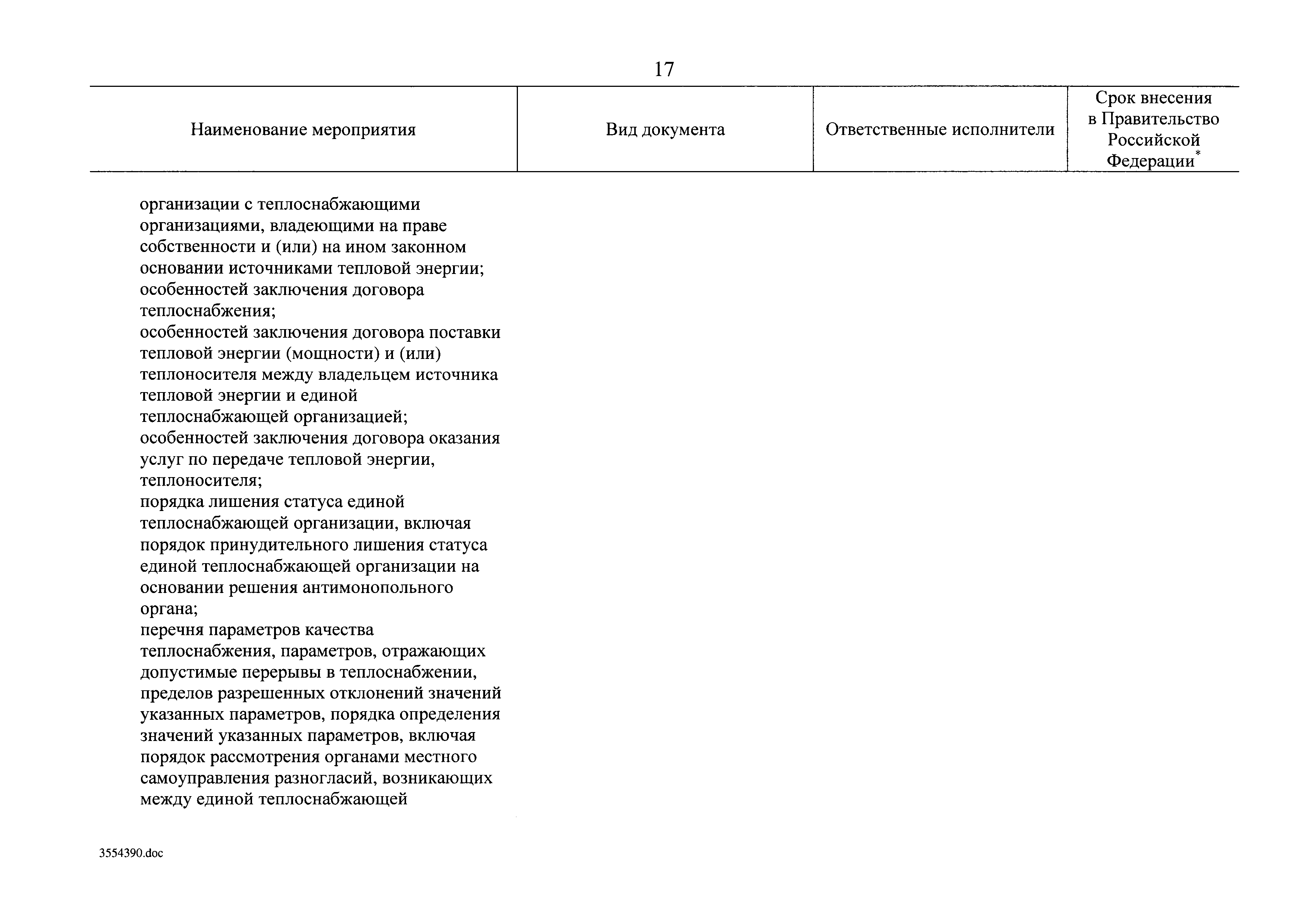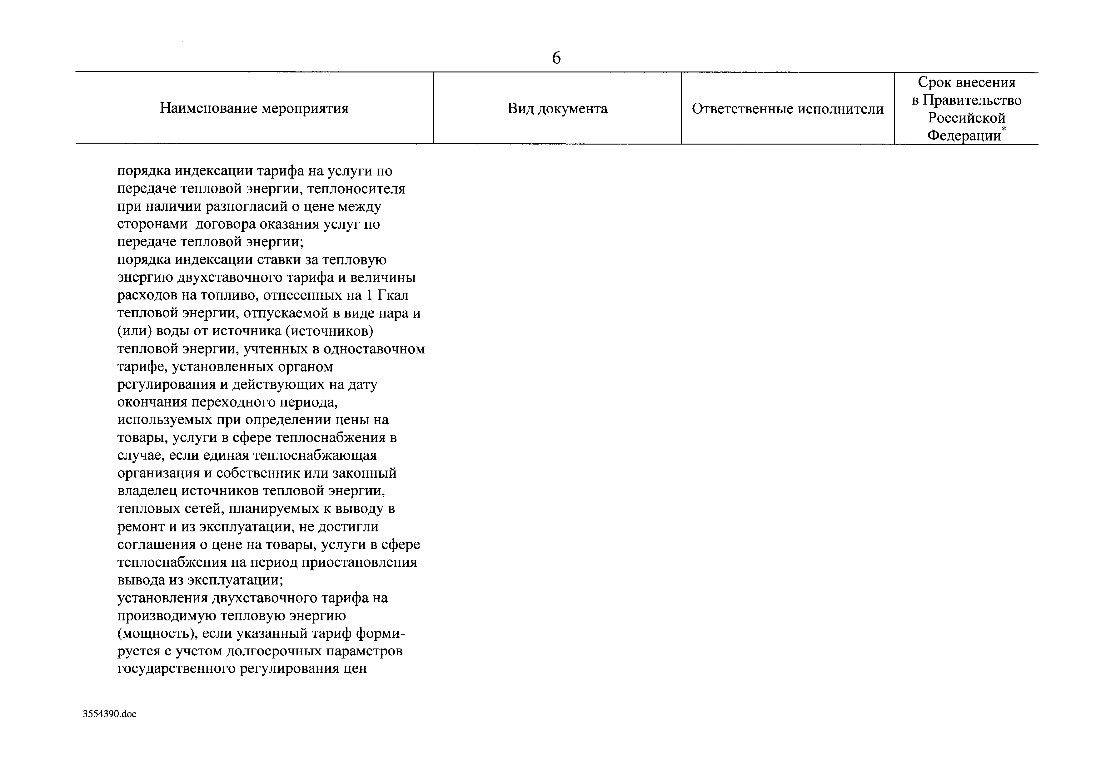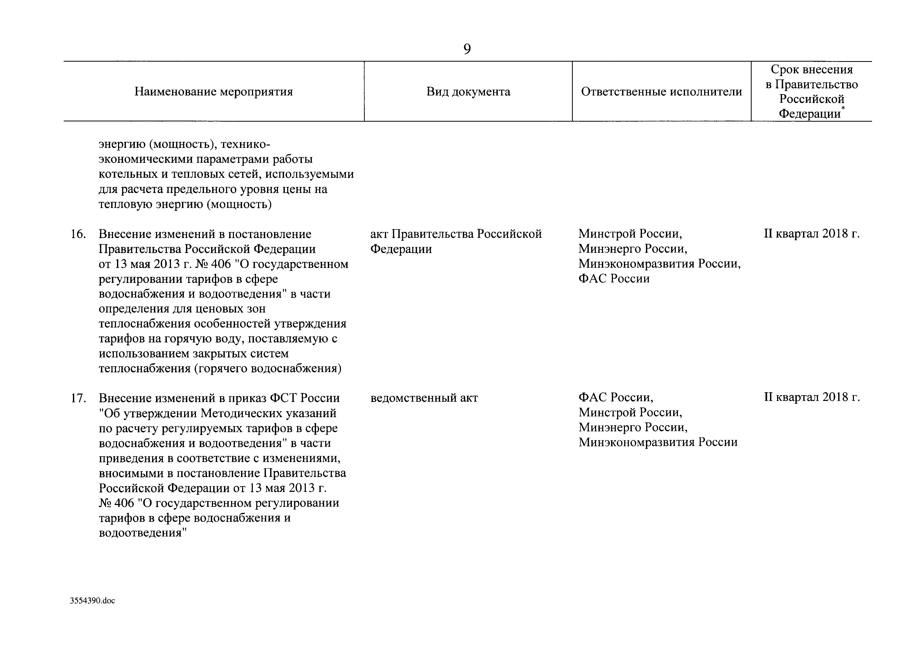 План первоочередных мероприятий ("дорожная карта") по внедрению целевой модели рынка тепловой энергии, направленных на реализацию Федерального закона от 29 июля 2017 г. № 279-ФЗ "О внесении изменений в Федеральный закон "О теплоснабжении" и отдельные законодательные акты Российской Федерации по вопросам совершенствования системы отношений в сфере теплоснабжения"| Статус: | действует | | Название рус.: | План первоочередных мероприятий ("дорожная карта") по внедрению целевой модели рынка тепловой энергии, направленных на реализацию Федерального закона от 29 июля 2017 г. № 279-ФЗ "О внесении изменений в Федеральный закон "О теплоснабжении" и отдельные законодательные акты Российской Федерации по вопросам совершенствования системы отношений в сфере теплоснабжения" | | Дата добавления в базу: | 01.01.2019 | | Дата актуализации: | 01.01.2021 | | Дата введения: | 29.11.2017 | | Утверждён: | 29.11.2017 Правительство Российской Федерации (2655-р)