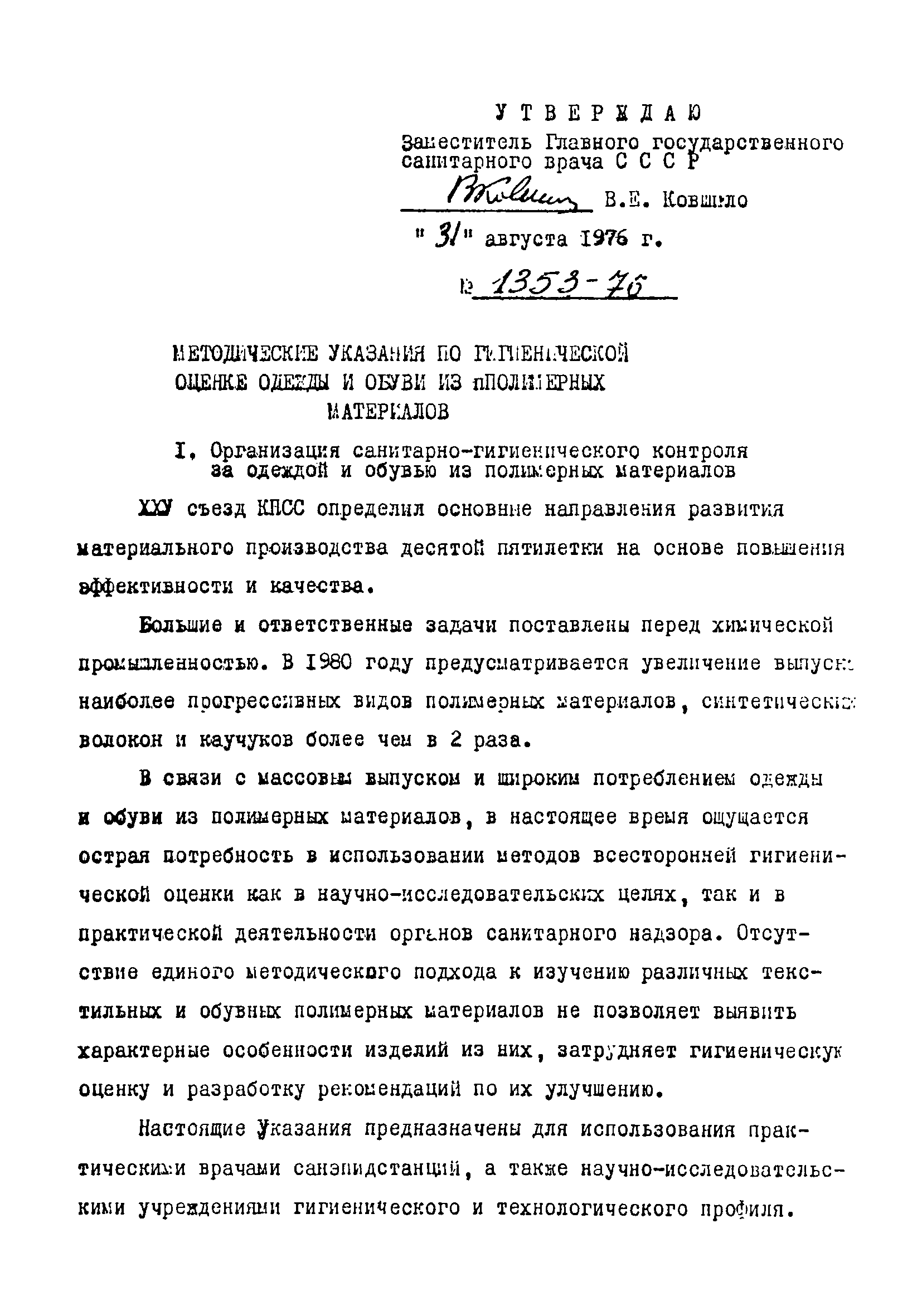 | Утверждён: | 31.08.1976 Зам. Главного Государственного санитарного врача СССР (USSR Deputy Chief Public Health Officer 1353-76)