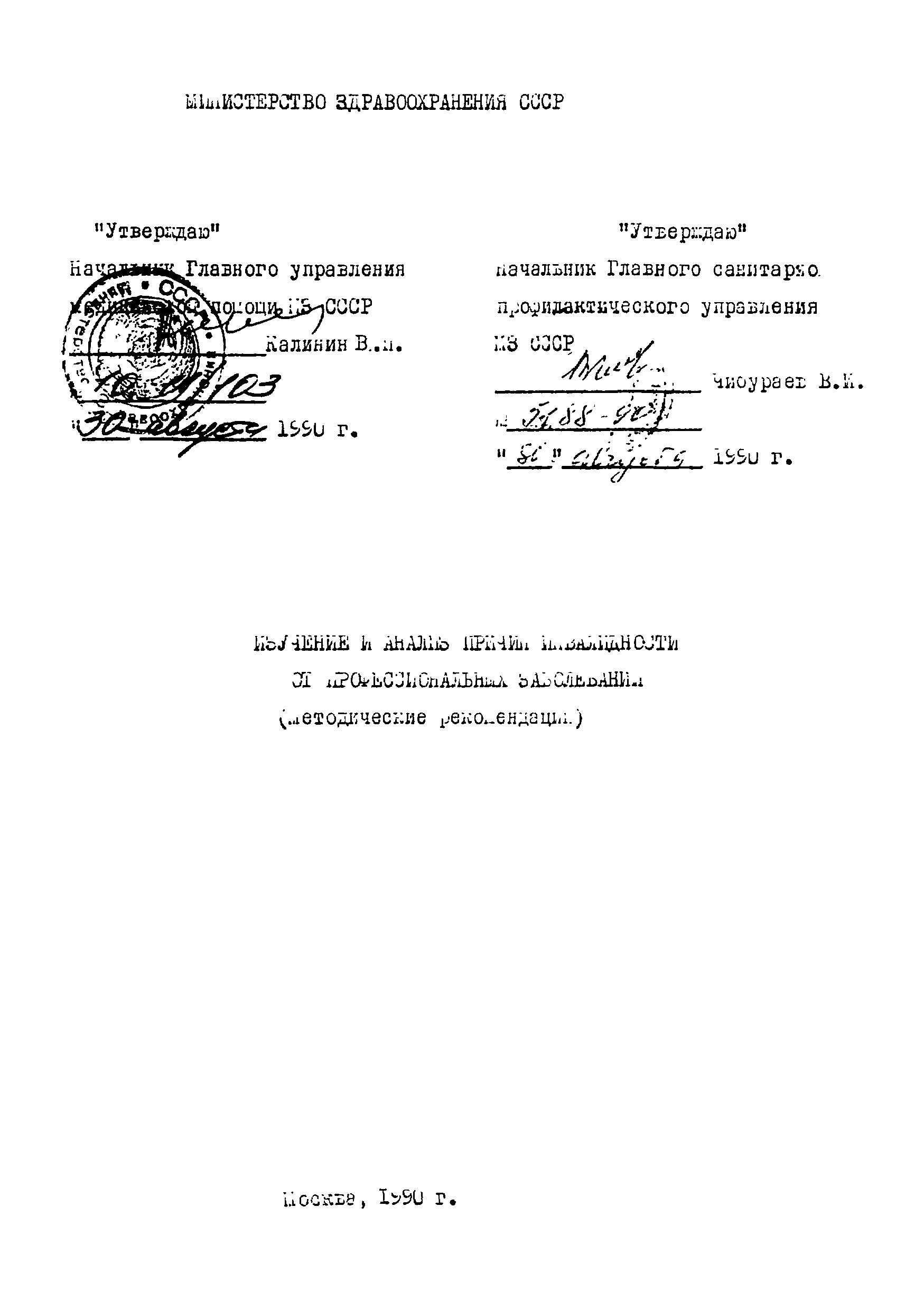 | Утверждён: | 30.08.1990 Начальник Главного санитарно-профилактического управления МЗ СССР (5188-90) 30.08.1990 Начальник Главного управления медицинской помощи МЗ СССР (10 11/103)
