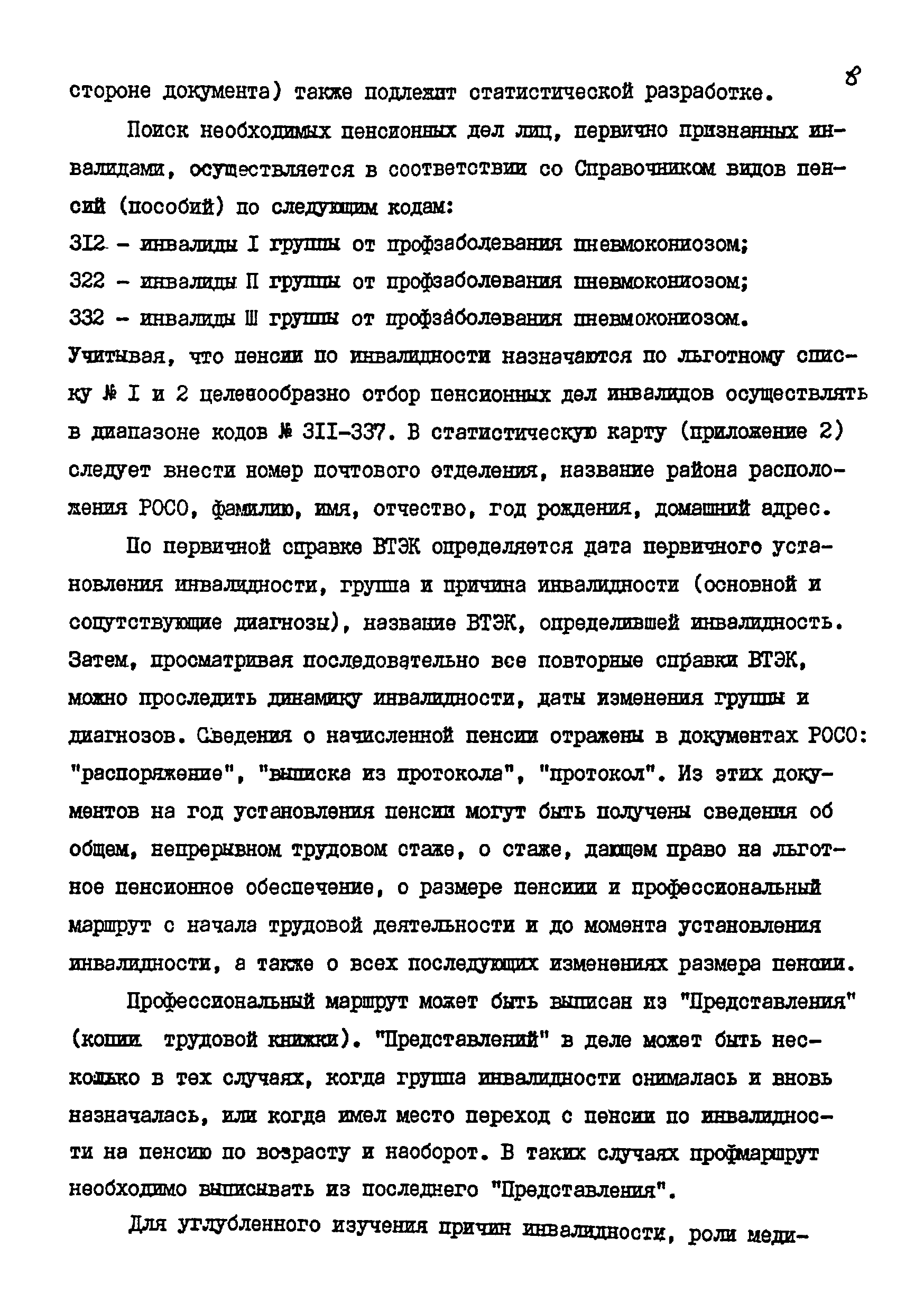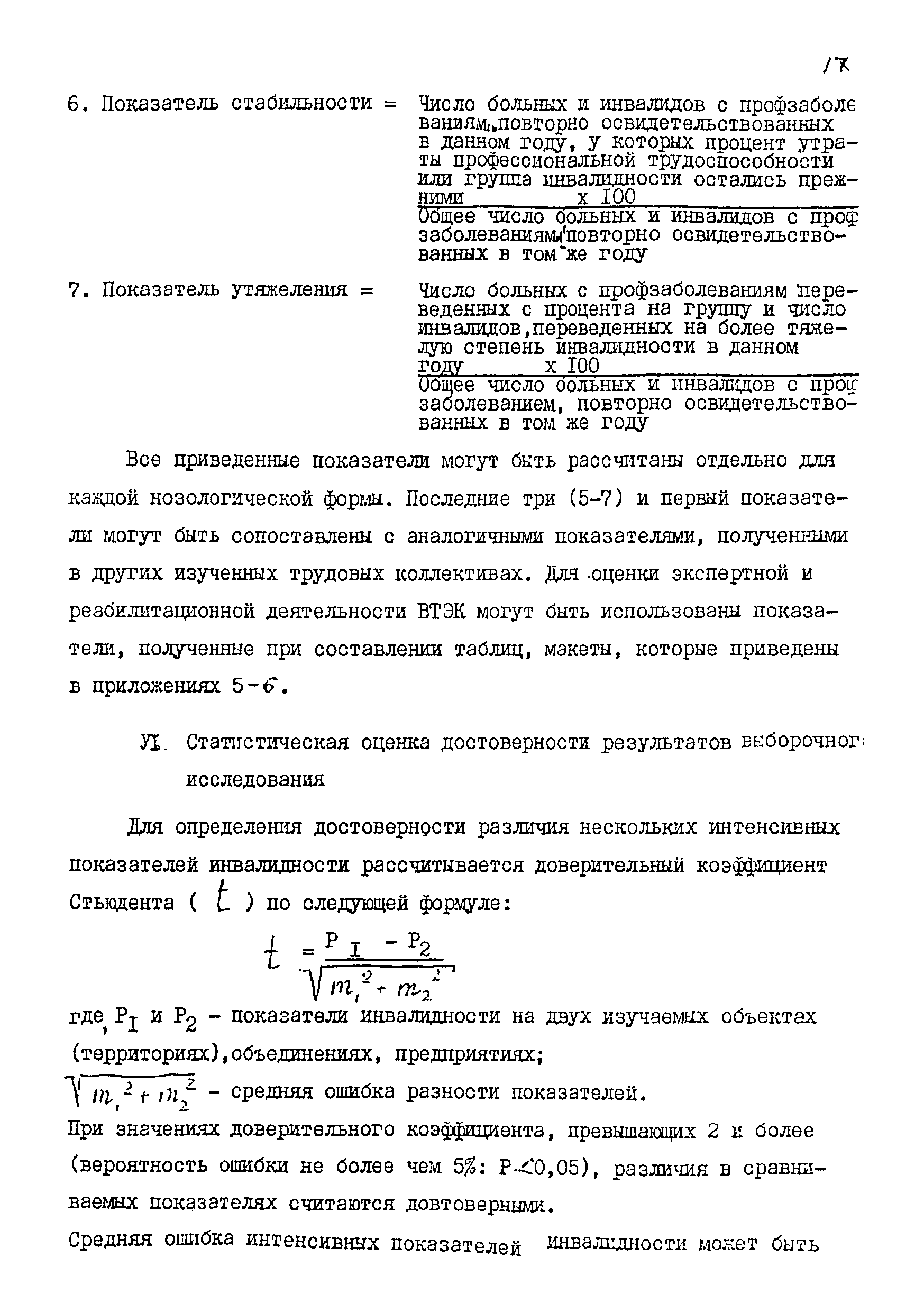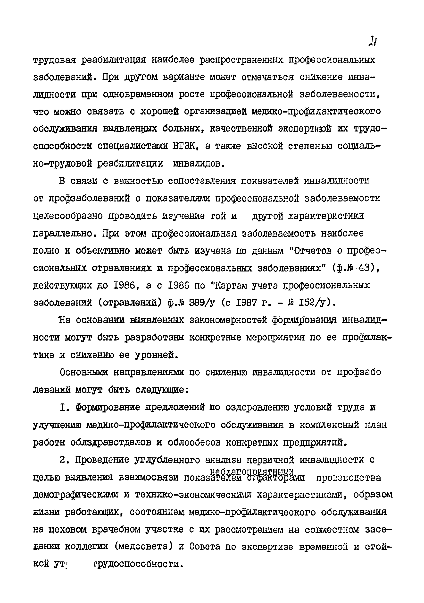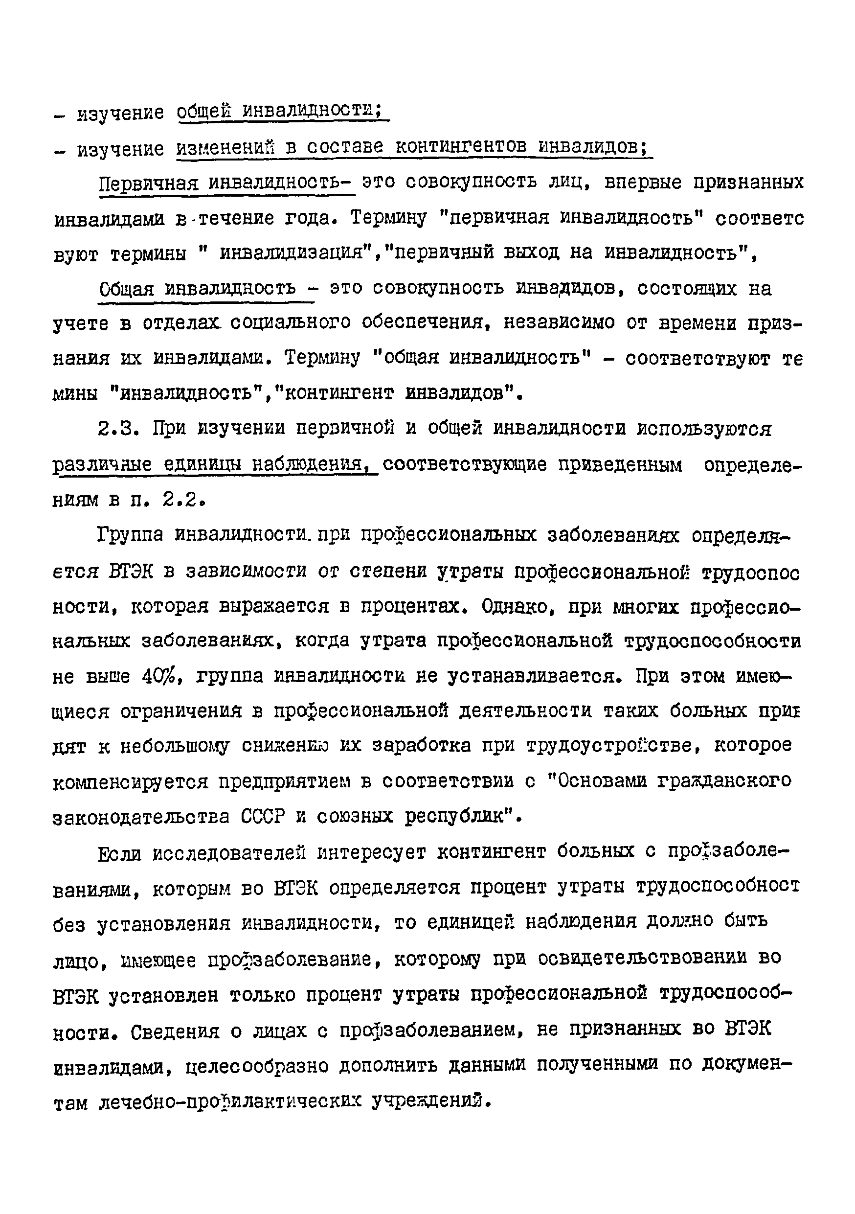 | Оглавление: | I. Общие положения II. Этапы статистического исследования инвалидности III. Источники получения информации об инвалидизации и контингентах инвалидов IV. Расчет основных показателей, характеризующих инвалидность от профзаболеваний V. Основные статистические показатели, характеризующие деятельность ВТЭК в отношении больных и инвалидов с профзаболеваниями VI. Статистическая оценка достоверности результатов выборочного исследования VII. Особенности социально-гигиенического анализа результатов изучения инвалидности от профзаболеваний Приложение 1 Карта для изучения инвалидности от профессиональных заболеваний по материалам ВТЭК и оценки экспертной и реабилитационной деятельности ВТЭК в отношении этого контингента инвалидов Приложение 2 Карта для изучения контингентов инвалидов вследствие профессионального заболевания, состоящих на учете в отделах социального обеспечения Приложение 3 Анкета для изучения субъективной оценки условий труда, семейно-бытовых условий и медицинской помощи инвалидам от профзаболеваний Приложение 4 Анкета для оценки уровня удовлетворенности характером профессии и видом работы при трудоустройстве инвалида Приложение 5 Результаты экспертной оценки реабилитационной деятельности ВТЭК в отношении больных с профзаболеваниями Приложение 6 Результаты экспертной оценки деятельности ВТЭК по экспертизе трудоспособности больных и инвалидов с профзаболеваниями |