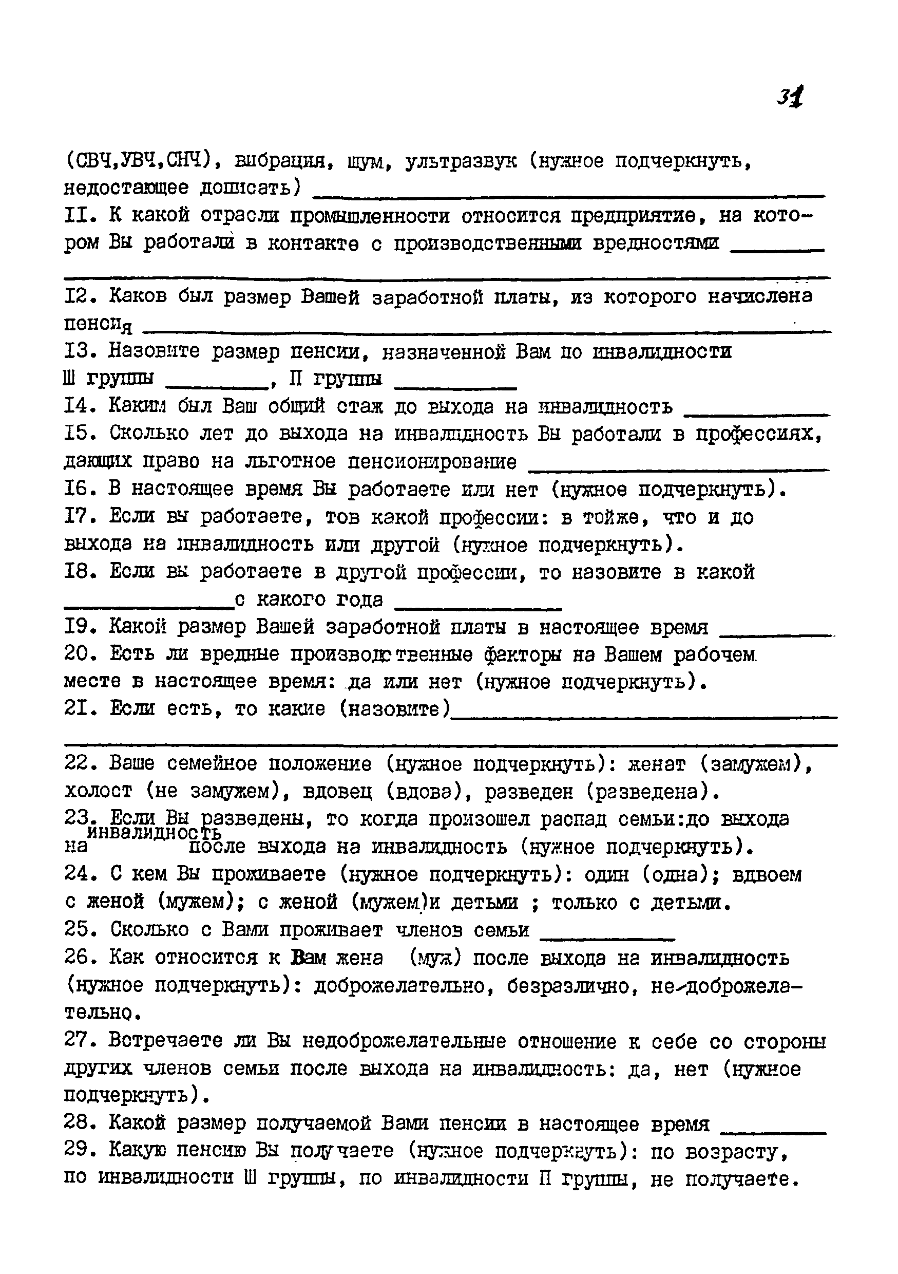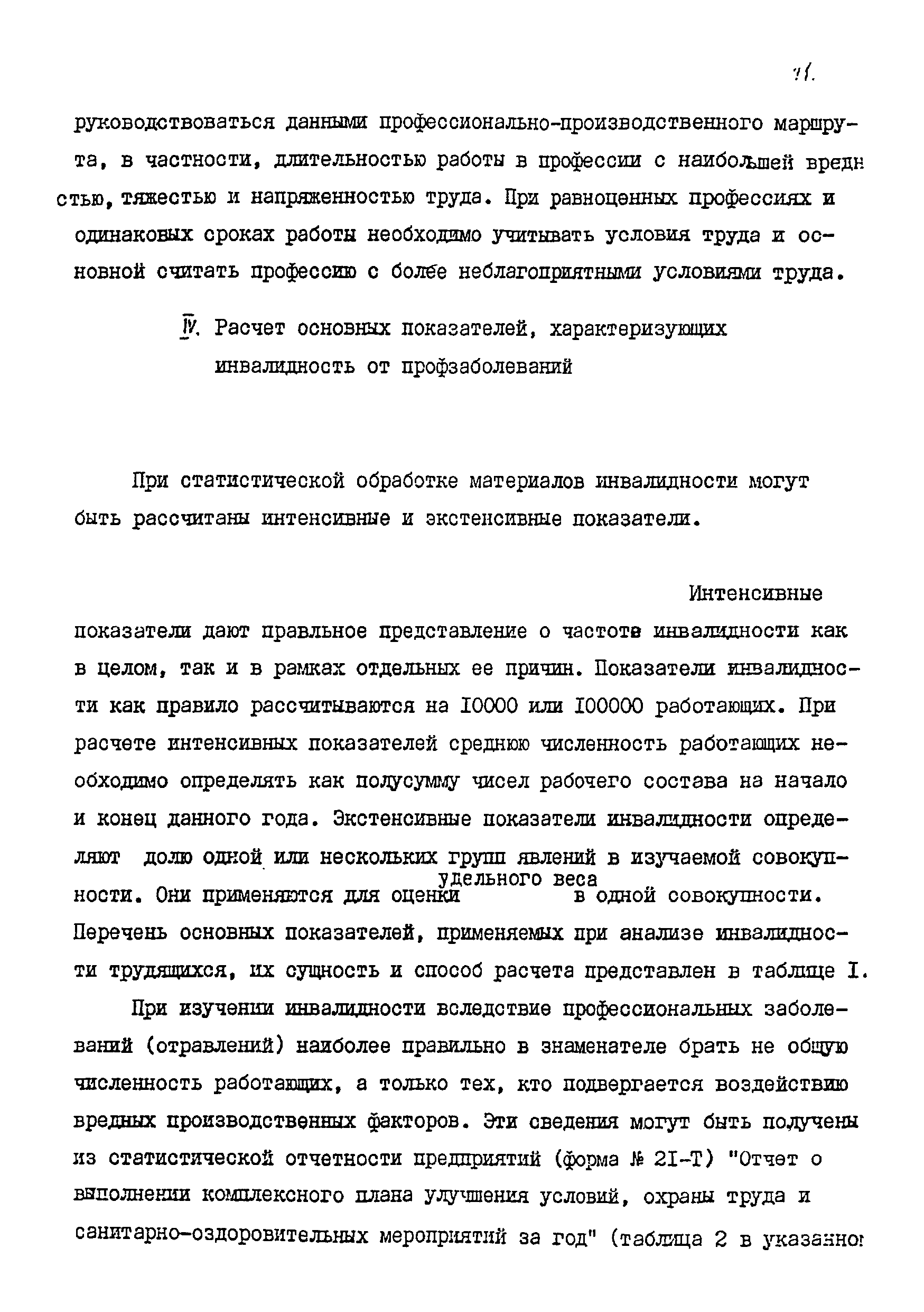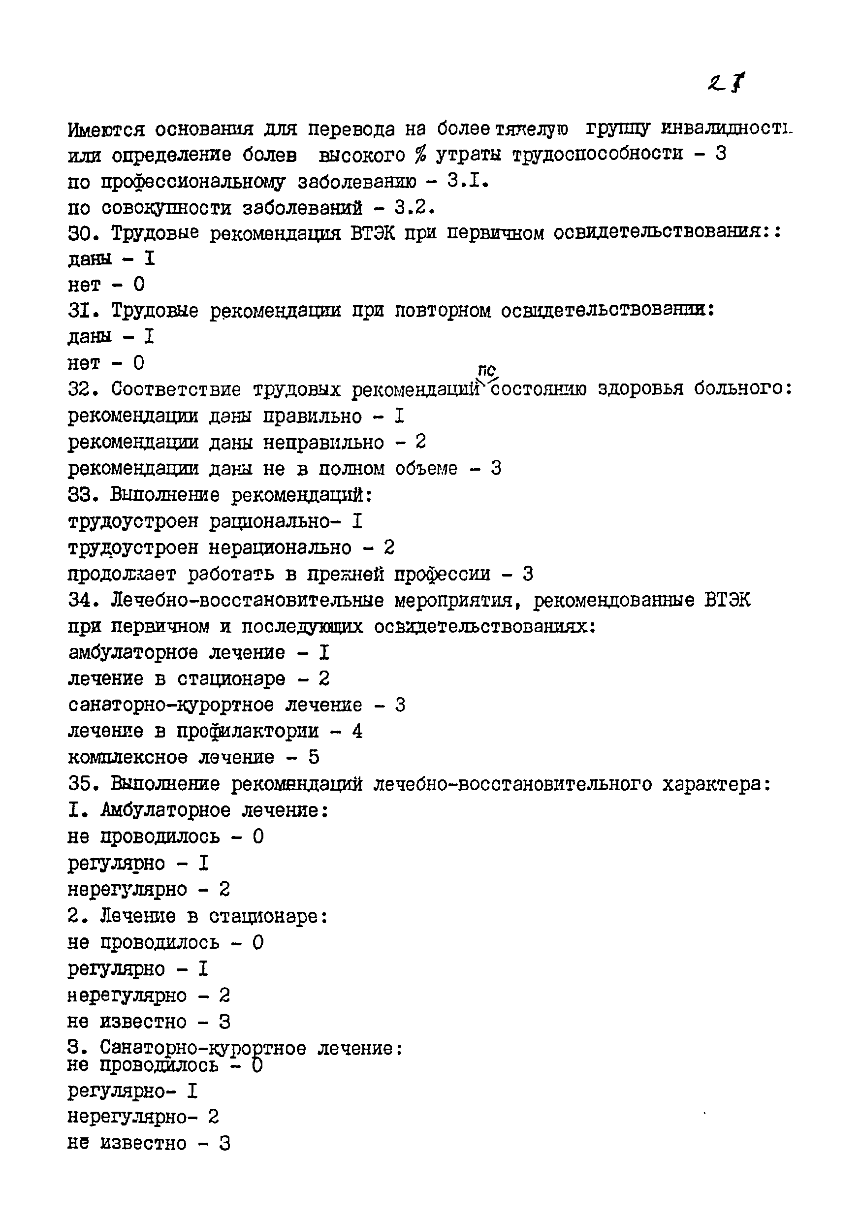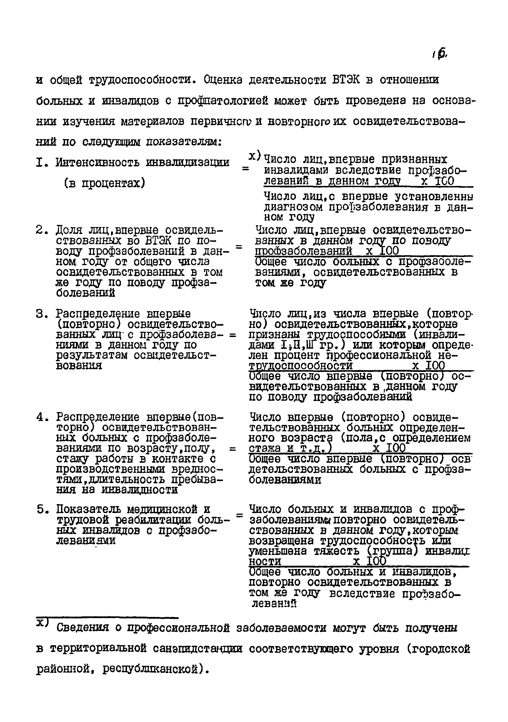 | Оглавление: | I. Общие положения II. Этапы статистического исследования инвалидности III. Источники получения информации об инвалидизации и контингентах инвалидов IV. Расчет основных показателей, характеризующих инвалидность от профзаболеваний V. Основные статистические показатели, характеризующие деятельность ВТЭК в отношении больных и инвалидов с профзаболеваниями VI. Статистическая оценка достоверности результатов выборочного исследования VII. Особенности социально-гигиенического анализа результатов изучения инвалидности от профзаболеваний Приложение 1 Карта для изучения инвалидности от профессиональных заболеваний по материалам ВТЭК и оценки экспертной и реабилитационной деятельности ВТЭК в отношении этого контингента инвалидов Приложение 2 Карта для изучения контингентов инвалидов вследствие профессионального заболевания, состоящих на учете в отделах социального обеспечения Приложение 3 Анкета для изучения субъективной оценки условий труда, семейно-бытовых условий и медицинской помощи инвалидам от профзаболеваний Приложение 4 Анкета для оценки уровня удовлетворенности характером профессии и видом работы при трудоустройстве инвалида Приложение 5 Результаты экспертной оценки реабилитационной деятельности ВТЭК в отношении больных с профзаболеваниями Приложение 6 Результаты экспертной оценки деятельности ВТЭК по экспертизе трудоспособности больных и инвалидов с профзаболеваниями |