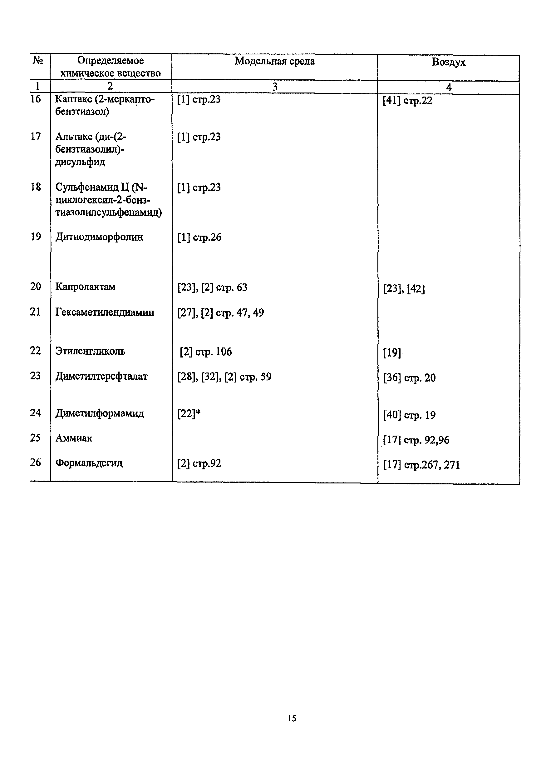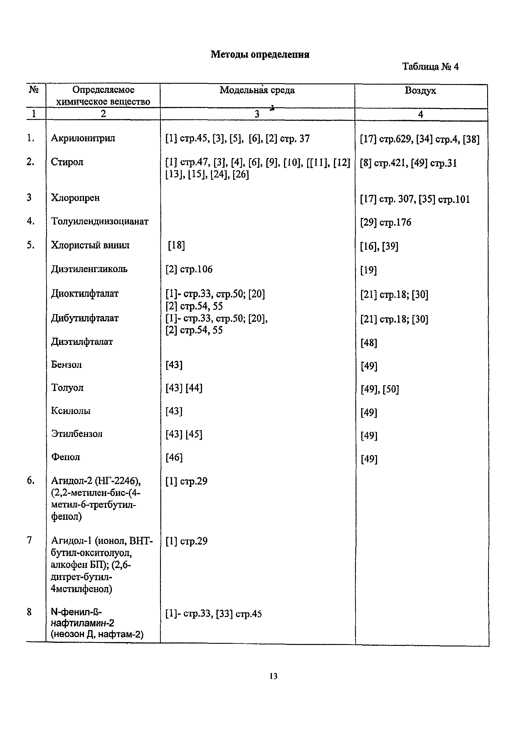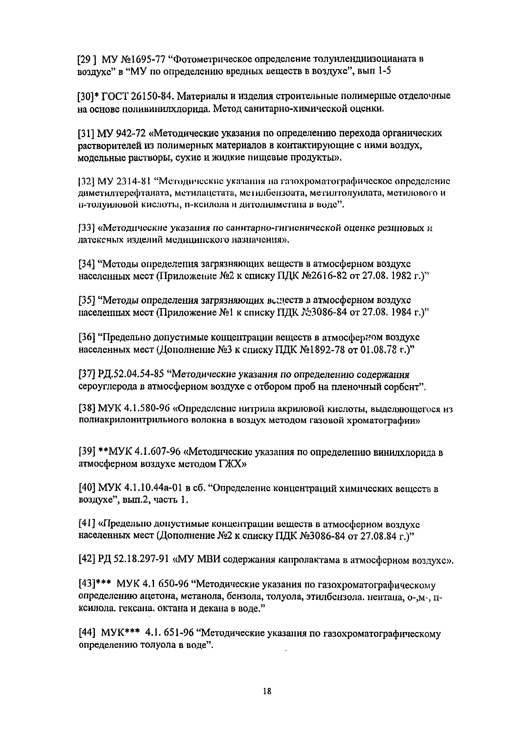 | | Нормативные ссылки: |   ГОСТ 26150-84 «Материалы и изделия строительные полимерные отделочные на основе поливинилхлорида. Метод санитарно-химической оценки»  Федеральный закон 52-ФЗ «О санитарно-эпидемиологическом благополучии населения» ГОСТ 22648-77 «Пластмассы. Методы определения гигиенических показателей» Приказ 325 «О санитарно-эпидемиологической экспертизе продукции»  МУК 2.3.3.052-96 «Санитарно-химическое исследование изделий из полистирола и сополимеров стирола» ГОСТ 15820-82 «Полистирол и сополимеры стирола. Газохроматографический метод определения остаточных мономеров и неполимеризующихся примесей» ГОСТ 25737-91 «Пластмассы. Гомополимеры и сополимеры винилхлорида. Определение остаточного мономера винилхлорида. Газохроматографический метод»  ГОСТ 25779-90 «Игрушки. Общие требования безопасности и методы контроля»  РД 52.04.186-89 «Руководство по контролю загрязнения атмосферы» Инструкция 880-71 «Инструкция по санитарно-химическому исследованию изделий, изготовленных из полимерных и других синтетических материалов, предназначенных для контакта с пищевыми продуктами»  МУК 4.1.598-96 «Методические указания по газохроматографическому определению ароматических, серосодержащих, галогеносодержащих веществ, метанола, ацетона и ацетонитрила в атмосферном воздухе»  МУК 4.1.607-96 «Методические указания по определению винилхлорида в атмосферном воздухе методом газожидкостной хроматографии»  МУК 4.1.611-96 «Методические указания по газохроматографическому определению диметилфталата в атмосферном воздухе»  МУК 4.1.613-96 «Методические указания по газохроматографическому определению диэтиленгликоля в атмосферном воздухе»  МУК 4.1.637-96 «Методические указания по газохроматографическому определению толуола в атмосферном воздухе»  МУК 4.1.647-96 «Методические указания по газохроматографическому определению фенола в воде»  МУК 4.1.649-96 «Методические указания по хромато-масс-спектрометрическому определению летучих органических веществ в воде»  МУК 4.1.650-96 «Методические указания по газохроматографическому определению ацетона, метанола, бензола, толуола, этилбензола, пентана, о-, м-, п-ксилола, гексана, октана и декана в воде»  МУК 4.1.651-96 «Методические указания по газохроматографическому определению толуола в воде»  МУК 4.1.652-96 «Методические указания по газохроматографическому определению этилбензола в воде»  МУК 4.1.658-96 «Методические указания по газохроматографическому определению акрилонитрила в воде» МУ 1695-77 «Методические указания на фотометрическое определение толуилендиизоцианата в воздухе» МУ 2314-81 «Методические указания на газохроматографическое определение диметилтерефталата, метилацетата, метилбензоата, метилтолуилата, метилового и п-толуилового спиртов, п-толуилового альдегида, п-толуиловой кислоты, п-ксилола и дитолилметана в воздухе»  МУК 4.1.739-99 «Хромато-масс-спектрометрическое определение бензола, толуола, хлорбензола, этилбензола, о-ксилола, стирола в воде»  МУК 4.1.738-99 «Хромато-масс-спектрометрическое определение фталатов и органических кислот в воде» МУК 4.1.580-96 «Определение нитрила акриловой кислоты, выделяющегося из полиакрилонитрильного волокна в воздух, методом газовой хроматографии» МУ 942-72 «Методическое указание по определению перехода органических растворителей из полимерных материалов в контактирующие с ними воздух, мо