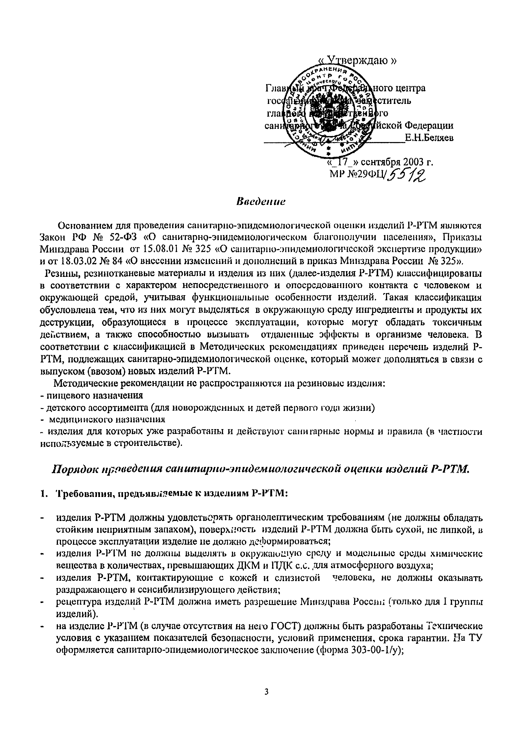 | | Утверждён: | 17.09.2003 Заместитель Главного Государственного санитарного врача Российской Федерации (29ФЦ/5512)