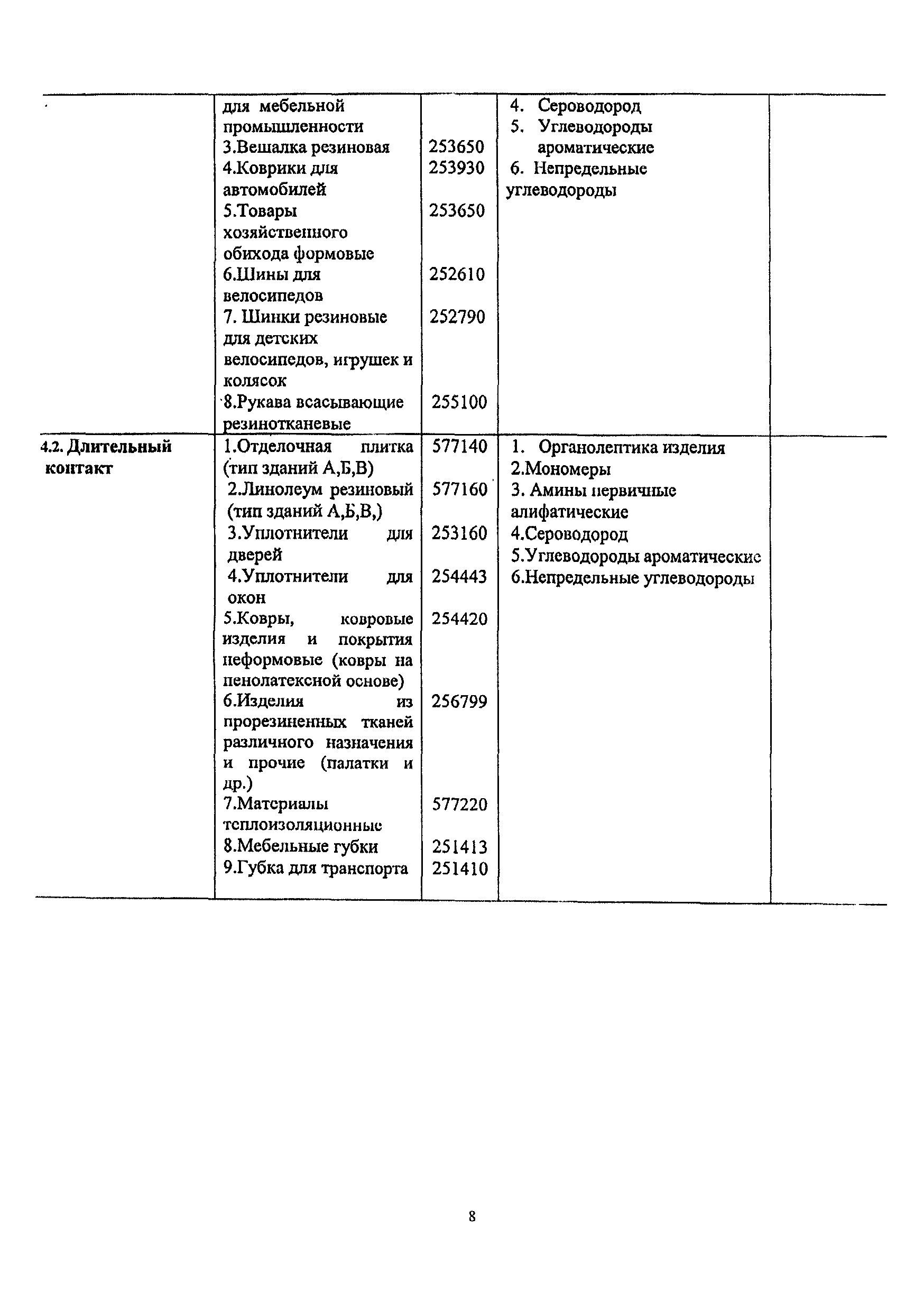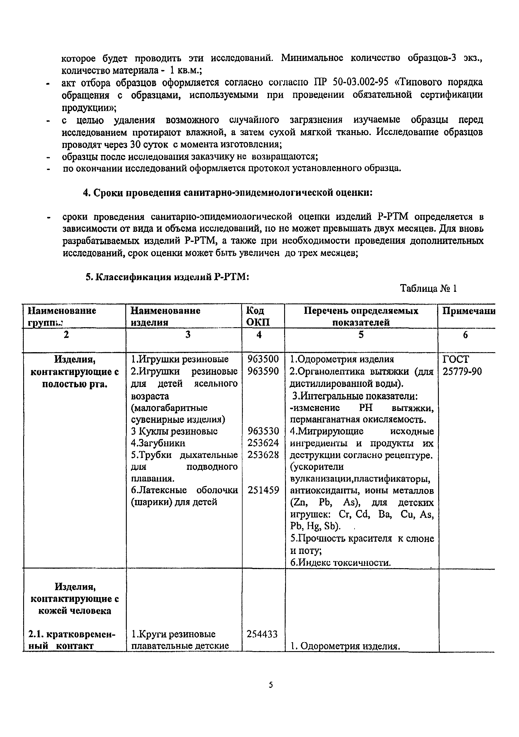 - изделия для которых уде разработаны и действуют санитарные нормы и правила (в частности используемые в строительстве). | | Оглавление: | 1. Требования, предъявляемые к изделиям Р-РТМ 2. Перечень документов, предъявляемых для проведения санитарно-эпидемиологической оценки изделий Р-РТМ 3. Порядок направления образцов на исследование 4. Сроки проведения санитарно-эпидемиологической оценки 5. Классификация изделий Р-РТМ 6. Условия моделирования исследуемых изделий по группам Нормативная документация на методы испытаний | | Разработан: | Федеральный центр госсанэпиднадзора Минздрава России Государственное унитарное предприятие научно-исследовательского института резиновых и латексных изделий