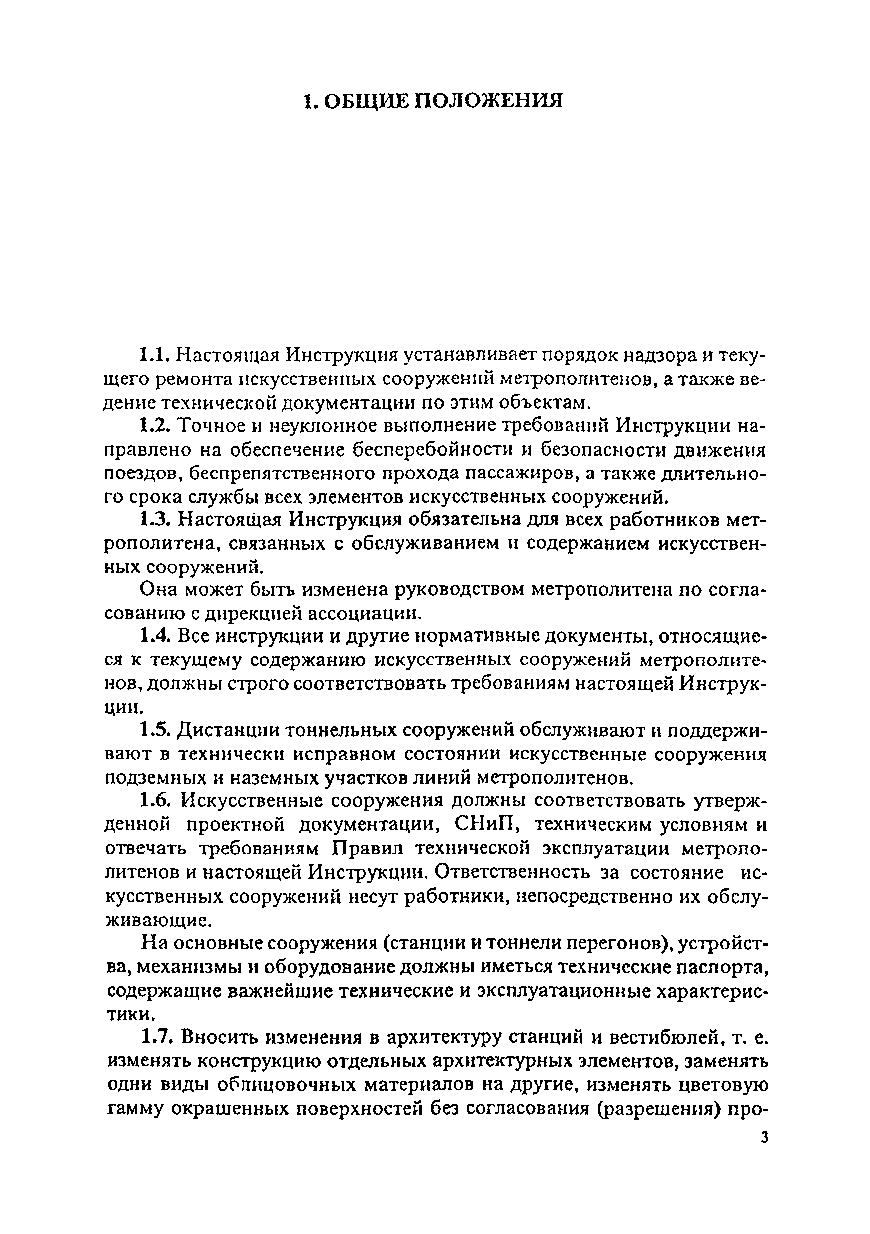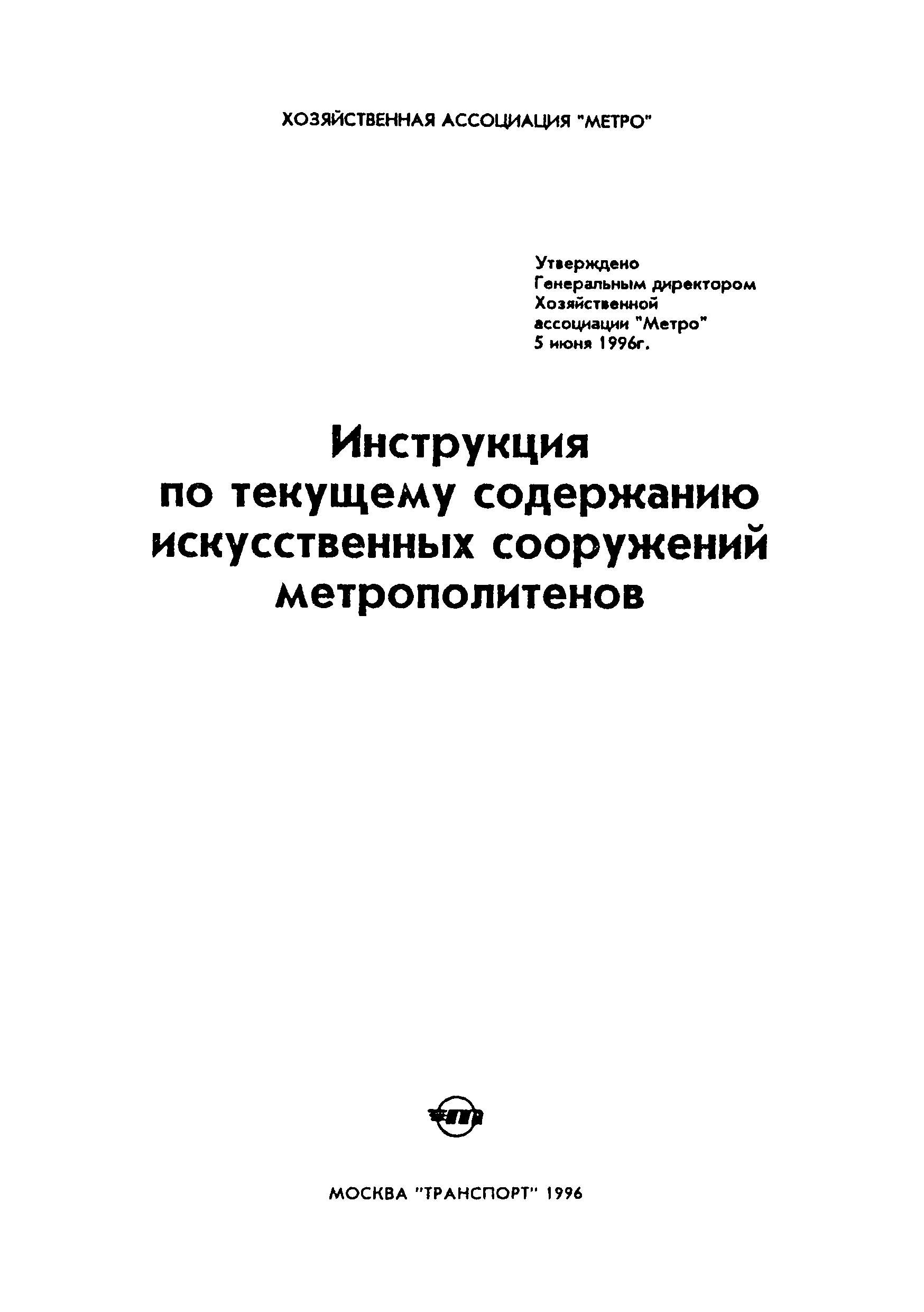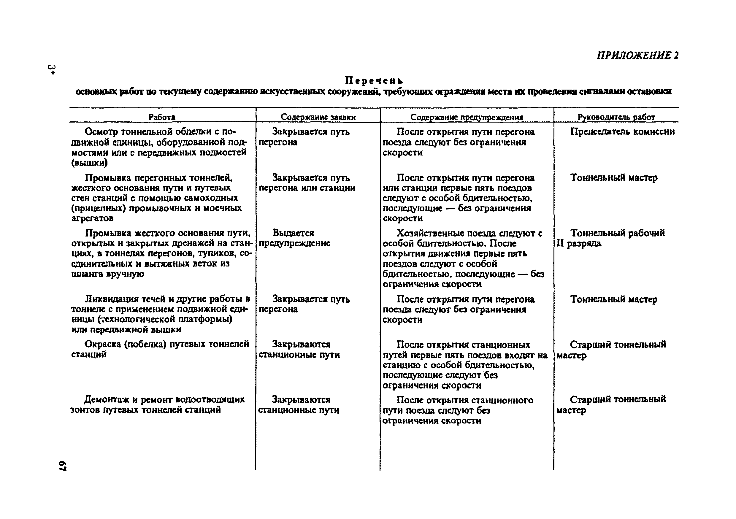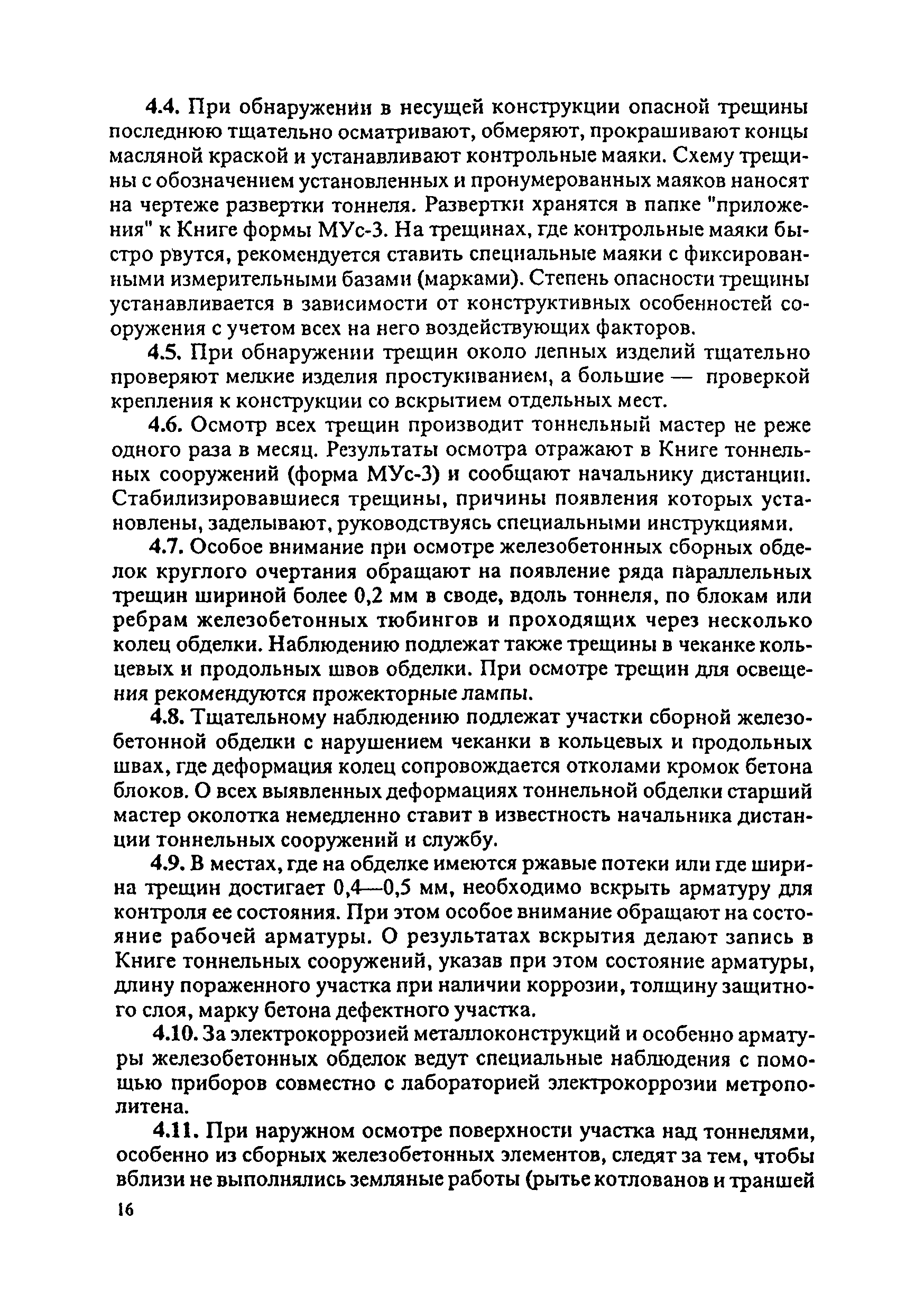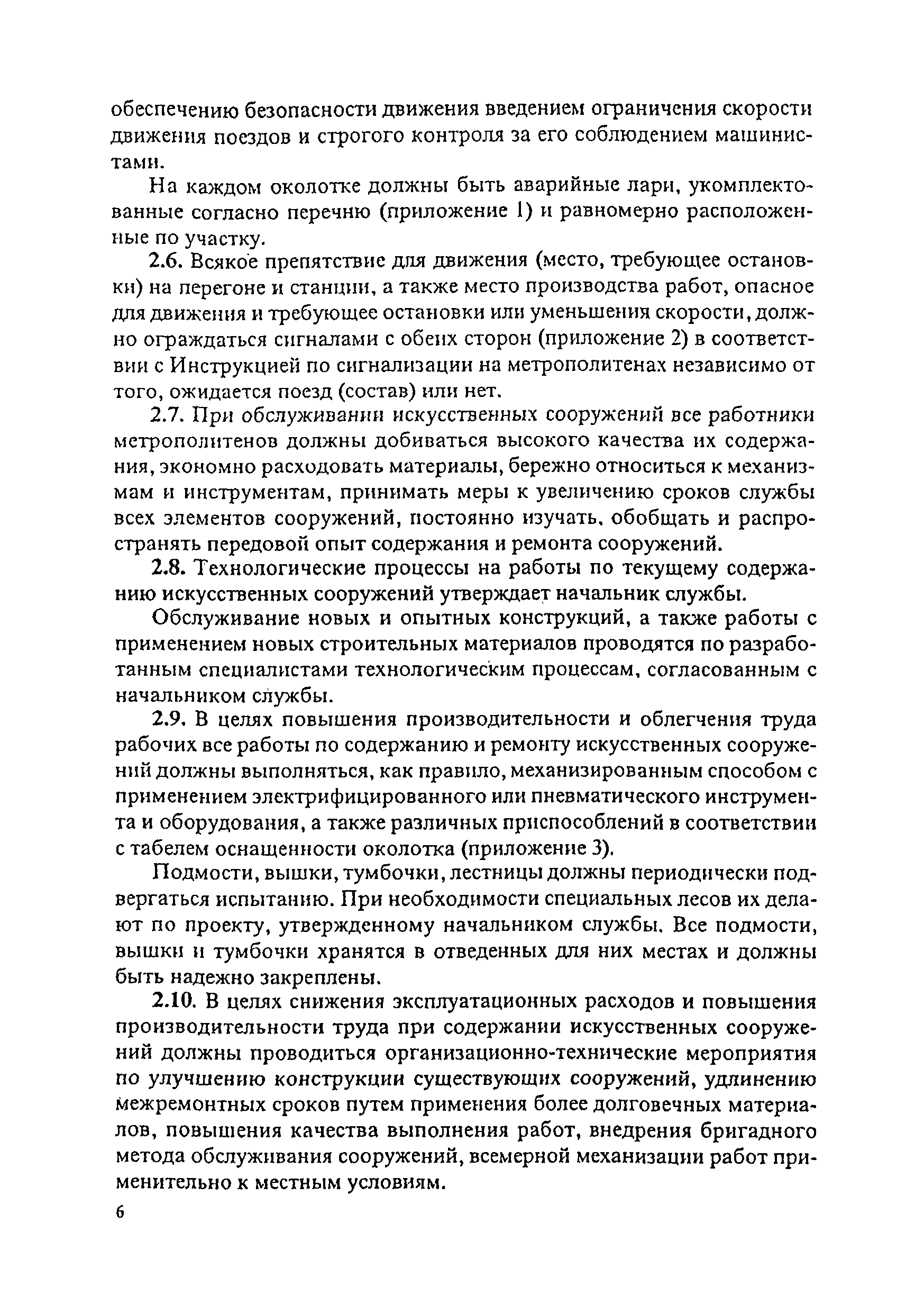 Инструкция по текущему содержанию искусственных сооружений метрополитенов| Статус: | действует | | Название рус.: | Инструкция по текущему содержанию искусственных сооружений метрополитенов | | Дата добавления в базу: | 01.01.2018 | | Дата актуализации: | 01.01.2021 | | Область применения: | Инструкция устанавливает порядок надзора и текущего ремонта искусственных сооружений метрополитенов, а также ведение технической документации по этим объектам. | | Оглавление: | 1. Общие сведения 2. Организация содержания искусственных сооружения метрополитенов 3. Надзор за состоянием искусственных сооружений 4. Осмотр тоннельных сооружений 5. Осмотр наземных сооружений 6. Осмотр мостовых переходов 7. Текущий ремонт и уход за тоннельными сооружениями 8. Текущий ремонт и уход за наземными сооружениями 9. Содержание коллекторов рек 10. Прочие работы по обслуживанию и текущему ремонту искусственных сооружений 11. Текущий ремонт и уход за мостовыми переходами Приложение 1. Перечень аварийного запаса материалов, инструмента, инвентаря на околотке дистанции тоннельных сооружений метрополитена Приложение 2. Перечень основных работ по текущему содержанию искусственных сооружений, требующих ограждения места их проведения сигналами остановки Приложение 3. Табель оснащенности околотка текущего содержания тоннельных сооружений средствами механизации, оборудованием, инструментом, инвентарем и транспортом Приложение 4. Перечень работ по текущему содержанию искусственных сооружений метрополитенов н их периодичность | | Утверждён: | 05.06.1996 Хозяйственная ассоциация Метро