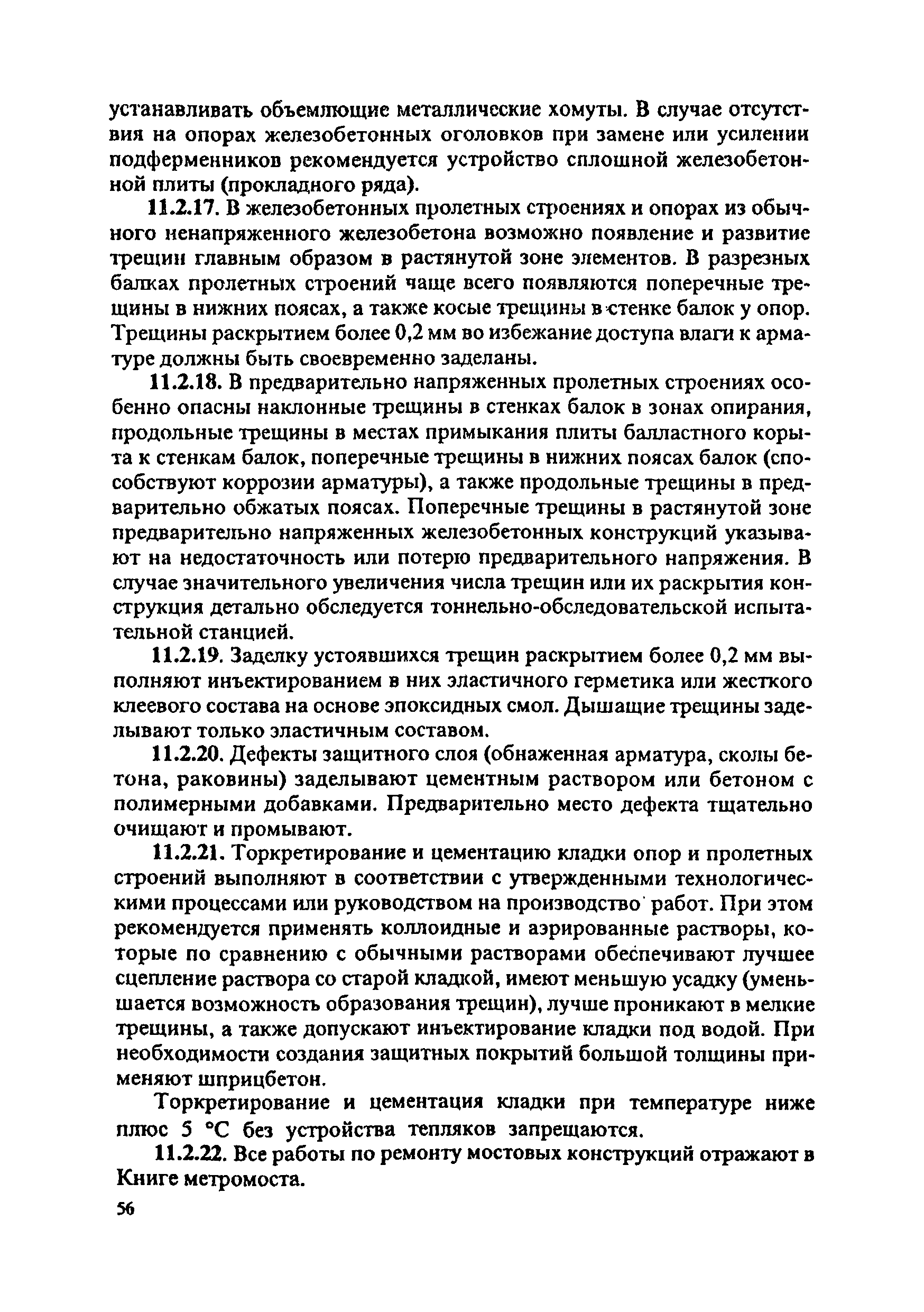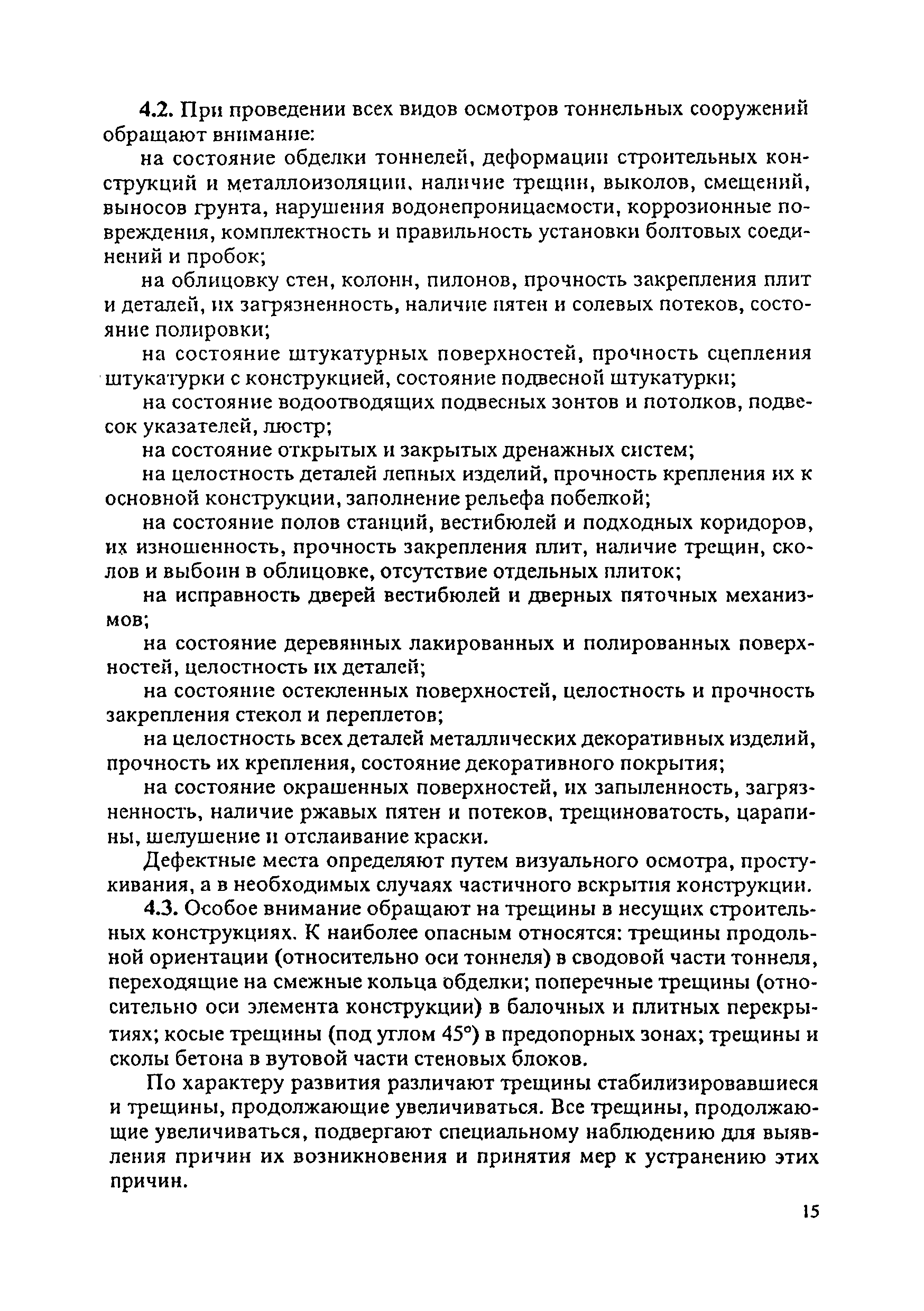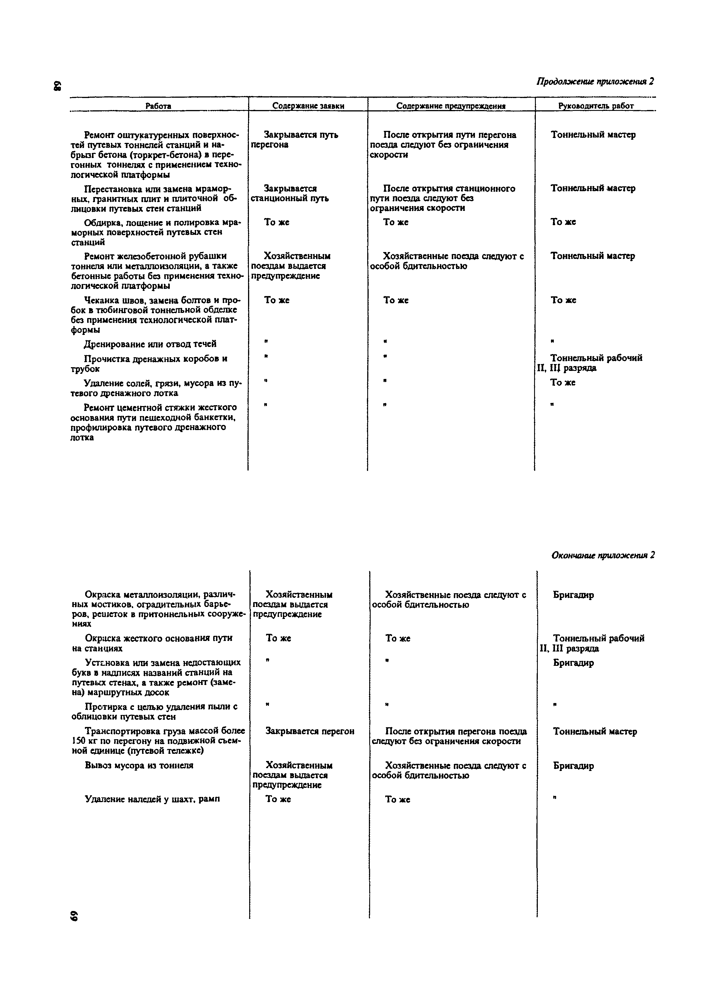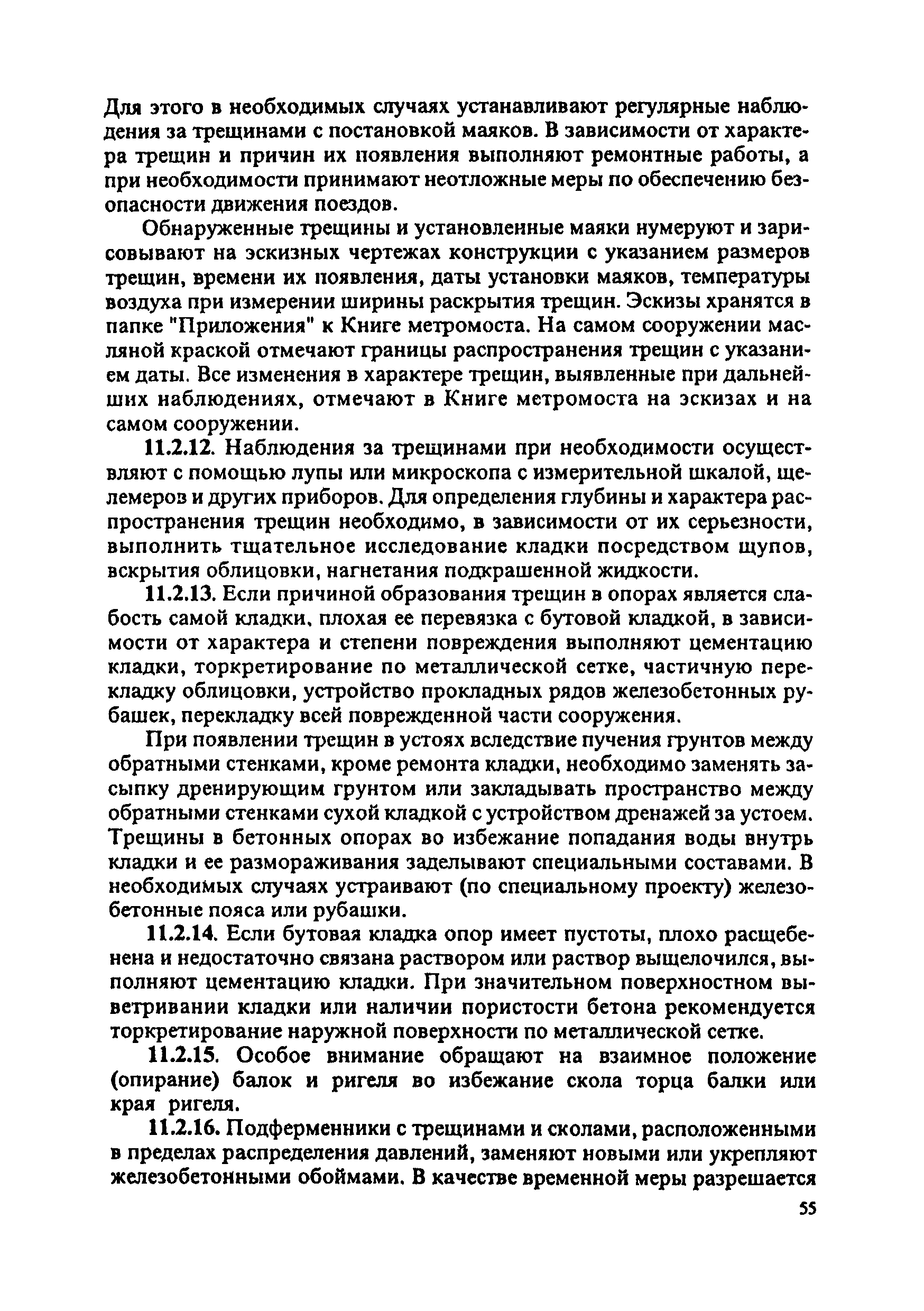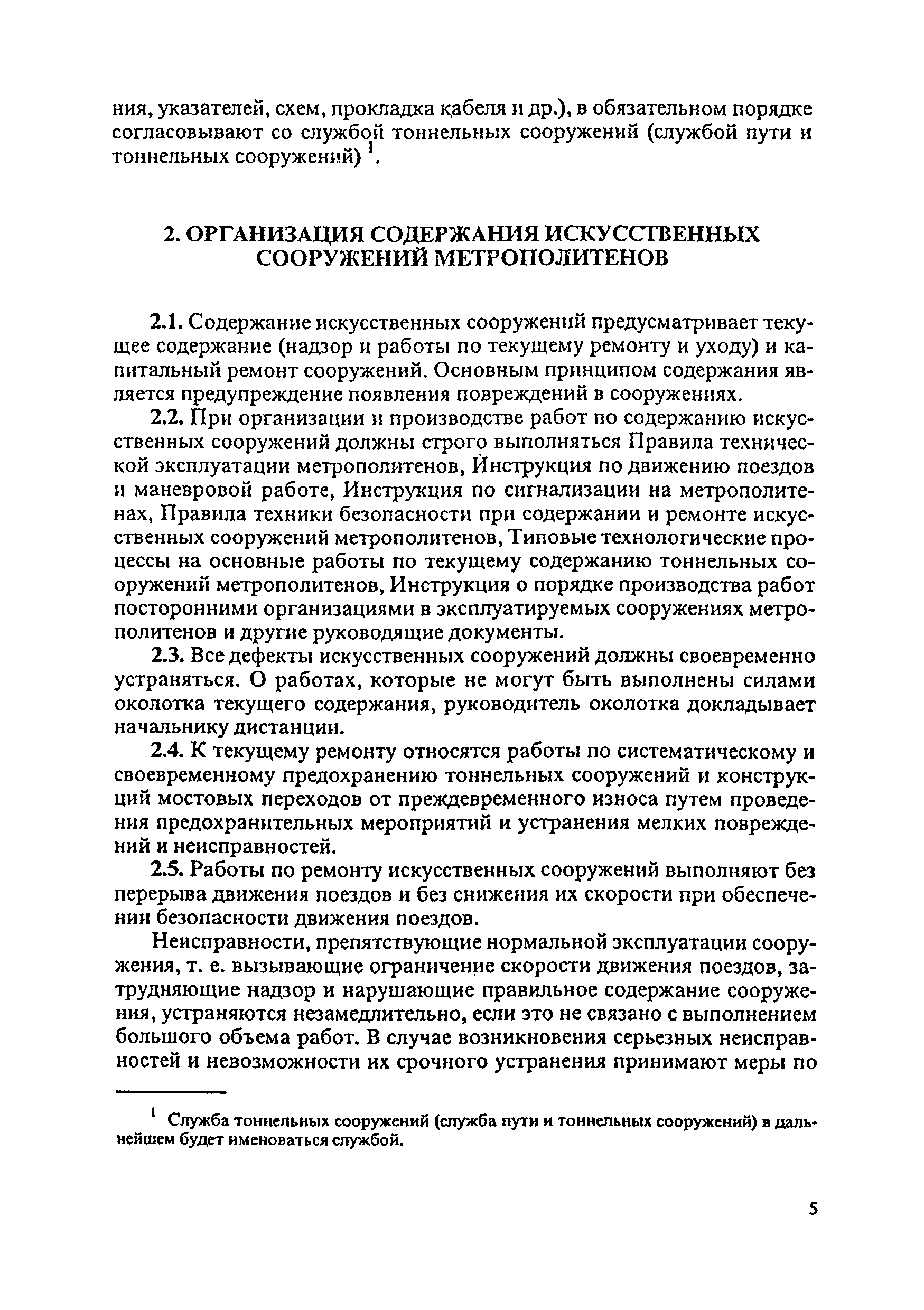 Инструкция по текущему содержанию искусственных сооружений метрополитенов| Статус: | действует | | Название рус.: | Инструкция по текущему содержанию искусственных сооружений метрополитенов | | Дата добавления в базу: | 01.01.2018 | | Дата актуализации: | 01.01.2021 | | Область применения: | Инструкция устанавливает порядок надзора и текущего ремонта искусственных сооружений метрополитенов, а также ведение технической документации по этим объектам. | | Оглавление: | 1. Общие сведения 2. Организация содержания искусственных сооружения метрополитенов 3. Надзор за состоянием искусственных сооружений 4. Осмотр тоннельных сооружений 5. Осмотр наземных сооружений 6. Осмотр мостовых переходов 7. Текущий ремонт и уход за тоннельными сооружениями 8. Текущий ремонт и уход за наземными сооружениями 9. Содержание коллекторов рек 10. Прочие работы по обслуживанию и текущему ремонту искусственных сооружений 11. Текущий ремонт и уход за мостовыми переходами Приложение 1. Перечень аварийного запаса материалов, инструмента, инвентаря на околотке дистанции тоннельных сооружений метрополитена Приложение 2. Перечень основных работ по текущему содержанию искусственных сооружений, требующих ограждения места их проведения сигналами остановки Приложение 3. Табель оснащенности околотка текущего содержания тоннельных сооружений средствами механизации, оборудованием, инструментом, инвентарем и транспортом Приложение 4. Перечень работ по текущему содержанию искусственных сооружений метрополитенов н их периодичность | | Утверждён: | 05.06.1996 Хозяйственная ассоциация Метро