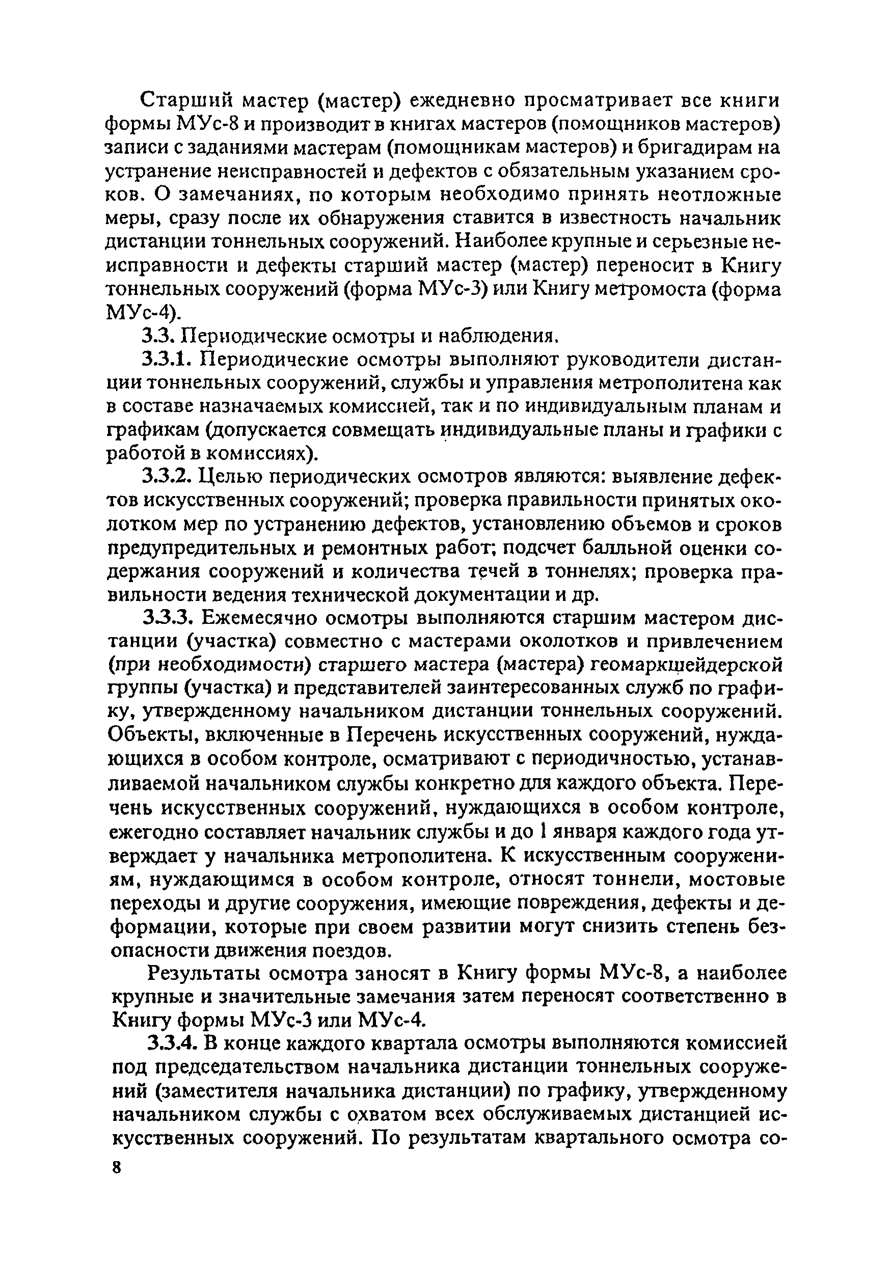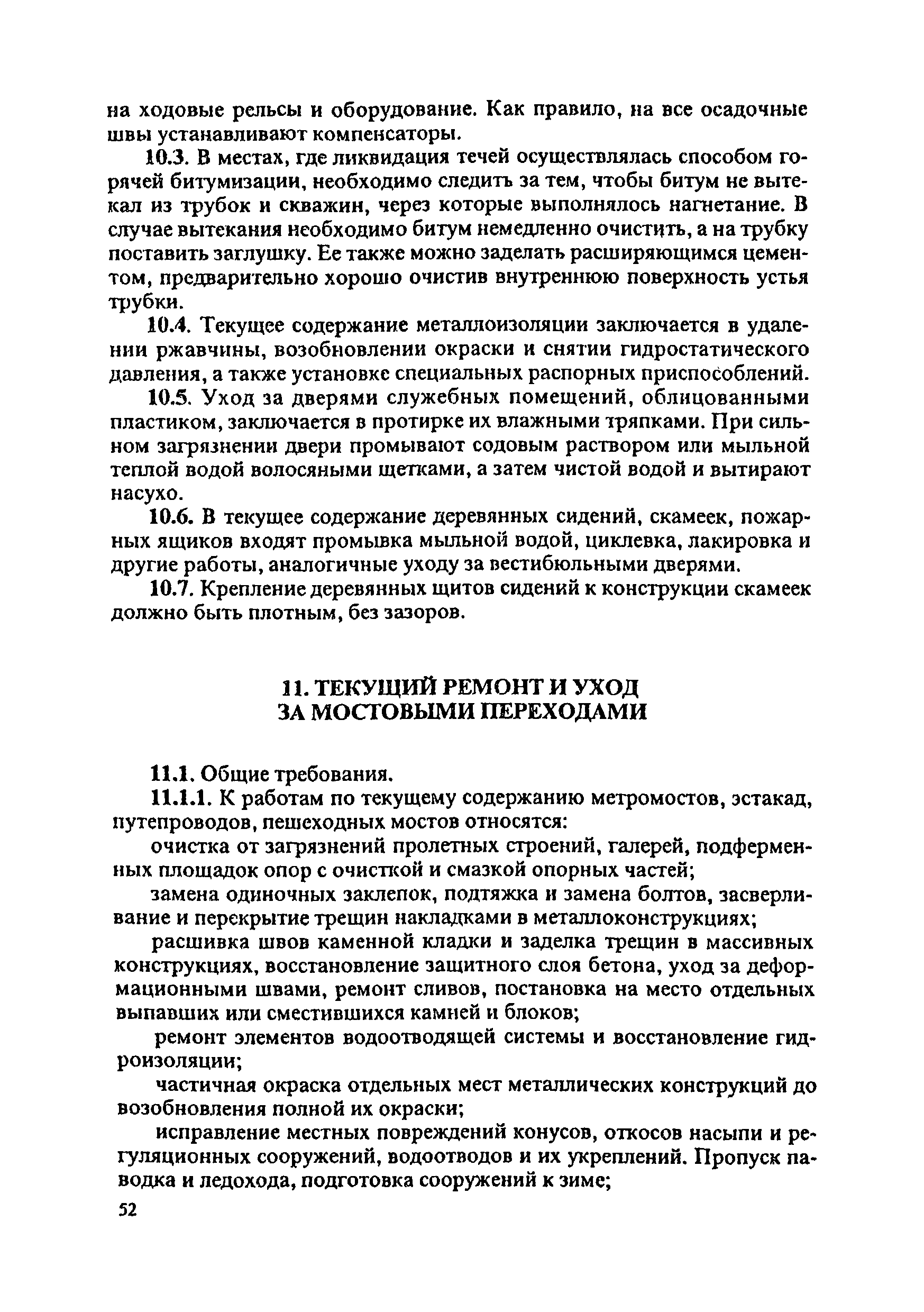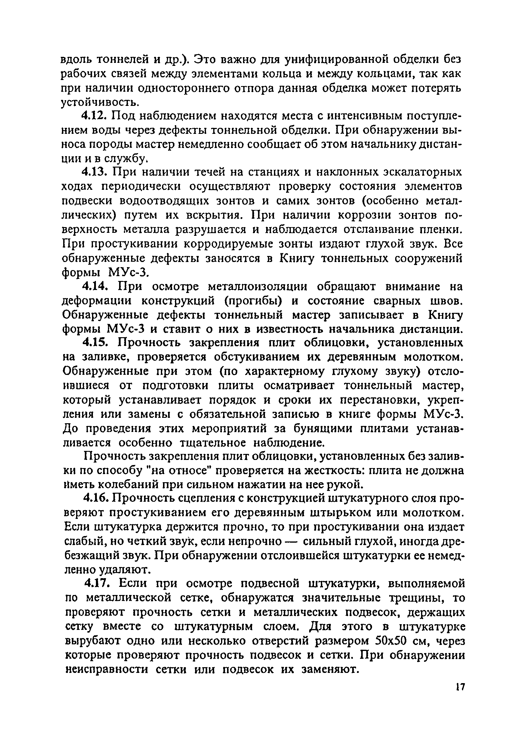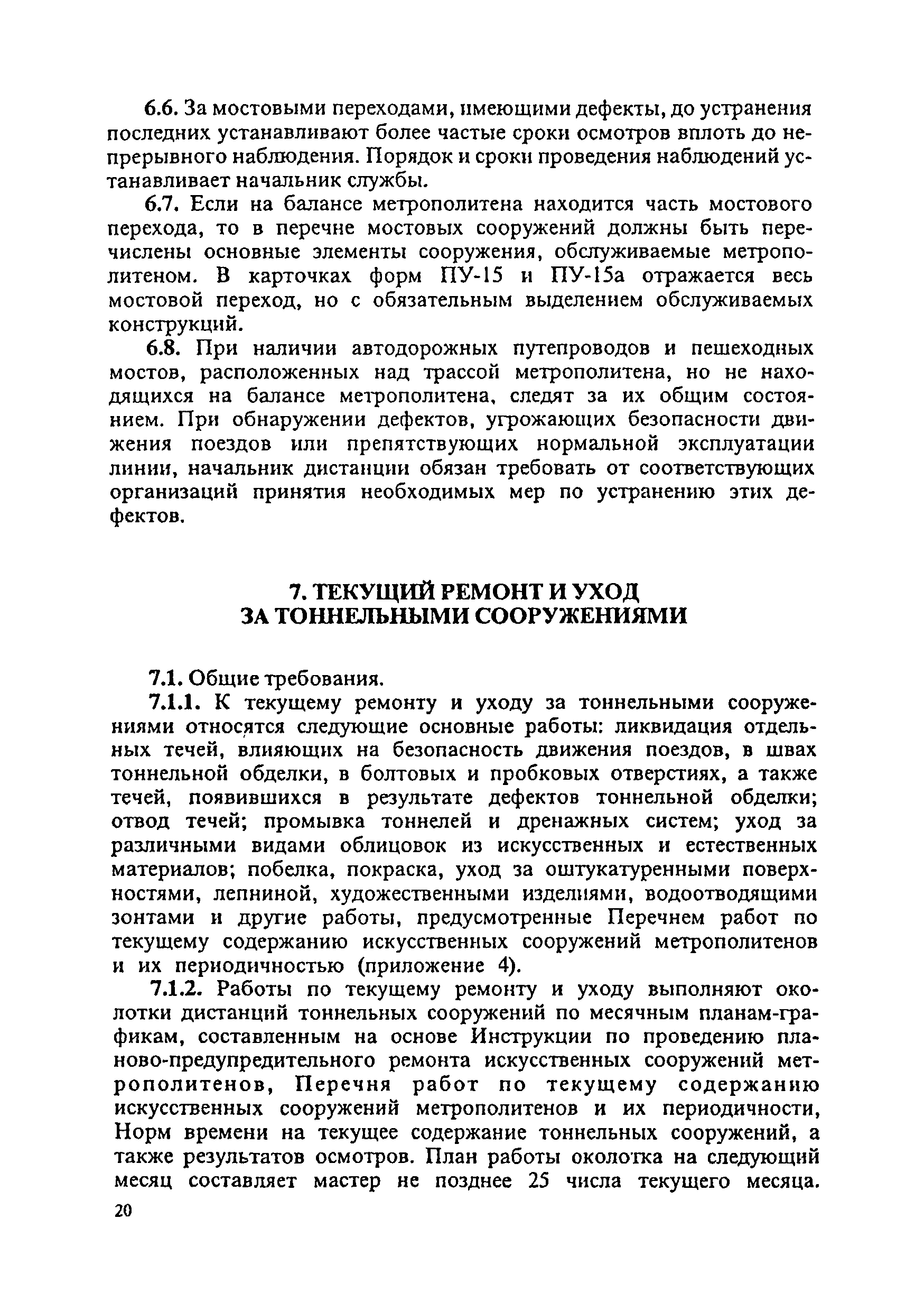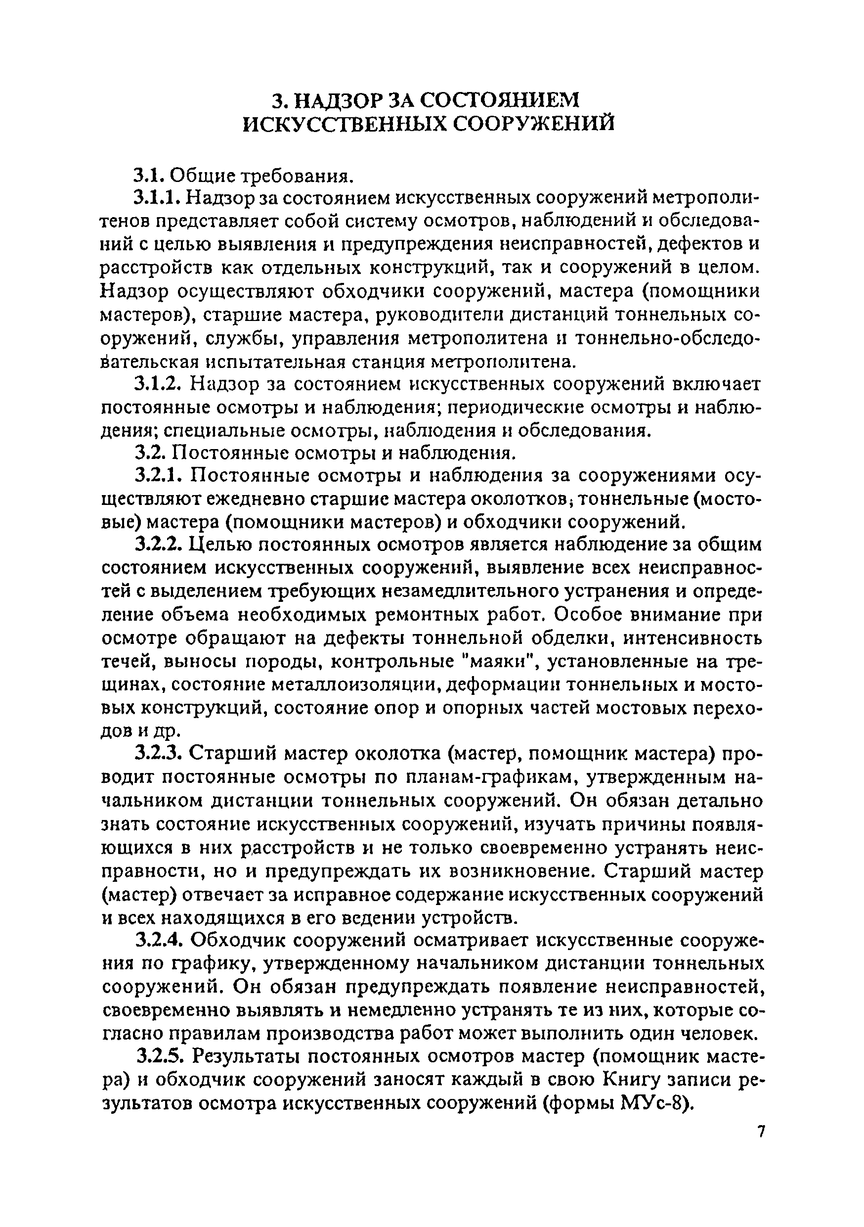 Инструкция по текущему содержанию искусственных сооружений метрополитенов| Статус: | действует | | Название рус.: | Инструкция по текущему содержанию искусственных сооружений метрополитенов | | Дата добавления в базу: | 01.01.2018 | | Дата актуализации: | 01.01.2021 | | Область применения: | Инструкция устанавливает порядок надзора и текущего ремонта искусственных сооружений метрополитенов, а также ведение технической документации по этим объектам. | | Оглавление: | 1. Общие сведения 2. Организация содержания искусственных сооружения метрополитенов 3. Надзор за состоянием искусственных сооружений 4. Осмотр тоннельных сооружений 5. Осмотр наземных сооружений 6. Осмотр мостовых переходов 7. Текущий ремонт и уход за тоннельными сооружениями 8. Текущий ремонт и уход за наземными сооружениями 9. Содержание коллекторов рек 10. Прочие работы по обслуживанию и текущему ремонту искусственных сооружений 11. Текущий ремонт и уход за мостовыми переходами Приложение 1. Перечень аварийного запаса материалов, инструмента, инвентаря на околотке дистанции тоннельных сооружений метрополитена Приложение 2. Перечень основных работ по текущему содержанию искусственных сооружений, требующих ограждения места их проведения сигналами остановки Приложение 3. Табель оснащенности околотка текущего содержания тоннельных сооружений средствами механизации, оборудованием, инструментом, инвентарем и транспортом Приложение 4. Перечень работ по текущему содержанию искусственных сооружений метрополитенов н их периодичность | | Утверждён: | 05.06.1996 Хозяйственная ассоциация Метро