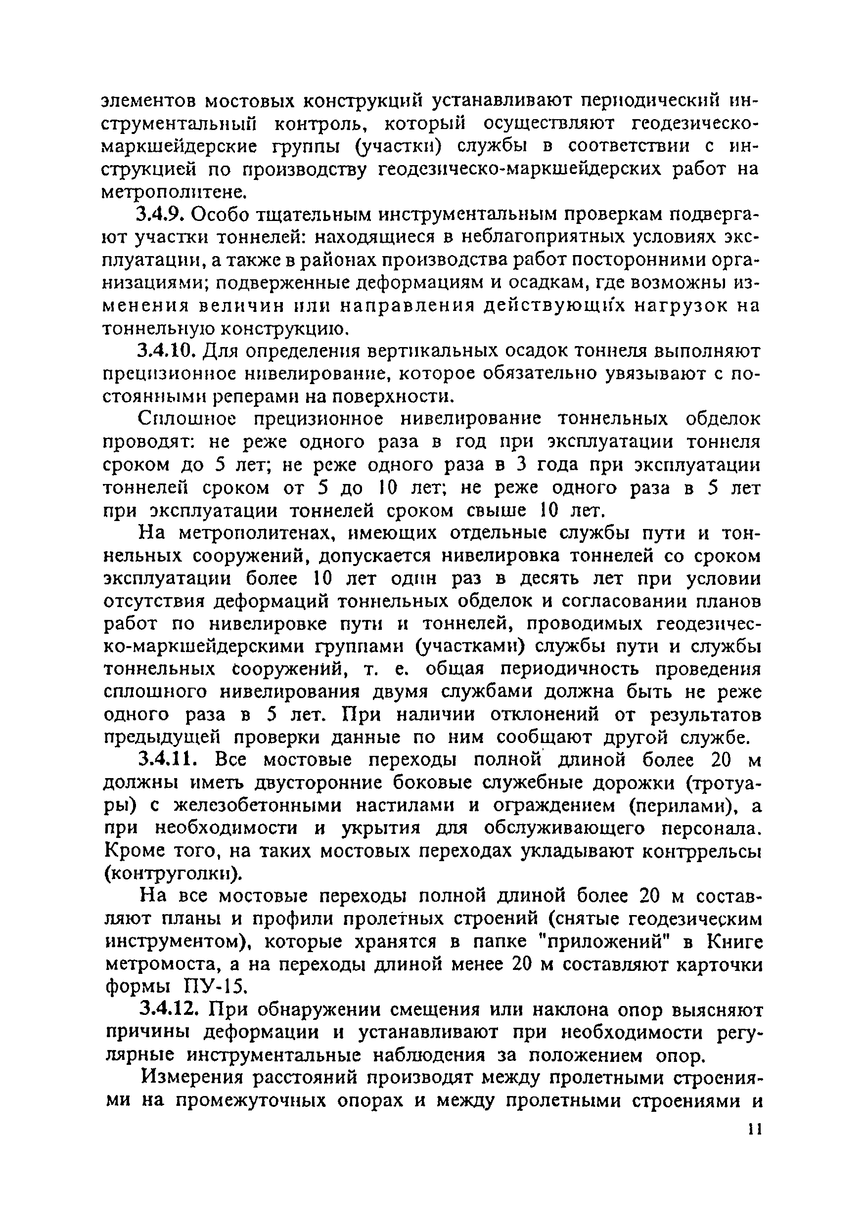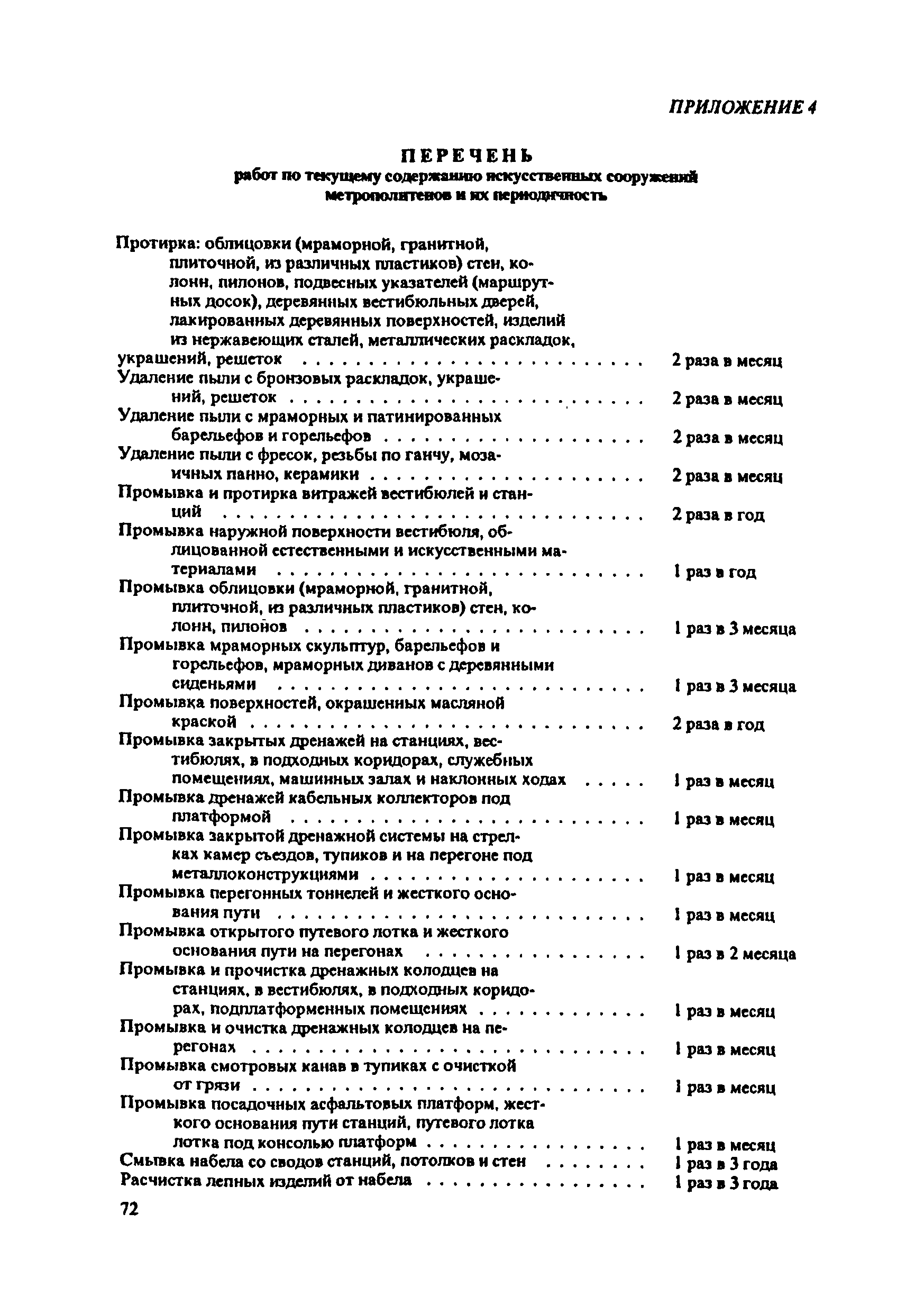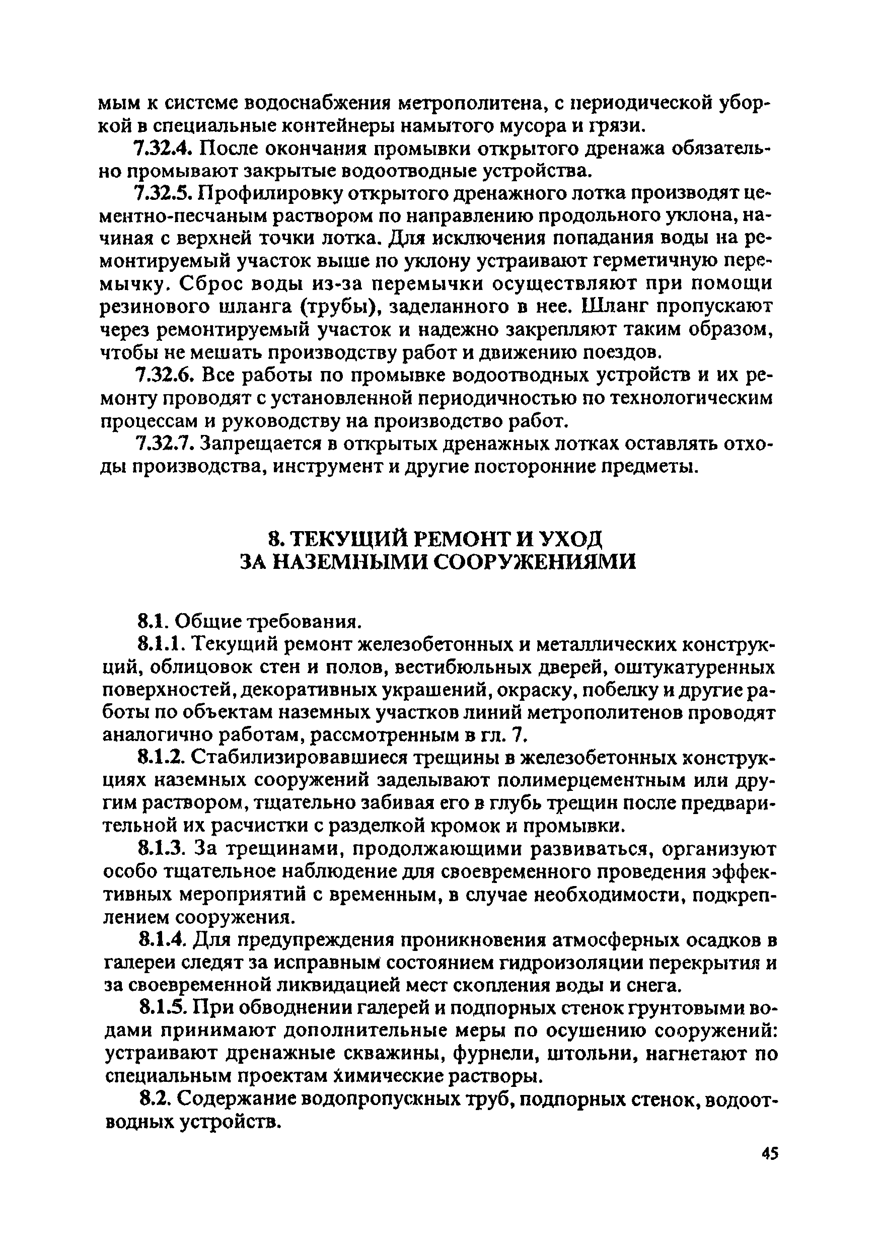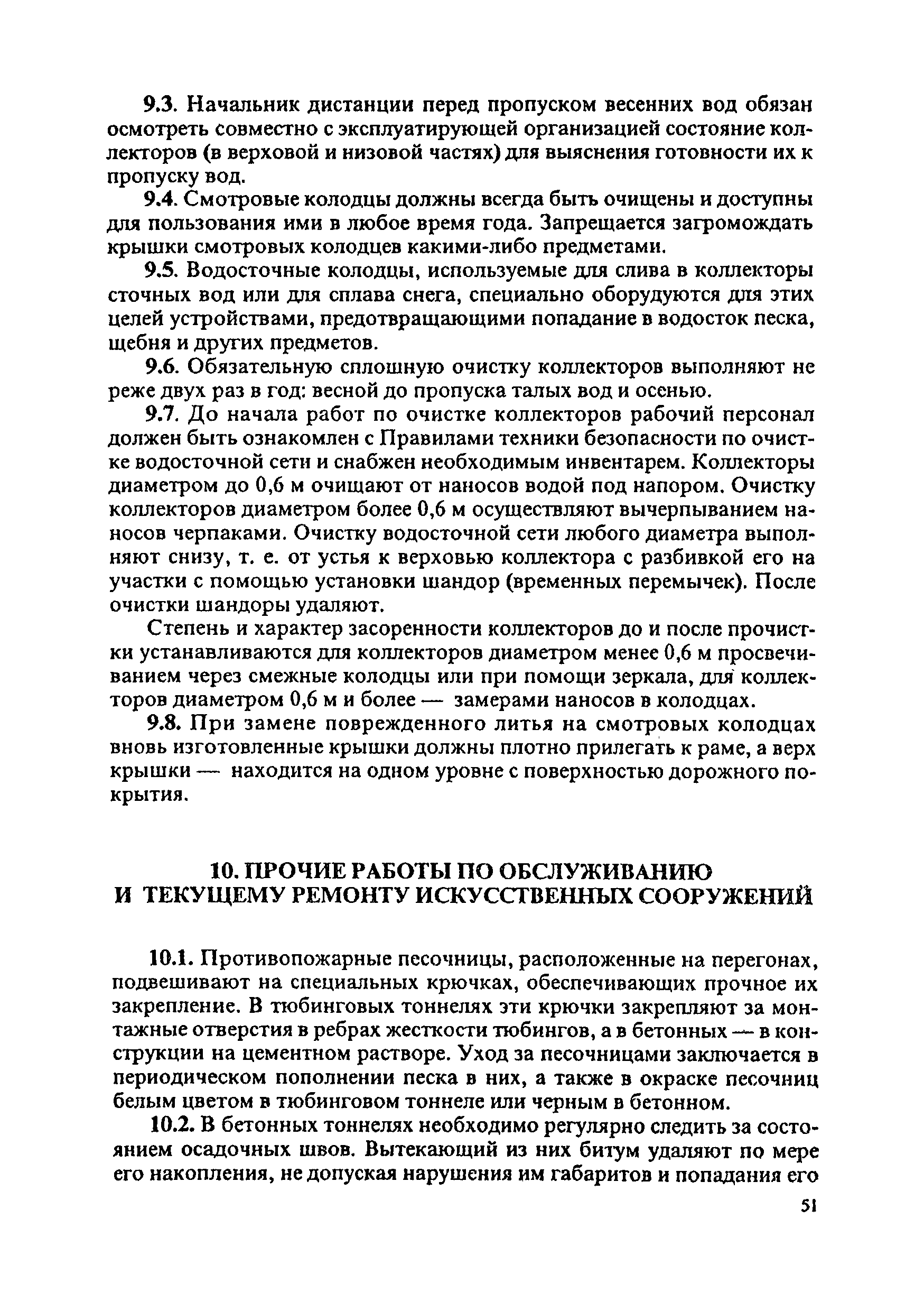 Инструкция по текущему содержанию искусственных сооружений метрополитенов| Статус: | действует | | Название рус.: | Инструкция по текущему содержанию искусственных сооружений метрополитенов | | Дата добавления в базу: | 01.01.2018 | | Дата актуализации: | 01.01.2021 | | Область применения: | Инструкция устанавливает порядок надзора и текущего ремонта искусственных сооружений метрополитенов, а также ведение технической документации по этим объектам. | | Оглавление: | 1. Общие сведения 2. Организация содержания искусственных сооружения метрополитенов 3. Надзор за состоянием искусственных сооружений 4. Осмотр тоннельных сооружений 5. Осмотр наземных сооружений 6. Осмотр мостовых переходов 7. Текущий ремонт и уход за тоннельными сооружениями 8. Текущий ремонт и уход за наземными сооружениями 9. Содержание коллекторов рек 10. Прочие работы по обслуживанию и текущему ремонту искусственных сооружений 11. Текущий ремонт и уход за мостовыми переходами Приложение 1. Перечень аварийного запаса материалов, инструмента, инвентаря на околотке дистанции тоннельных сооружений метрополитена Приложение 2. Перечень основных работ по текущему содержанию искусственных сооружений, требующих ограждения места их проведения сигналами остановки Приложение 3. Табель оснащенности околотка текущего содержания тоннельных сооружений средствами механизации, оборудованием, инструментом, инвентарем и транспортом Приложение 4. Перечень работ по текущему содержанию искусственных сооружений метрополитенов н их периодичность | | Утверждён: | 05.06.1996 Хозяйственная ассоциация Метро