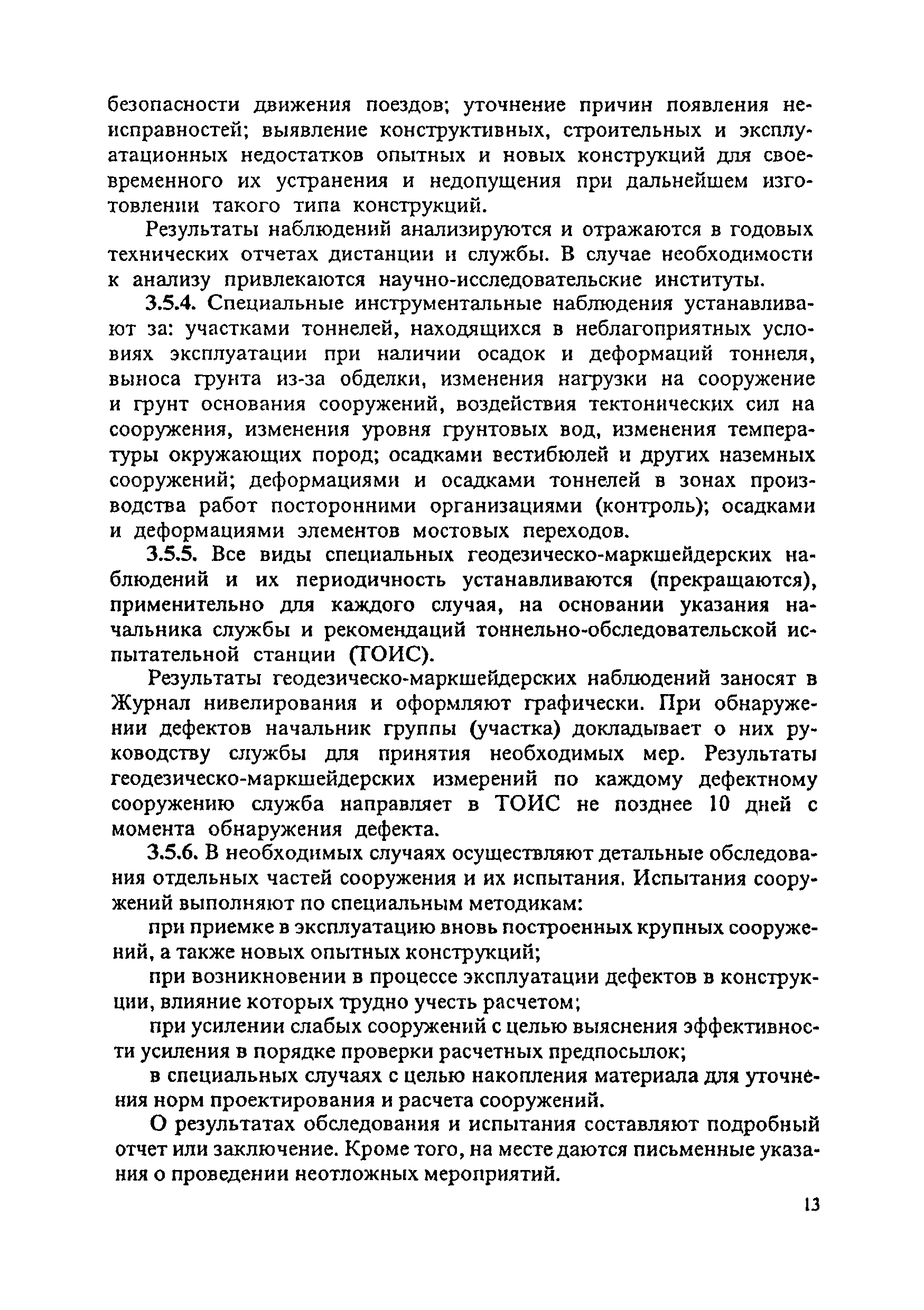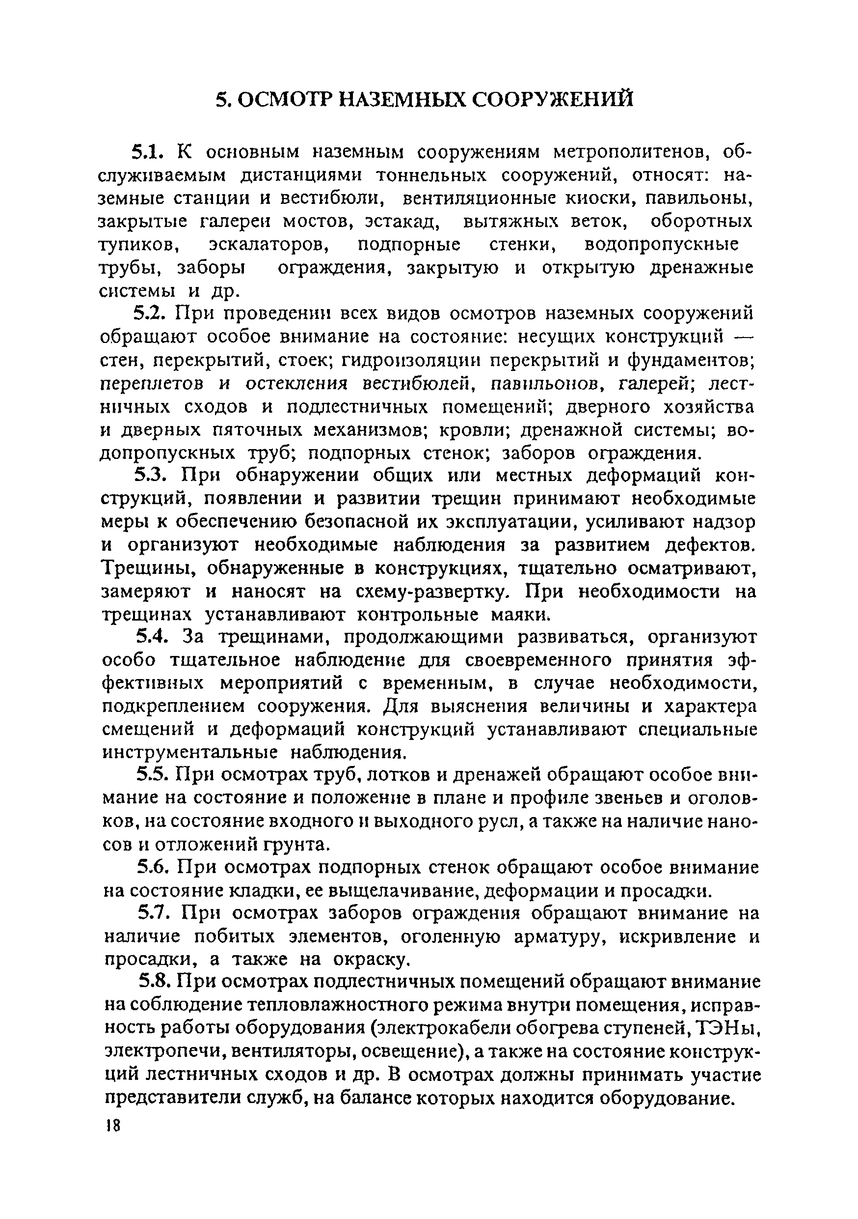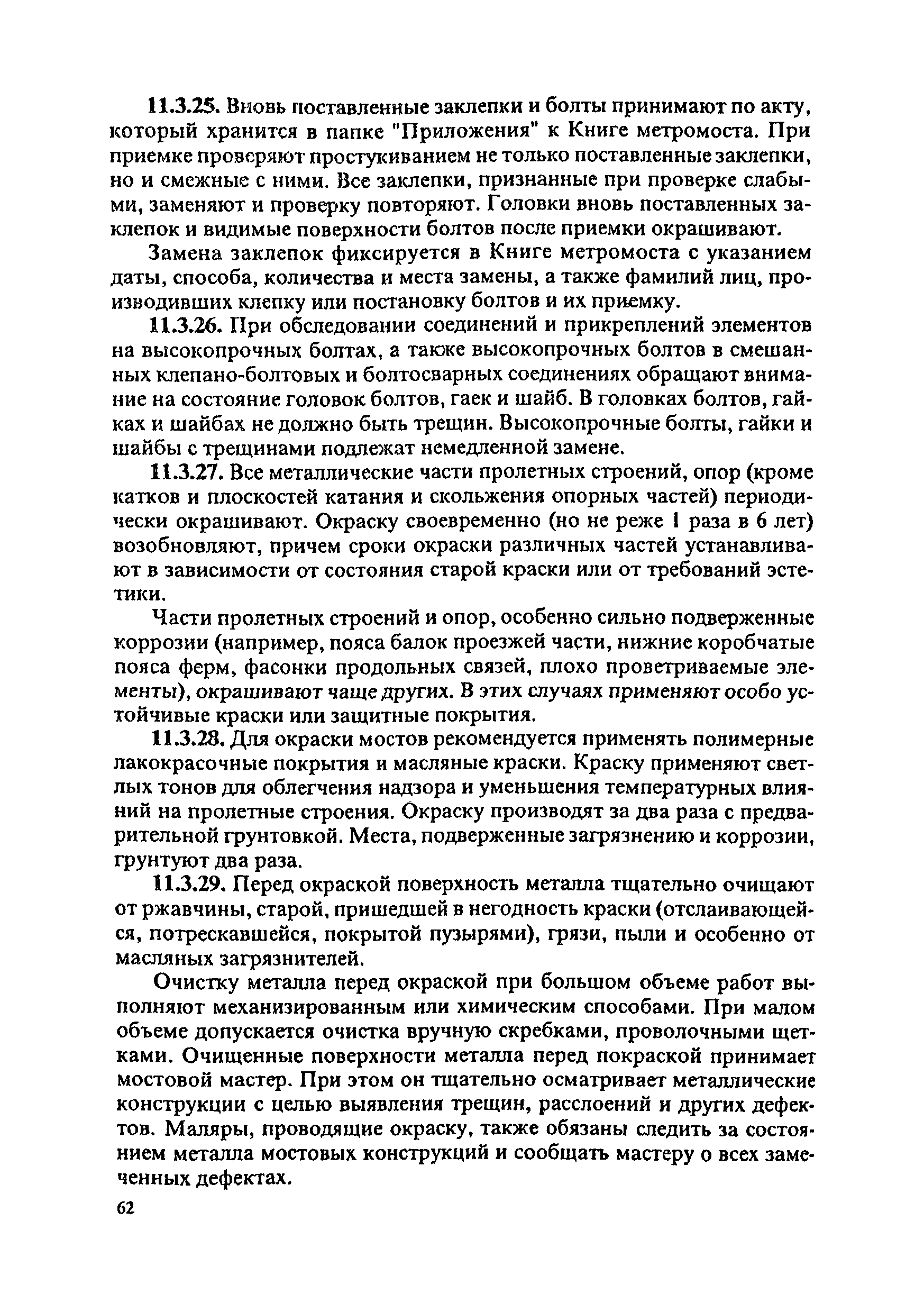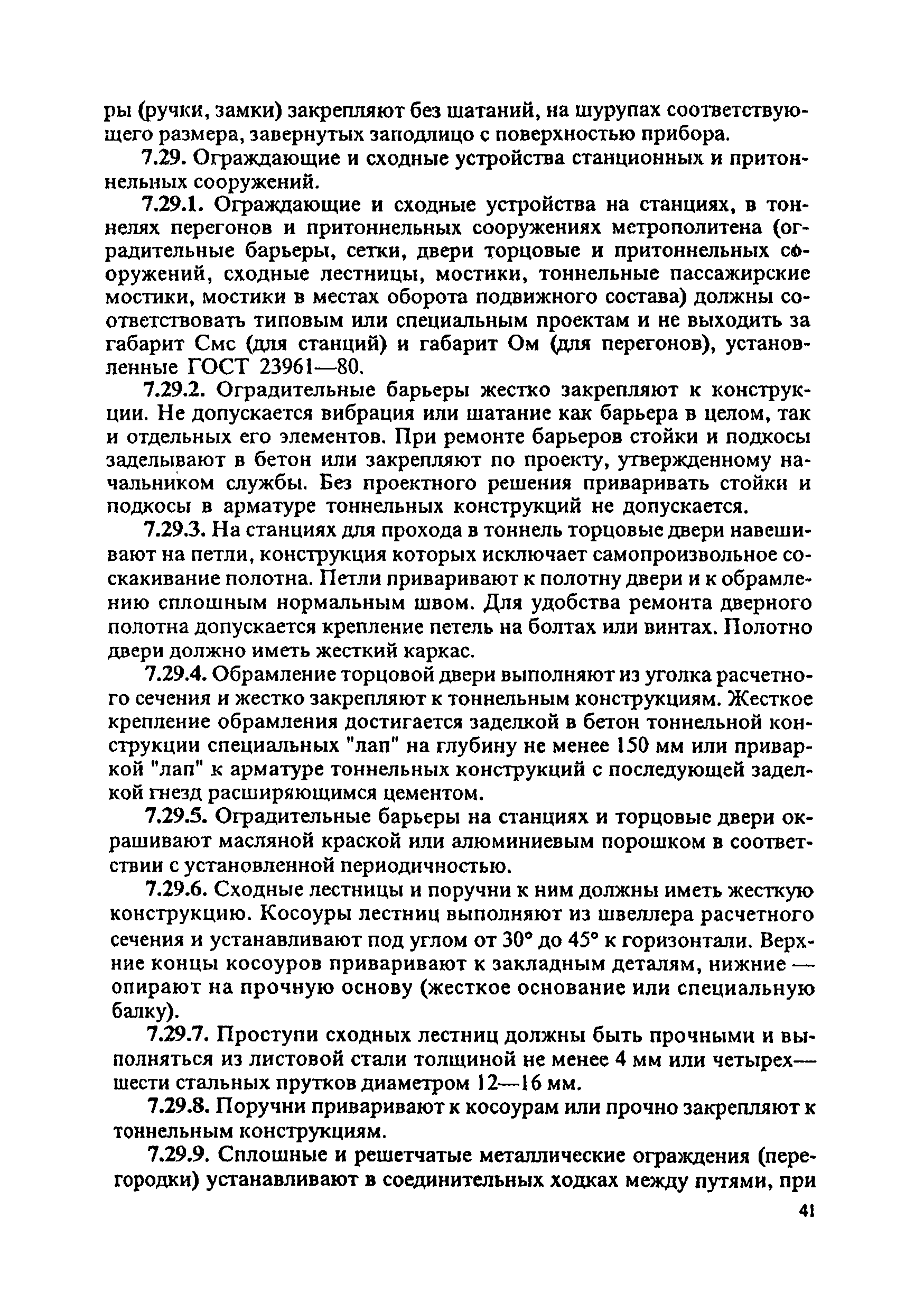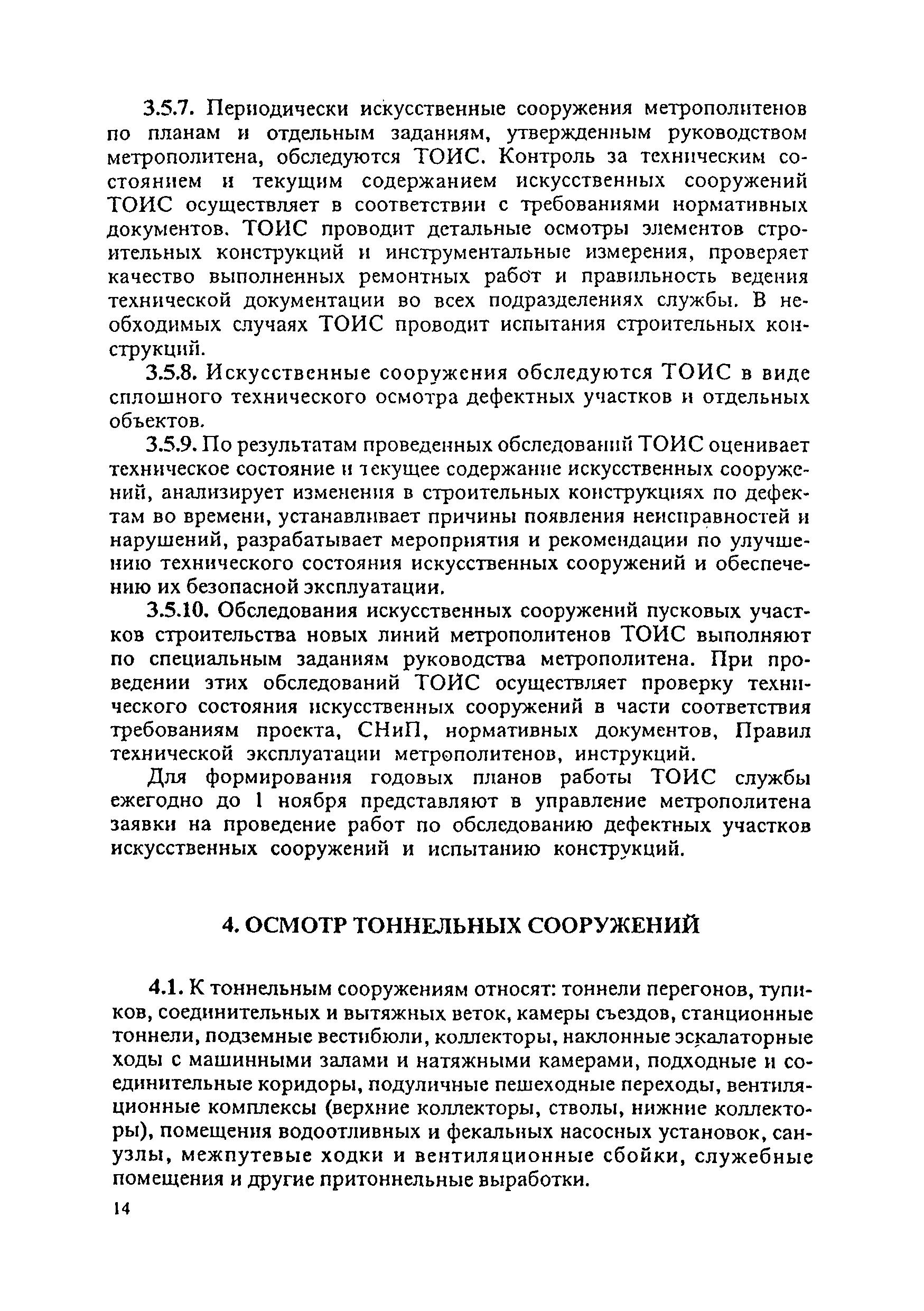 Инструкция по текущему содержанию искусственных сооружений метрополитенов| Статус: | действует | | Название рус.: | Инструкция по текущему содержанию искусственных сооружений метрополитенов | | Дата добавления в базу: | 01.01.2018 | | Дата актуализации: | 01.01.2021 | | Область применения: | Инструкция устанавливает порядок надзора и текущего ремонта искусственных сооружений метрополитенов, а также ведение технической документации по этим объектам. | | Оглавление: | 1. Общие сведения 2. Организация содержания искусственных сооружения метрополитенов 3. Надзор за состоянием искусственных сооружений 4. Осмотр тоннельных сооружений 5. Осмотр наземных сооружений 6. Осмотр мостовых переходов 7. Текущий ремонт и уход за тоннельными сооружениями 8. Текущий ремонт и уход за наземными сооружениями 9. Содержание коллекторов рек 10. Прочие работы по обслуживанию и текущему ремонту искусственных сооружений 11. Текущий ремонт и уход за мостовыми переходами Приложение 1. Перечень аварийного запаса материалов, инструмента, инвентаря на околотке дистанции тоннельных сооружений метрополитена Приложение 2. Перечень основных работ по текущему содержанию искусственных сооружений, требующих ограждения места их проведения сигналами остановки Приложение 3. Табель оснащенности околотка текущего содержания тоннельных сооружений средствами механизации, оборудованием, инструментом, инвентарем и транспортом Приложение 4. Перечень работ по текущему содержанию искусственных сооружений метрополитенов н их периодичность | | Утверждён: | 05.06.1996 Хозяйственная ассоциация Метро