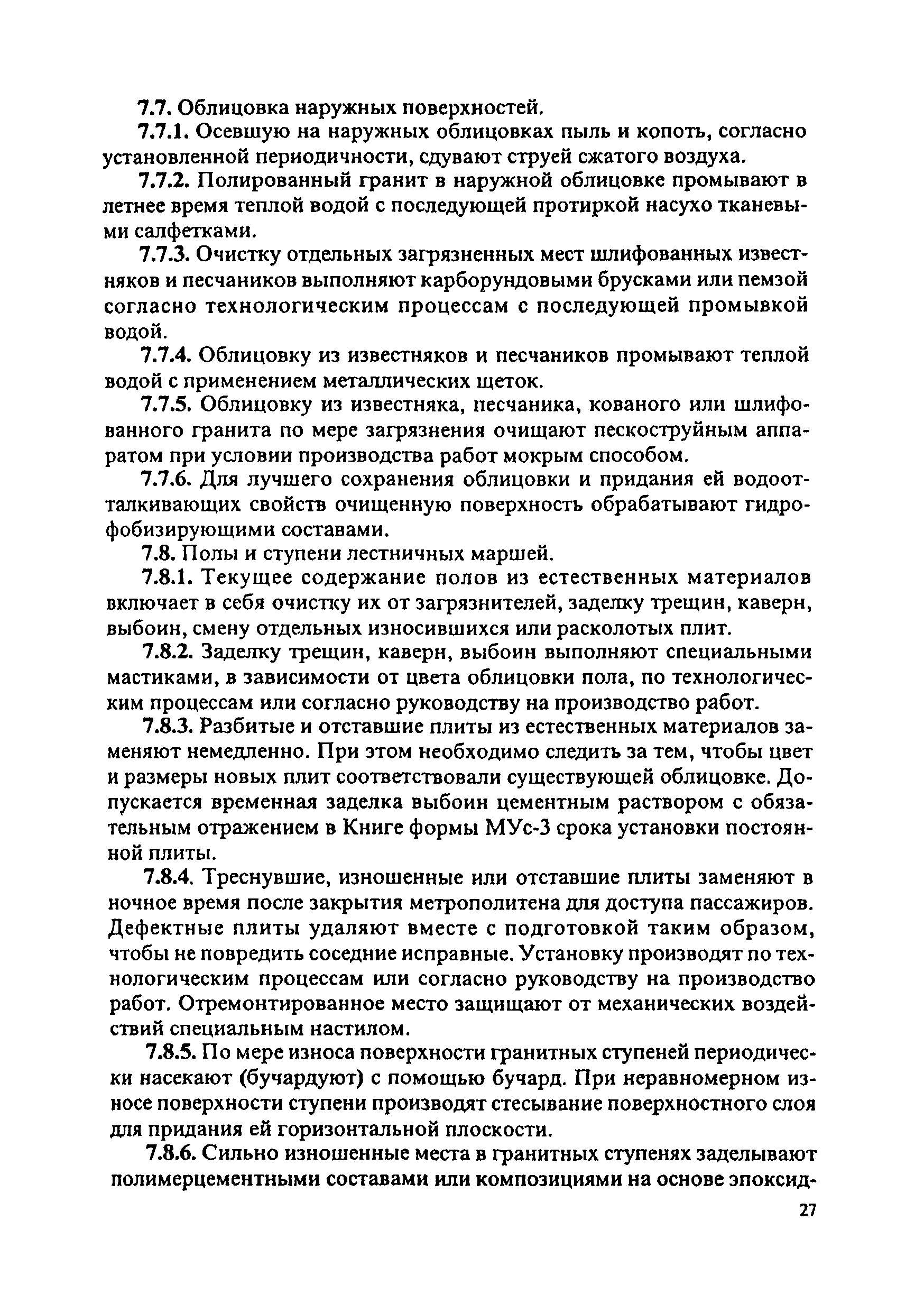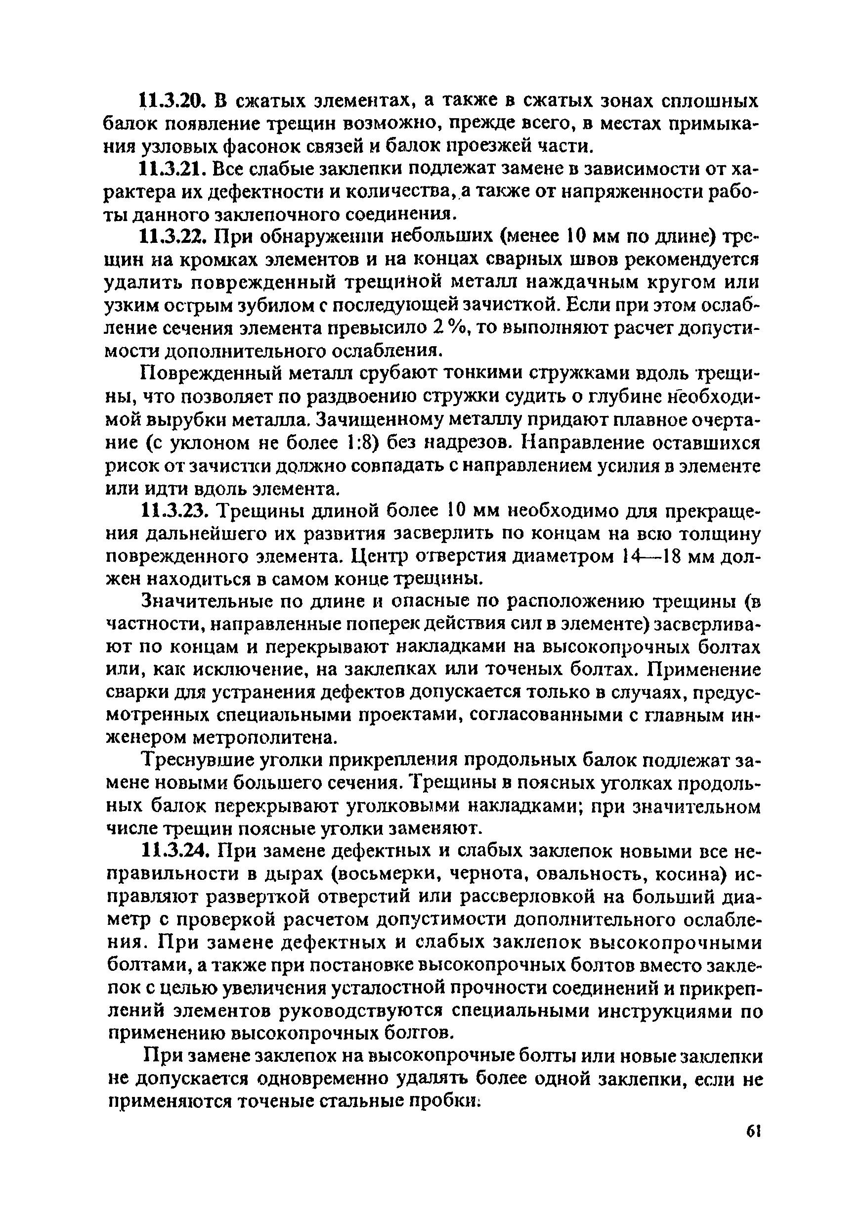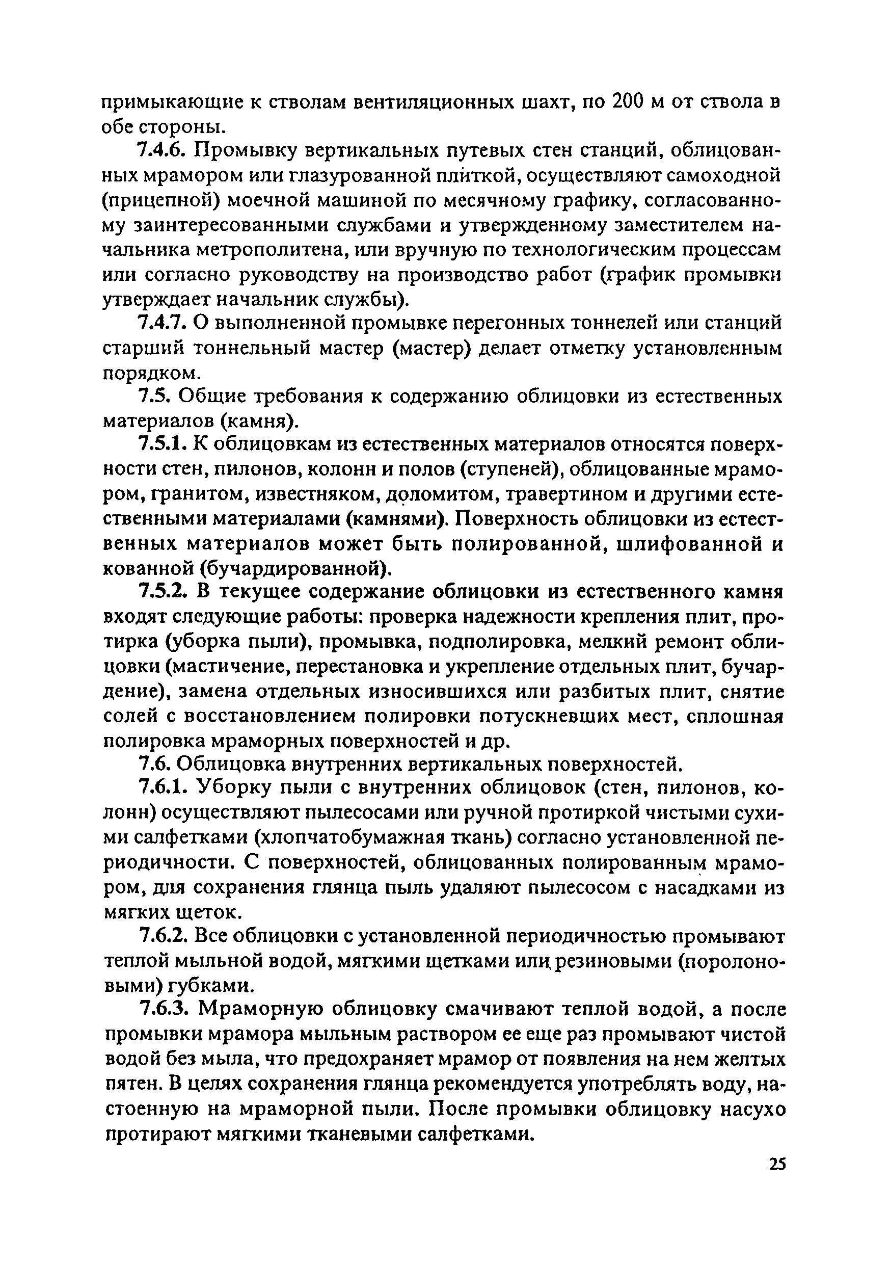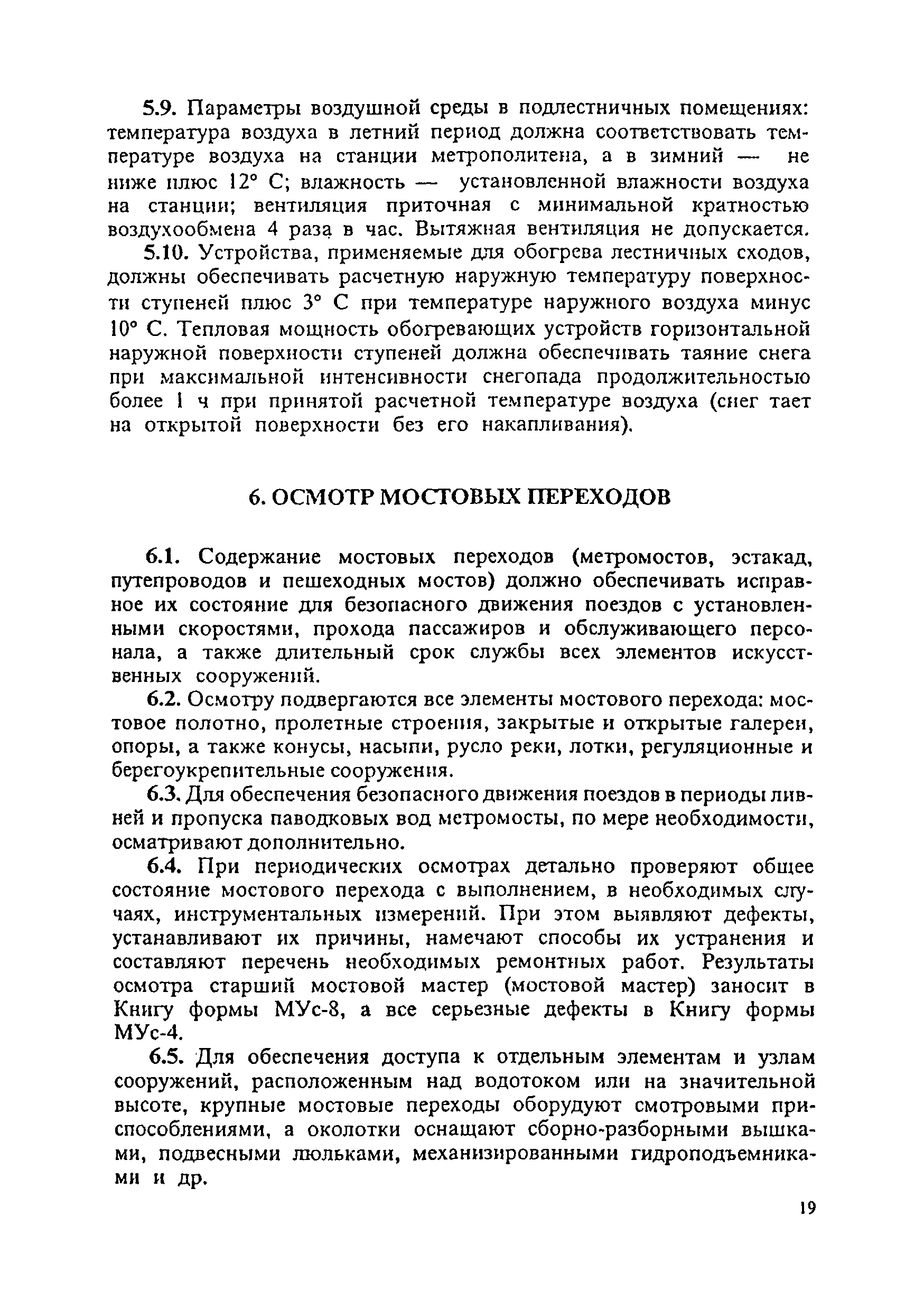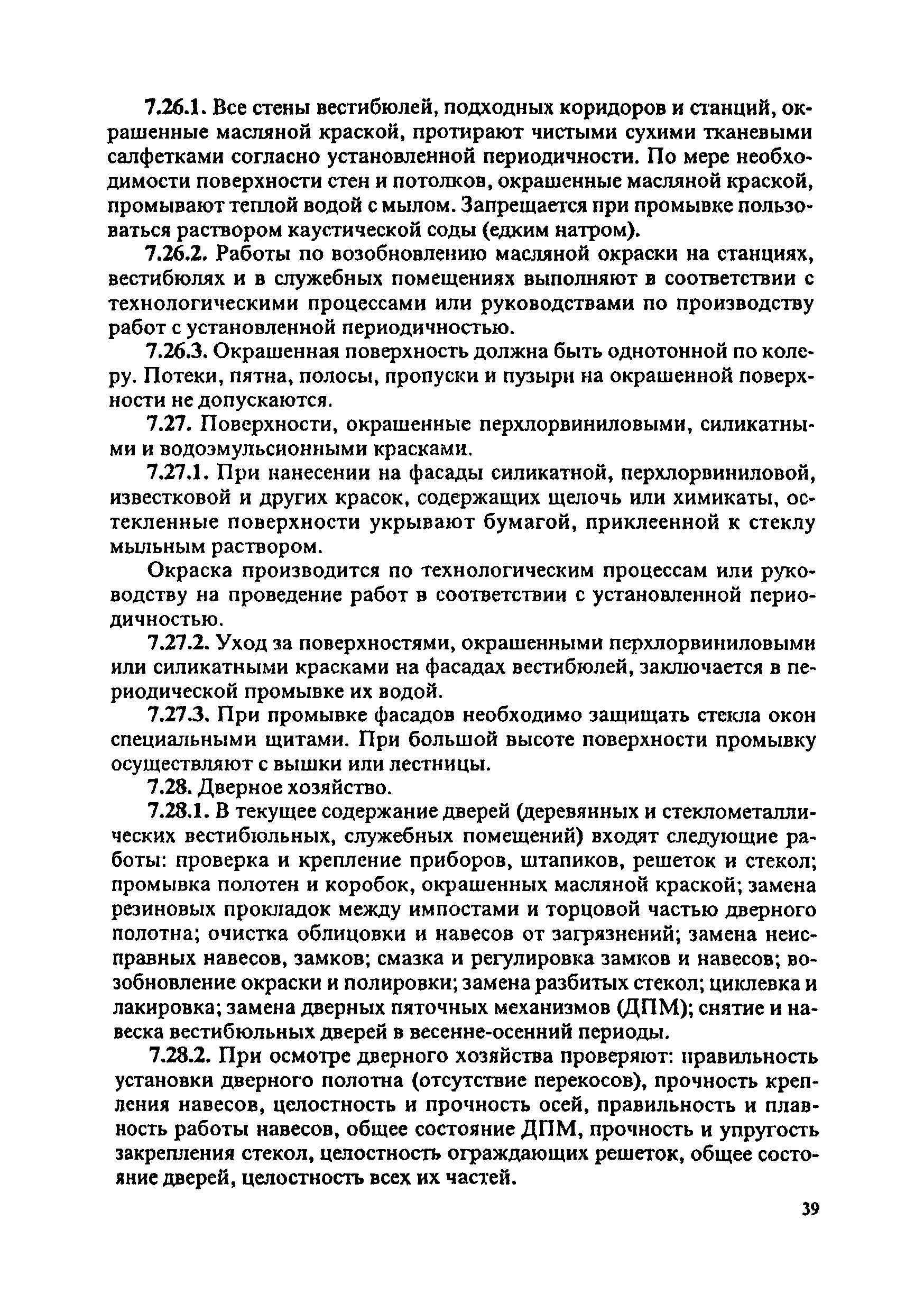 Инструкция по текущему содержанию искусственных сооружений метрополитенов| Статус: | действует | | Название рус.: | Инструкция по текущему содержанию искусственных сооружений метрополитенов | | Дата добавления в базу: | 01.01.2018 | | Дата актуализации: | 01.01.2021 | | Область применения: | Инструкция устанавливает порядок надзора и текущего ремонта искусственных сооружений метрополитенов, а также ведение технической документации по этим объектам. | | Оглавление: | 1. Общие сведения 2. Организация содержания искусственных сооружения метрополитенов 3. Надзор за состоянием искусственных сооружений 4. Осмотр тоннельных сооружений 5. Осмотр наземных сооружений 6. Осмотр мостовых переходов 7. Текущий ремонт и уход за тоннельными сооружениями 8. Текущий ремонт и уход за наземными сооружениями 9. Содержание коллекторов рек 10. Прочие работы по обслуживанию и текущему ремонту искусственных сооружений 11. Текущий ремонт и уход за мостовыми переходами Приложение 1. Перечень аварийного запаса материалов, инструмента, инвентаря на околотке дистанции тоннельных сооружений метрополитена Приложение 2. Перечень основных работ по текущему содержанию искусственных сооружений, требующих ограждения места их проведения сигналами остановки Приложение 3. Табель оснащенности околотка текущего содержания тоннельных сооружений средствами механизации, оборудованием, инструментом, инвентарем и транспортом Приложение 4. Перечень работ по текущему содержанию искусственных сооружений метрополитенов н их периодичность | | Утверждён: | 05.06.1996 Хозяйственная ассоциация Метро