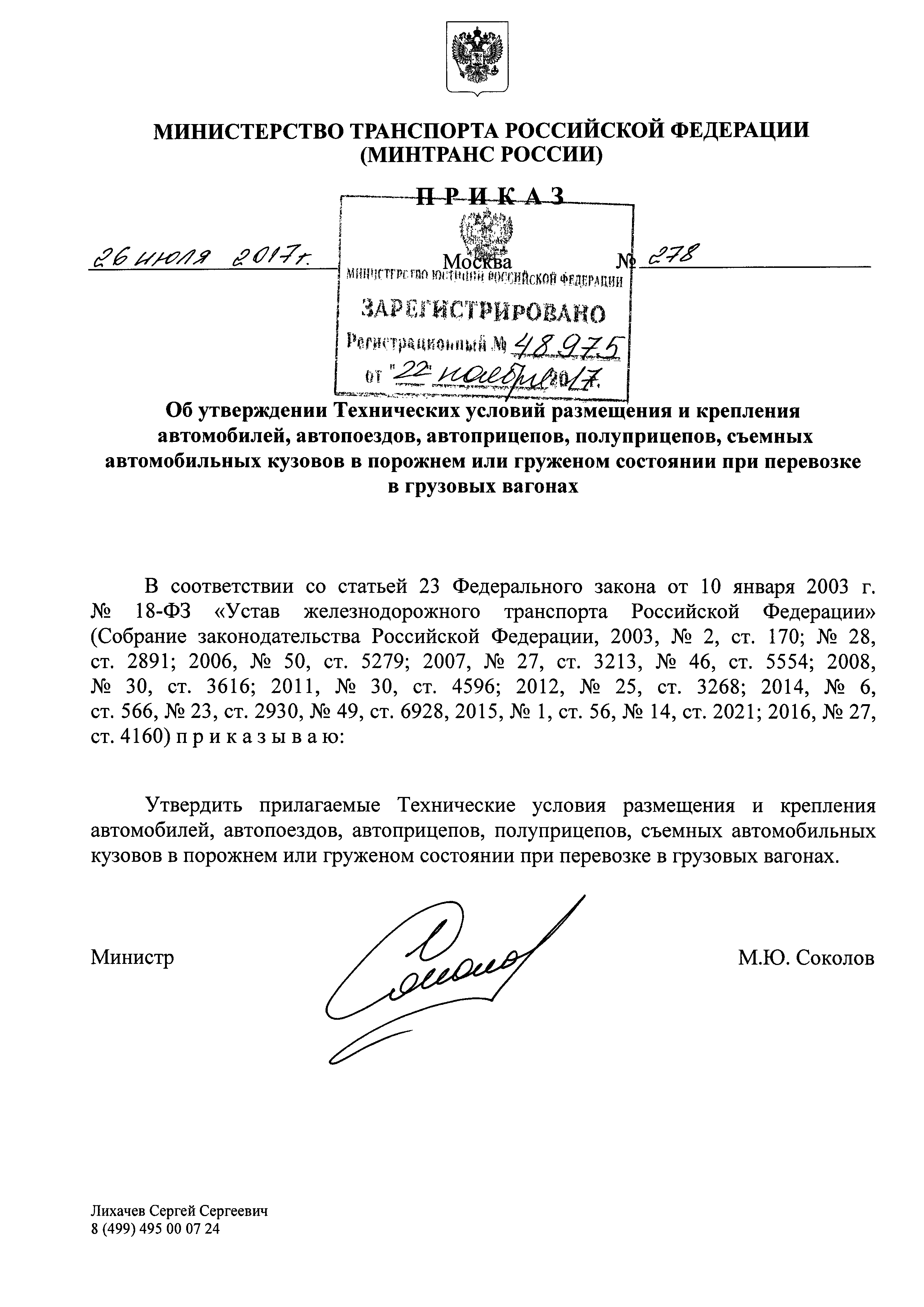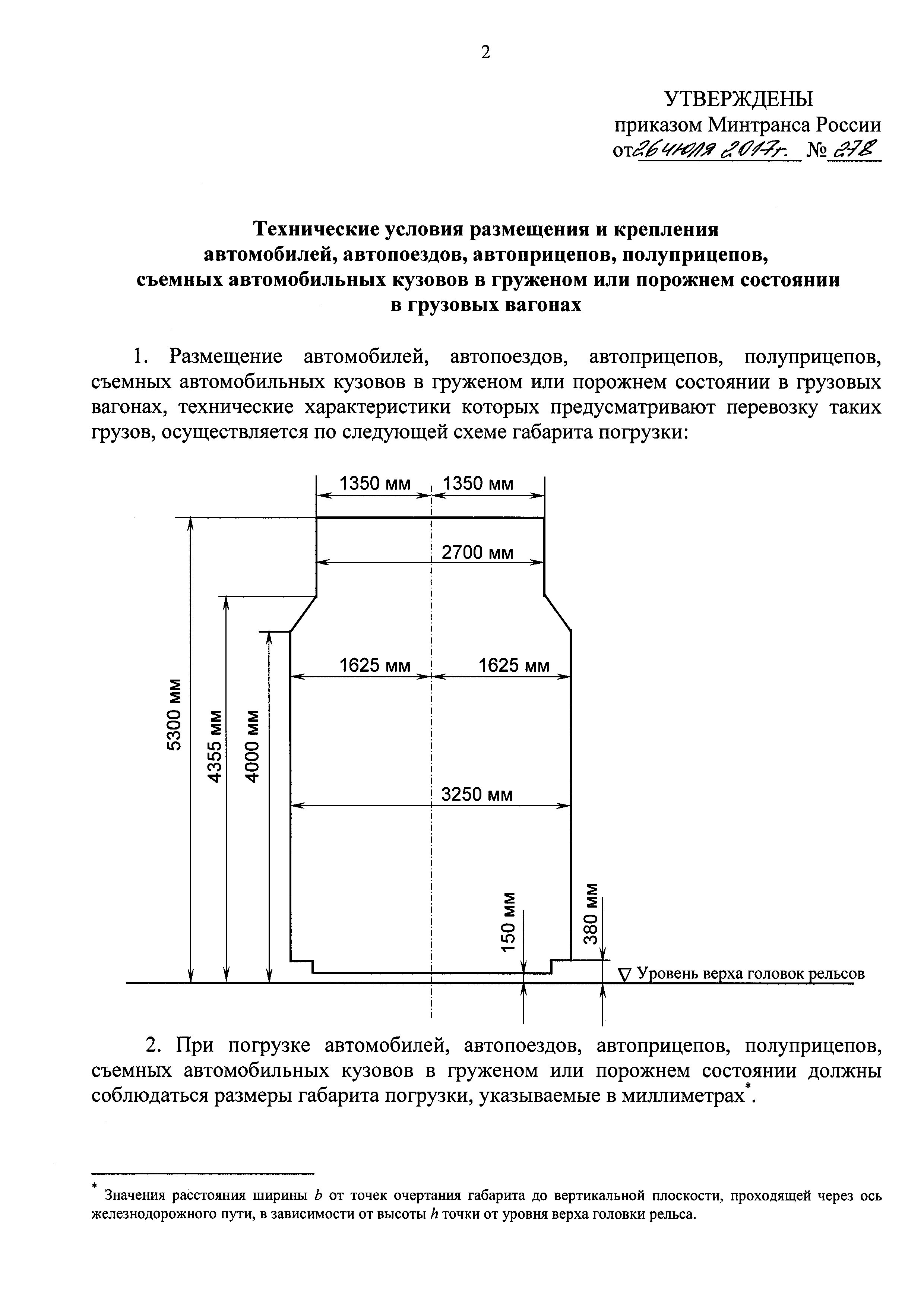 Технические условия размещения и крепления автомобилей, автопоездов, автоприцепов, полуприцепов, съемных автомобильных кузовов в груженом или порожнем состоянии в грузовых вагонах| Статус: | действует | | Название рус.: | Технические условия размещения и крепления автомобилей, автопоездов, автоприцепов, полуприцепов, съемных автомобильных кузовов в груженом или порожнем состоянии в грузовых вагонах | | Дата добавления в базу: | 01.01.2018 | | Дата актуализации: | 01.01.2021 | | Дата введения: | 04.12.2017 | | Утверждён: | 26.07.2017 Министерство транспорта Российской Федерации (Russian Federation Ministry of Transportation 278)