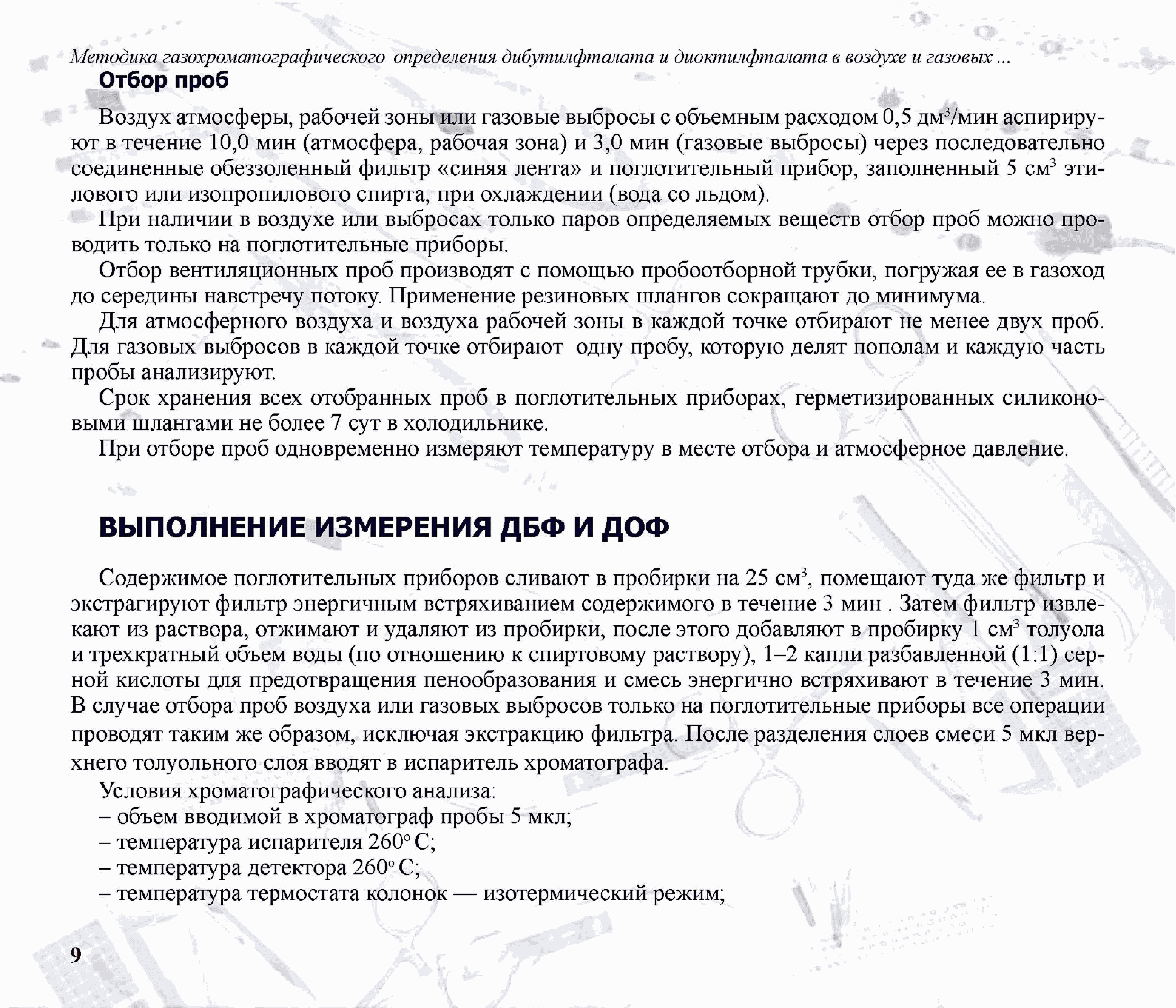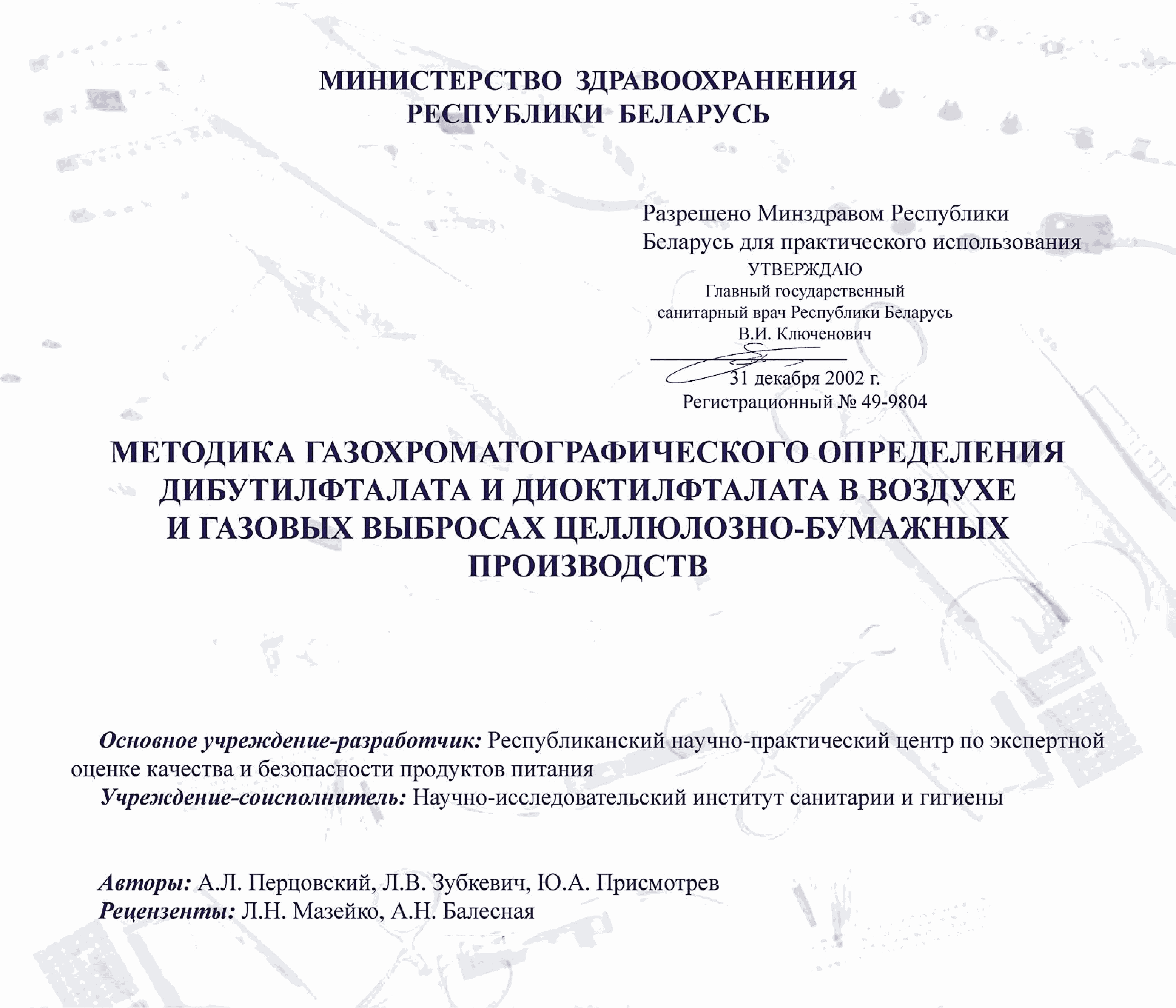 | Название рус.: | Методика газохроматографического определения дибутилфталата и диоктилфталата в воздухе и газовых выбросах целлюлозно-бумажных производств |