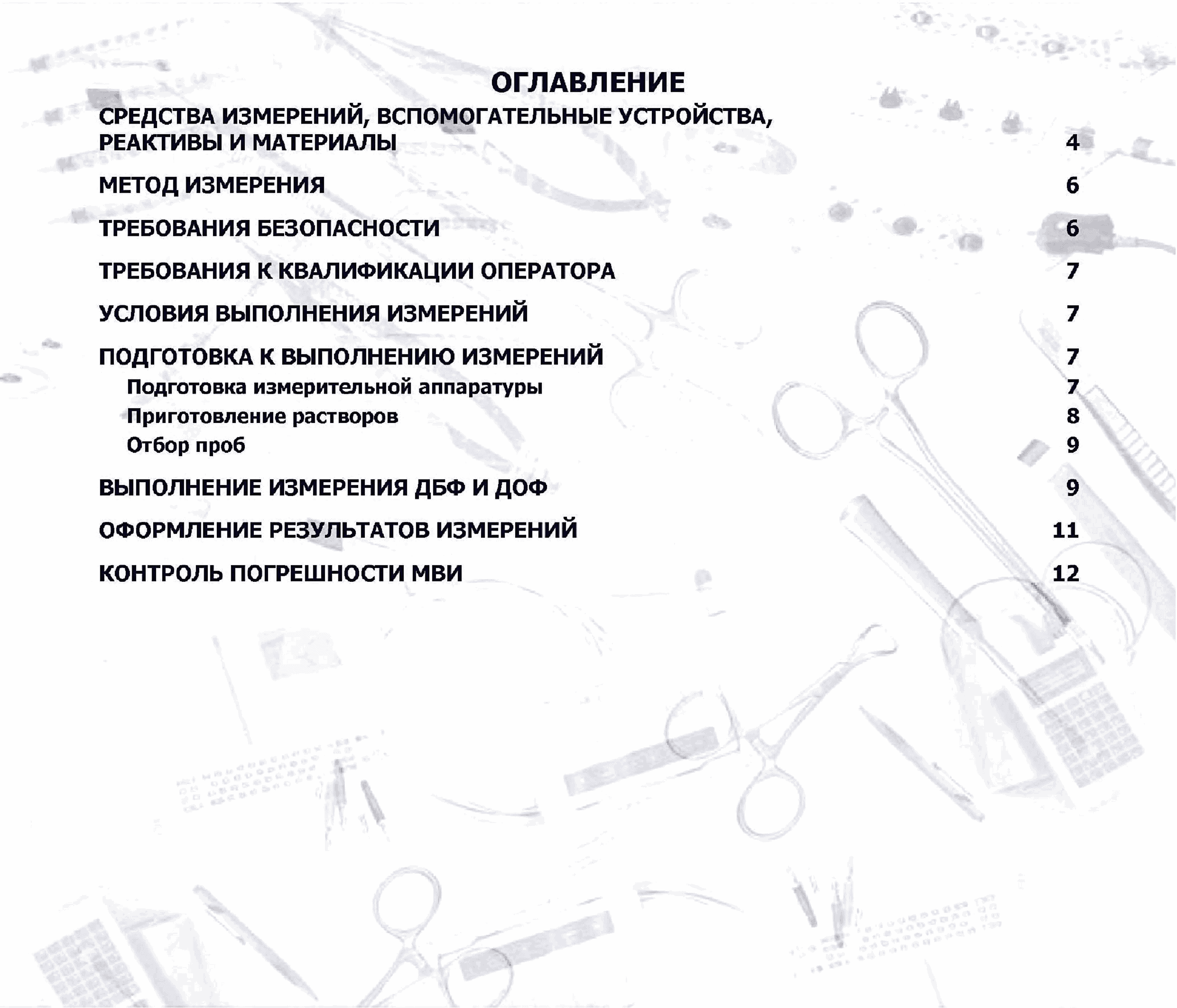 | Оглавление: | Средства измерений, вспомогательные устройства, реактивы и материалы Метод измерения Требования безопасности Требования к квалификации оператора Условия выполнения измерений Подготовка к выполнению измерений Подготовка измерительной аппаратуры Приготовление растворов Отбор проб Выполнение измерения ДБФ и ДОФ Оформление результатов измерений Контроль погрешности МВИ |