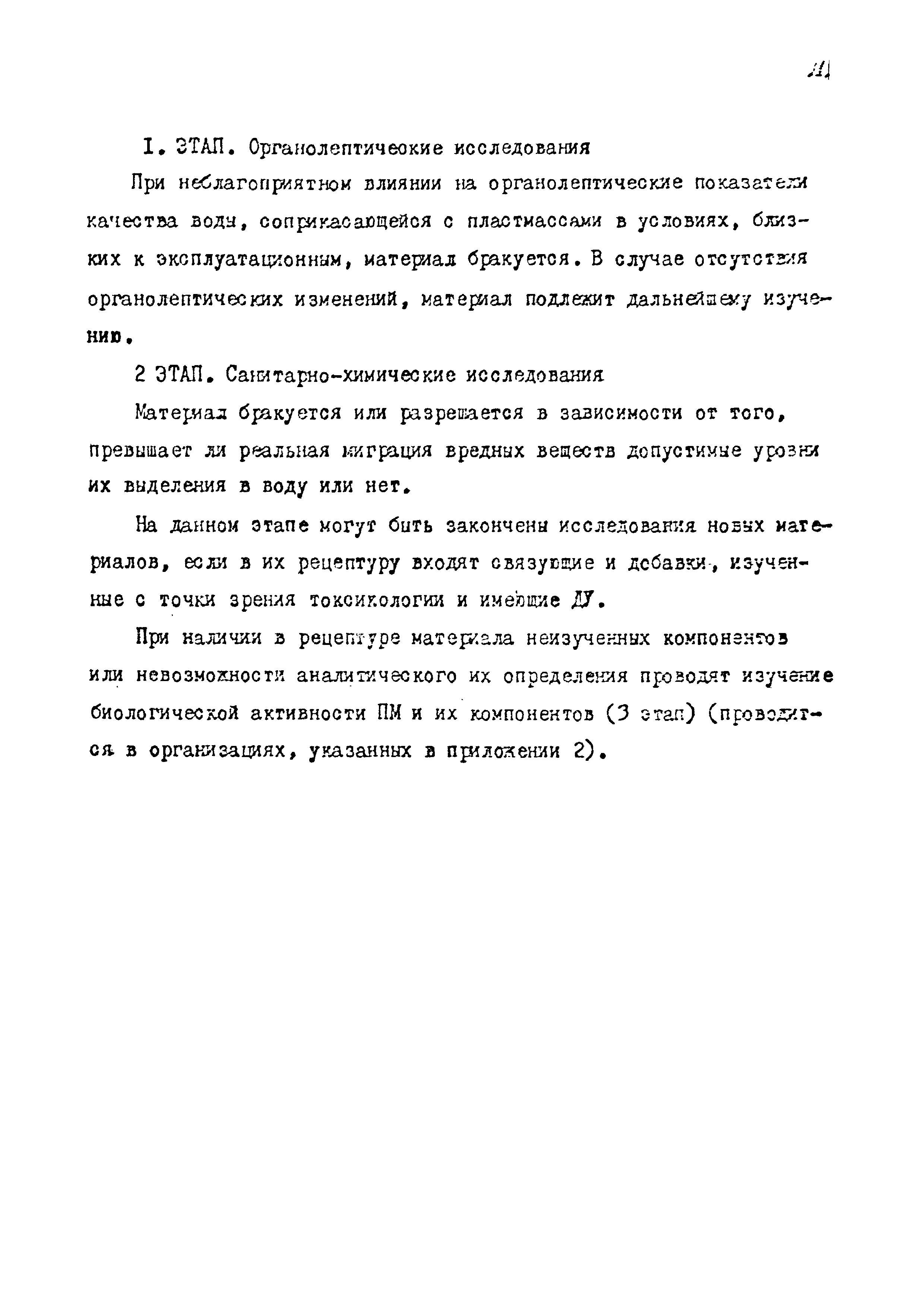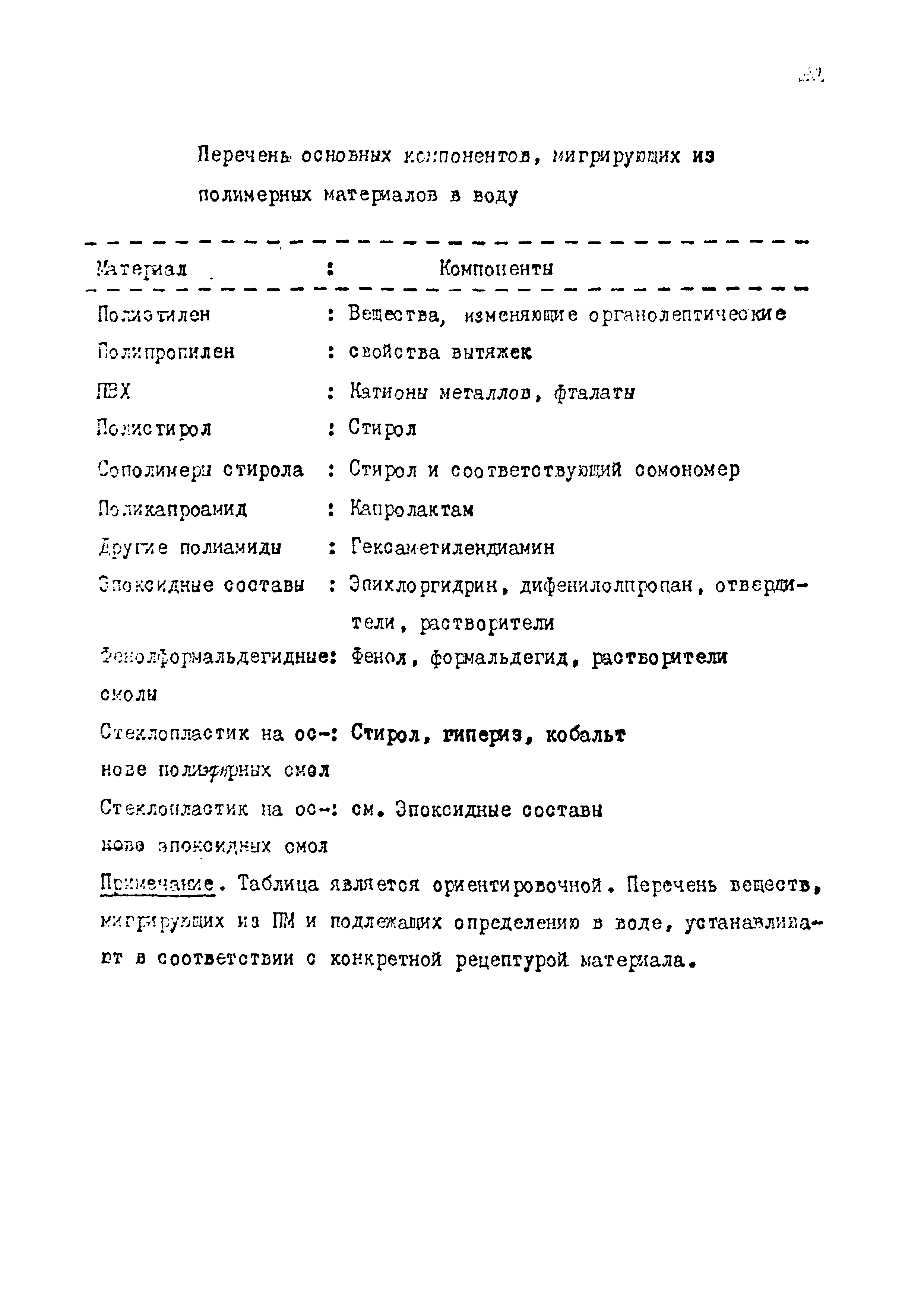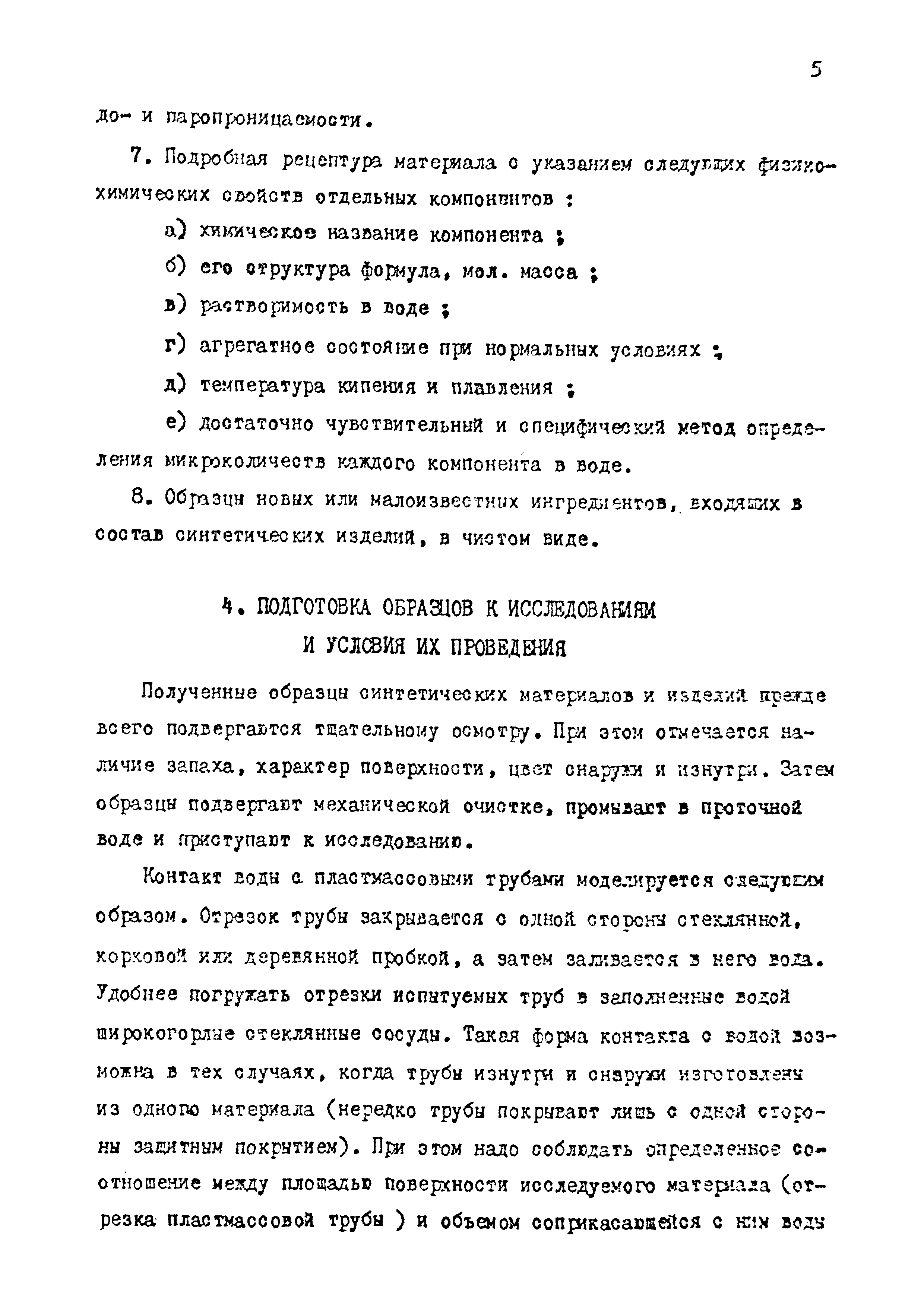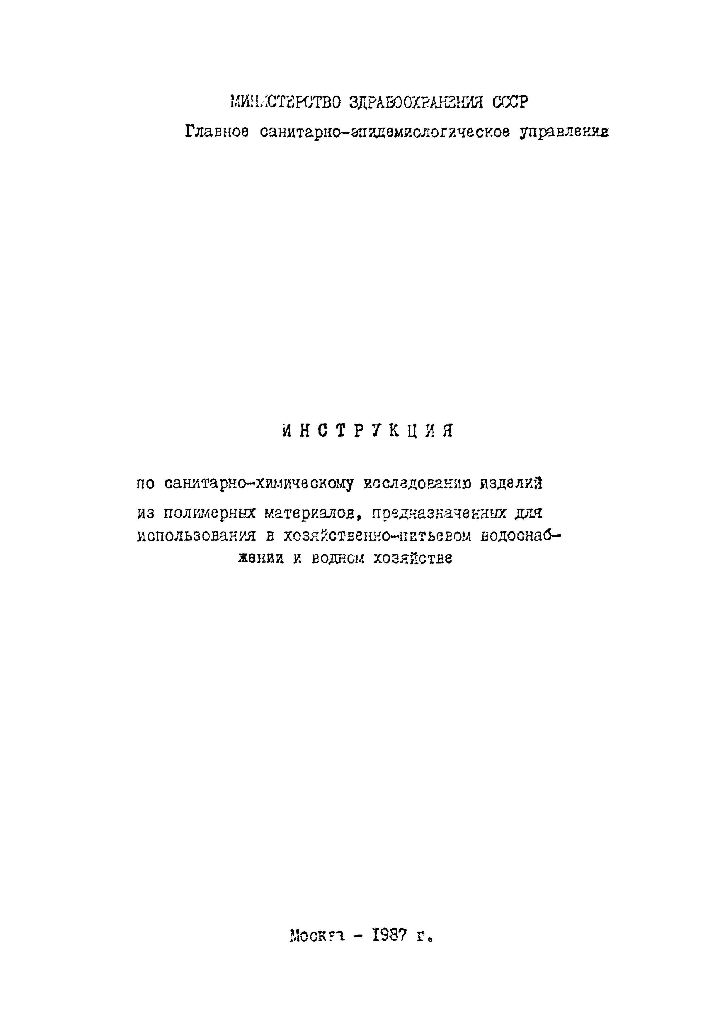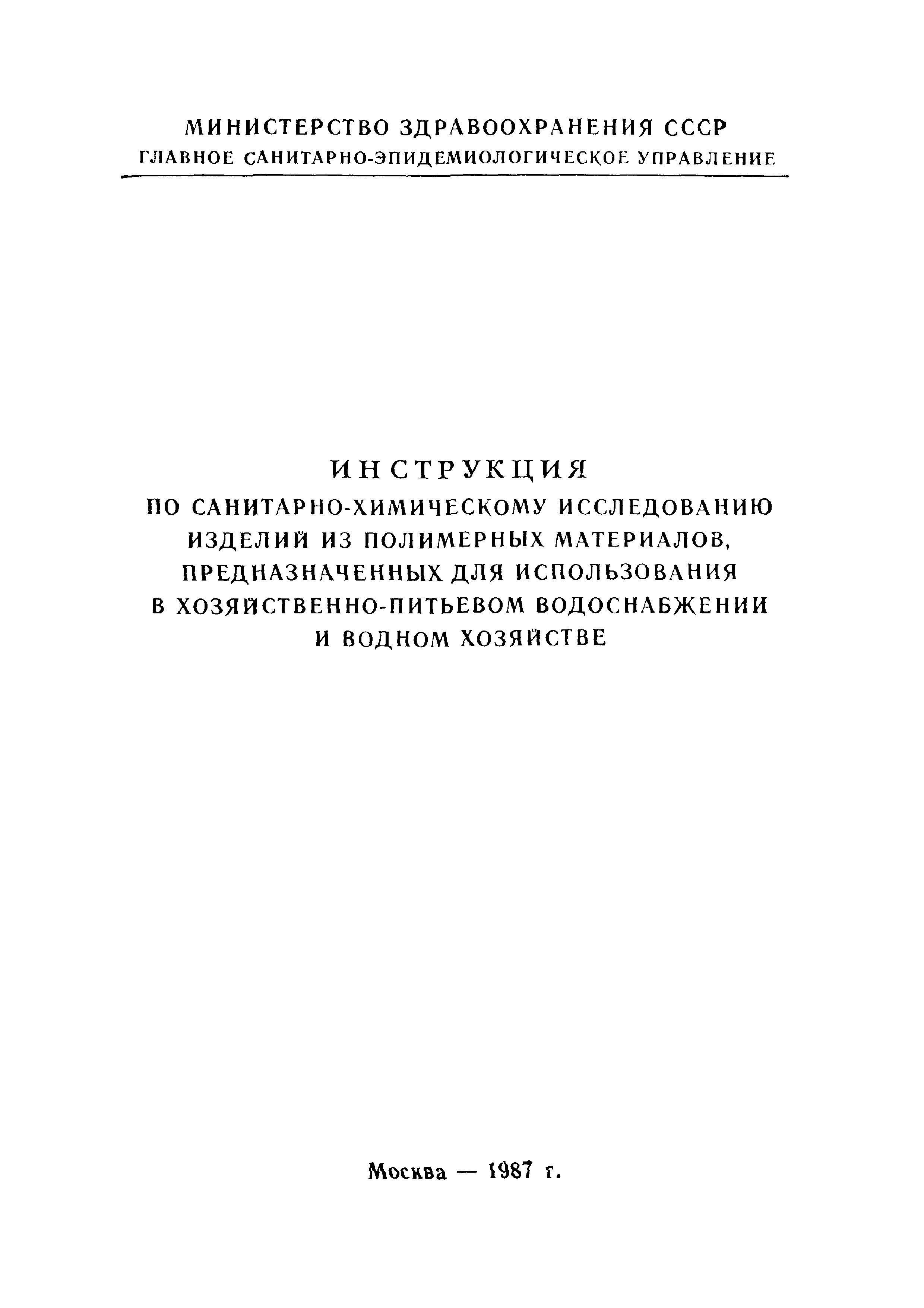 Инструкция по санитарно-химическому исследованию изделий из полимерных материалов, предназначенных для использования в хозяйственно-питьевом водоснабжении и водном хозяйстве| Статус: | действует | | Название рус.: | Инструкция по санитарно-химическому исследованию изделий из полимерных материалов, предназначенных для использования в хозяйственно-питьевом водоснабжении и водном хозяйстве | | Дата добавления в базу: | 01.01.2018 | | Дата актуализации: | 01.01.2021 | | Область применения: | Инструкция определяет порядок проведения исследований, содержит описание методов анализа воды по 11 химическим веществам, наиболее характерным для полимерных материалов, и предназначена для научно исследовательских институтов и кафедр гигиенического профиля, а также для санитарно-эпидемиологических станций, имеющих соответствующую лабораторную базу, занимающихся исследованиями по гигиеническому изучению полимерных материалов, предназначенных для использования в практике хозяйственно-питьевого водоснабжения. | | Оглавление: | 1. Введение 2. Порядок рассмотрения и согласования проектов нормативно технической документации на изделия из полимерных материалов 3. Порядок приемки образцов полимерных материалов для гигиенического исследования 4. Подготовка образцов к исследованиям и условия их проведения 5. Изучение влияния полимерных материалов на качество воды 6. Изучения влияния синтетических материалов на органолептические и физико-химические показатели качества воды 7. Санитарно-химические исследования 7.1. Определение стирола 7.2. Определение фенола и дифенилолпропана 7.3. Определение диоктилфталата 7.4. Определение дибутилфталата 7.5. Определение свинца 7.6. Определение кадмия 7.7. Определение цинка 7.8. Определение капролактами 7.9. Определение формальдегида 7.10. Определение эпихлоргидрина 7.11. Определение кобальта и никеля | | Разработан: | ВНИИ гигиены и токсикологии пестицидов, полимеров и пластических масс Минздрава СССР Киевский институт усовершенствования врачей Минздрава Украинской ССР