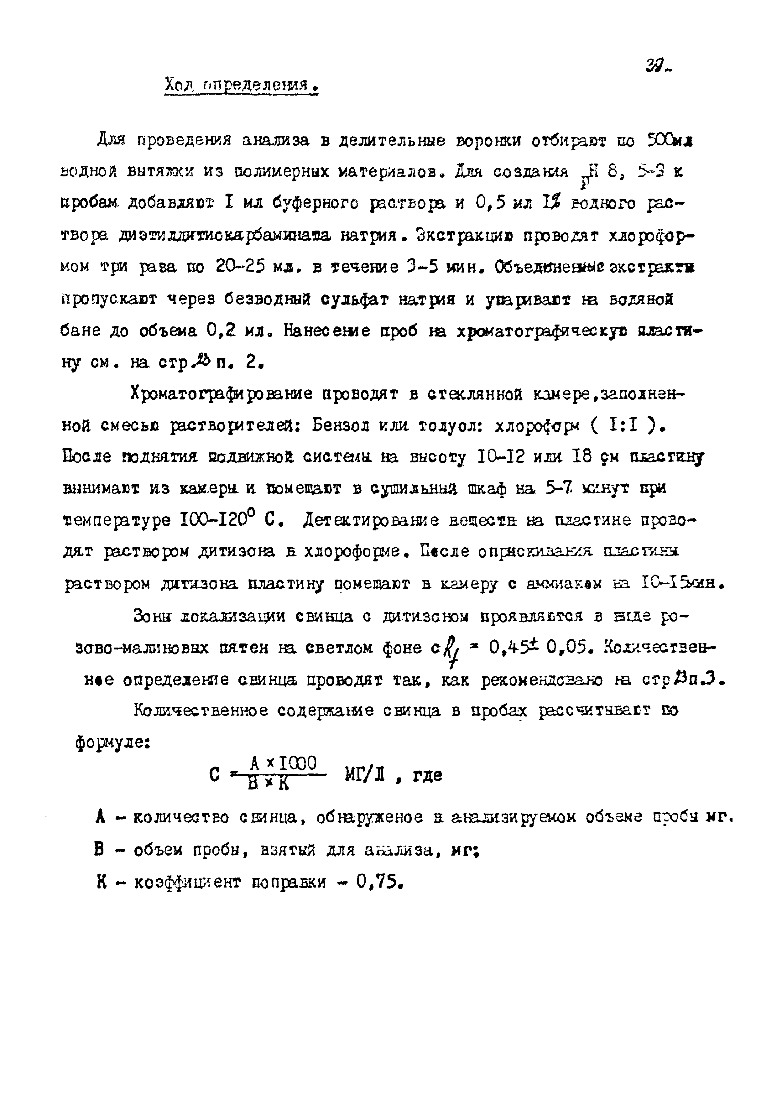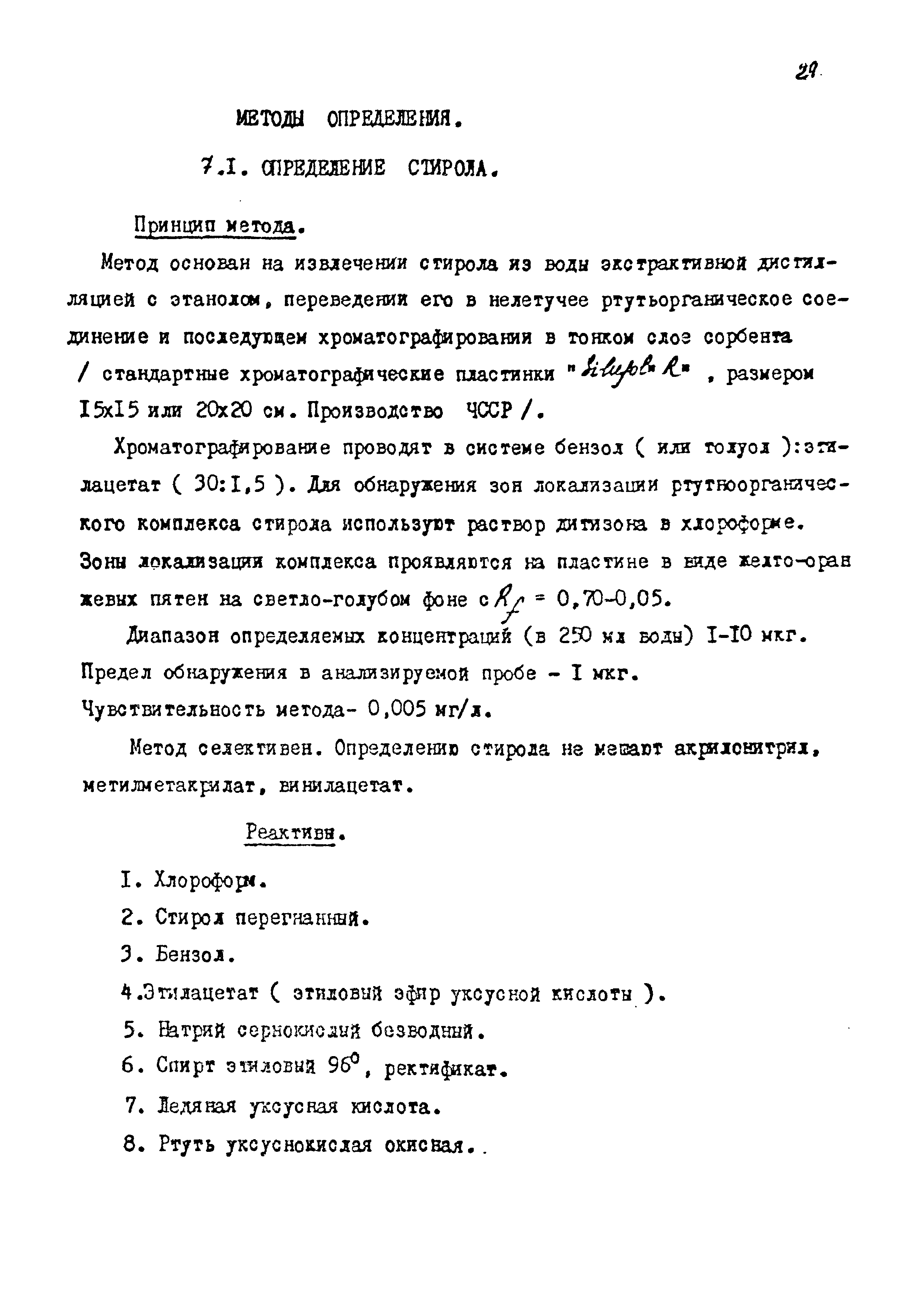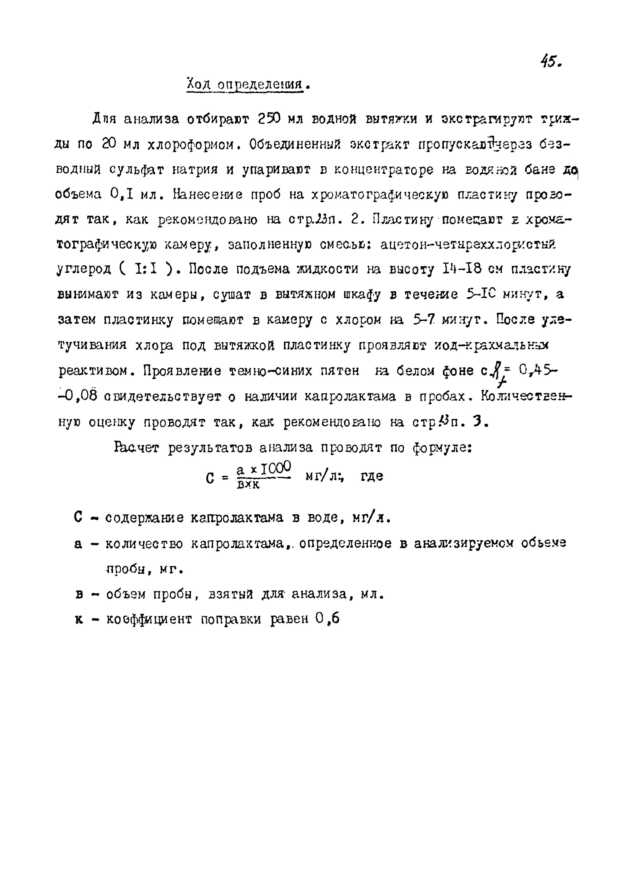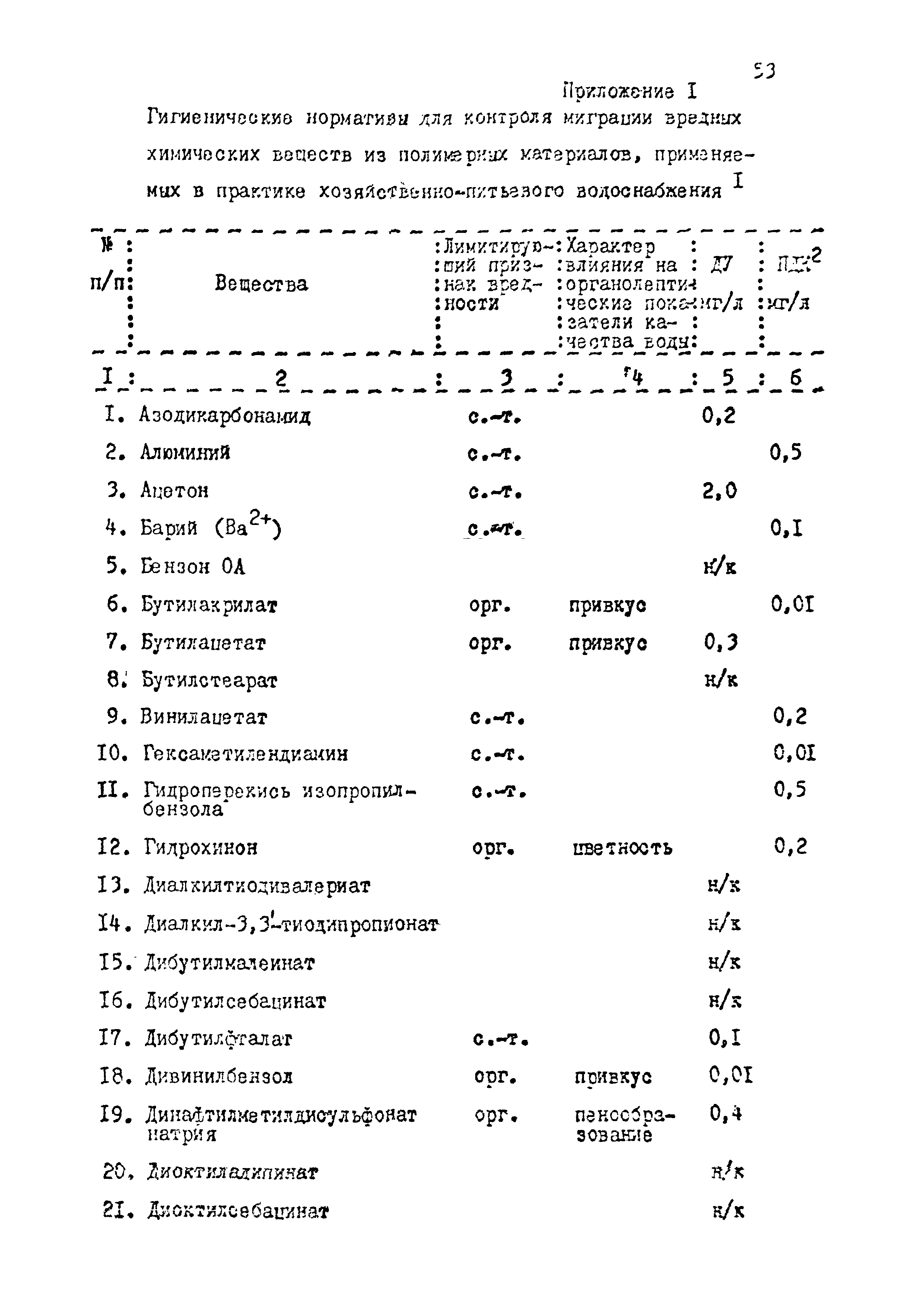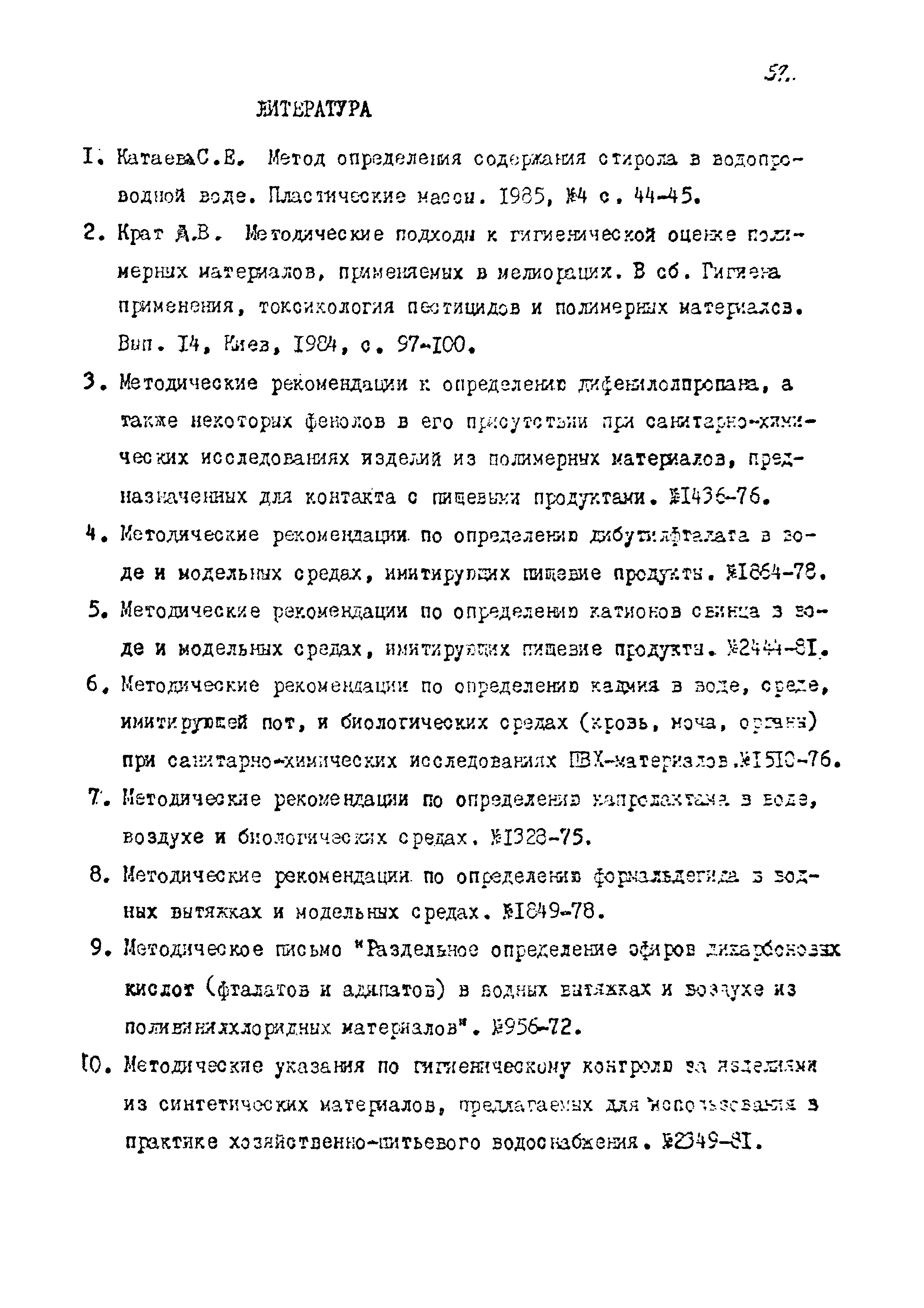 Инструкция по санитарно-химическому исследованию изделий из полимерных материалов, предназначенных для использования в хозяйственно-питьевом водоснабжении и водном хозяйстве| Статус: | действует | | Название рус.: | Инструкция по санитарно-химическому исследованию изделий из полимерных материалов, предназначенных для использования в хозяйственно-питьевом водоснабжении и водном хозяйстве | | Дата добавления в базу: | 01.01.2018 | | Дата актуализации: | 01.01.2021 | | Область применения: | Инструкция определяет порядок проведения исследований, содержит описание методов анализа воды по 11 химическим веществам, наиболее характерным для полимерных материалов, и предназначена для научно исследовательских институтов и кафедр гигиенического профиля, а также для санитарно-эпидемиологических станций, имеющих соответствующую лабораторную базу, занимающихся исследованиями по гигиеническому изучению полимерных материалов, предназначенных для использования в практике хозяйственно-питьевого водоснабжения. | | Оглавление: | 1. Введение 2. Порядок рассмотрения и согласования проектов нормативно технической документации на изделия из полимерных материалов 3. Порядок приемки образцов полимерных материалов для гигиенического исследования 4. Подготовка образцов к исследованиям и условия их проведения 5. Изучение влияния полимерных материалов на качество воды 6. Изучения влияния синтетических материалов на органолептические и физико-химические показатели качества воды 7. Санитарно-химические исследования 7.1. Определение стирола 7.2. Определение фенола и дифенилолпропана 7.3. Определение диоктилфталата 7.4. Определение дибутилфталата 7.5. Определение свинца 7.6. Определение кадмия 7.7. Определение цинка 7.8. Определение капролактами 7.9. Определение формальдегида 7.10. Определение эпихлоргидрина 7.11. Определение кобальта и никеля | | Разработан: | ВНИИ гигиены и токсикологии пестицидов, полимеров и пластических масс Минздрава СССР Киевский институт усовершенствования врачей Минздрава Украинской ССР