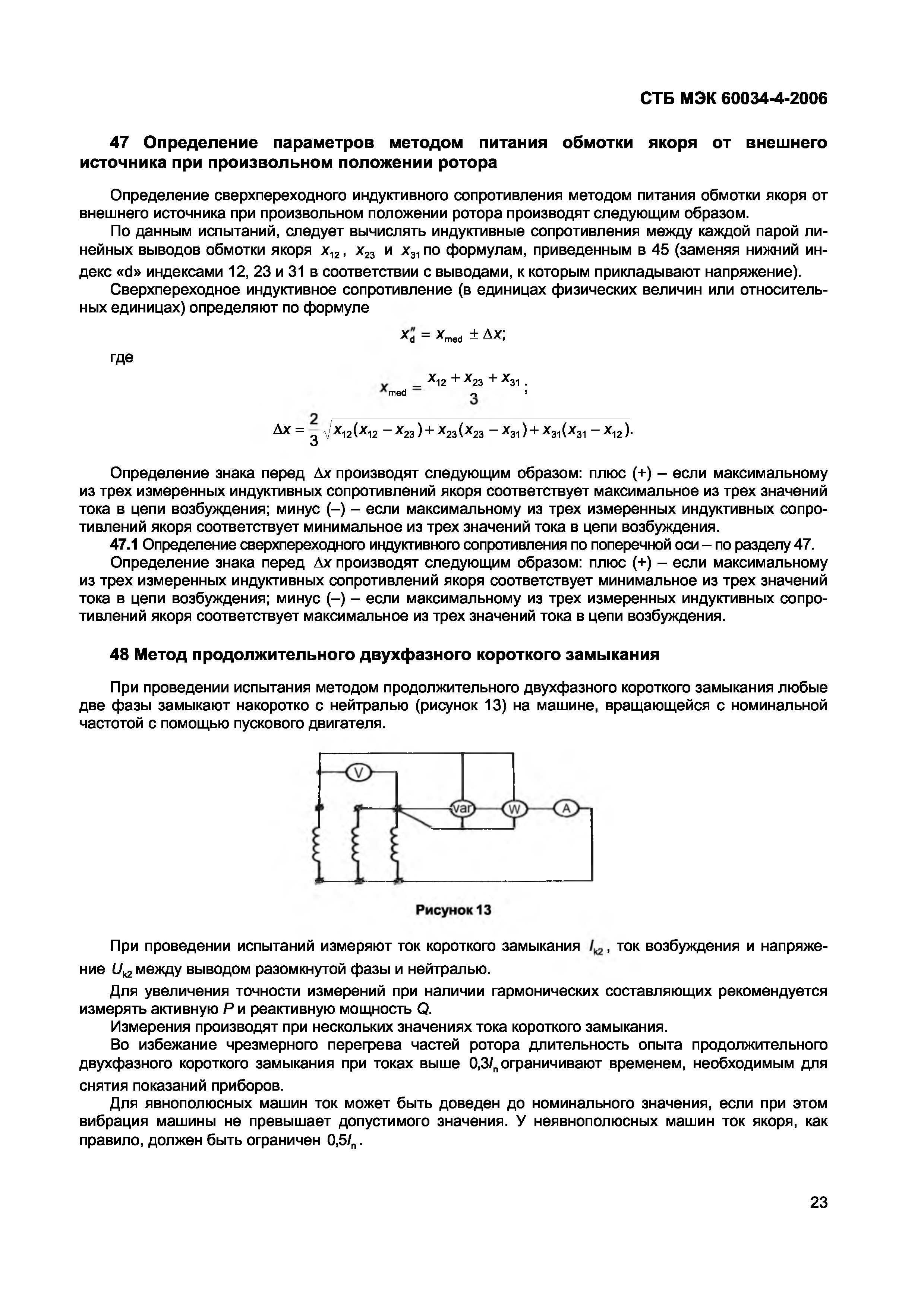 | Область применения: | Стандарт распространяется на трехфазные синхронные машины мощностью от 1 кВ.А и выше при частоте переменного тока от 15 до 400 Гц. Стандарт не распространяется на специальные машины, такие как машины с постоянными магнитами, асинхронные машины и т. д. Методы испытаний, установленные стандартом, относятся к машинам без обмоток возбуждения, поэтому могут возникать некоторые варианты, требующие специальных мер. |