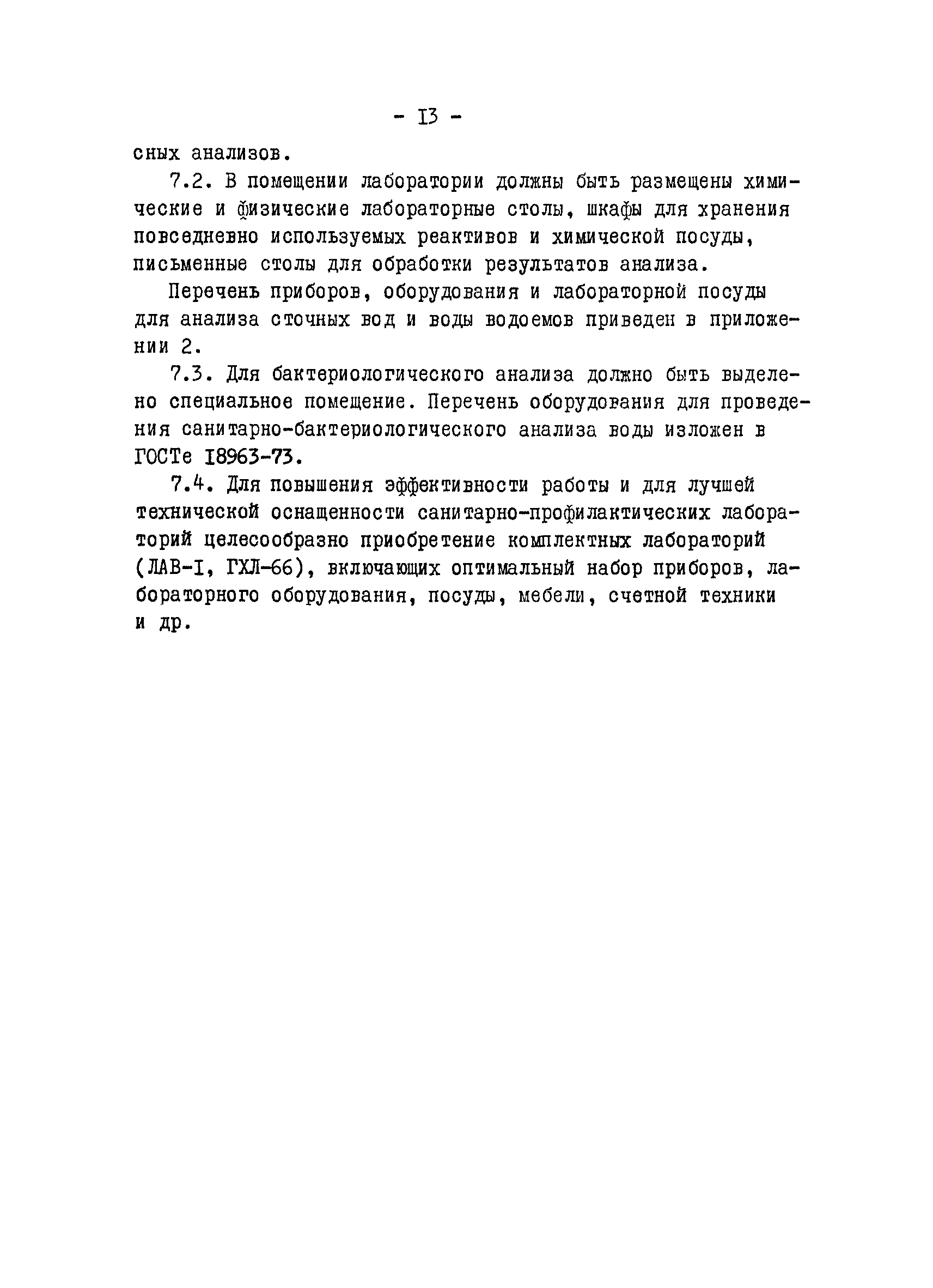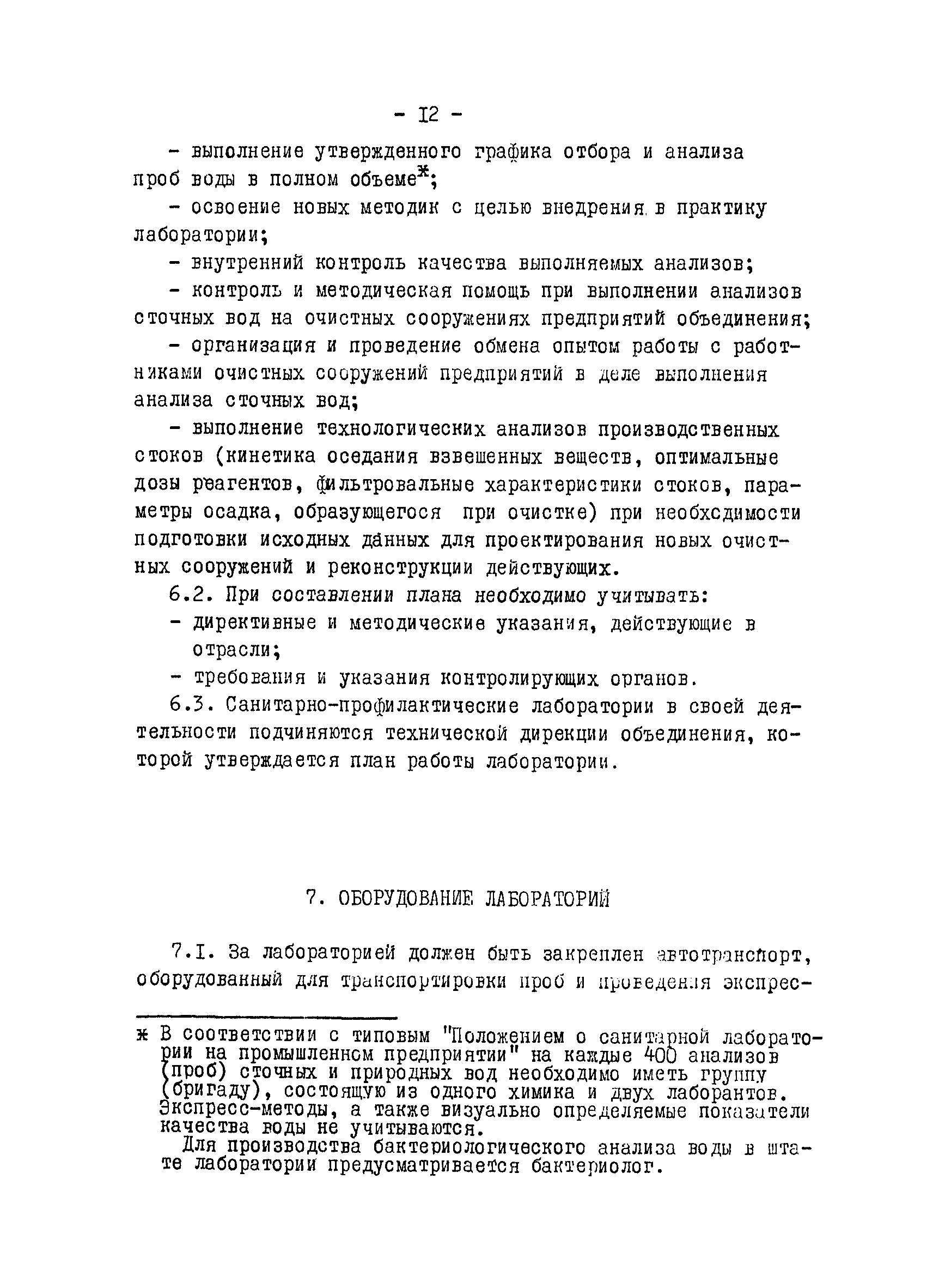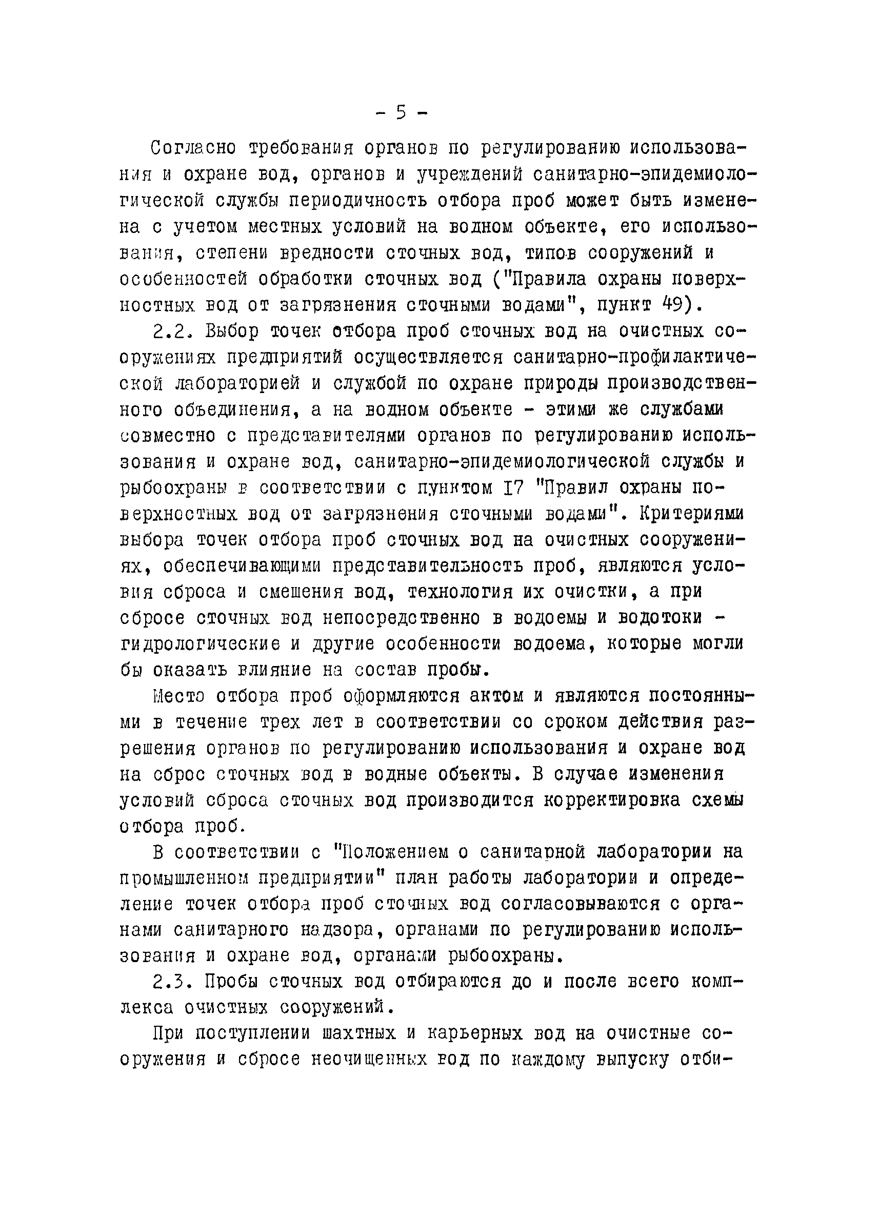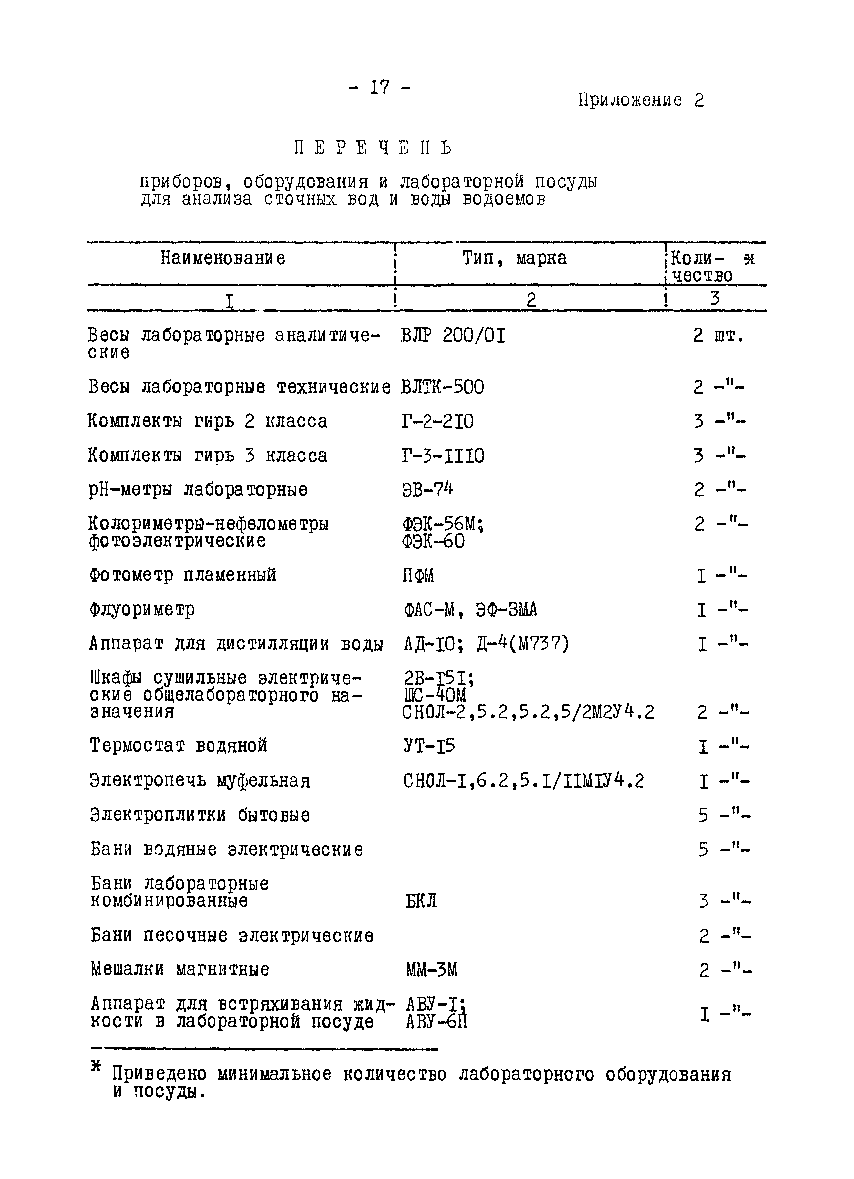 | Оглавление: | 1 Общие положения 2 Общий лабораторный контроль 3 Лабораторный контроль в процессе очистки сточных вод 4 Система отчетности по результатам контроля качества вод 5 Методика расчета средневзвешенных концентраций загрязнений 6 Планирование работ 7 Оборудование лабораторий 8 Список литературы Приложение 1. Форма I. Результаты химического анализа сточных вод и воды водоемов по производственному объединению Приложение 2. Перечень приборов, оборудования и лабораторной посуды для анализа сточных вод и воды водоемов |