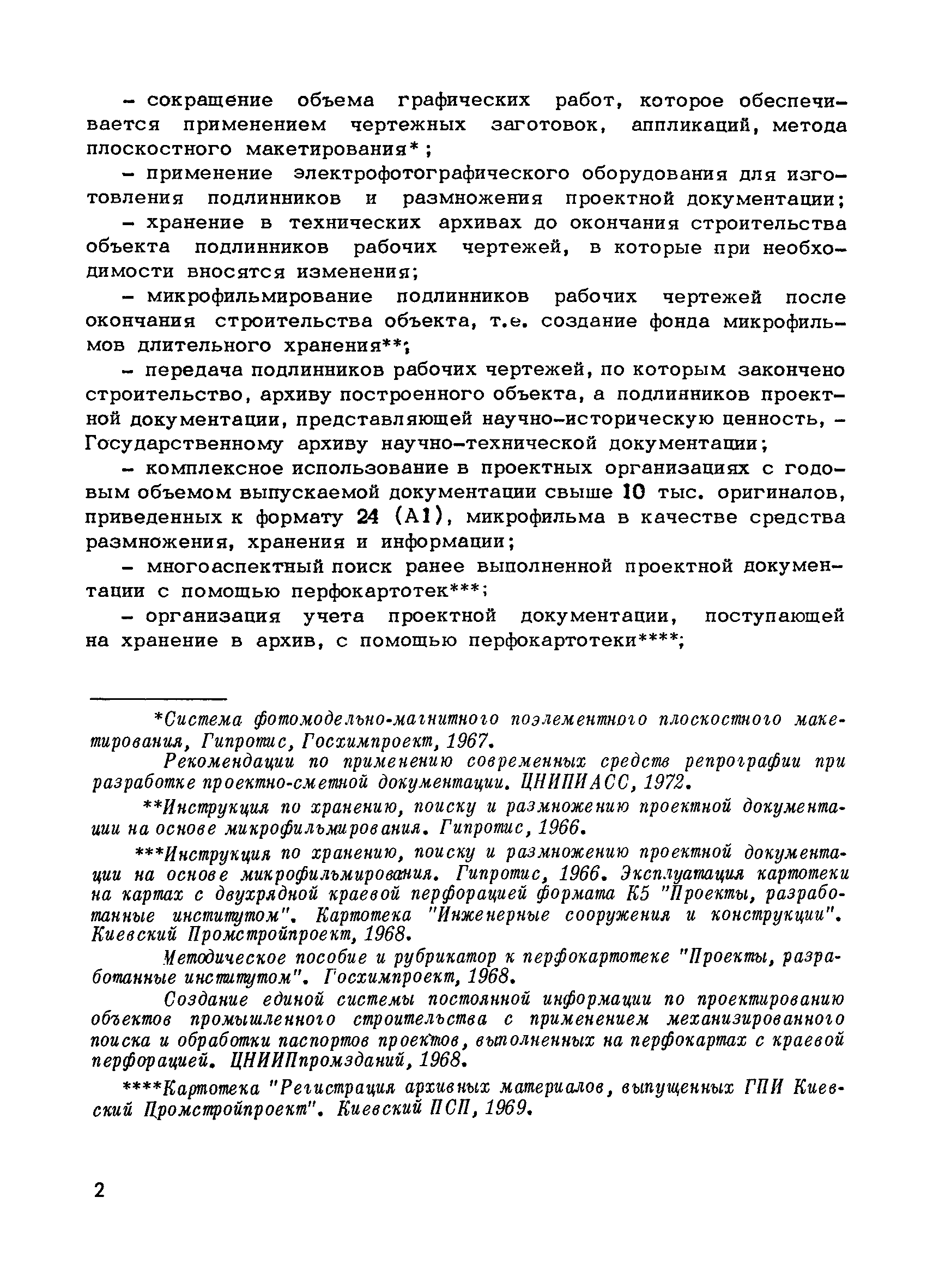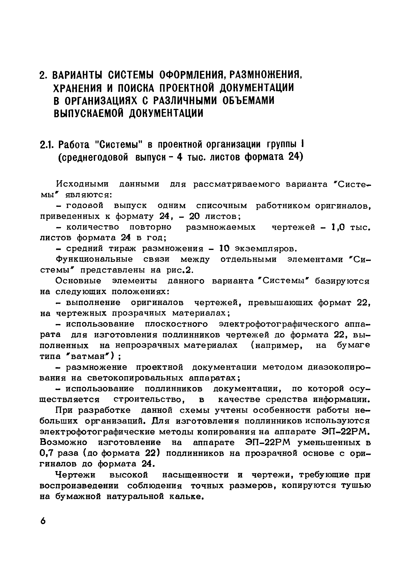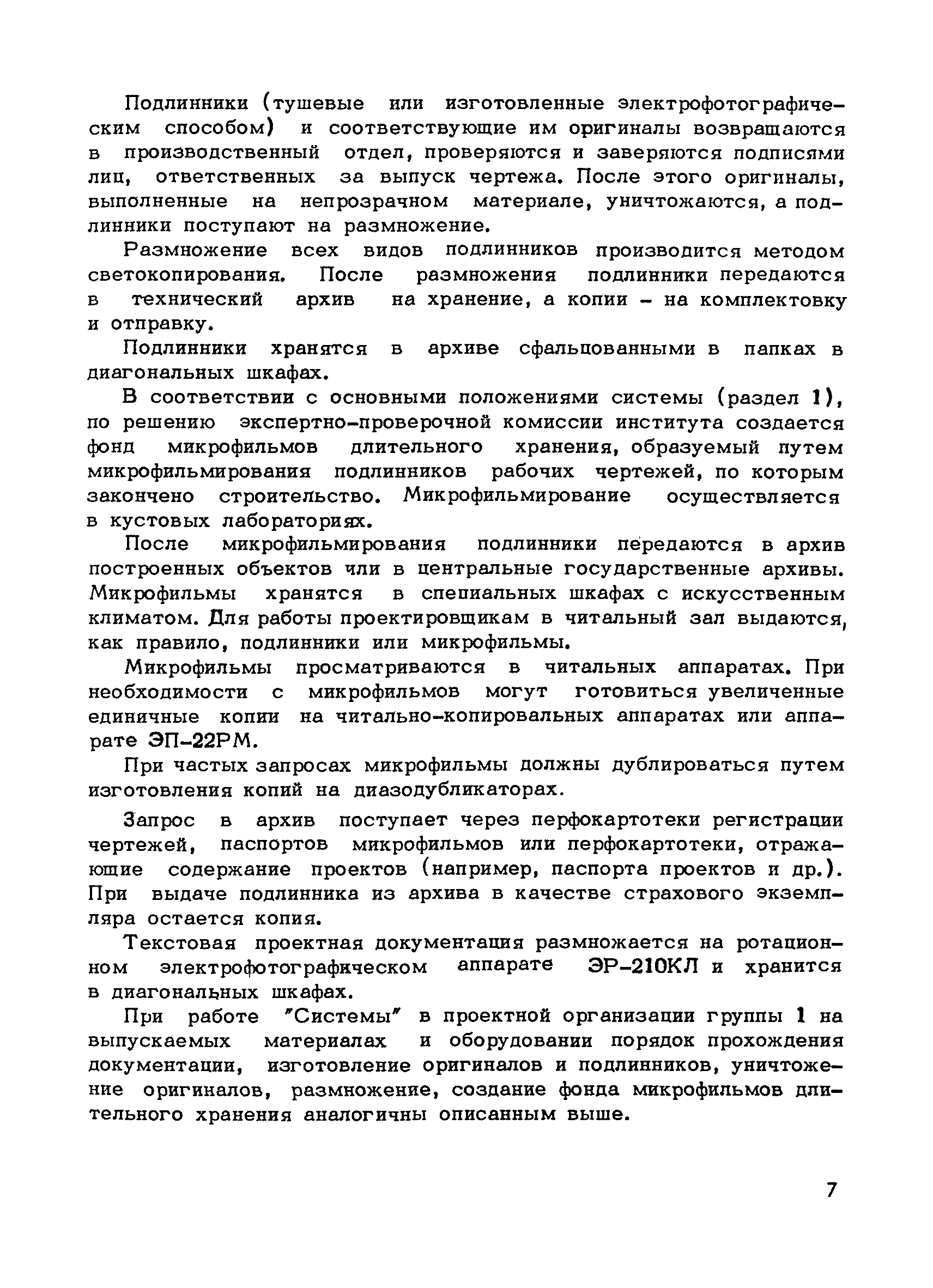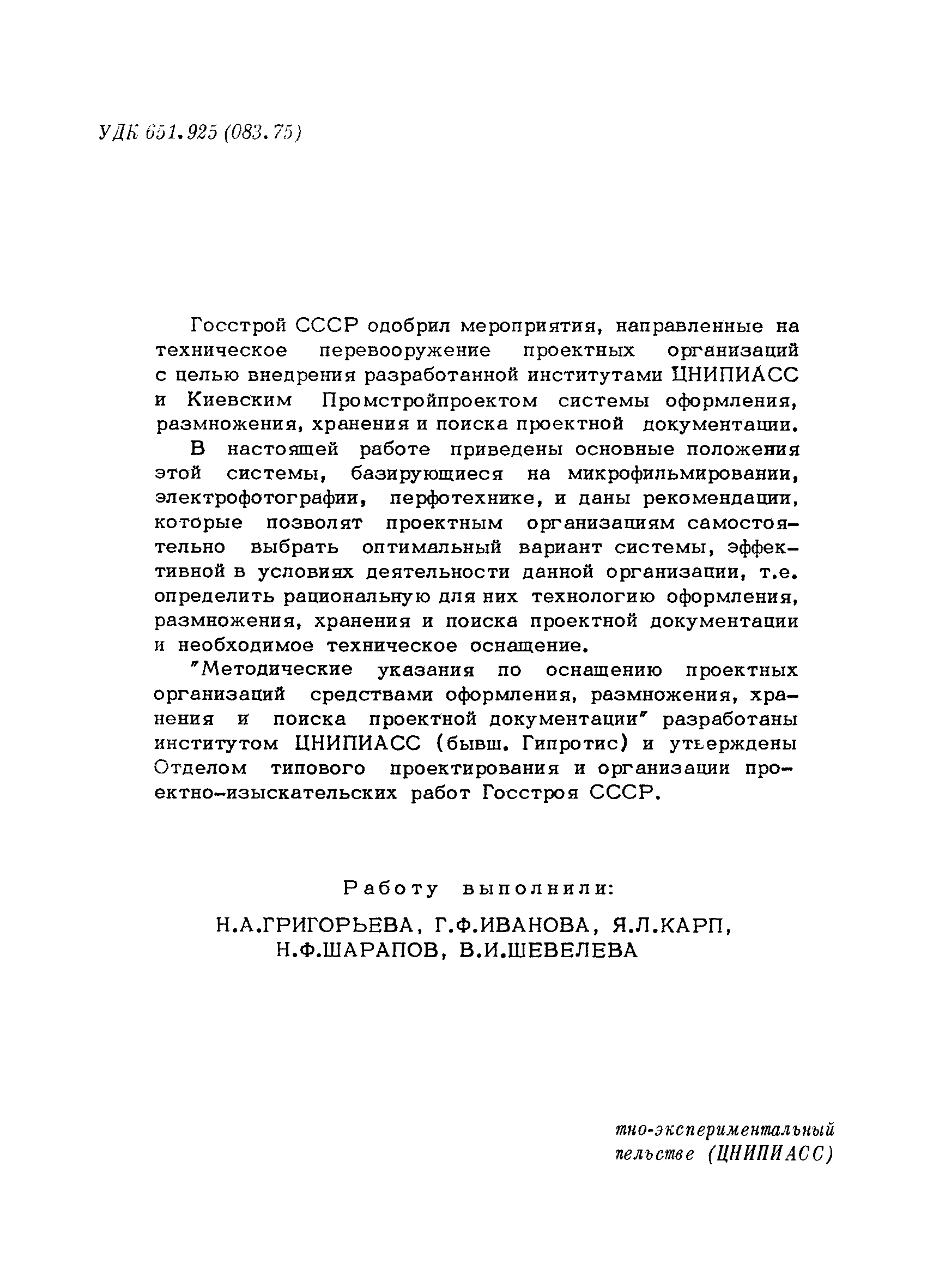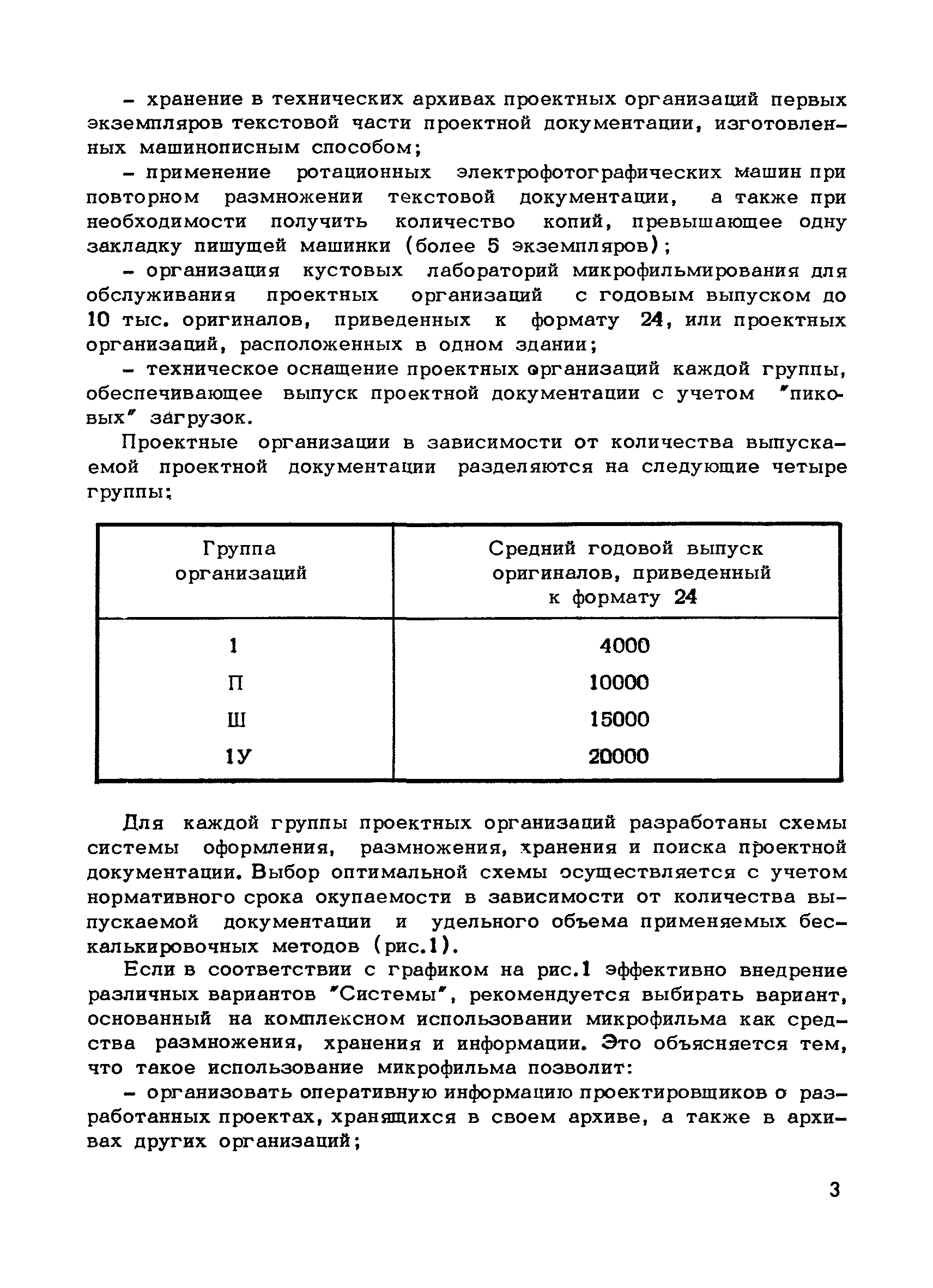 Методические указания по оснащению проектных организаций средствами оформления, размножения, хранения и поиска проектной документации| Статус: | справочные материалы, мп, тпр | | Название рус.: | Методические указания по оснащению проектных организаций средствами оформления, размножения, хранения и поиска проектной документации | | Дата добавления в базу: | 01.01.2018 | | Дата актуализации: | 01.01.2021 | | Область применения: | Методические указания содержат в себе основные положения системы оформления, размножения, хранения и поиска проектной документации, базирующиеся на микрофильмировании, электрофотографии, перфотехнике, и даны рекомендации, которые позволят проектным организациям самостоятельно выбрать оптимальный вариант системы, эффективной в условиях деятельности данной организации, т.е. определить рациональную систему для них технологию оформления, размножения, хранения и поиска проектной документации и необходимое техническое оснащение | | Оглавление: | 1. Основные положения 2. Варианты системы оформления, размножения и, хранения и поиска проектной документации в организациях с различными объемами выпускаемой продукции 2.1. Работа "Системы" в проектной организации группы 1 (среднегодовой выпуск - 4 тыс. листов формата 24) 2.2. Работа "Системы" в проектной организации группы 2 (среднегодовой выпуск - 10 тыс. листов формата 24) 2.3. Работа "Системы" в проектной организации группы 3 (среднегодовой выпуск - 15 тыс. листов формата 24) 2.4. Работа "Системы" в проектной организации группы 4 (среднегодовой выпуск - 20 тыс. листов формата 24) Приложение 1. Перечень основного оборудования для оформления, размножения, хранения и поиска проектной документации Приложение 2. Перечень основных материалов для оформления, размножения, хранения и поиска проектной документации | | Разработан: | ЦНИПИАСС Госстроя СССР