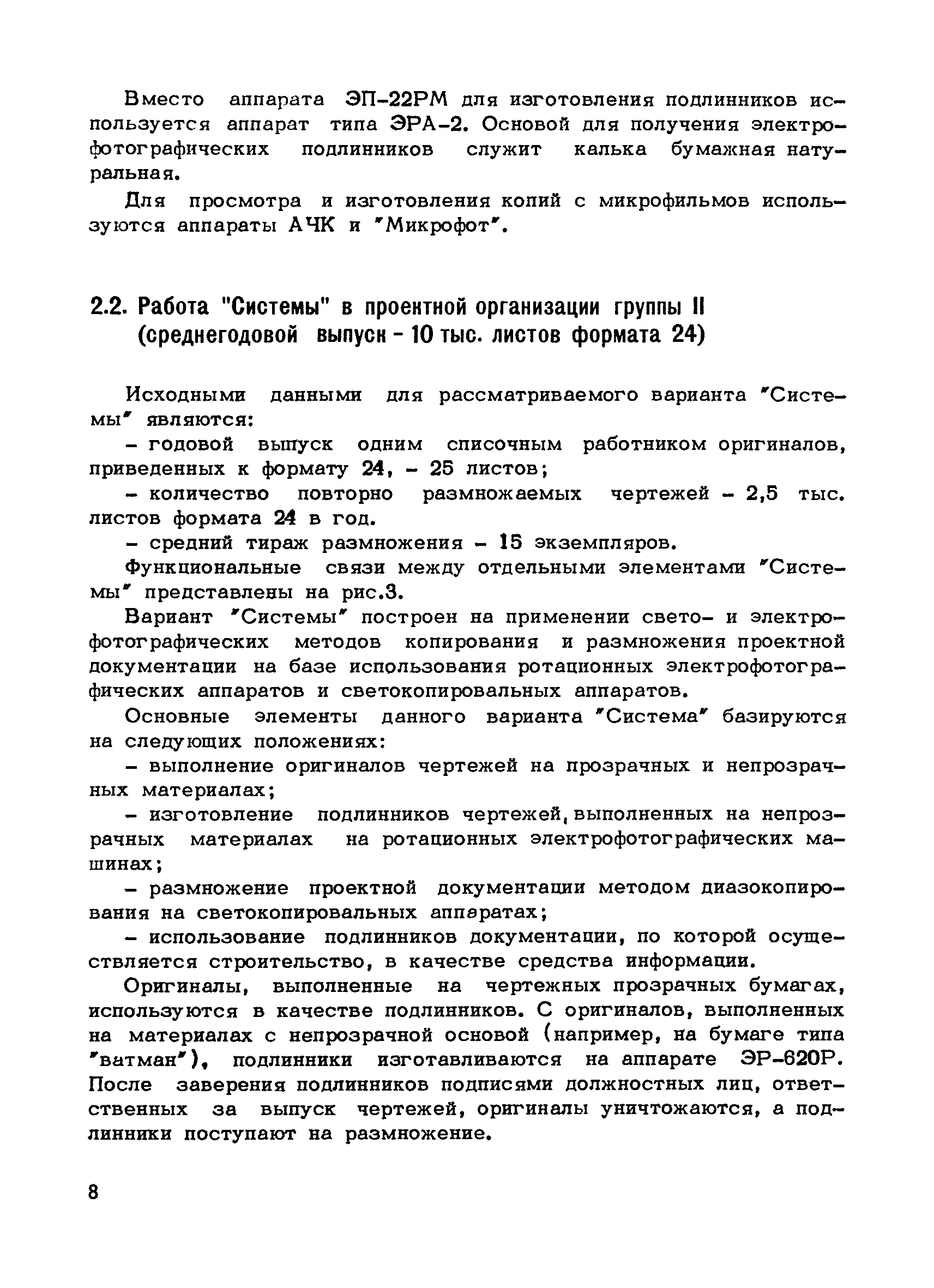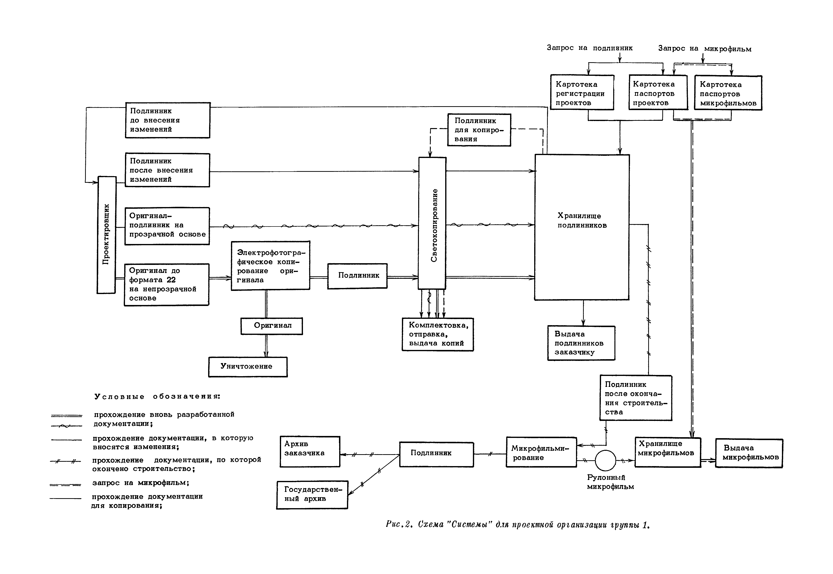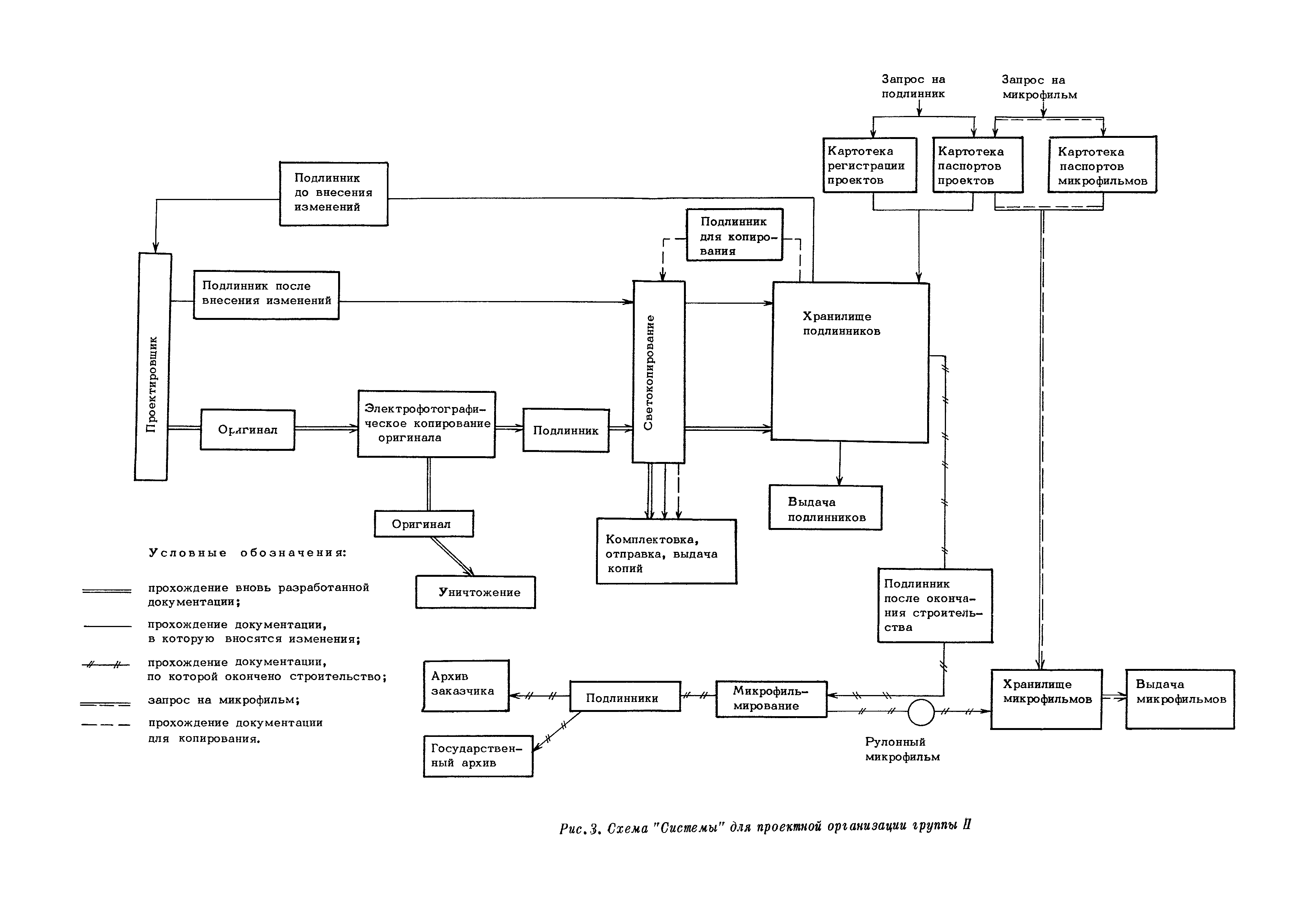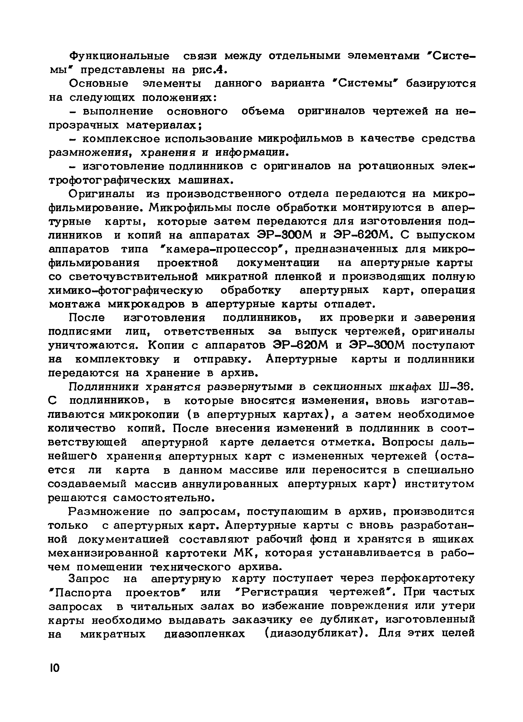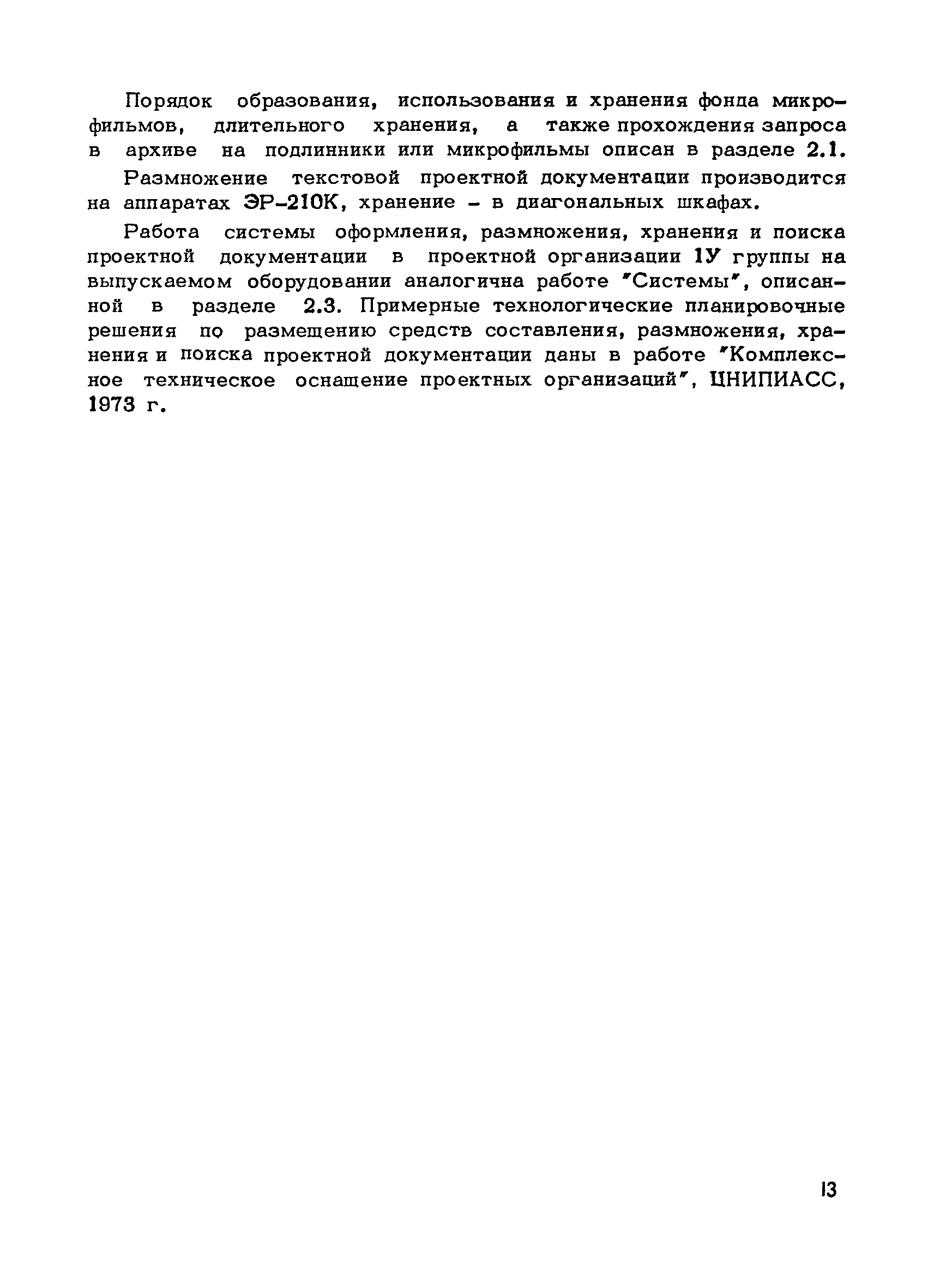 Методические указания по оснащению проектных организаций средствами оформления, размножения, хранения и поиска проектной документации| Статус: | справочные материалы, мп, тпр | | Название рус.: | Методические указания по оснащению проектных организаций средствами оформления, размножения, хранения и поиска проектной документации | | Дата добавления в базу: | 01.01.2018 | | Дата актуализации: | 01.01.2021 | | Область применения: | Методические указания содержат в себе основные положения системы оформления, размножения, хранения и поиска проектной документации, базирующиеся на микрофильмировании, электрофотографии, перфотехнике, и даны рекомендации, которые позволят проектным организациям самостоятельно выбрать оптимальный вариант системы, эффективной в условиях деятельности данной организации, т.е. определить рациональную систему для них технологию оформления, размножения, хранения и поиска проектной документации и необходимое техническое оснащение | | Оглавление: | 1. Основные положения 2. Варианты системы оформления, размножения и, хранения и поиска проектной документации в организациях с различными объемами выпускаемой продукции 2.1. Работа "Системы" в проектной организации группы 1 (среднегодовой выпуск - 4 тыс. листов формата 24) 2.2. Работа "Системы" в проектной организации группы 2 (среднегодовой выпуск - 10 тыс. листов формата 24) 2.3. Работа "Системы" в проектной организации группы 3 (среднегодовой выпуск - 15 тыс. листов формата 24) 2.4. Работа "Системы" в проектной организации группы 4 (среднегодовой выпуск - 20 тыс. листов формата 24) Приложение 1. Перечень основного оборудования для оформления, размножения, хранения и поиска проектной документации Приложение 2. Перечень основных материалов для оформления, размножения, хранения и поиска проектной документации | | Разработан: | ЦНИПИАСС Госстроя СССР