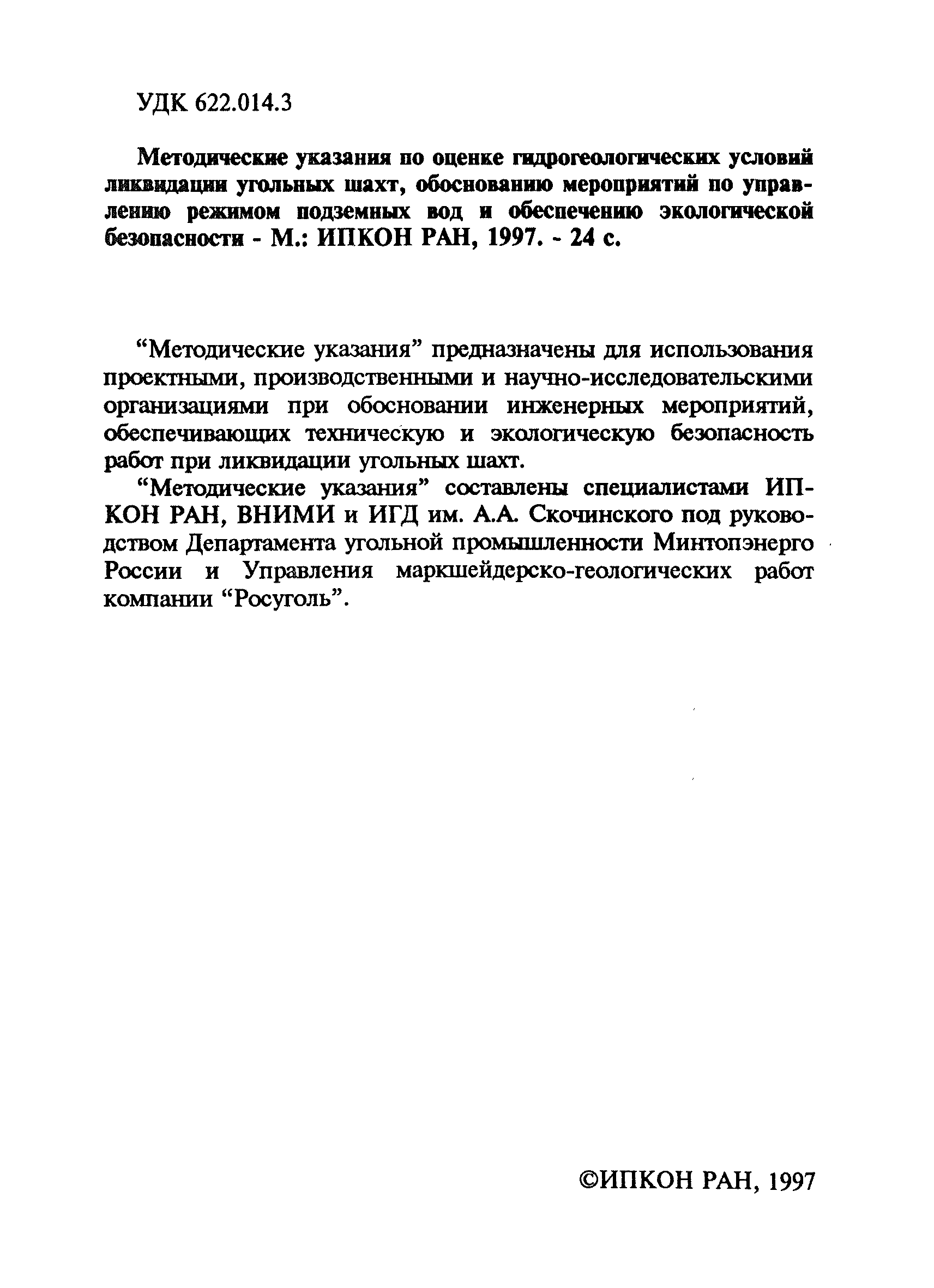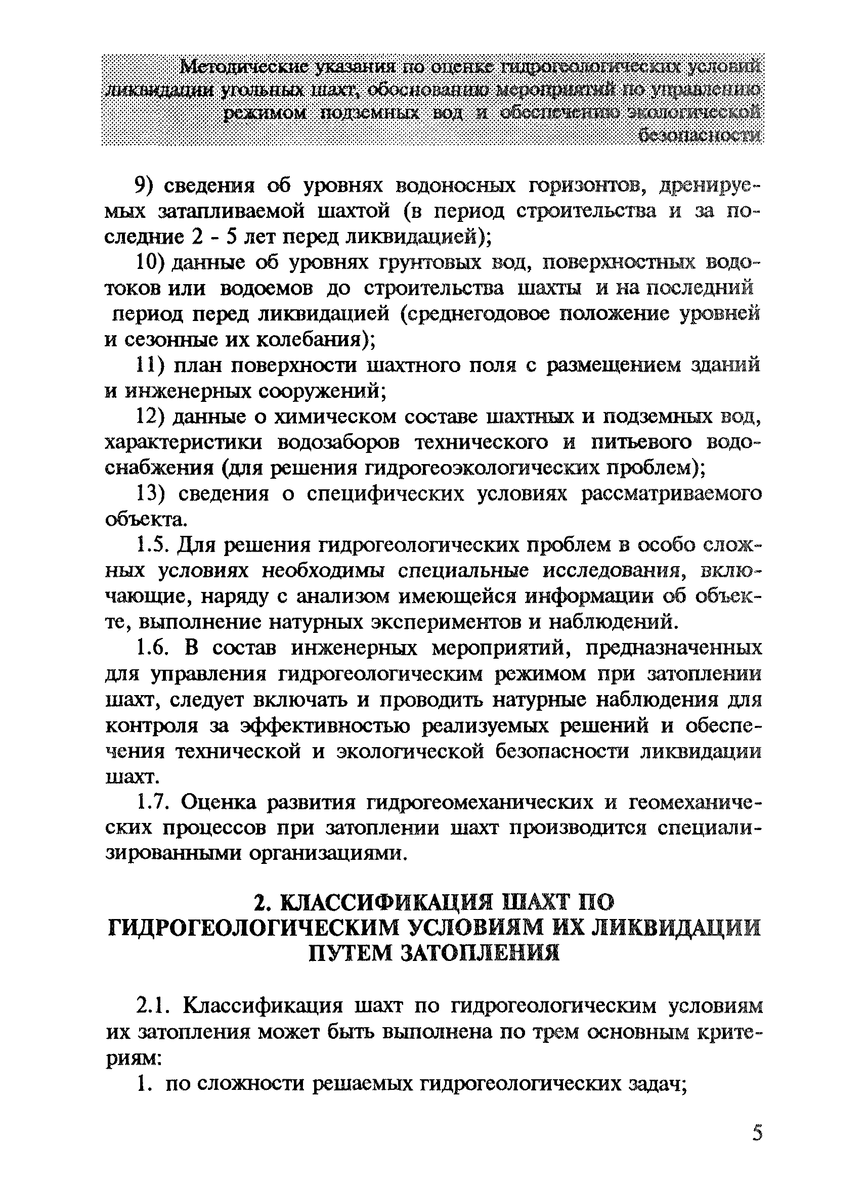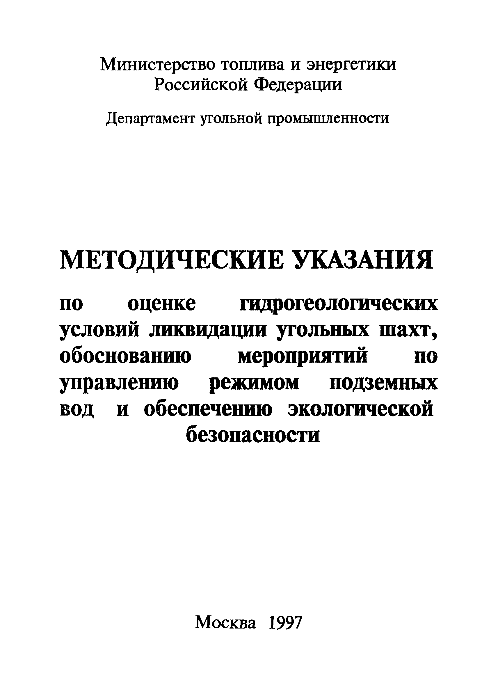 | Название рус.: | Методические указания по оценке гидрогеологических условий ликвидации угольных шахт, обоснованию мероприятий по управлению режимом подземных вод и обеспечению экологической безопасности |