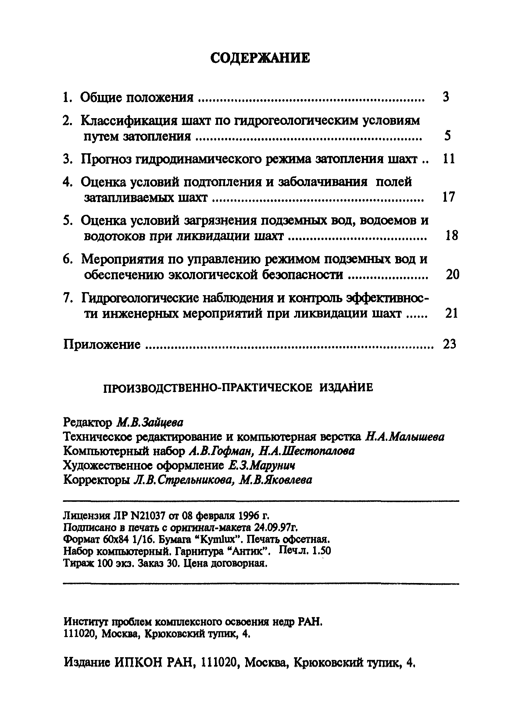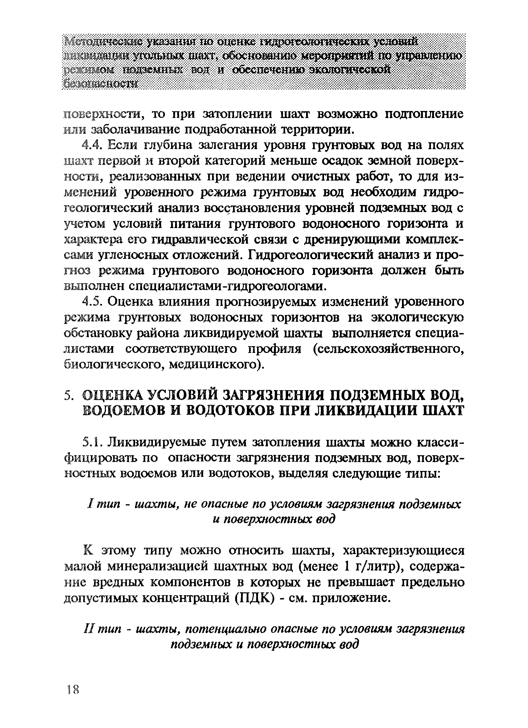 | Оглавление: | 1 Общие положения 2 Классификация шахт по гидрогеологическим условиям путем затопления 3 Прогноз гидродинамического режима затопления шахт 4 Оценка условий подтопления и заболачивания полей затапливаемых шахт 5 Оценка условий загрязнения подземных вод, водоемов и водотоков при ликвидации шахт 6 Мероприятия по управлению режимом подземных вод и обеспечению экологической безопасности 7 Гидрогеологические наблюдения и контроль эффективности инженерных мероприятий при ликвидации шахт Приложение. Предельно допустимые концентрации (ИДК) загрязнителей в водах хозяйственно-питьевого и санитарно-бытового назначения |