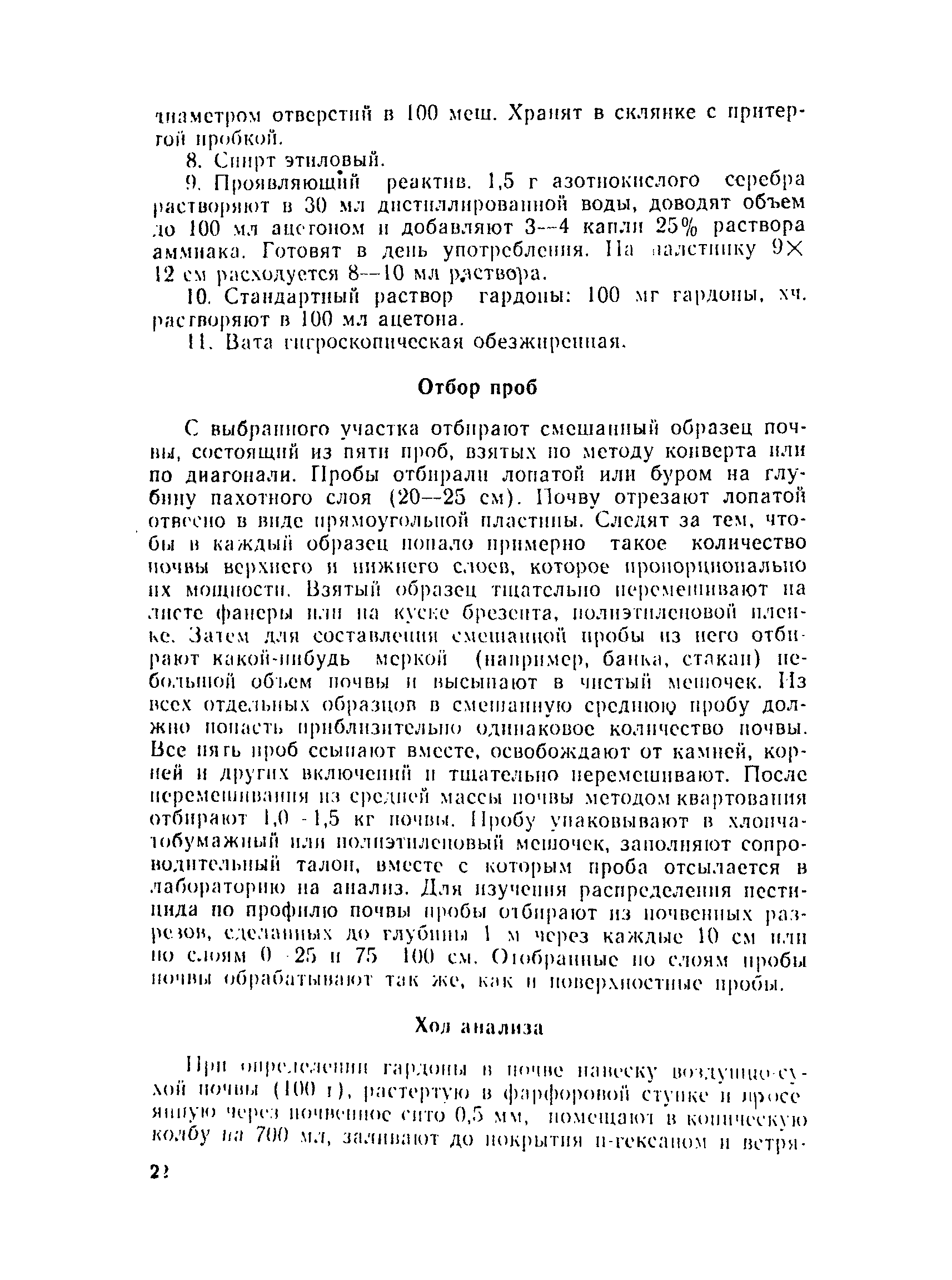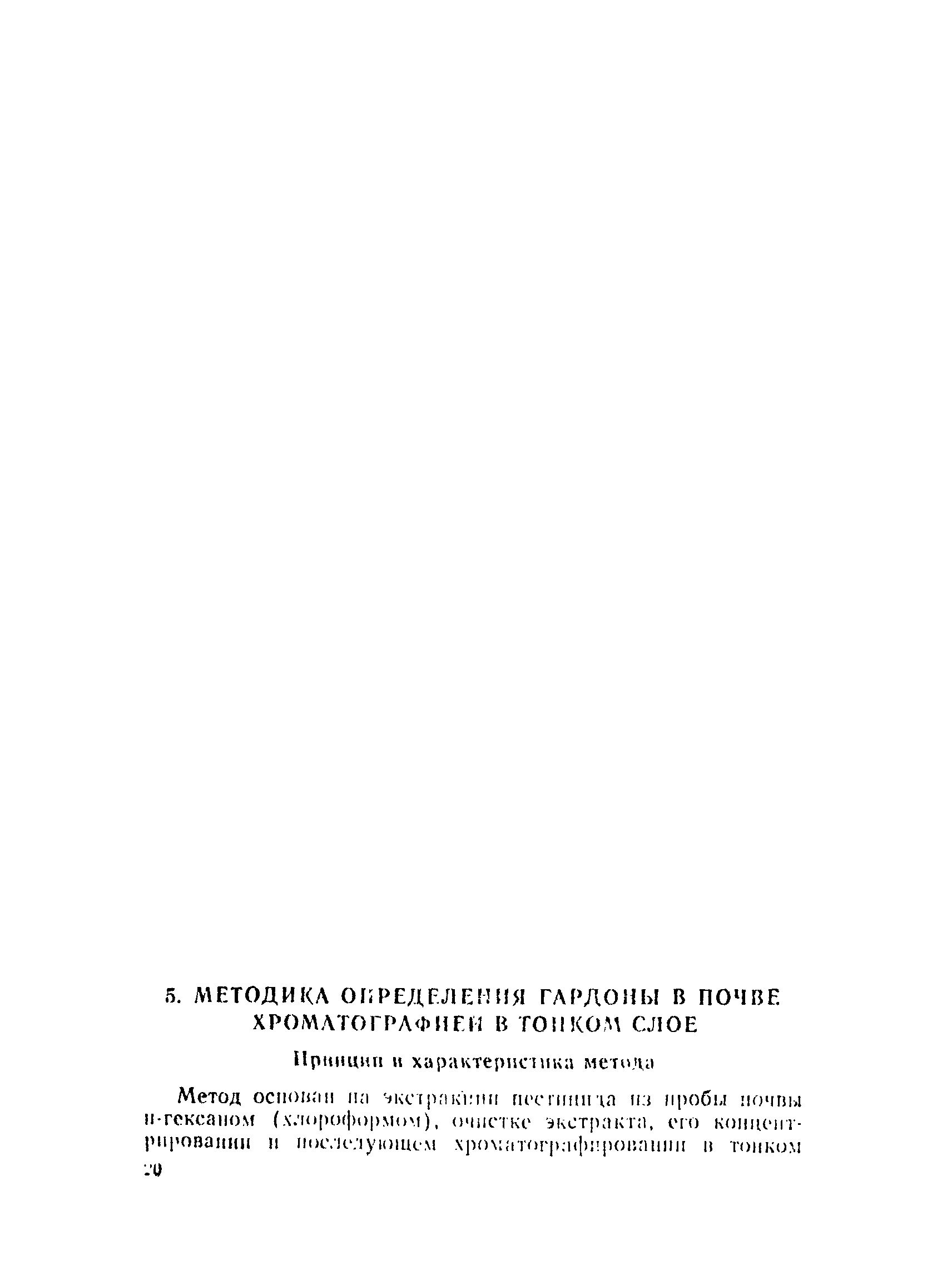 Методика определения гардоны в почве хроматографией в тонком слое| Статус: | действует | | Название рус.: | Методика определения гардоны в почве хроматографией в тонком слое | | Дата добавления в базу: | 01.01.2018 | | Дата актуализации: | 01.01.2021 | | Оглавление: | Принцип и характеристика метода Аппаратура и посуда Реактивы и растворы Отбор проб Ход анализа Построение калибровочного графика Расчет анализа Приложение № 3 | | Утверждён: | 30.10.1980 Зам. Главного Государственного санитарного врача СССР (USSR Deputy Chief Public Health Officer 2264-80)