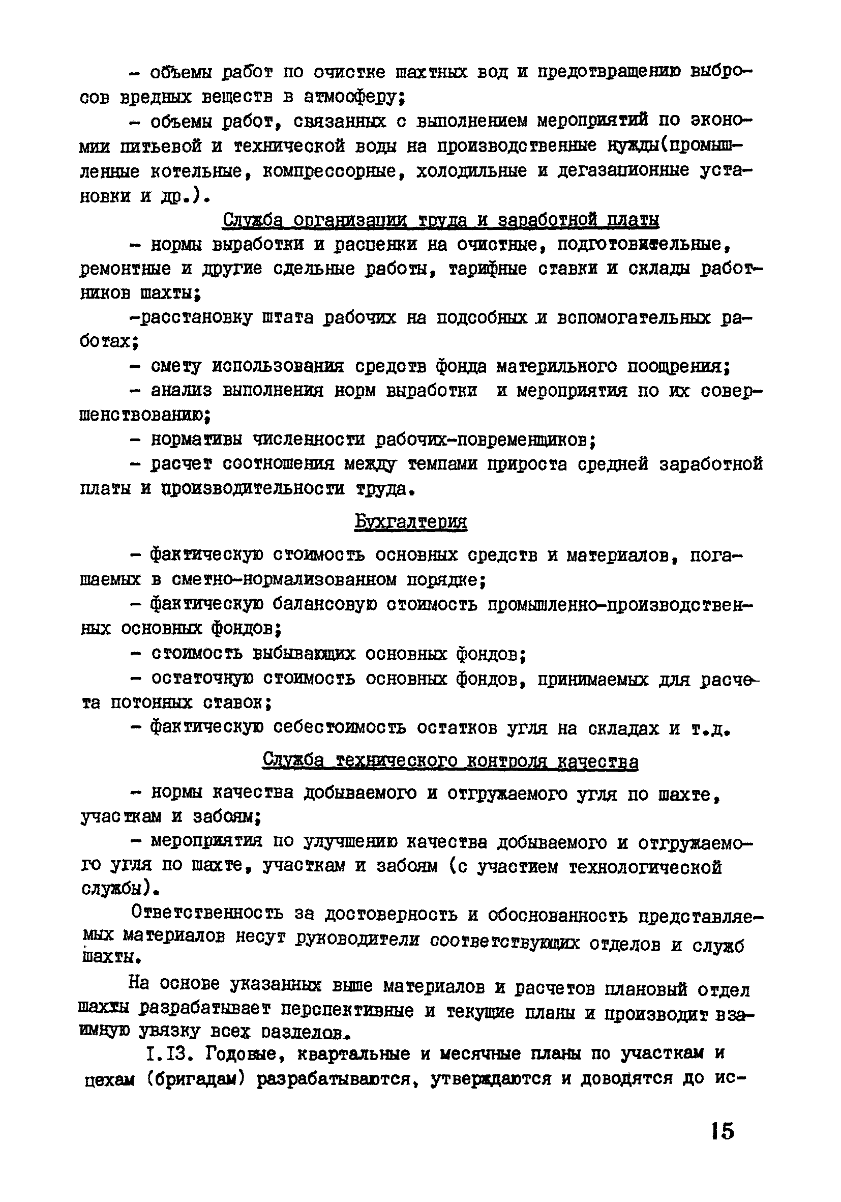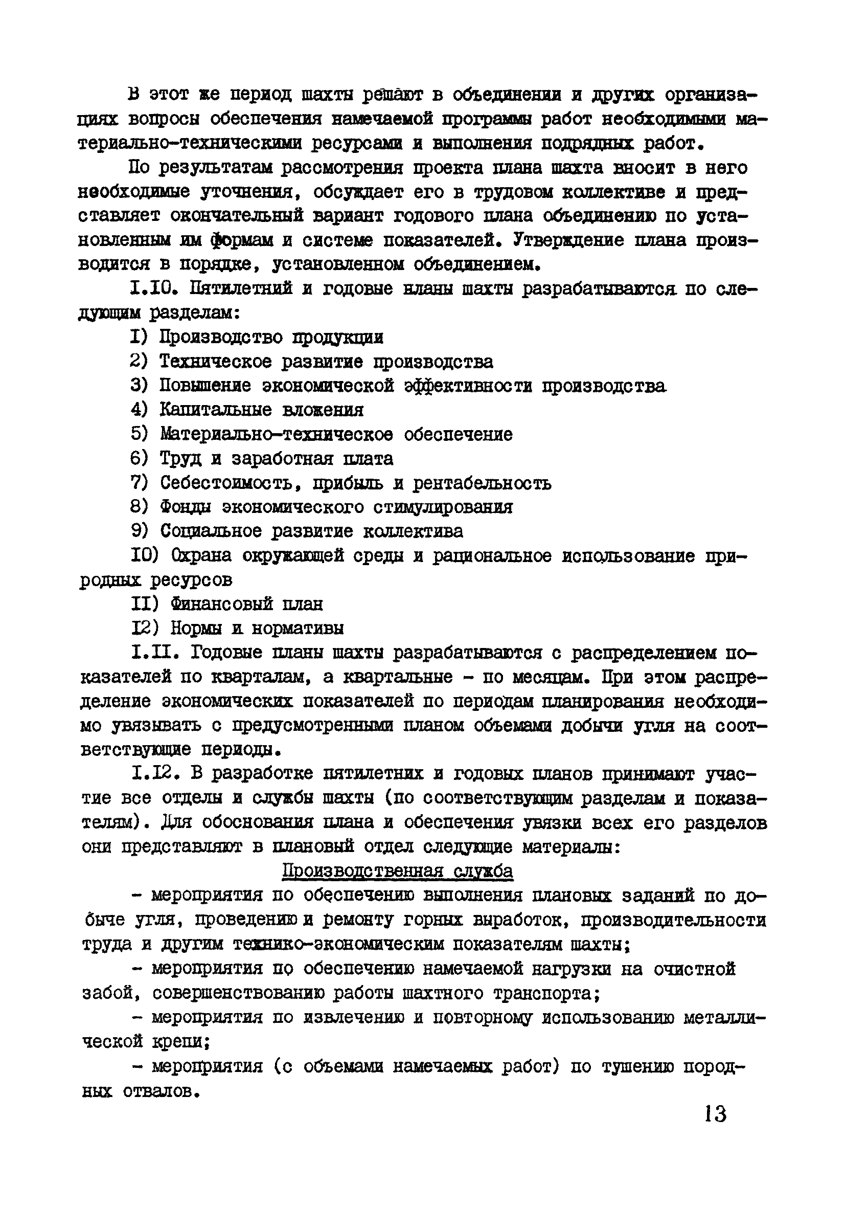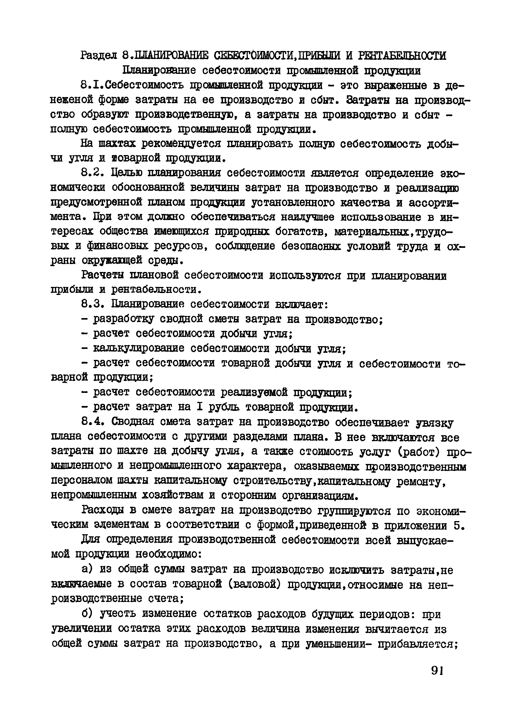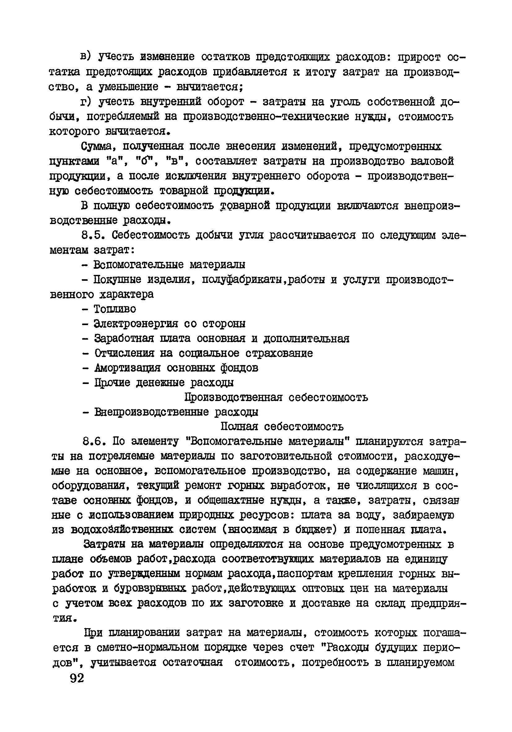 | Оглавление: | Введение Раздел 1. Основные организационно-методические положения Раздел 2. Планирование привоза продукции Раздел 3. Планирование технического развития производства Раздел 4. Планирование экономической эффективности производства Раздел 5. Планирование капитальных вложений Раздел 6. Планирование материально-технического обеспечения Раздел 7. Планирование труда и заработной платы Раздел 8. Планирование себестоимости, прибыли и рентабельности Раздел 9. Планирование фондов экономического стимулирования Раздел 10. Планирование социального развития коллектива Раздел 11. Планирование охраны окружающей среды и рационального использования природных ресурсов Раздел 12. Разработка финансового плана Раздел 13. Нормы и нормативы Приложение 1. Пример расчета средней продолжительности отпуска рабочих по добыче угла Приложение 2. Примеры расчета коэффициентов списочного состава рабочих по добыче угля, применяемых при разработке месячных планов Приложение 3. Коэффициенты списочного состава рабочих по добыче угля для различных режимов работы и различной продолжительности очередного отпуска, применяемые при разработке месячных планов Приложение 4. Расчет фонда заработной платы промышленно-производственного персонала по добыче угля по шахте (примерная форма) Приложение 5. Смета затрат на производство Приложение 6. Расчет услуг промышленного характера капитальному строительству, капитальному ремонту и на сторону (примерная форма) Приложение 7. Расчетный баланс расходов и доходов (примерная форма) Приложение 8. Перечень методических документов по расчету норм и нормативов для планирования на шахтах (по состоянию на 01.02.89) Приложение 9. Перечень нормативных документов по расчету норм и нормативов, подлежащих разработке и обновлению в 1989 - 1990 гг. |